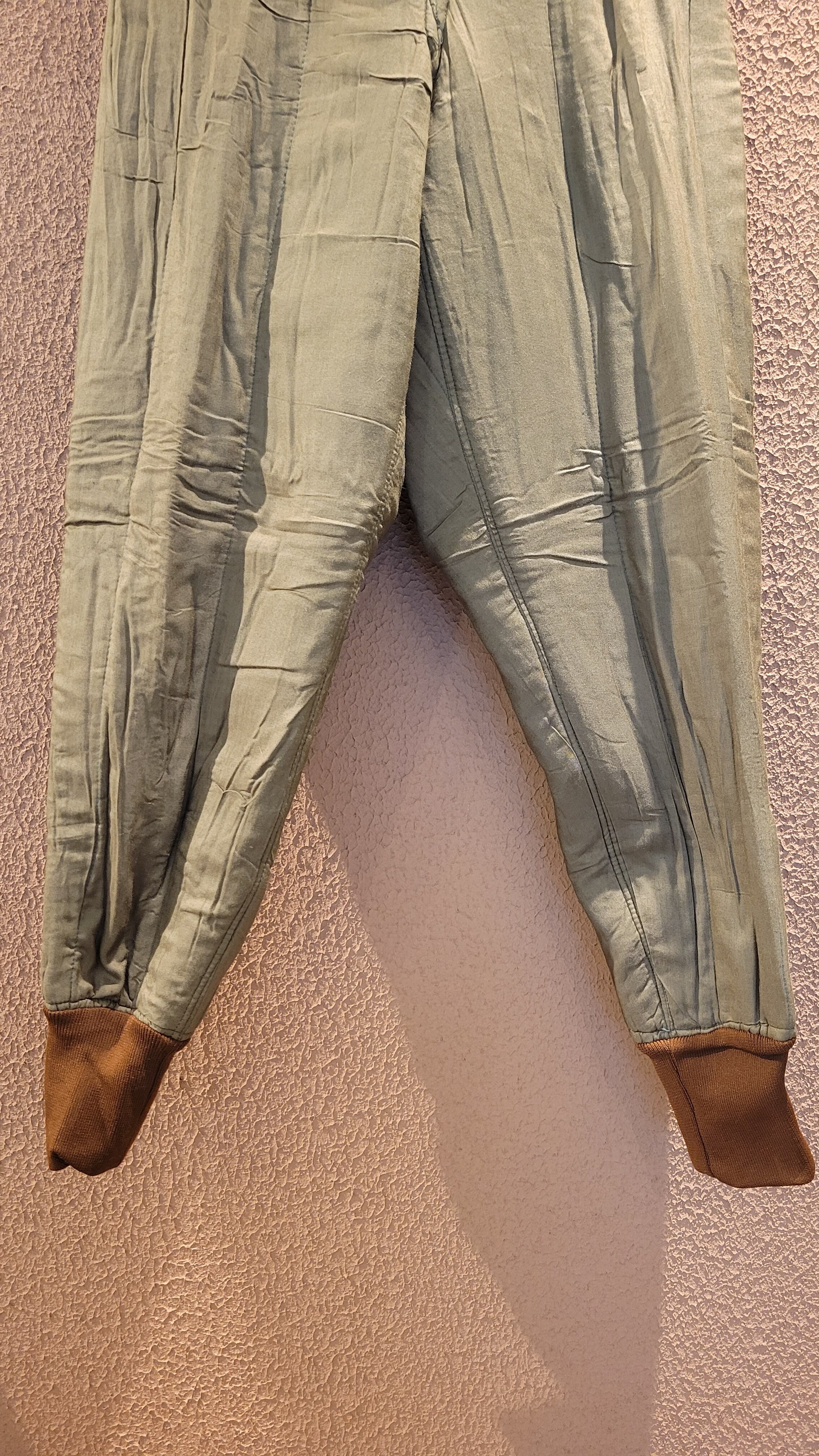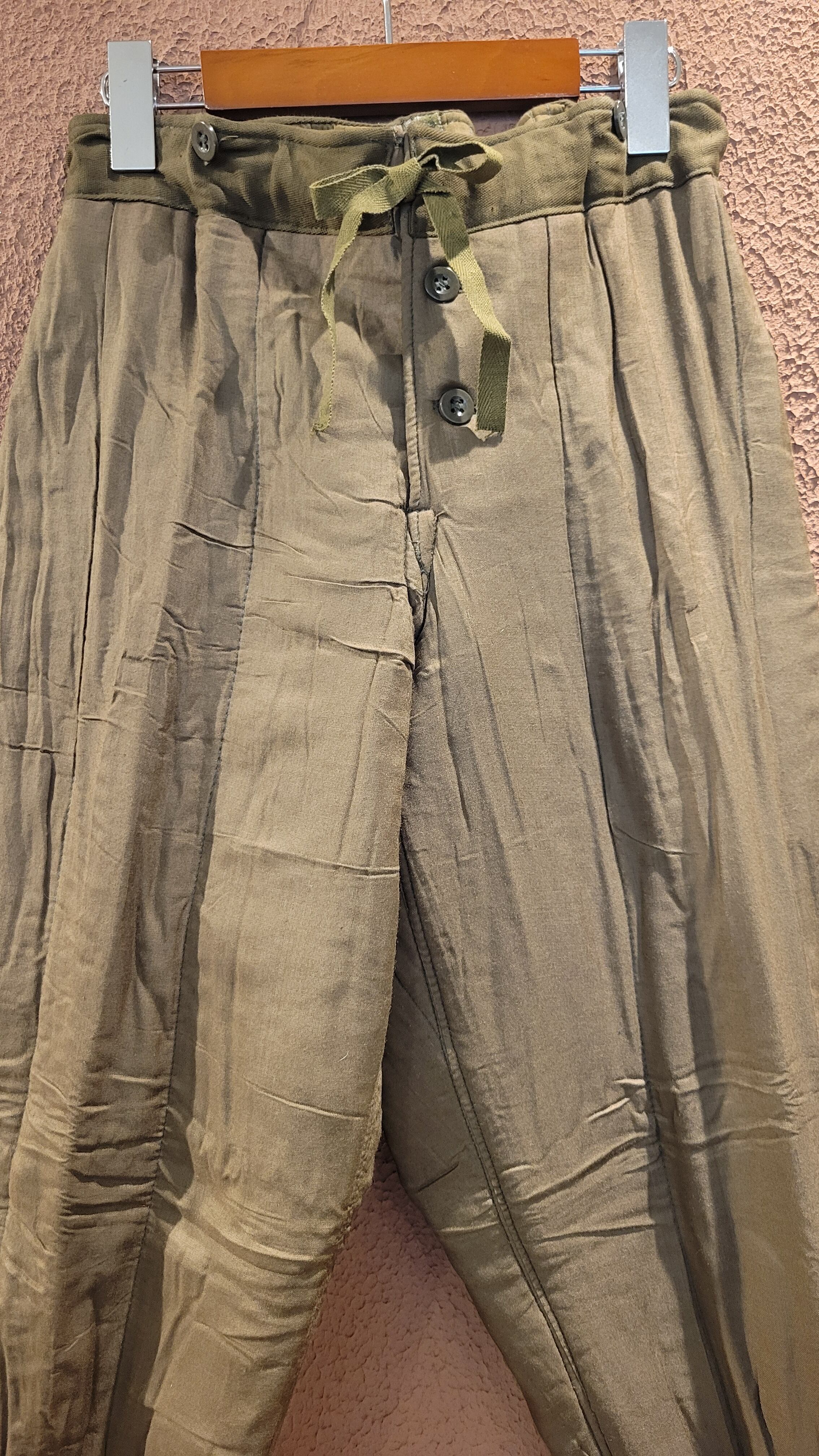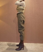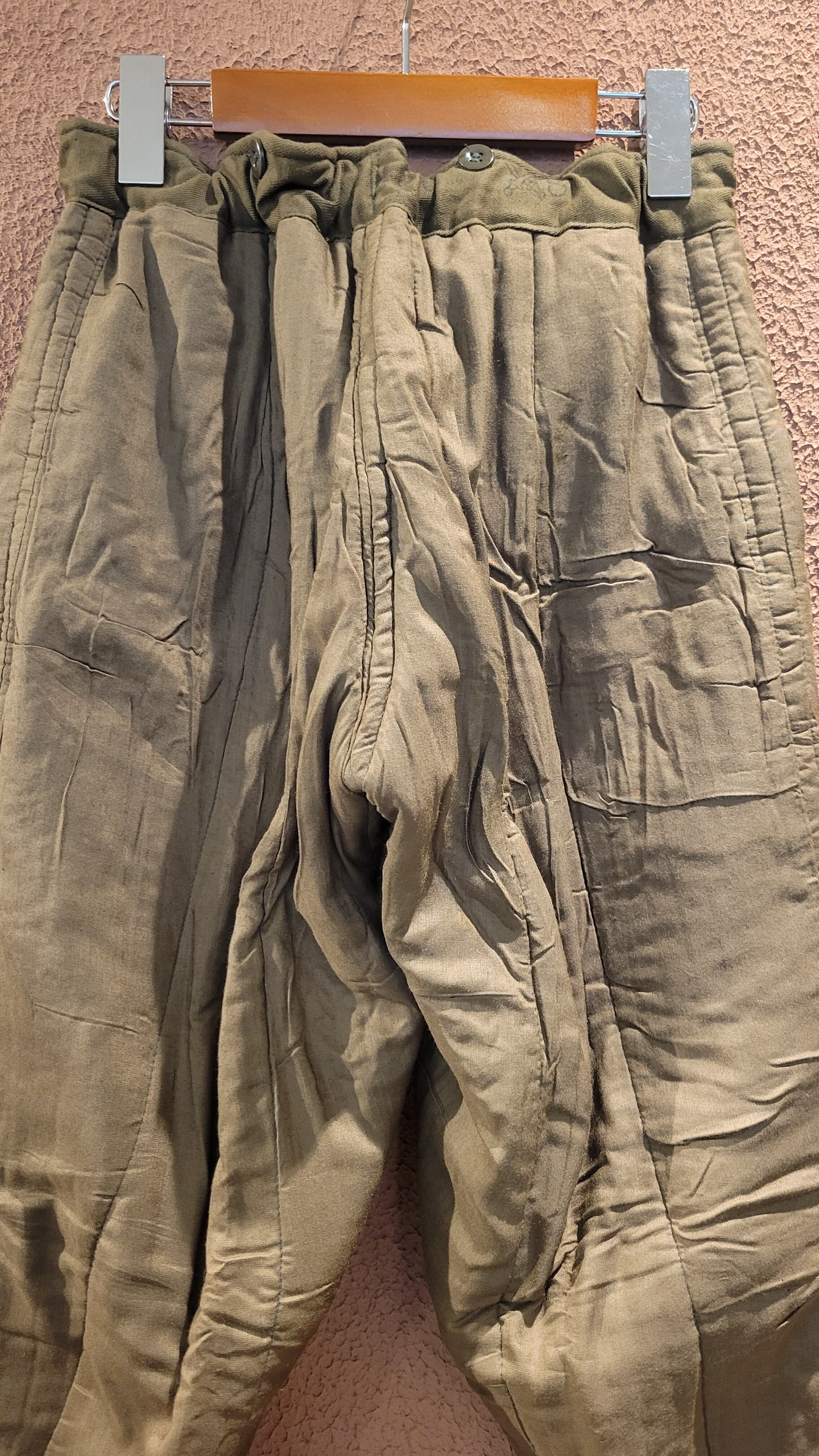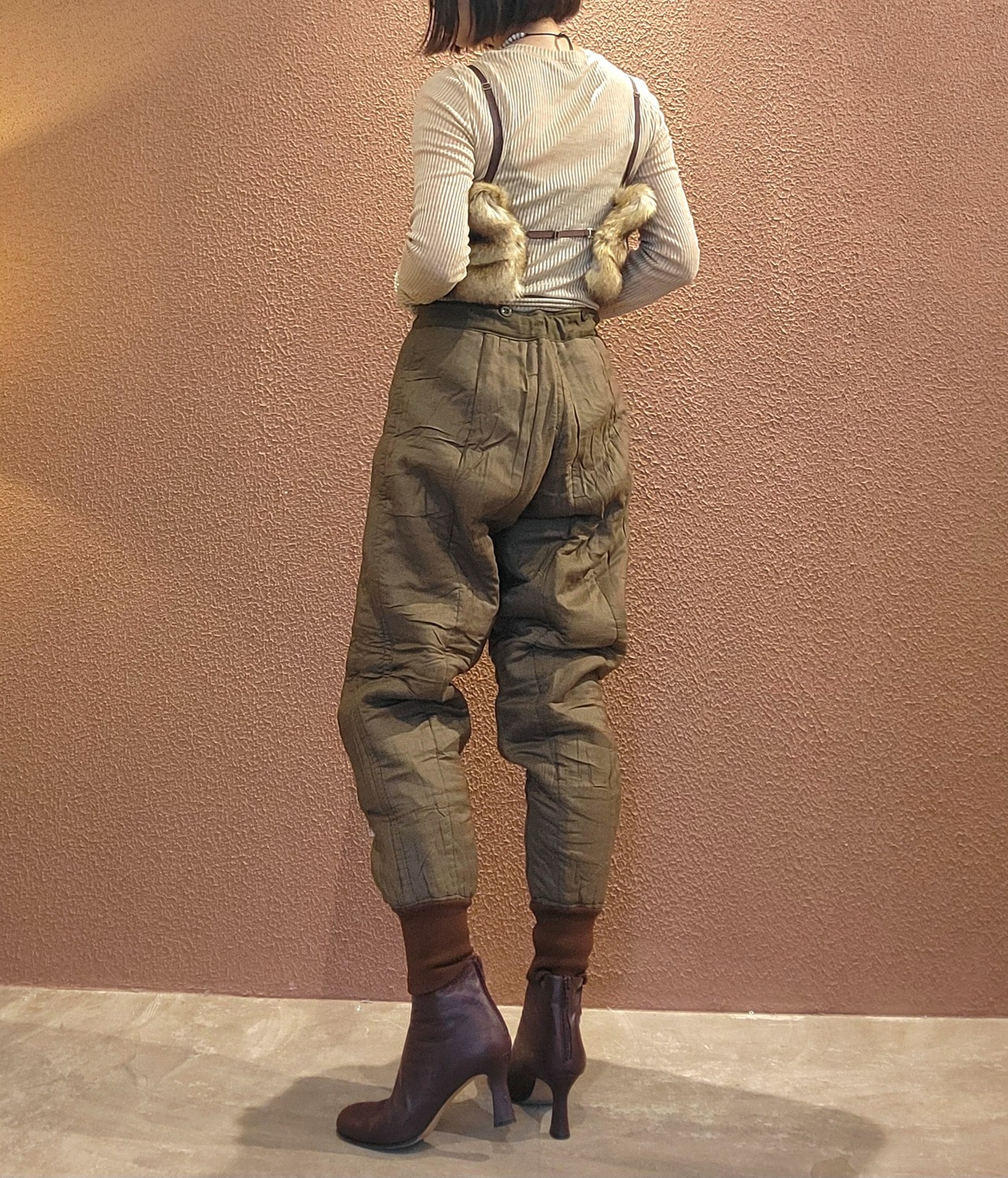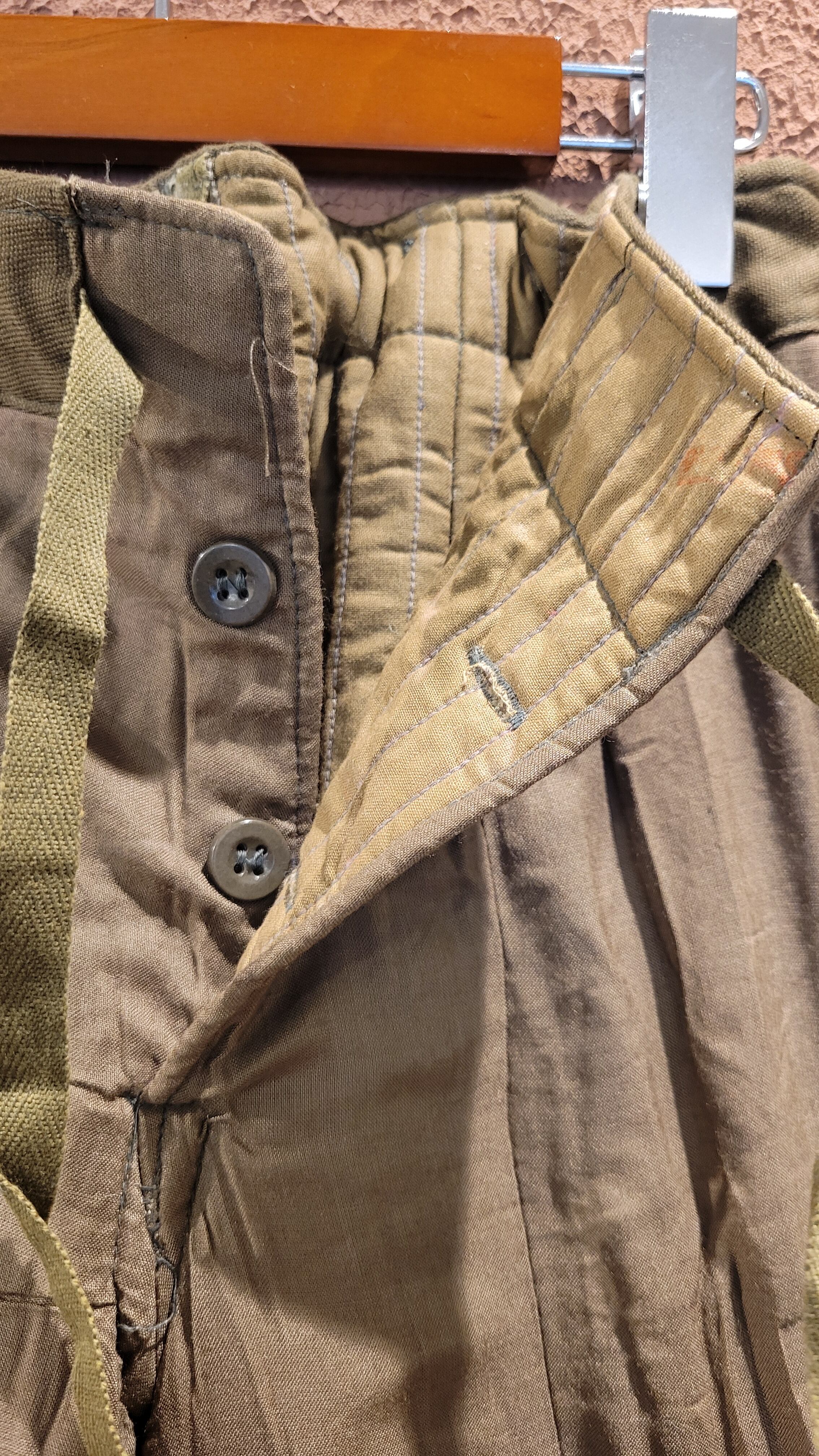 デッドストックのチェコ軍ライナーパンツ。生地は厚手ですが柔らかいコットンで中綿入りのキルティングのため保温性に優れています。ウエストはコードで調整可能。サスペンダー用のボタンが4つ付いています。裾はリブで体温を逃しにくい仕様になっています。機能性とファッション性を兼ね備えた1本。