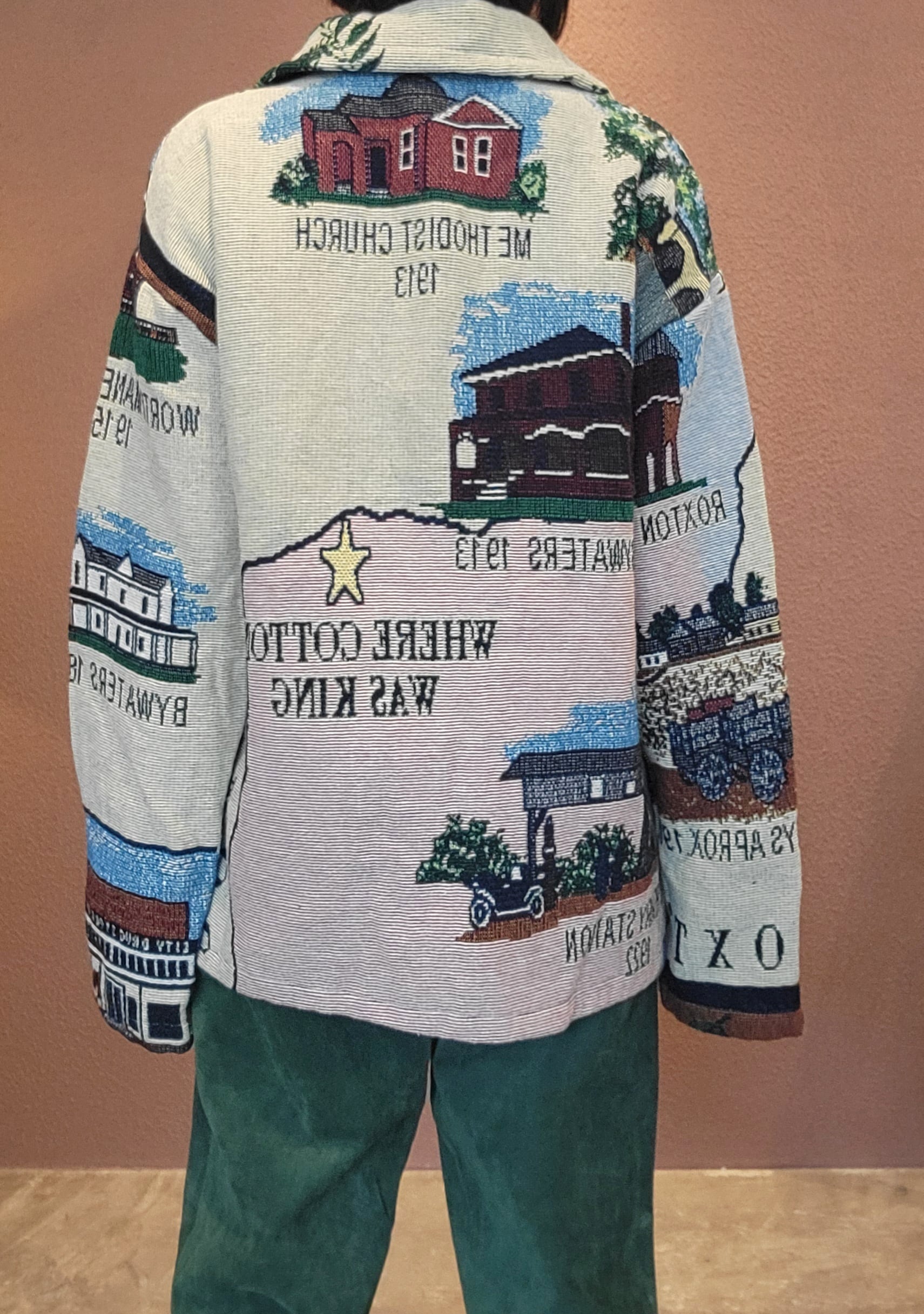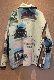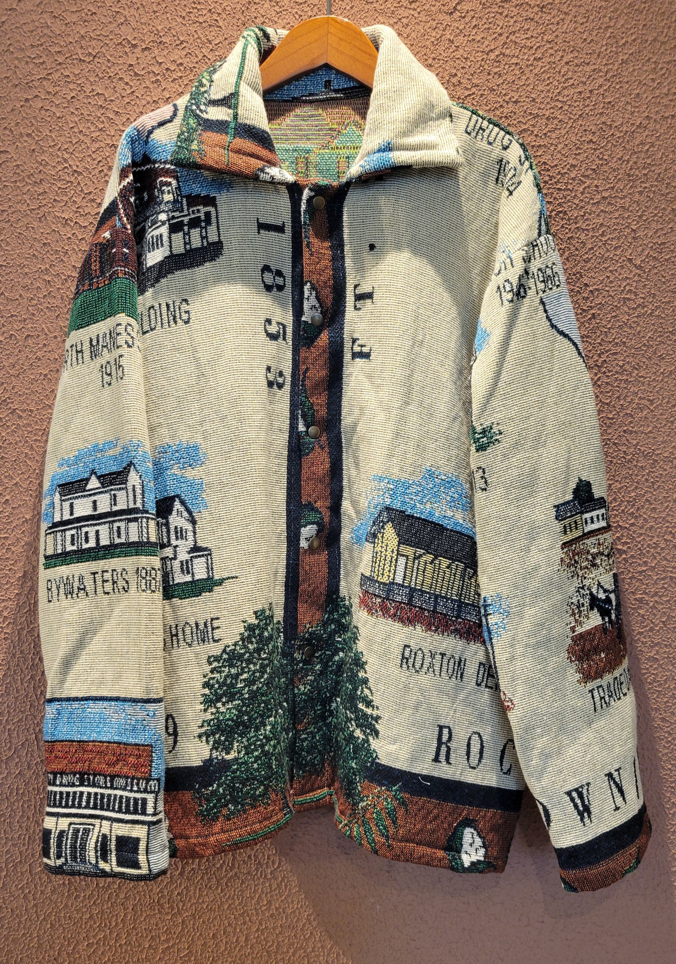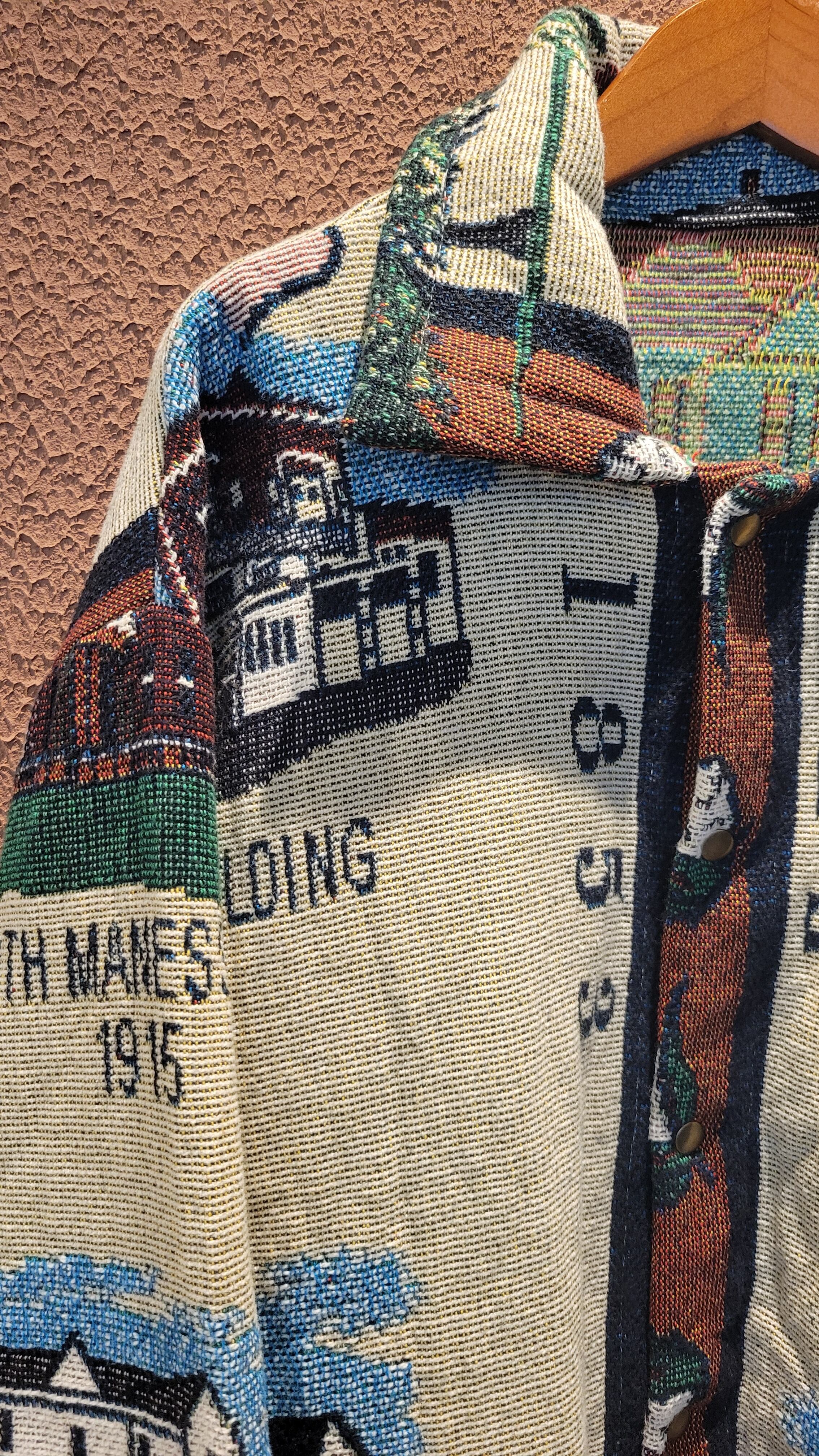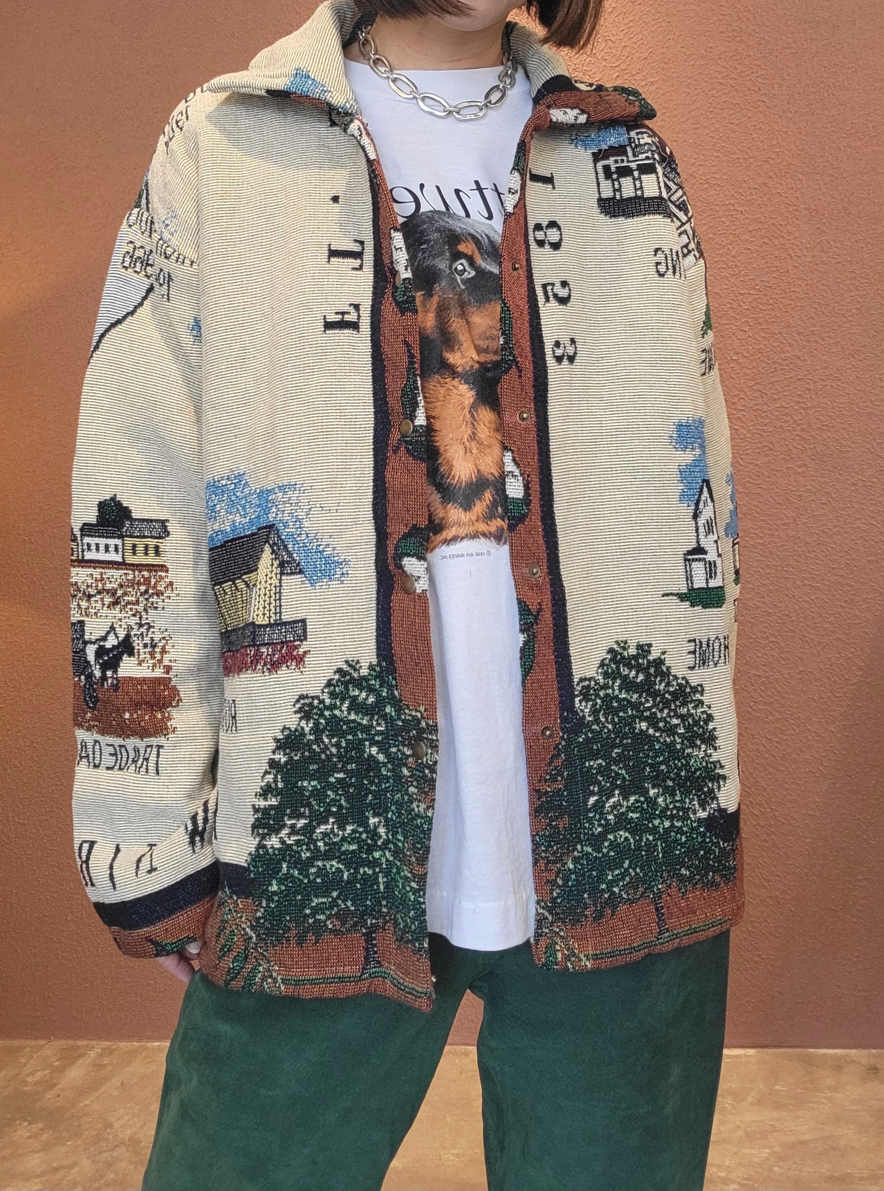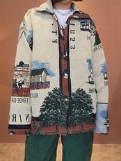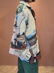 ヴィンテージブランケットを使用したリメイクジャケット。素材表記はありませんがコットンのようです。フロントはスナップボタンで着脱がスムーズです。メンズ仕様ですが女性がオーバーサイズで着て可愛いサイズ感です。もちろん男性にもおすすめです。