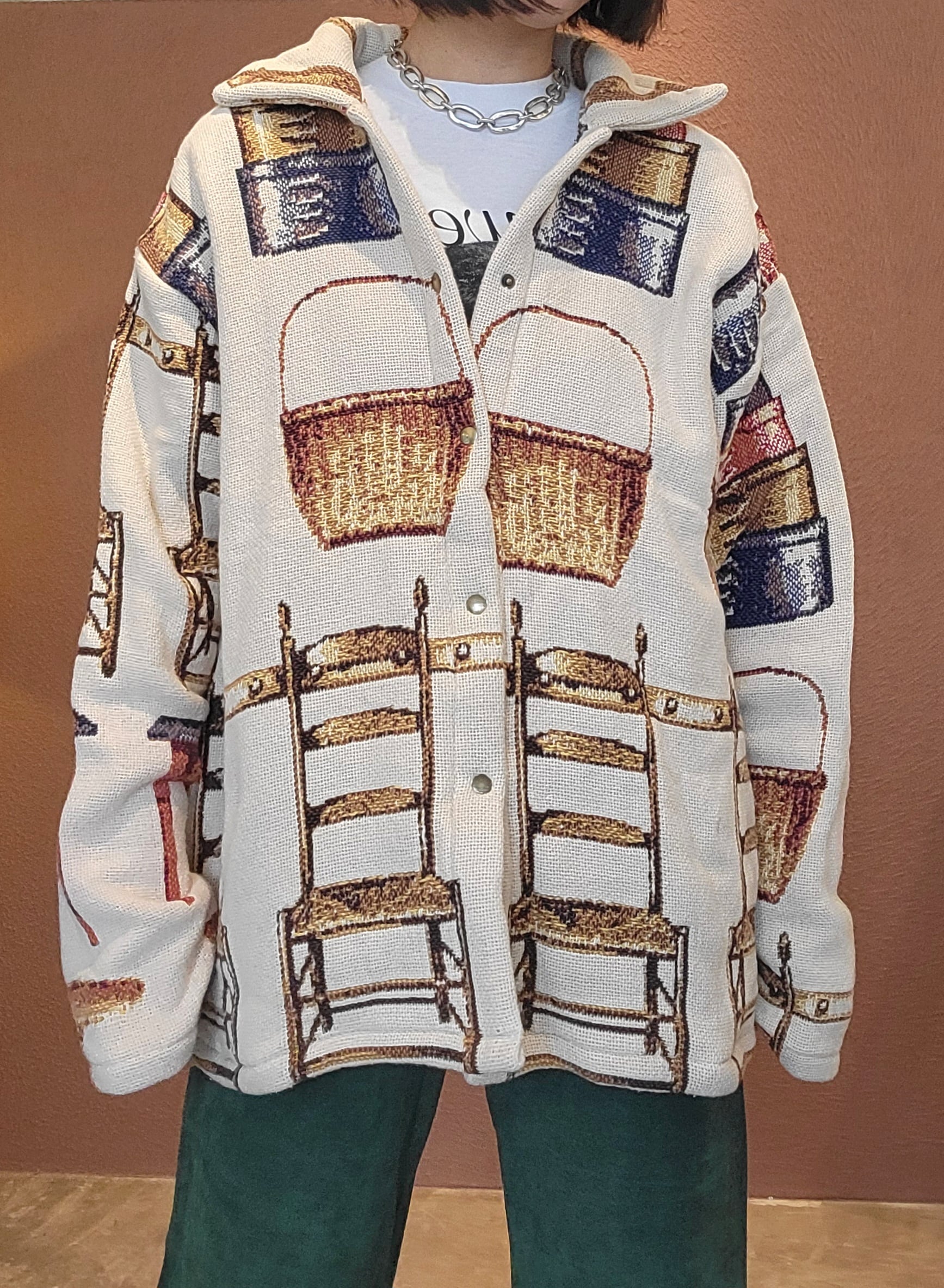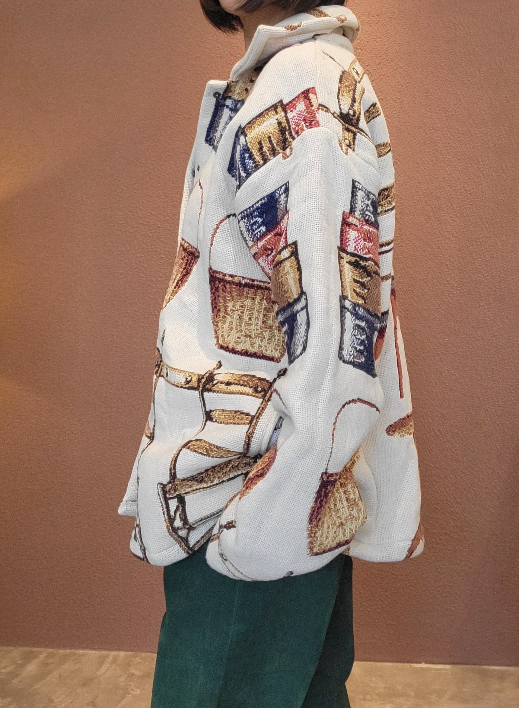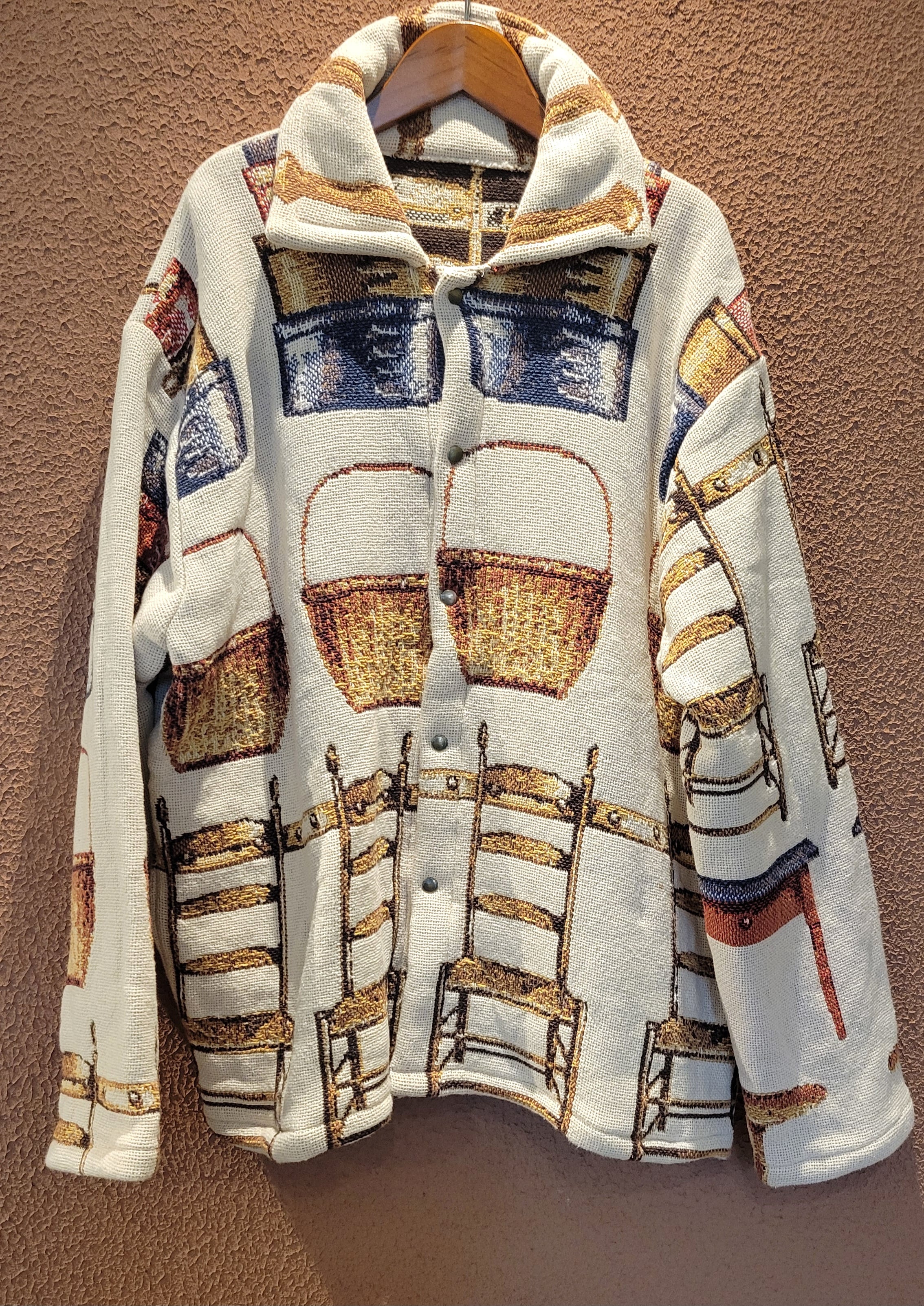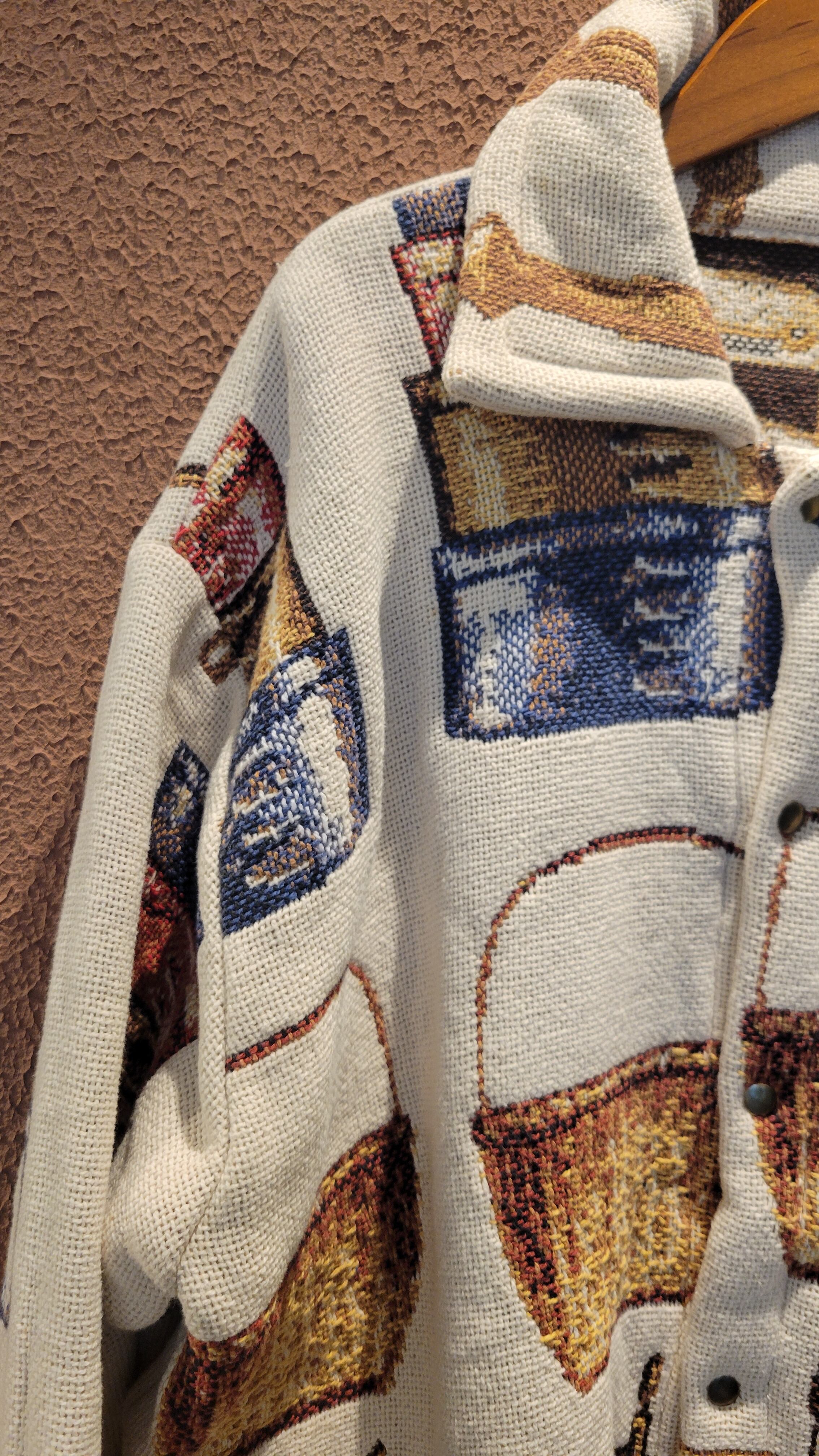 ヴィンテージブランケットを使用したリメイクジャケット。素材表記はありませんがコットンのようです。やや重量感がありますが着用時にストレスに感じるほどではありません。フロントはスナップボタンで着脱がスムーズです。メンズ仕様ですが女性がオーバーサイズで着て可愛いサイズ感です。もちろん男性にもおすすめです。*後ろ身頃左裾辺りに5mm〜1cmほどのシミがあります。画像でご確認ください。