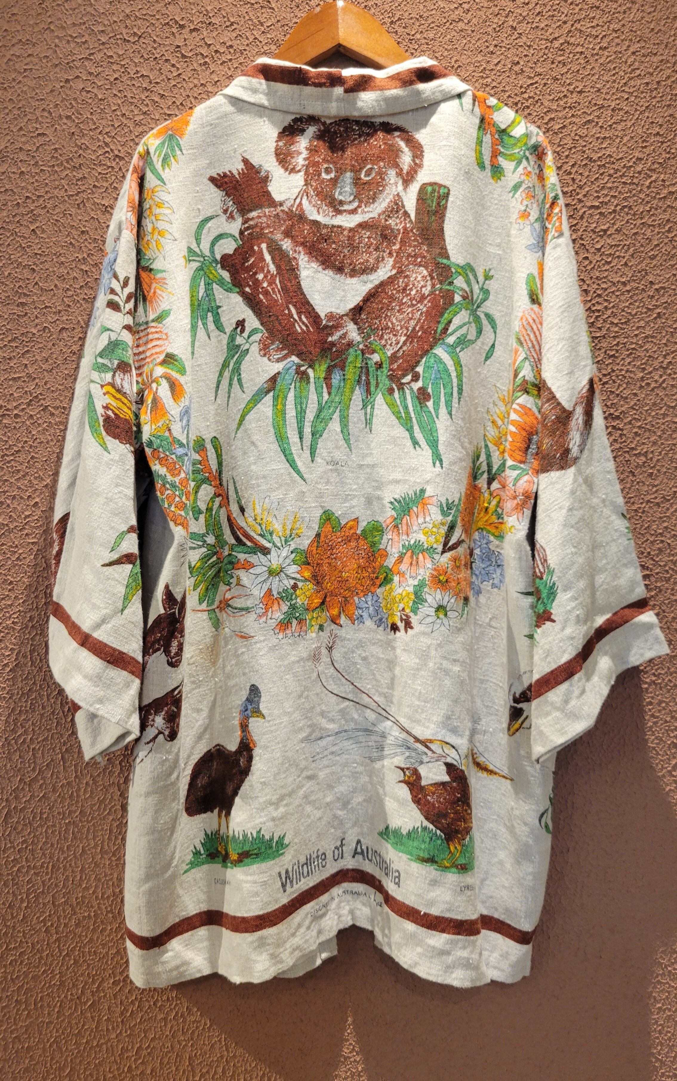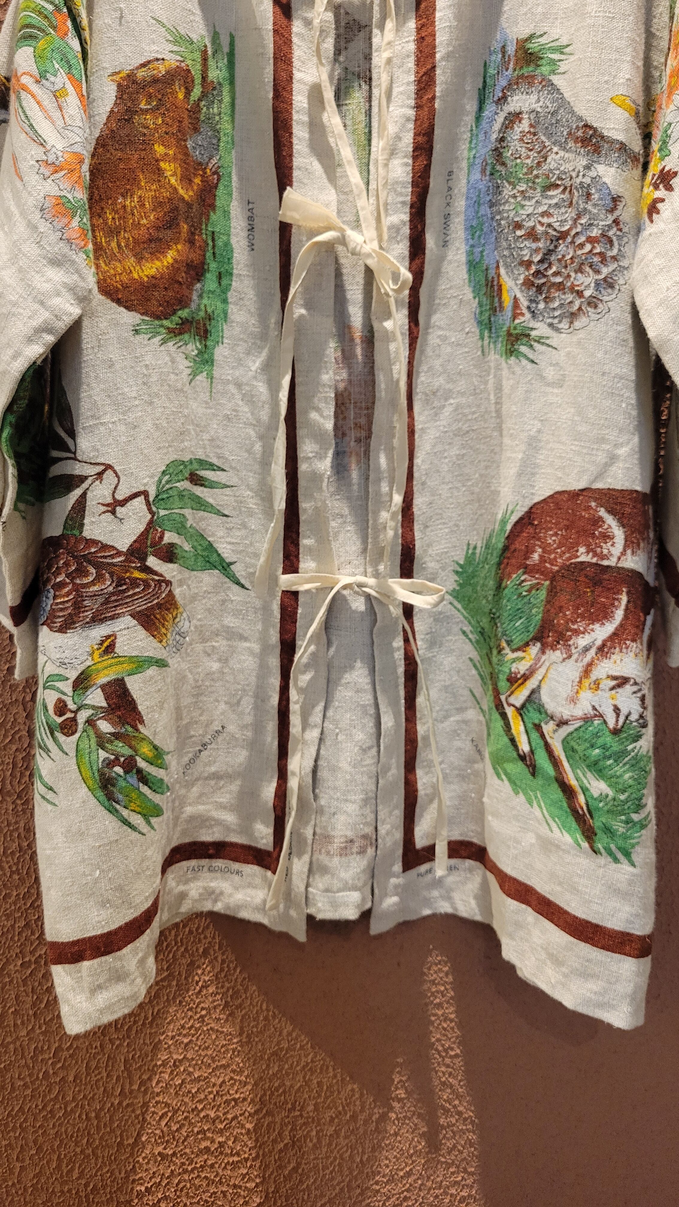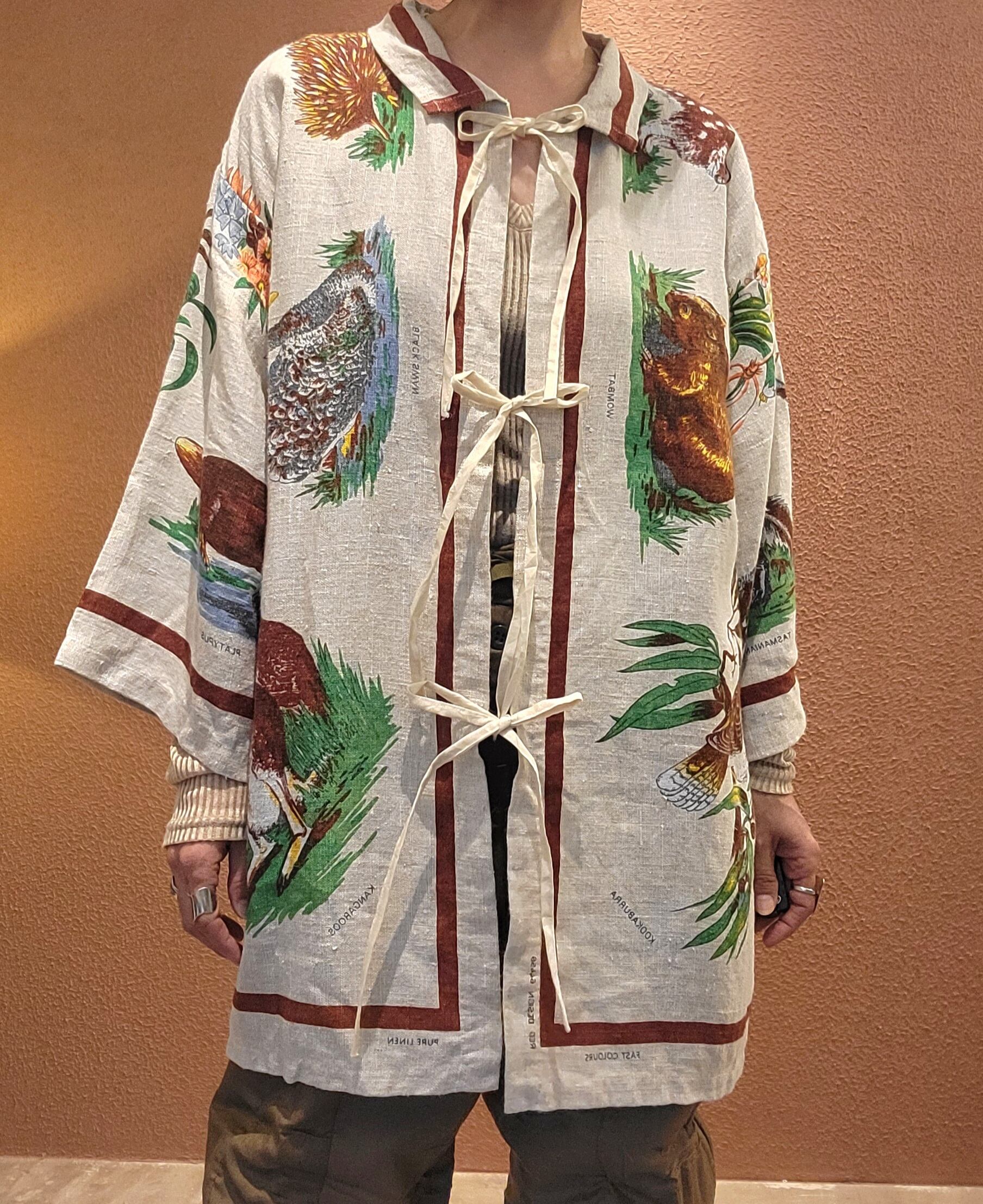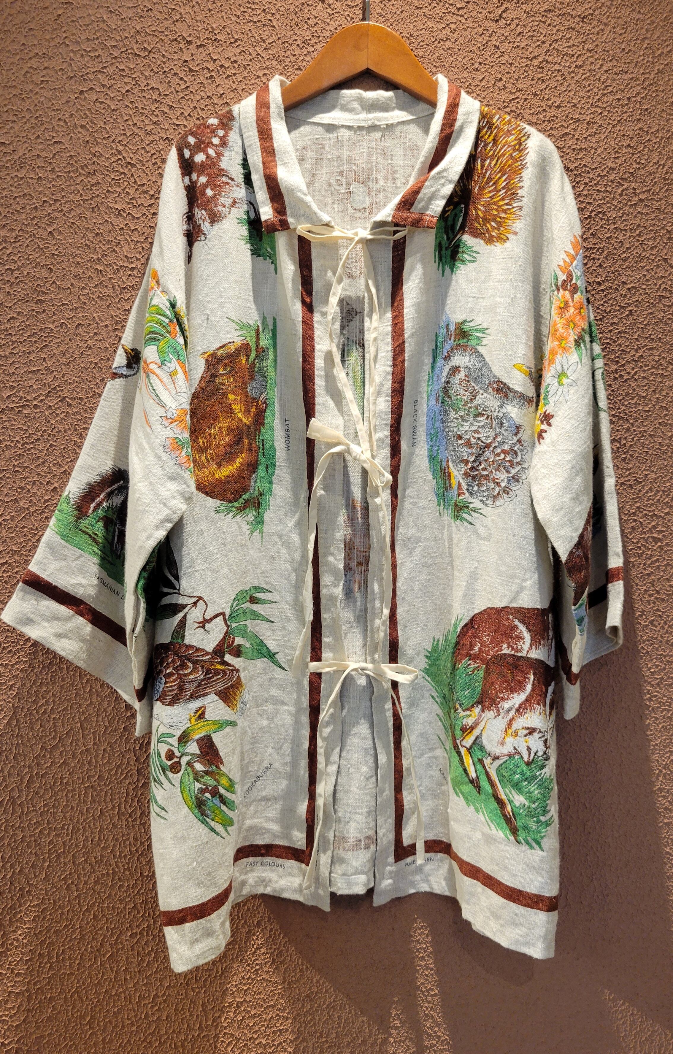 Made in Australiaのヴィンテージリネンクロスを使用したリメイクハーフガウン。全面にオーストラリアの野生動物がプリントされています。上質なヴィンテージリネンのざっくりした風合いと落ち着いた色味が魅力です。フロントのリボンは結んでもそのまま垂らして着ても素敵です。*後ろ身頃左下辺りに2×3cmほどの薄いシミがあります。画像でご確認ください。