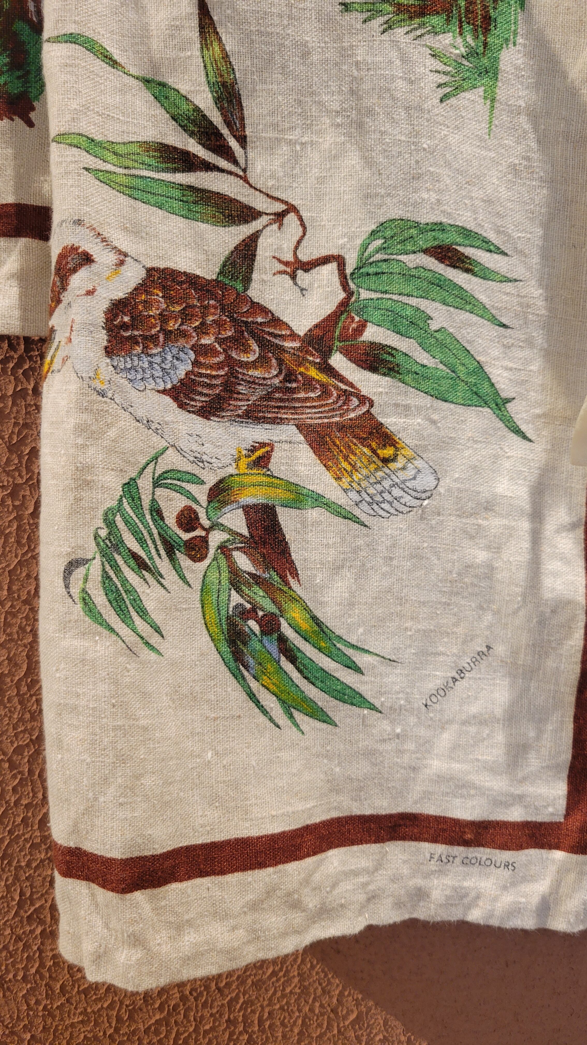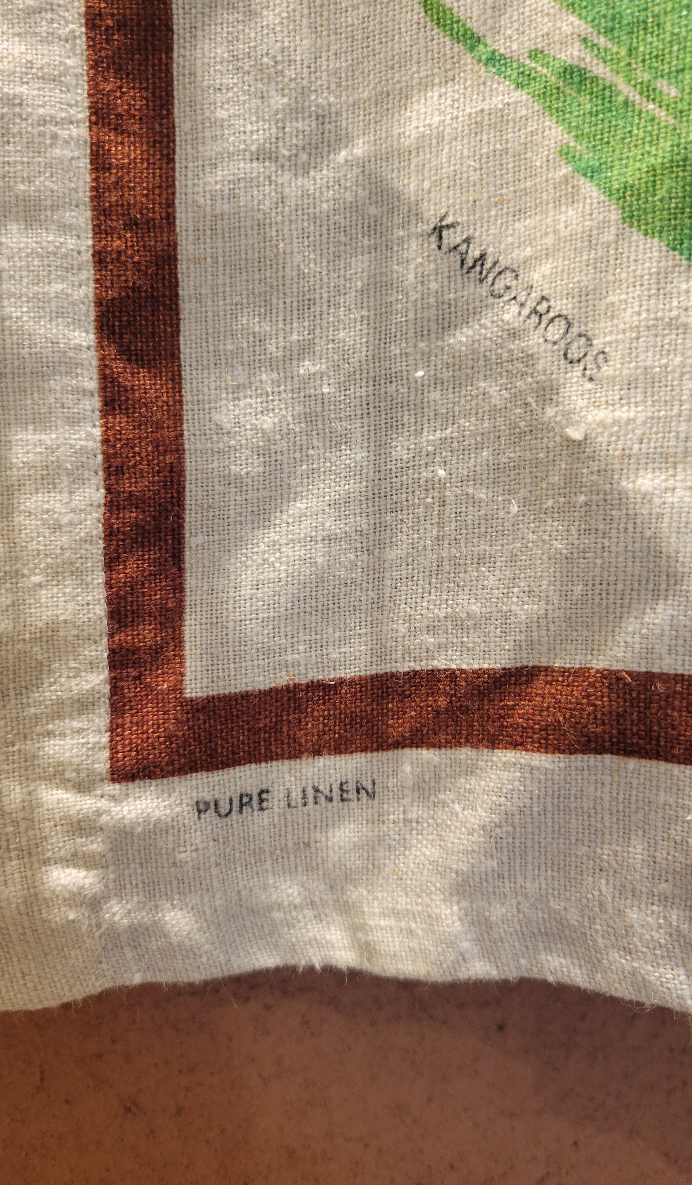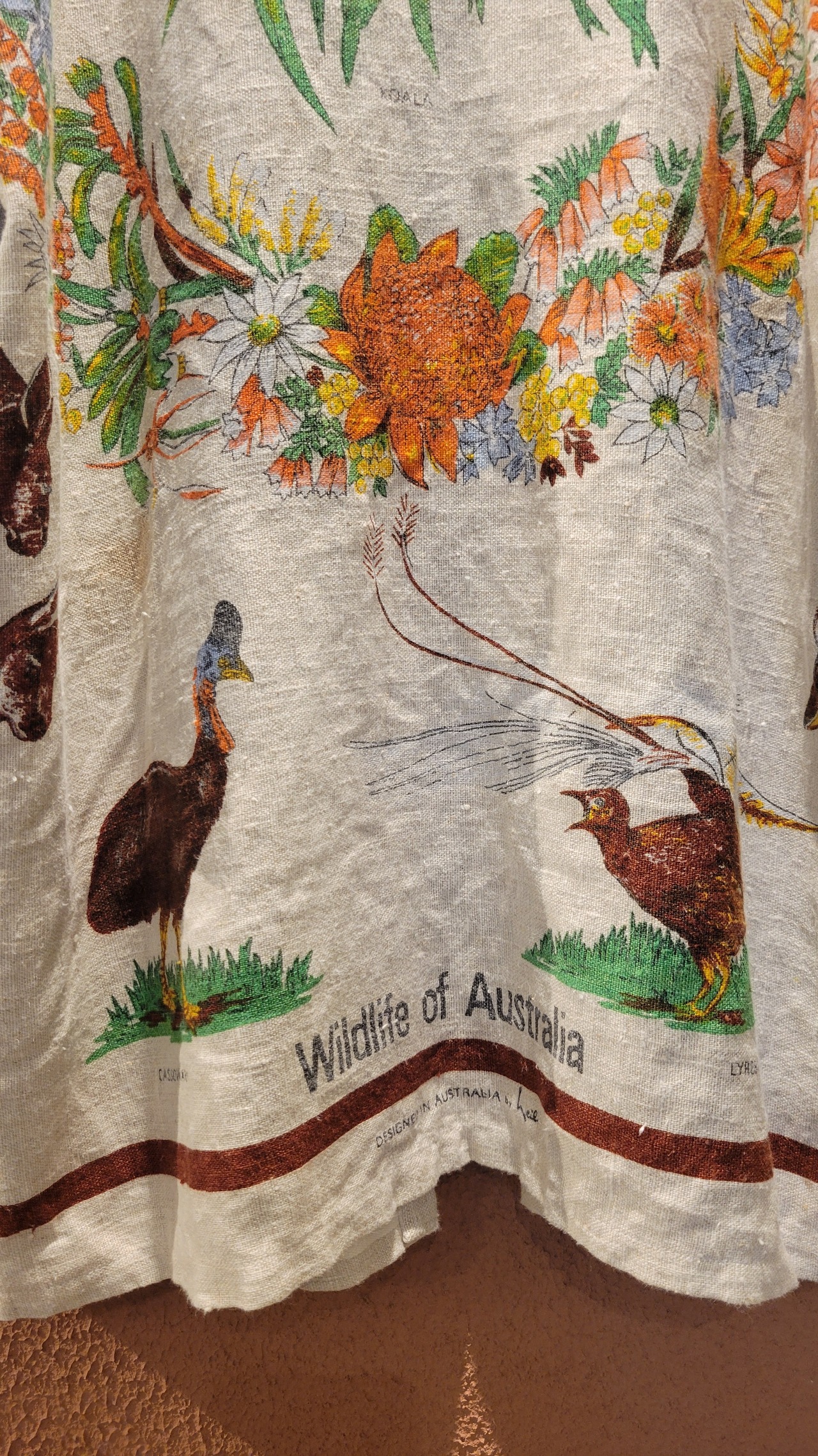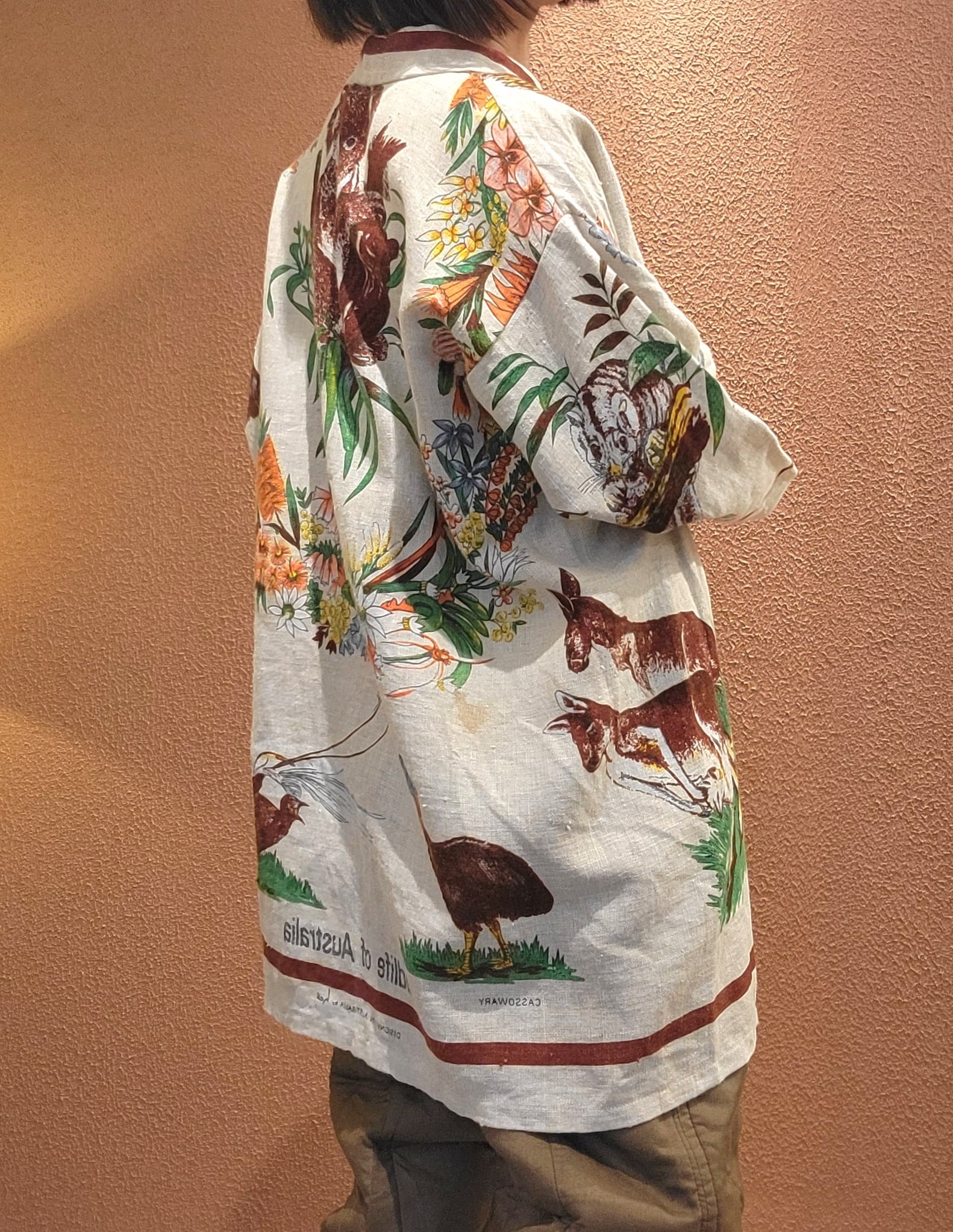 Made in Australiaのヴィンテージリネンクロスを使用したリメイクハーフガウン。全面にオーストラリアの野生動物がプリントされています。上質なヴィンテージリネンのざっくりした風合いと落ち着いた色味が魅力です。フロントのリボンは結んでもそのまま垂らして着ても素敵です。*後ろ身頃左下辺りに2×3cmほどの薄いシミがあります。画像でご確認ください。