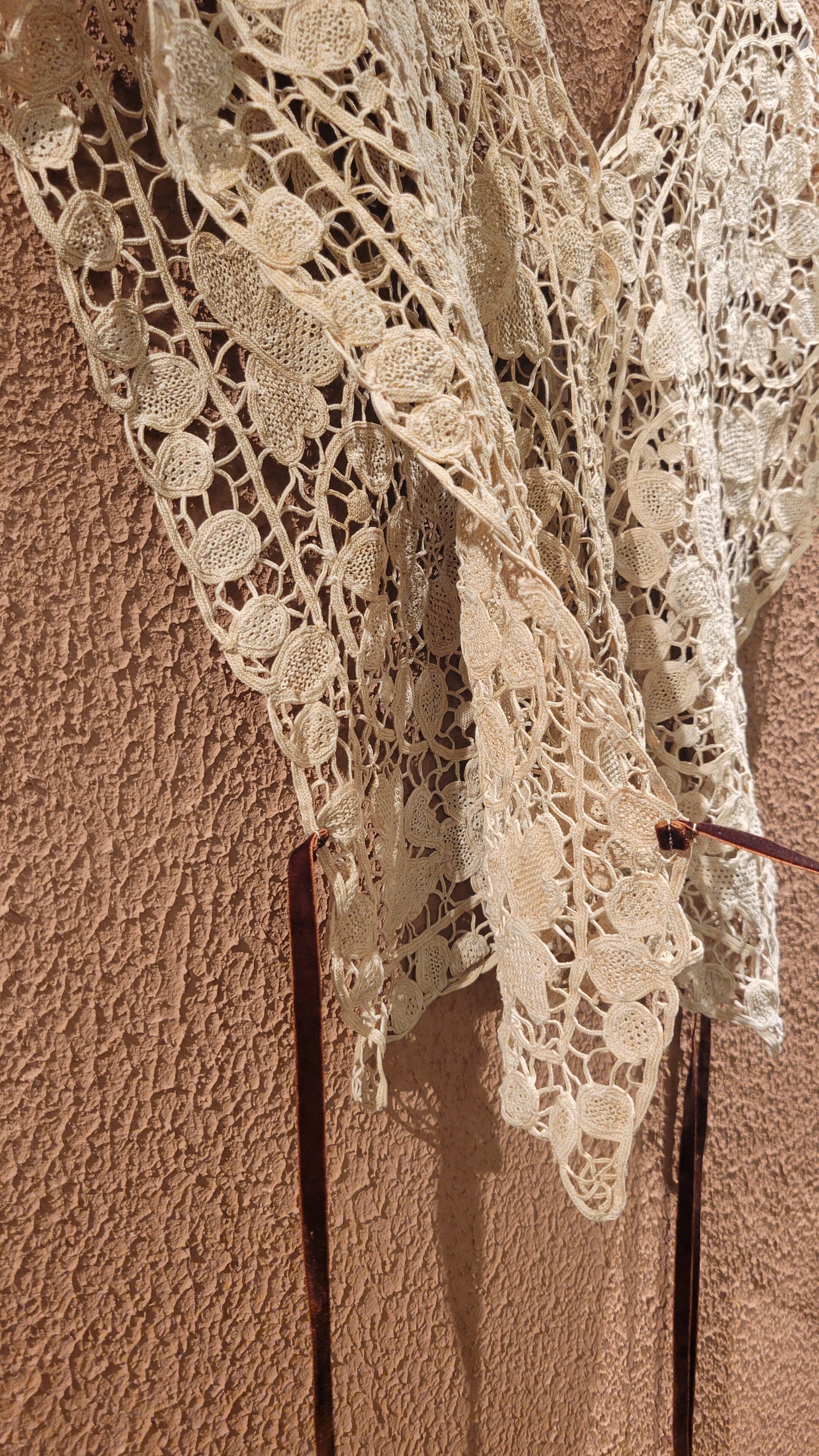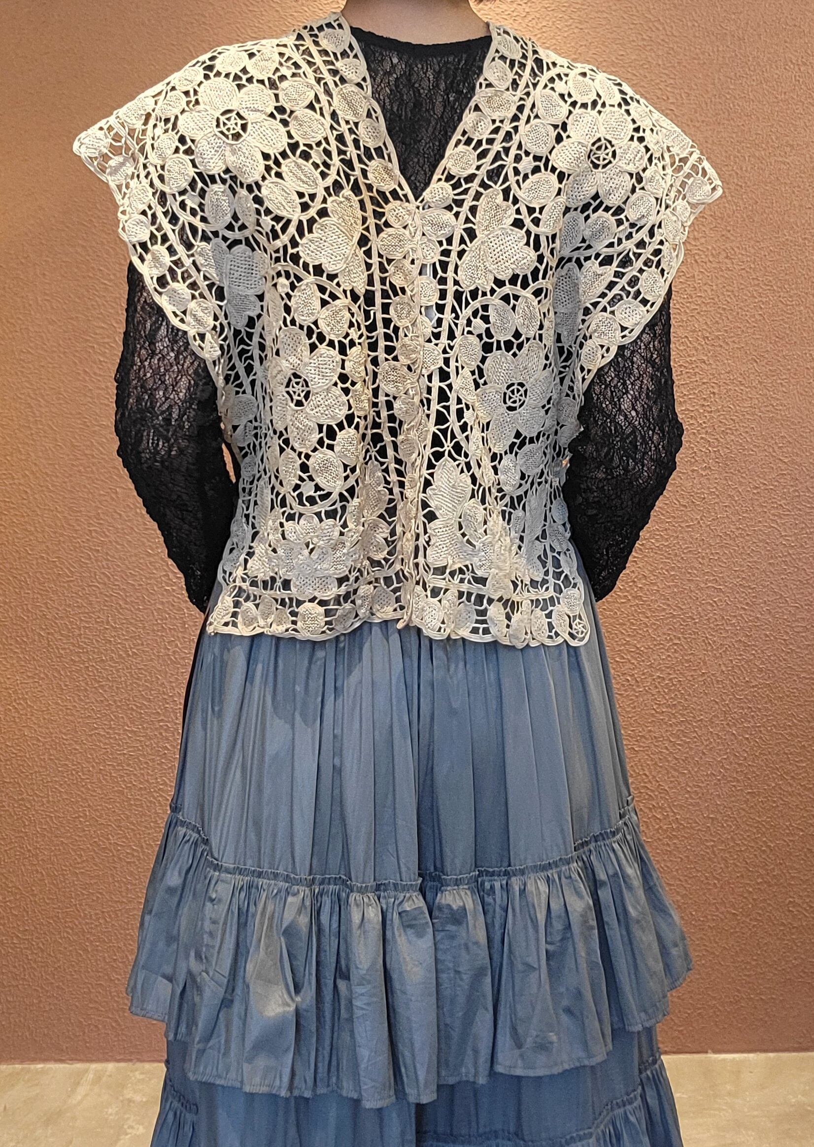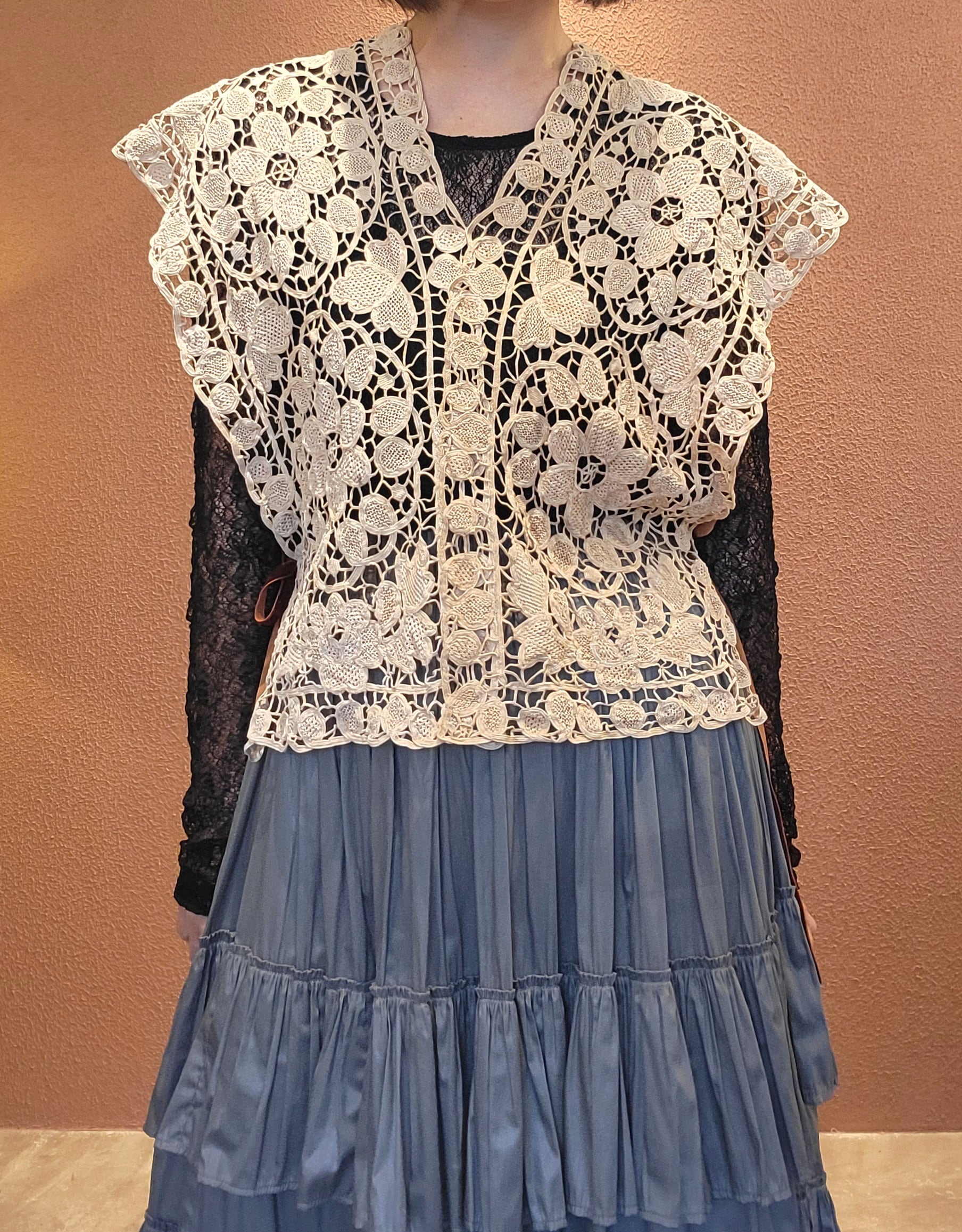 ヴィンテージレースを使用したリメイクベスト/ トップス。素材表記はありませんがコットンのようです。縦横どちら向きでも着用できる2way仕様。サイドはオープンでベルベットリボン付きです。リボンは結んでもそのまま垂らしても素敵ですレースの経年の風合いが素敵な1枚です。