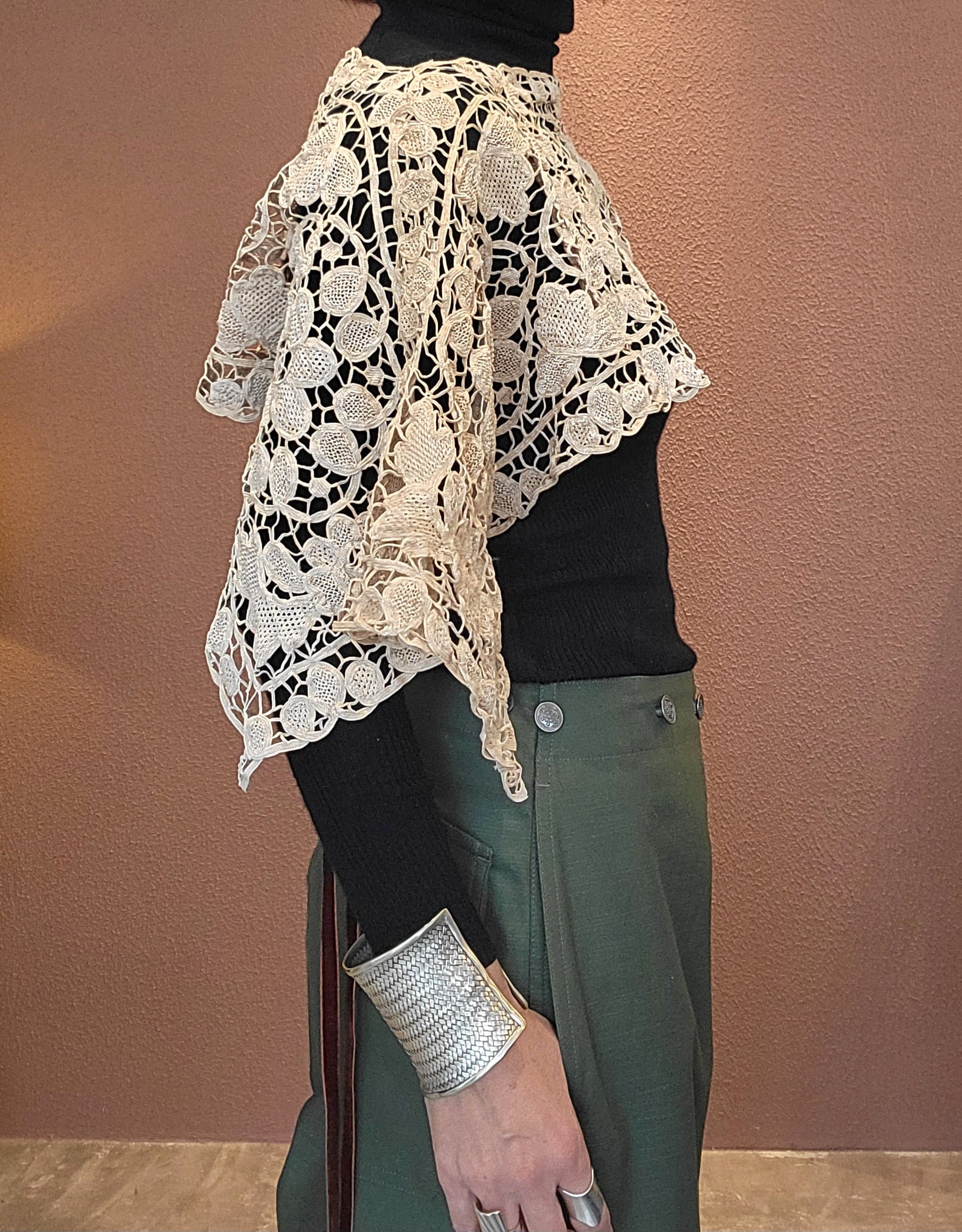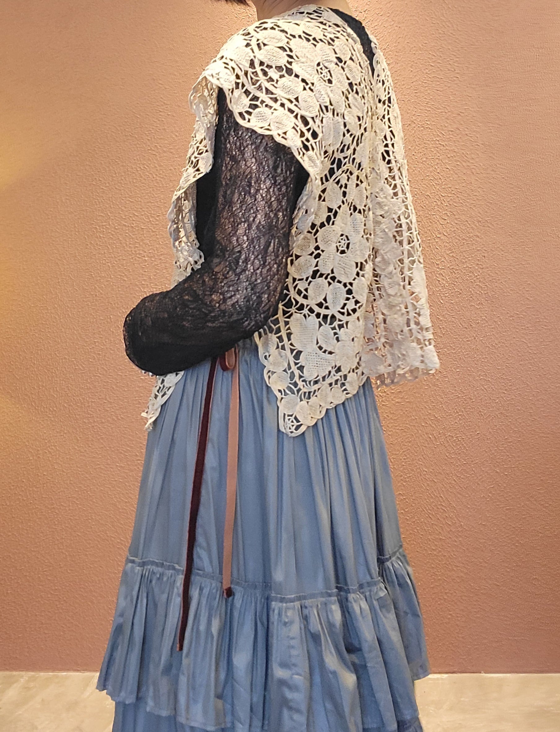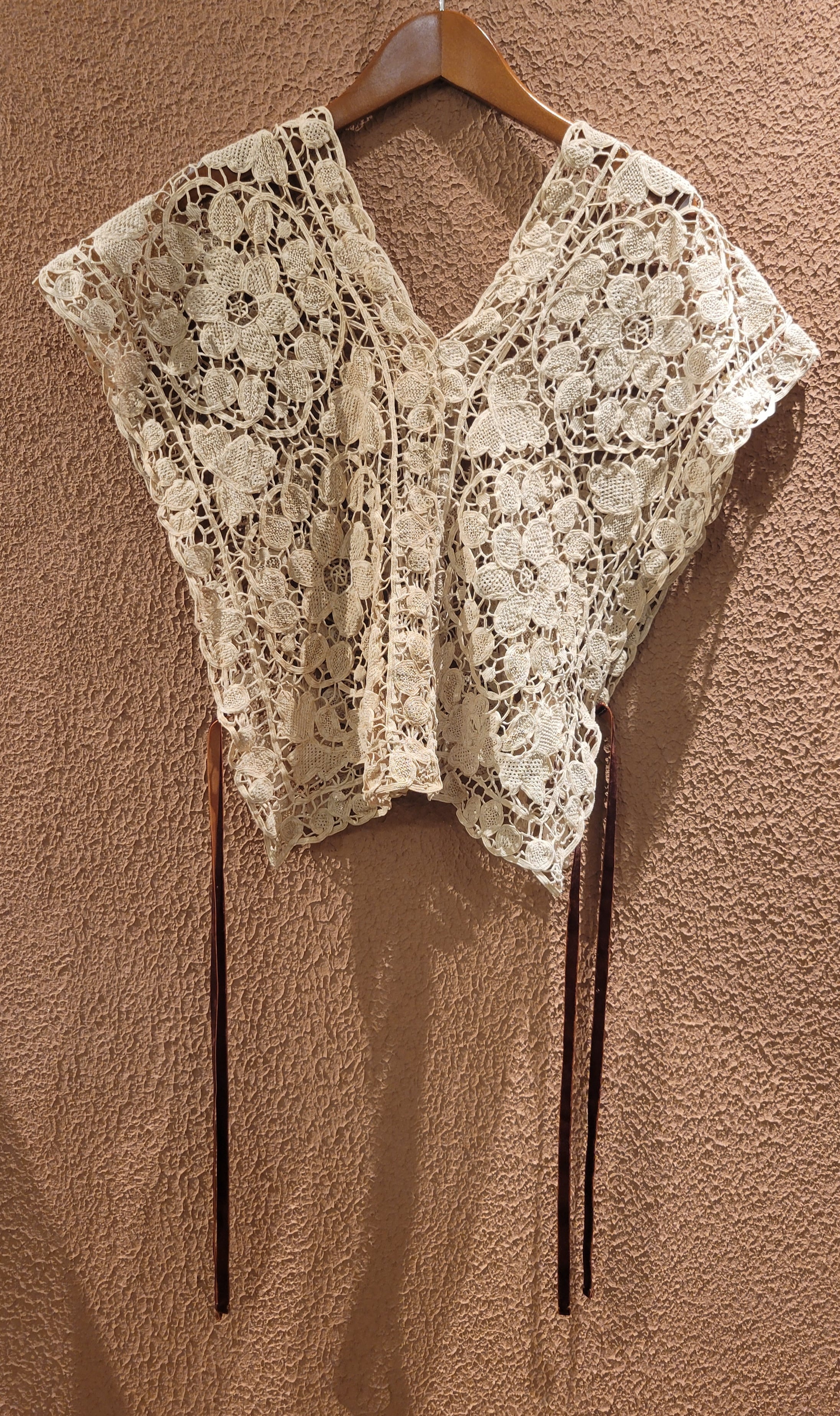 ヴィンテージレースを使用したリメイクベスト/ トップス。素材表記はありませんがコットンのようです。縦横どちら向きでも着用できる2way仕様。サイドはオープンでベルベットリボン付きです。リボンは結んでもそのまま垂らしても素敵ですレースの経年の風合いが素敵な1枚です。