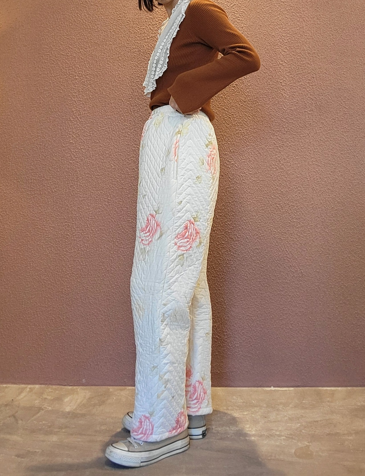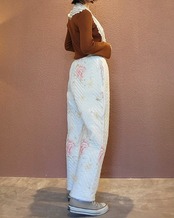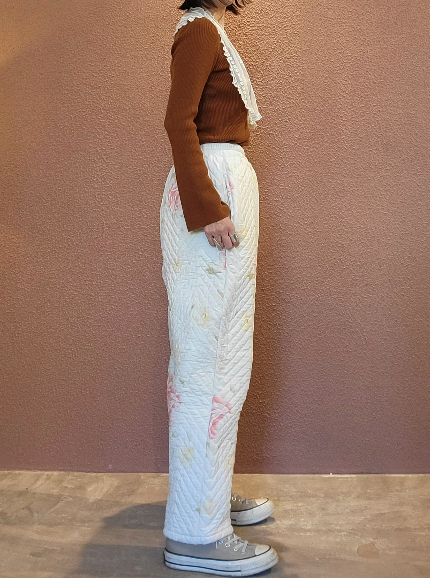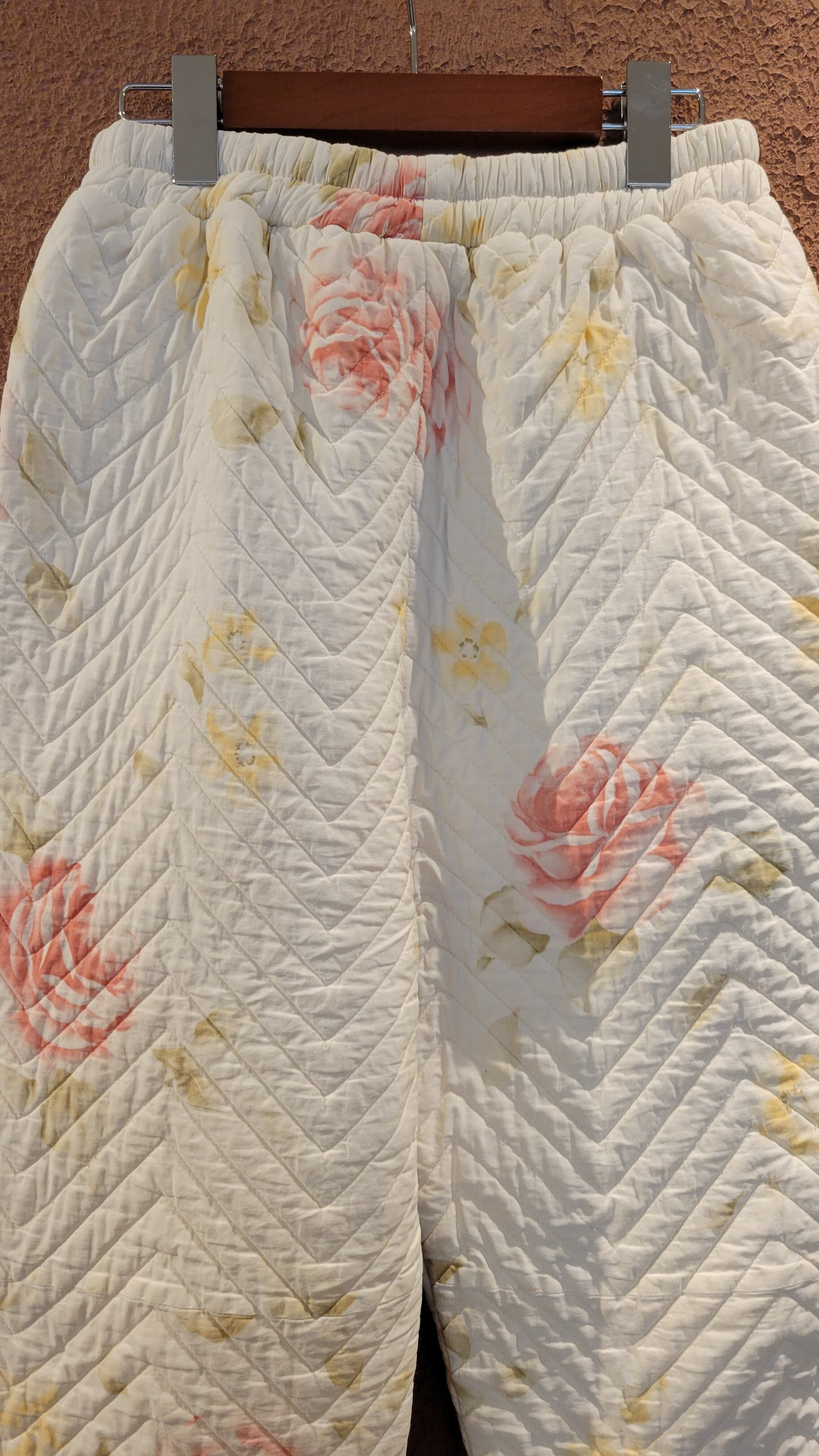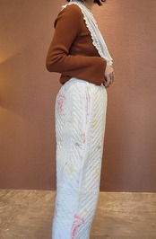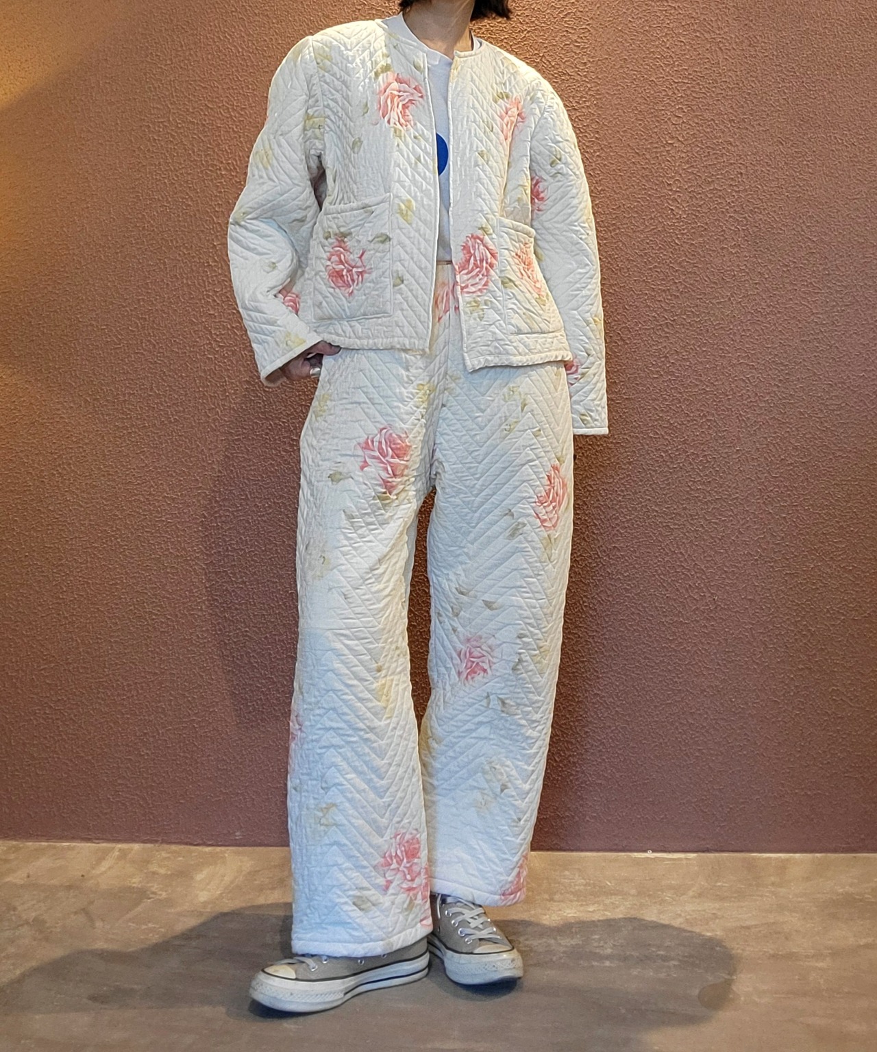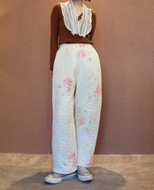 ヴィンテージキルト生地を使用したリメイクイージーパンツ。素材表記はありませんがコットンのようです。2枚合わせのキルトで厚みがあります。ウエストゴム、左右にシームポケット付きです。ほど良い太めのシルエットで甘めのプリントながらカジュアルに仕上がります。別売で共布で仕立てたジャケットもございます。
