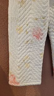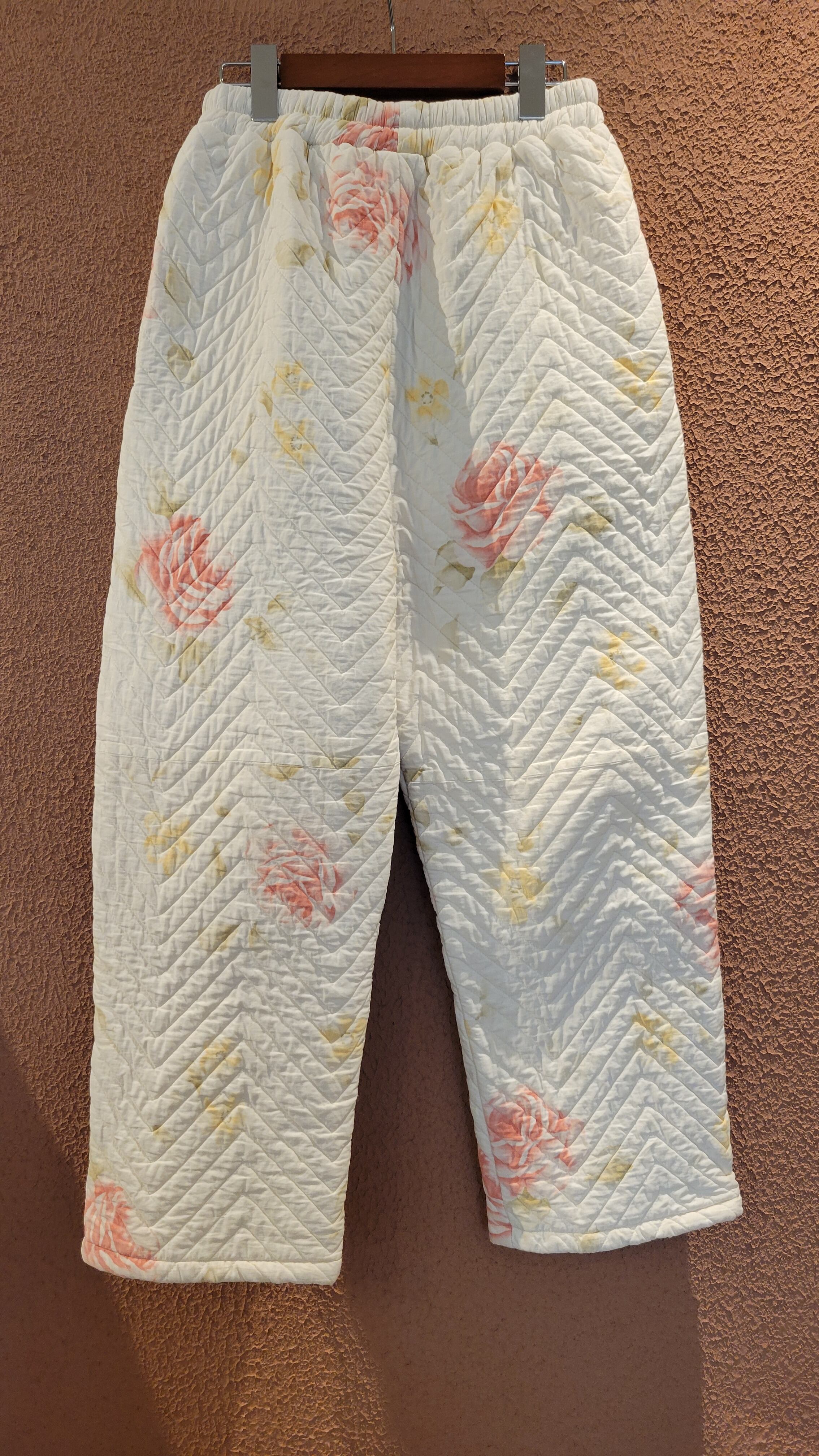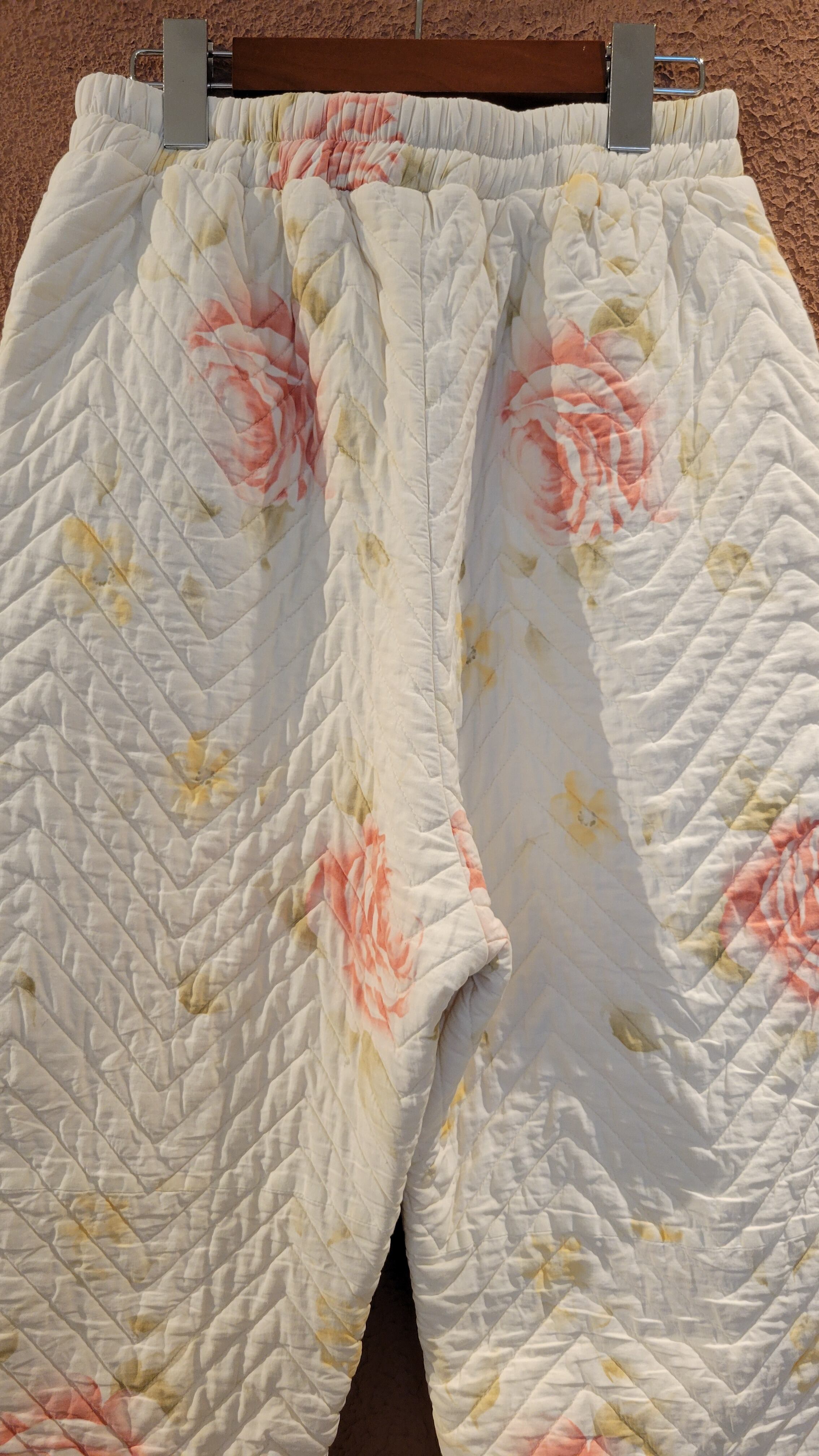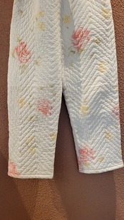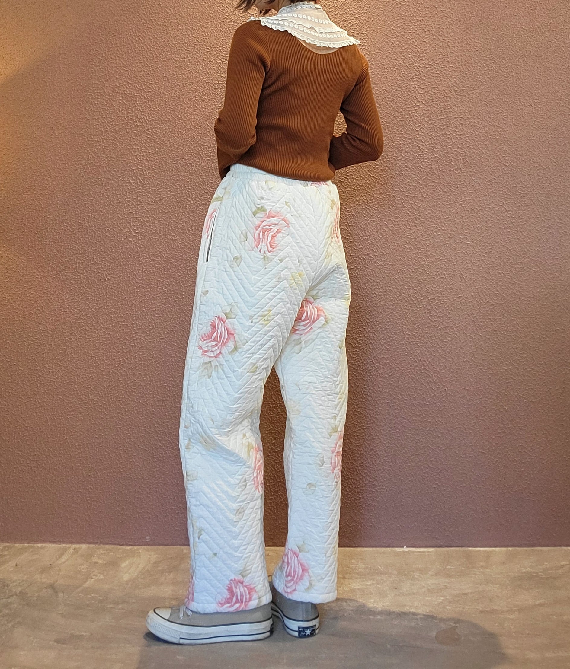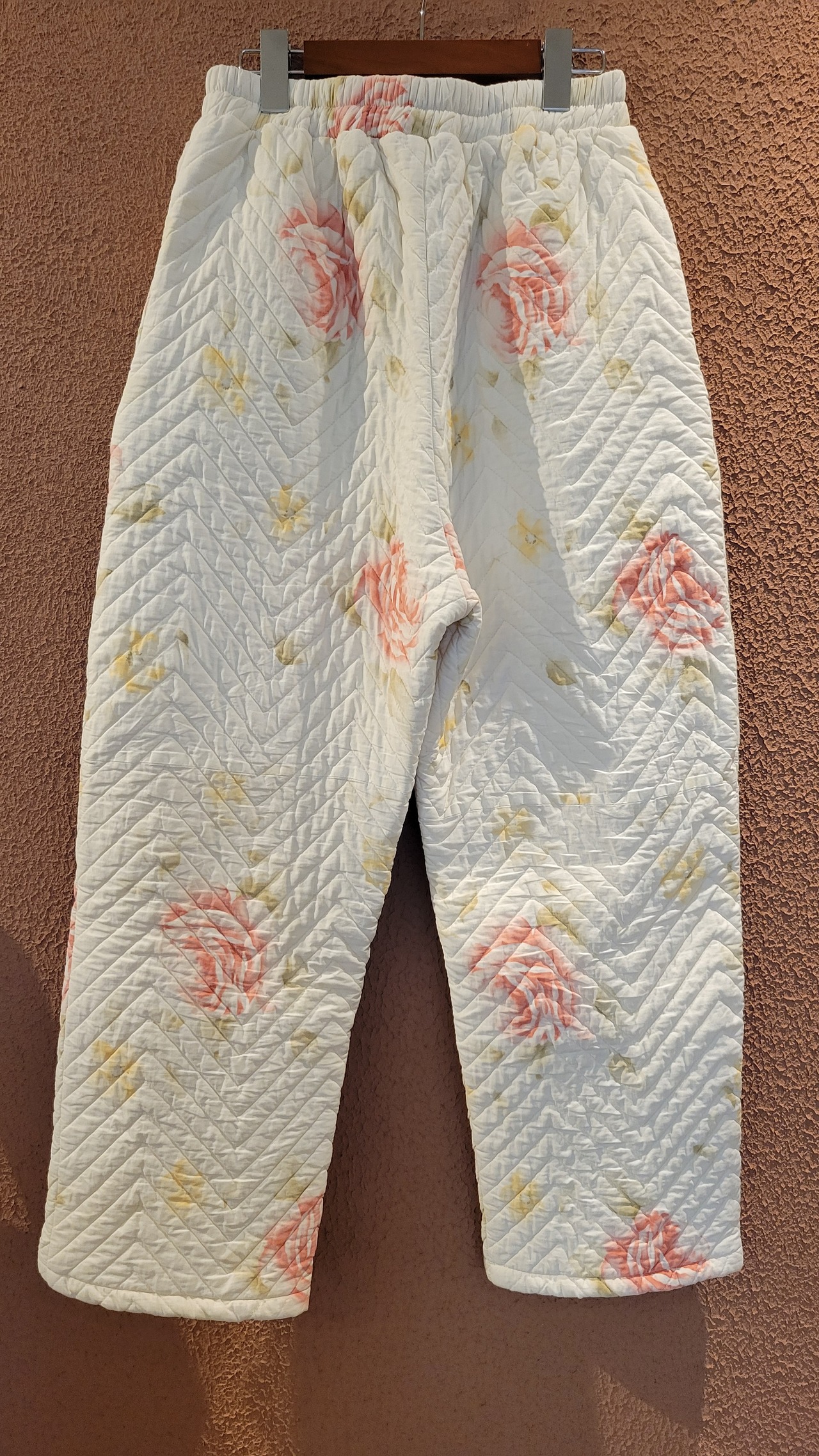 ヴィンテージキルト生地を使用したリメイクイージーパンツ。素材表記はありませんがコットンのようです。2枚合わせのキルトで厚みがあります。ウエストゴム、左右にシームポケット付きです。ほど良い太めのシルエットで甘めのプリントながらカジュアルに仕上がります。別売で共布で仕立てたジャケットもございます。