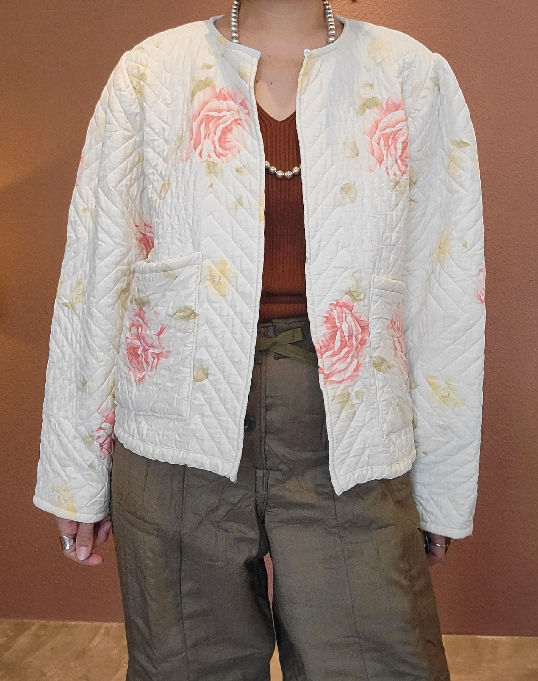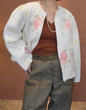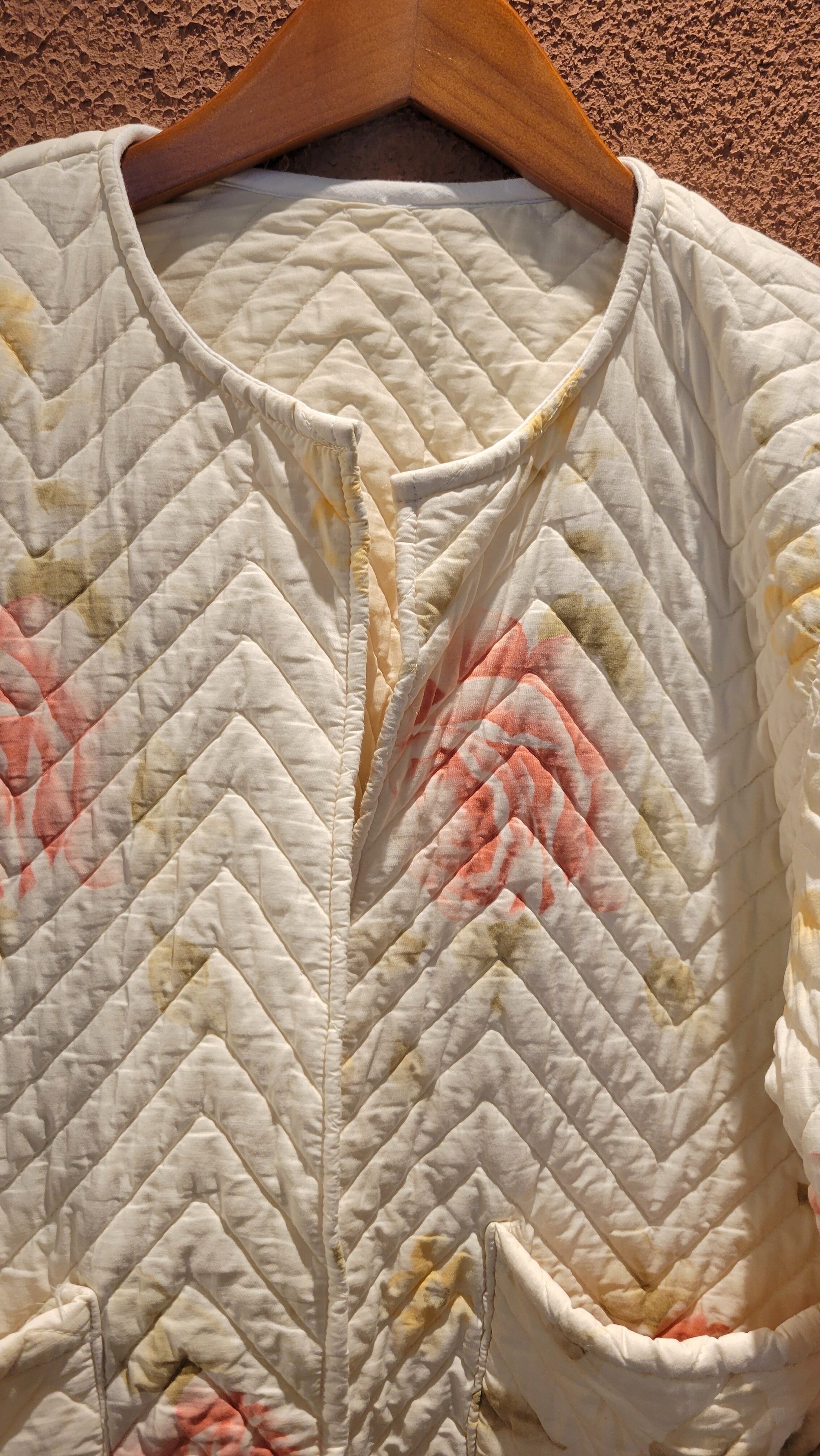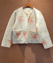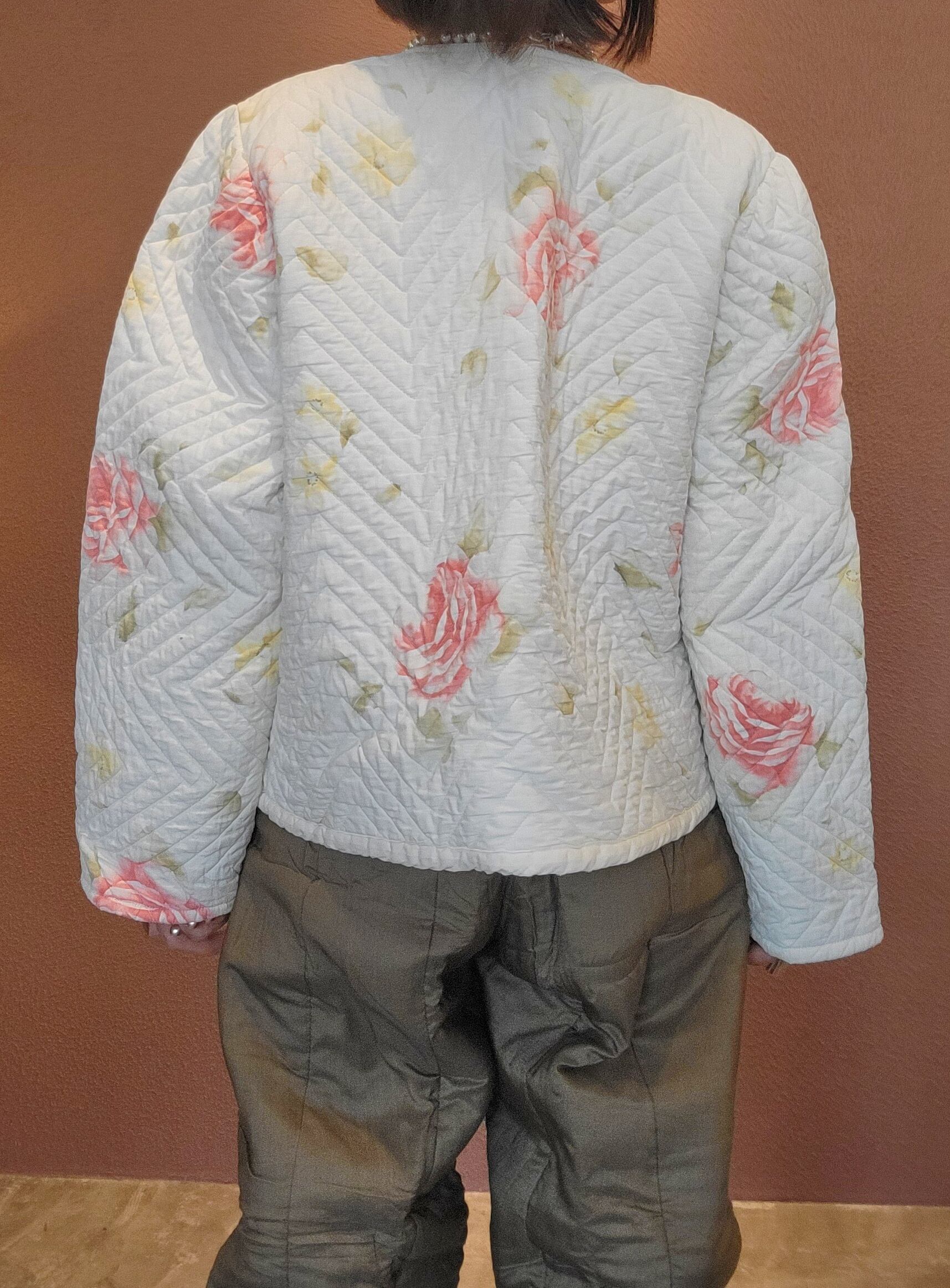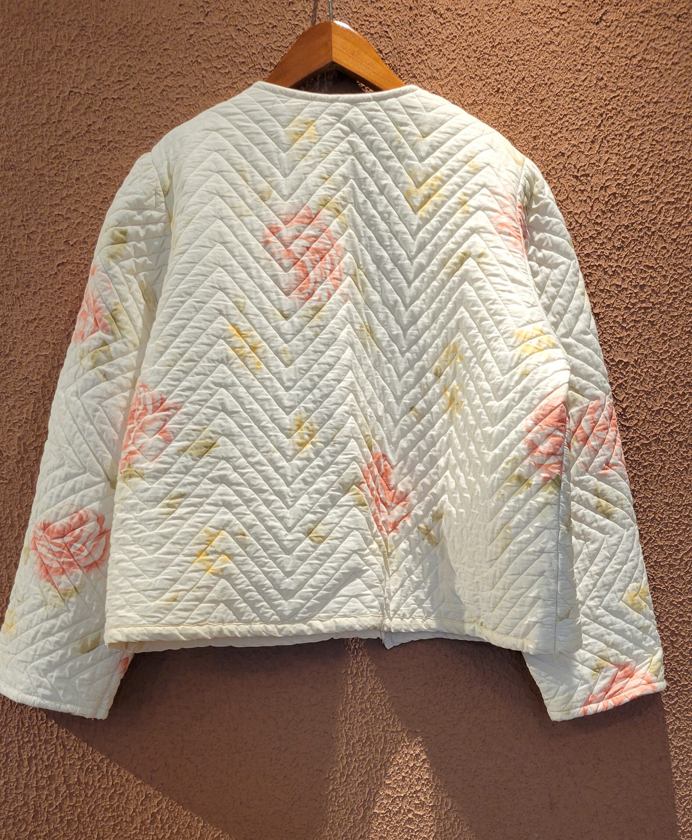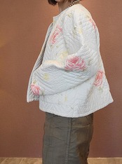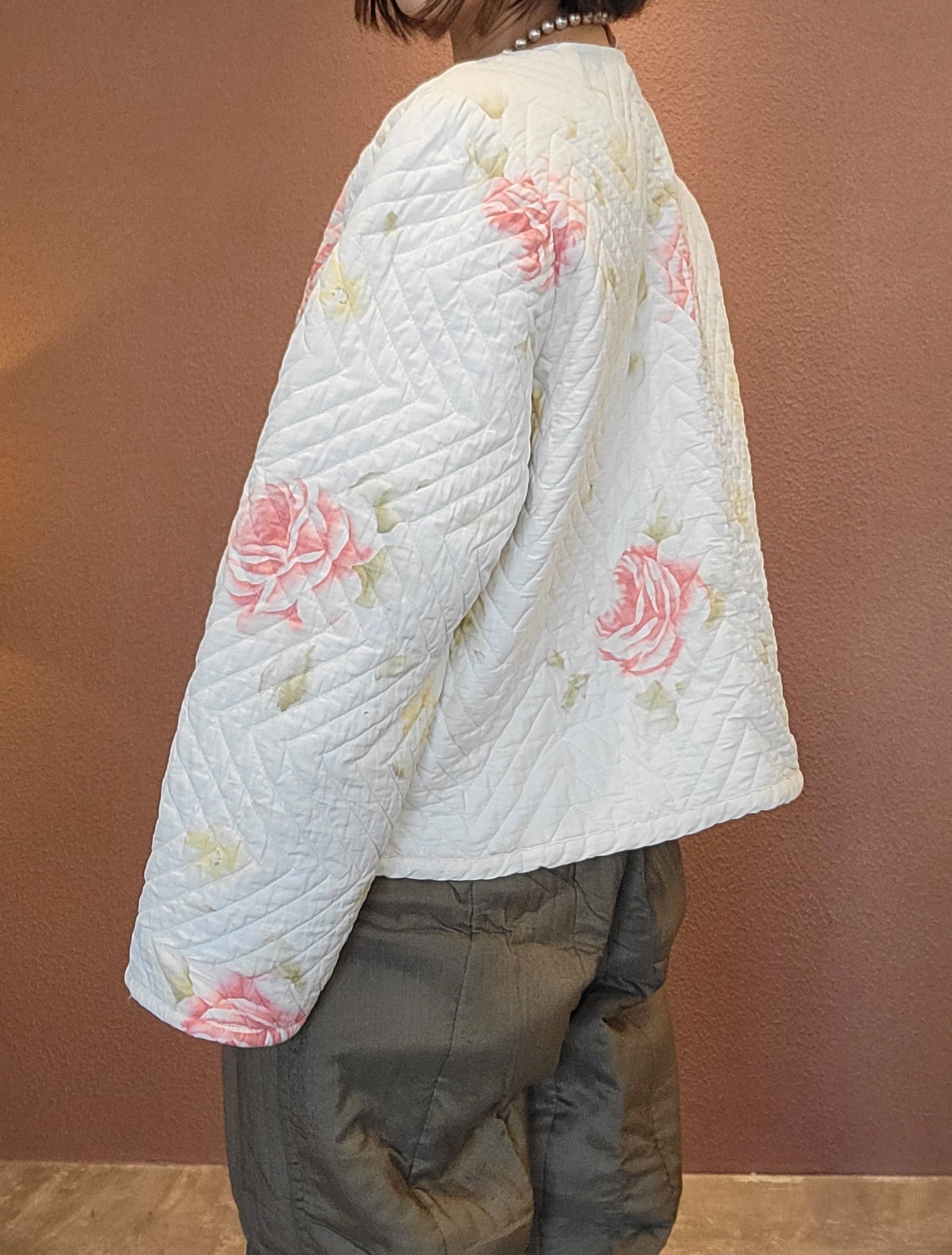 ヴィンテージキルト生地を使用したリメイクジャケット。素材表記はありませんがコットンのようです。2枚合わせのキルトでやや厚みがありますが軽量です。フロントオープンタイプ、ゆとりのあるサイズで抜け感、こなれ感があります。同素材のキルトパンツもございます。