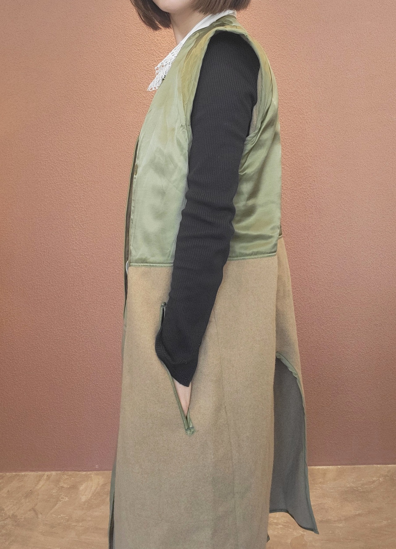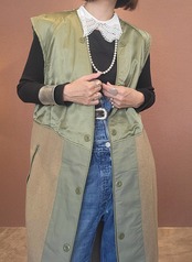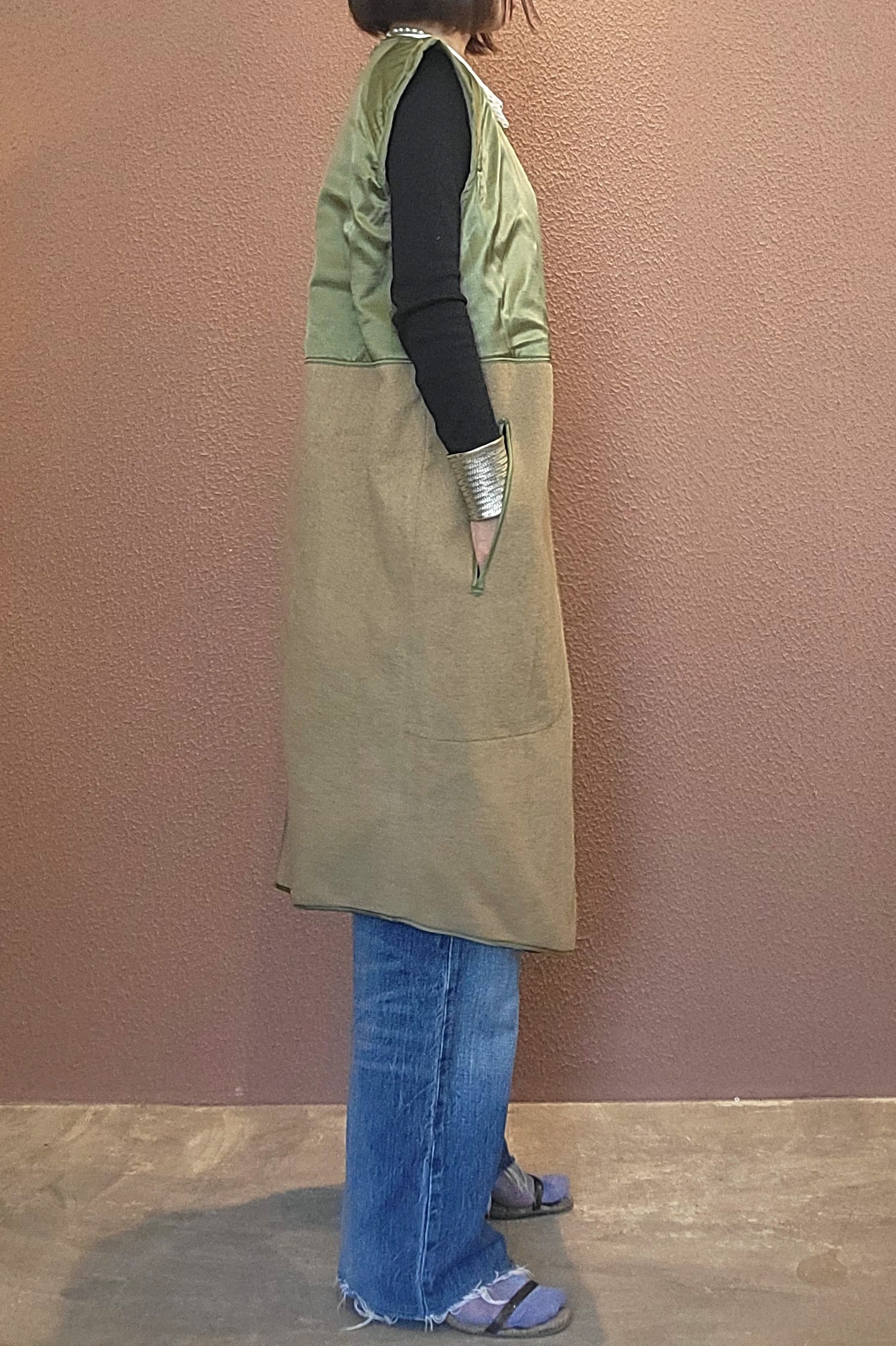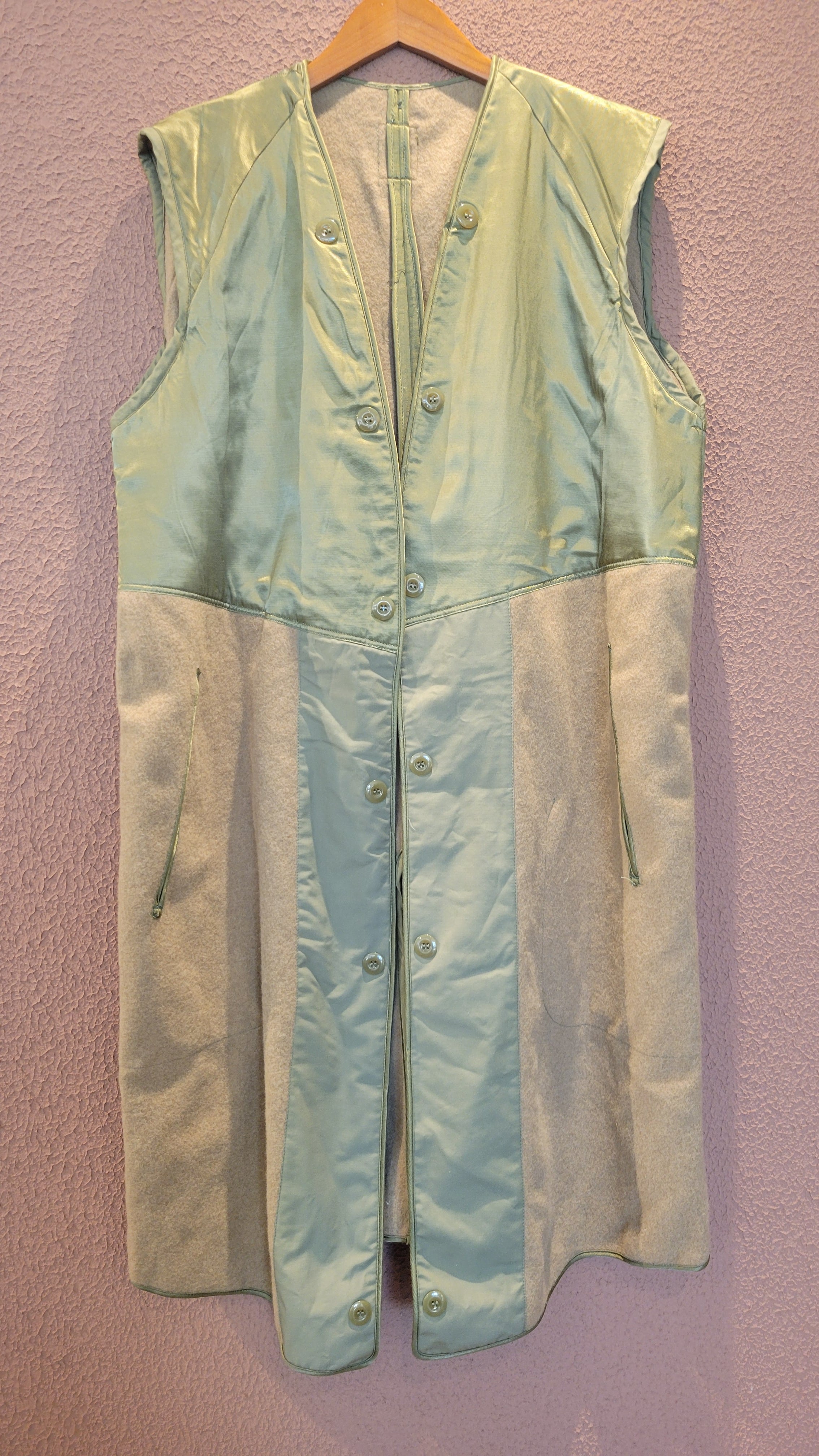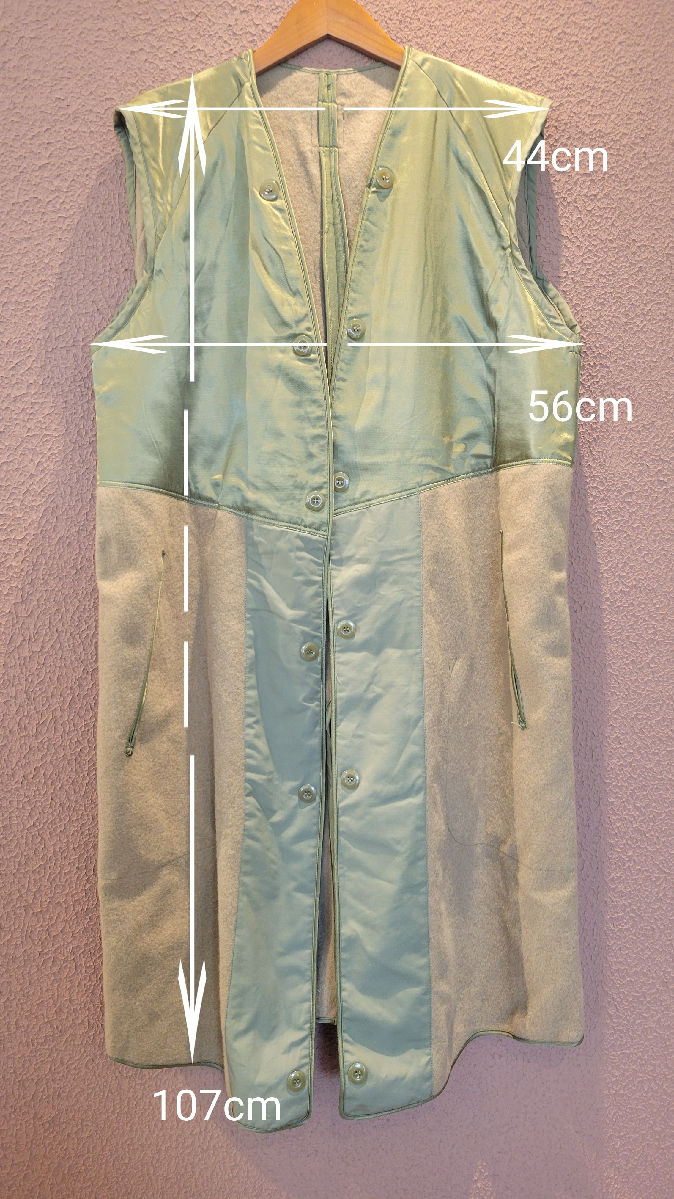 60s〜70sフランス軍トレンチコートのライナーとして製造されたウールベストです。DEADSTOCK(未使用)です。全体にウールが使用され、肩から胸あたりにかけてウールの上からサテン生地が使用されているため着脱がスムーズです。左右サイドに貫通式のポケット、内側にインナーポケット付きです。普段のスタイリングにプラスして使用できる、男女兼用アイテムです。