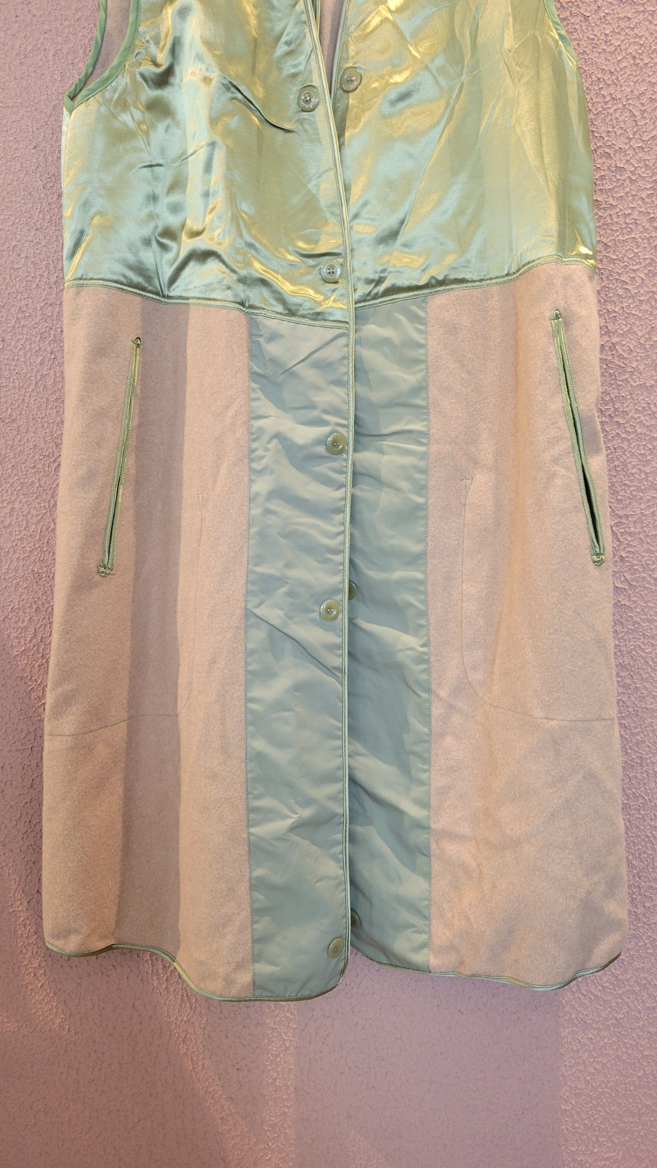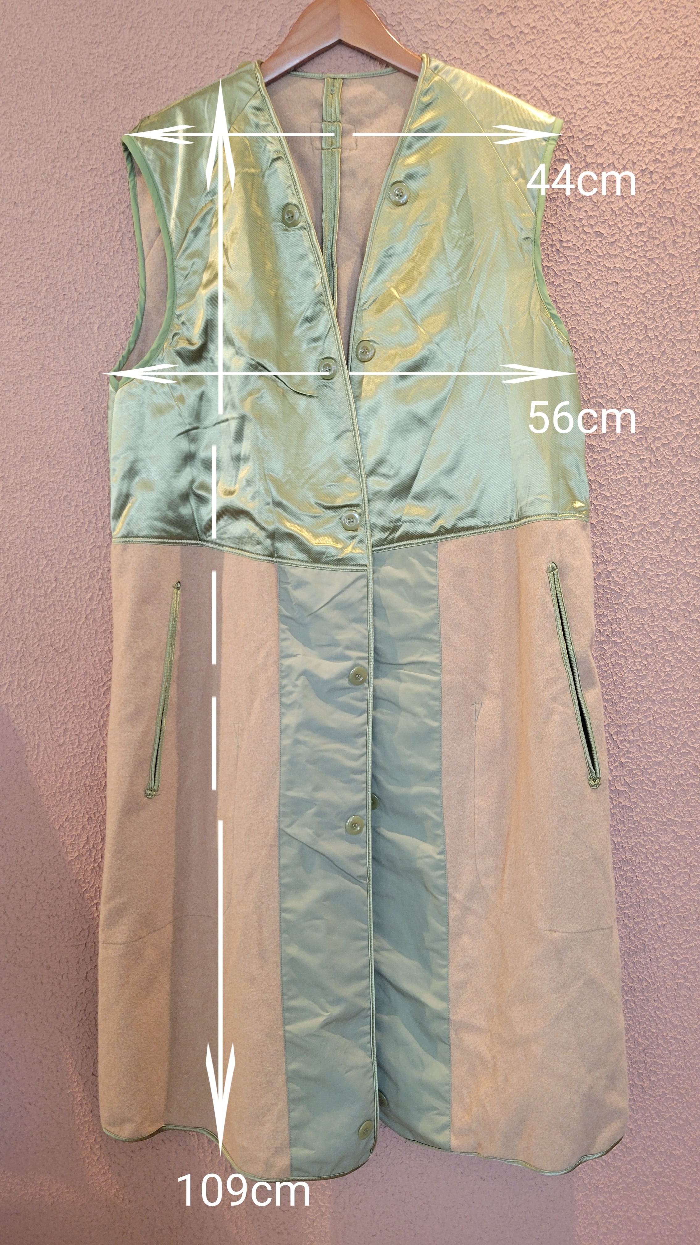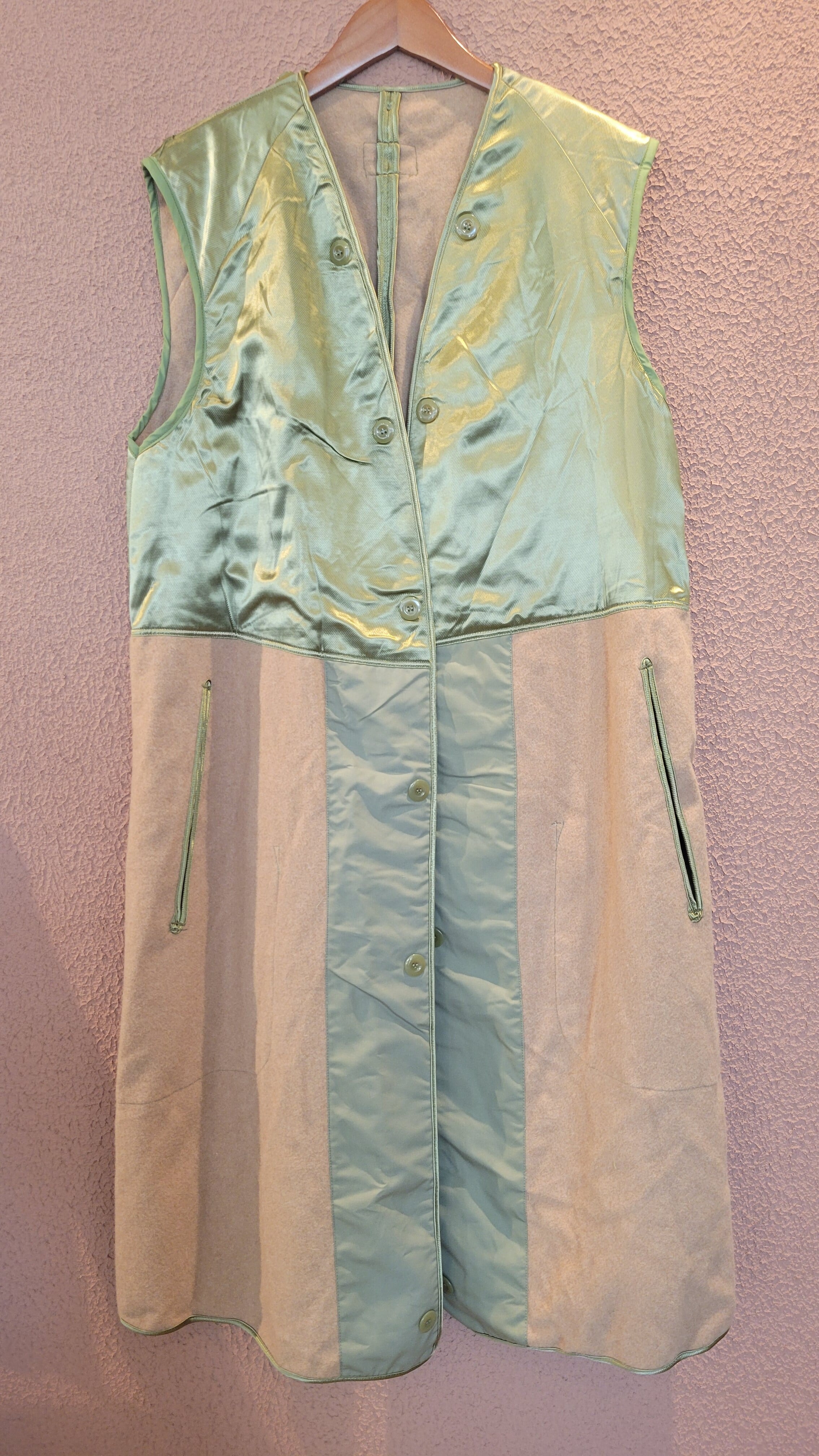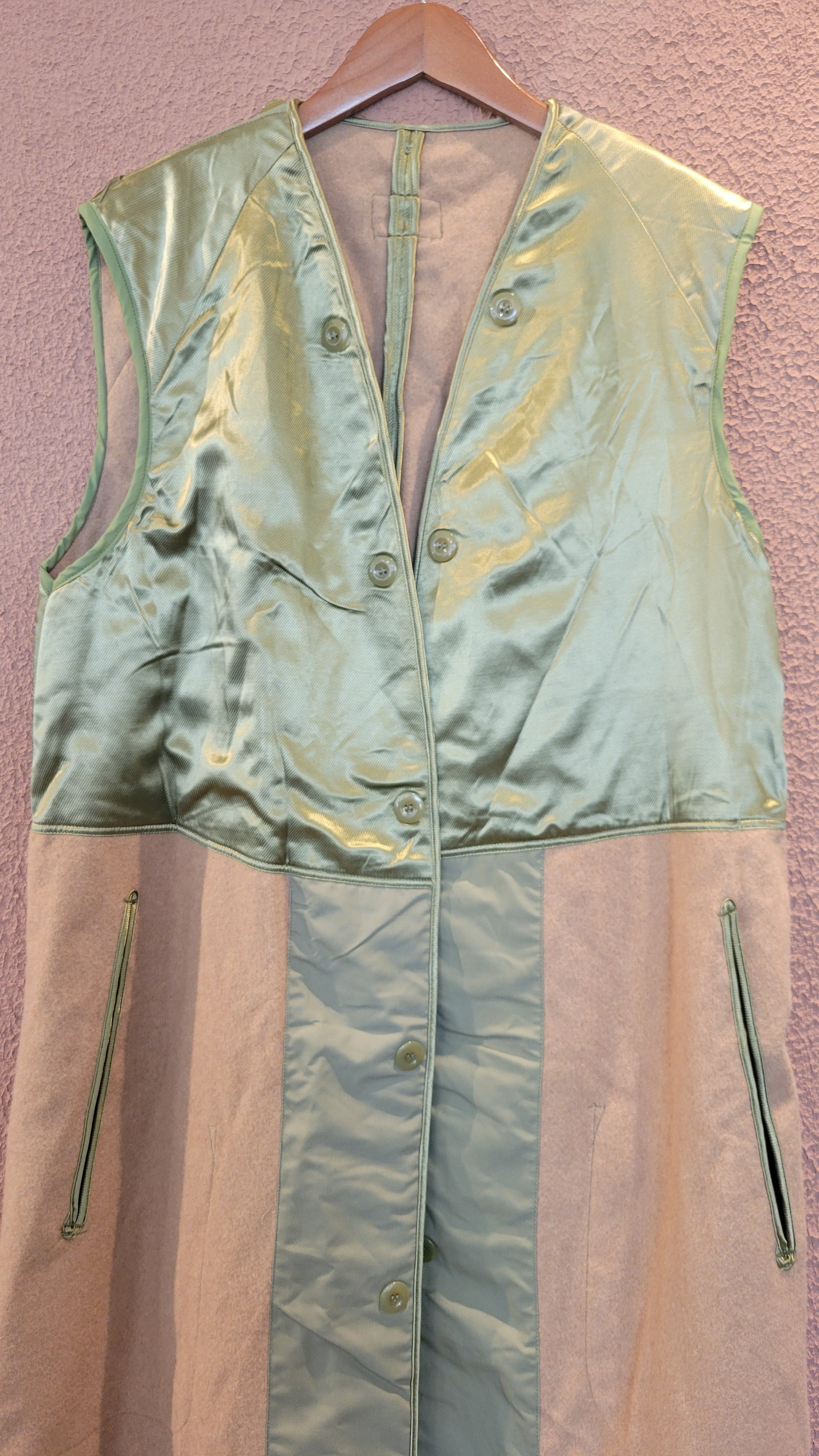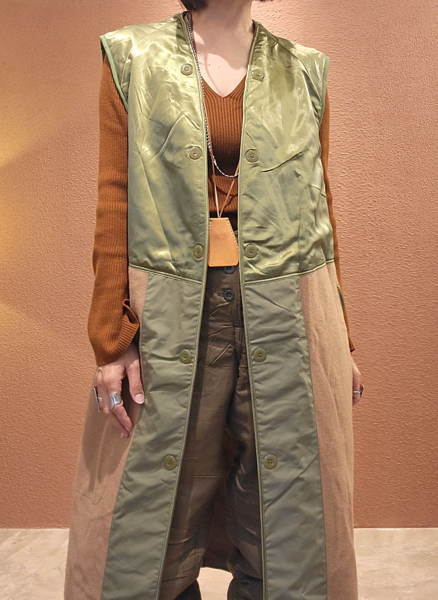 60s〜70sフランス軍トレンチコートのライナーとして製造されたウールベストです。DEADSTOCK(未使用)です。全体にウールが使用され、肩から胸あたりにかけてウールの上からサテン生地が使用されているため着脱がスムーズです。左右サイドに貫通式のポケット、その内側にインナーポケットが付いています。普段のスタイリングにプラスして使用できる男女兼用アイテムです。