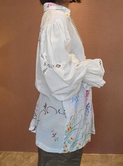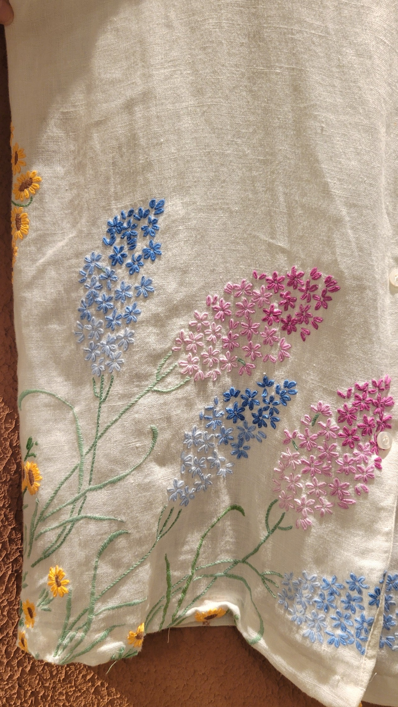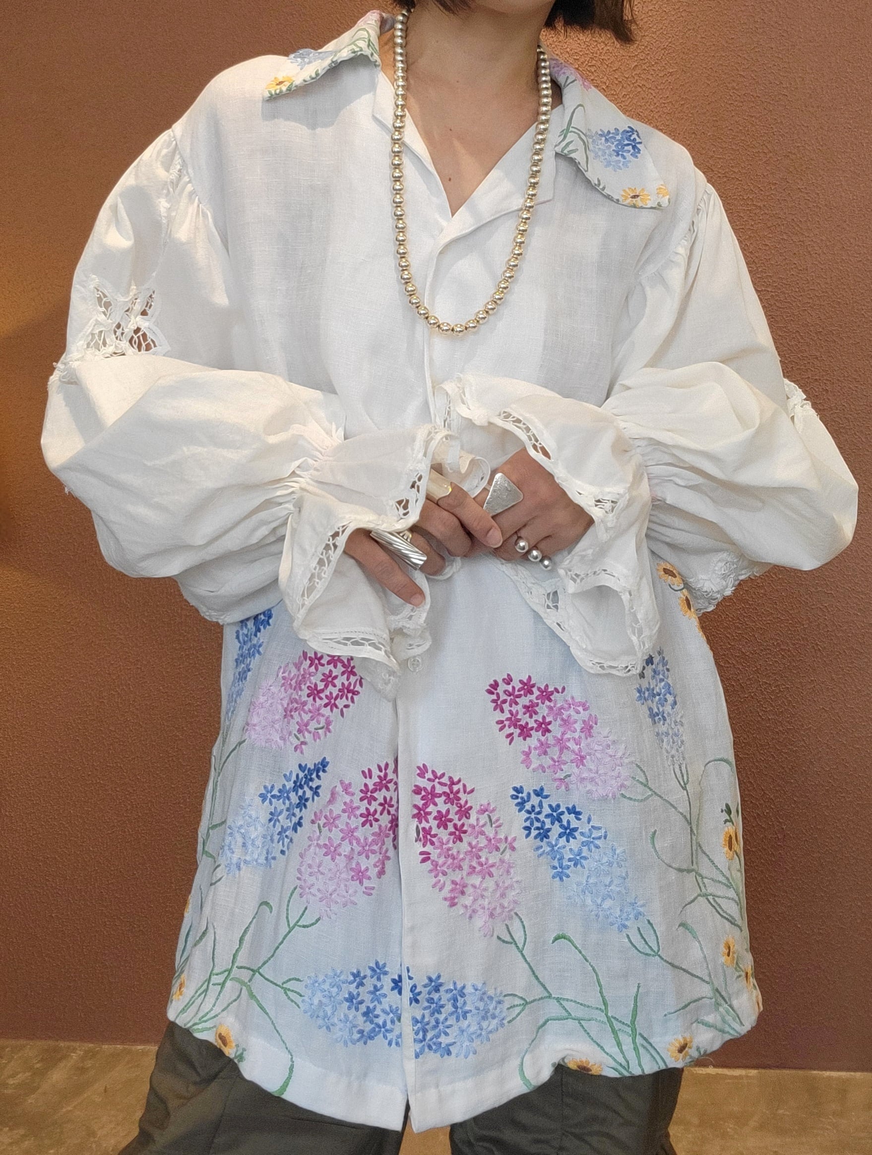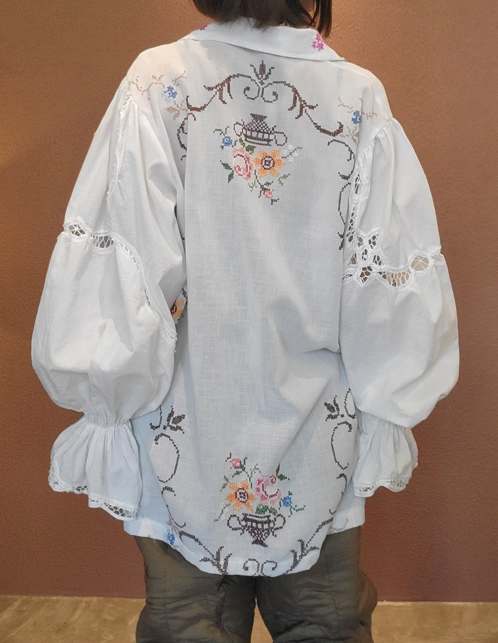 ヴィンテージのハンドステッチ刺繍クロスを使用したリメイクブラウス。素材表記はありませんが袖はコットン、身ごろはコットンリネンのような素材感です。オーバーサイズでゆるっとした着用感で甘くなりすぎず、デニムやミリタリーパンツ、スニーカーにも良く合います。