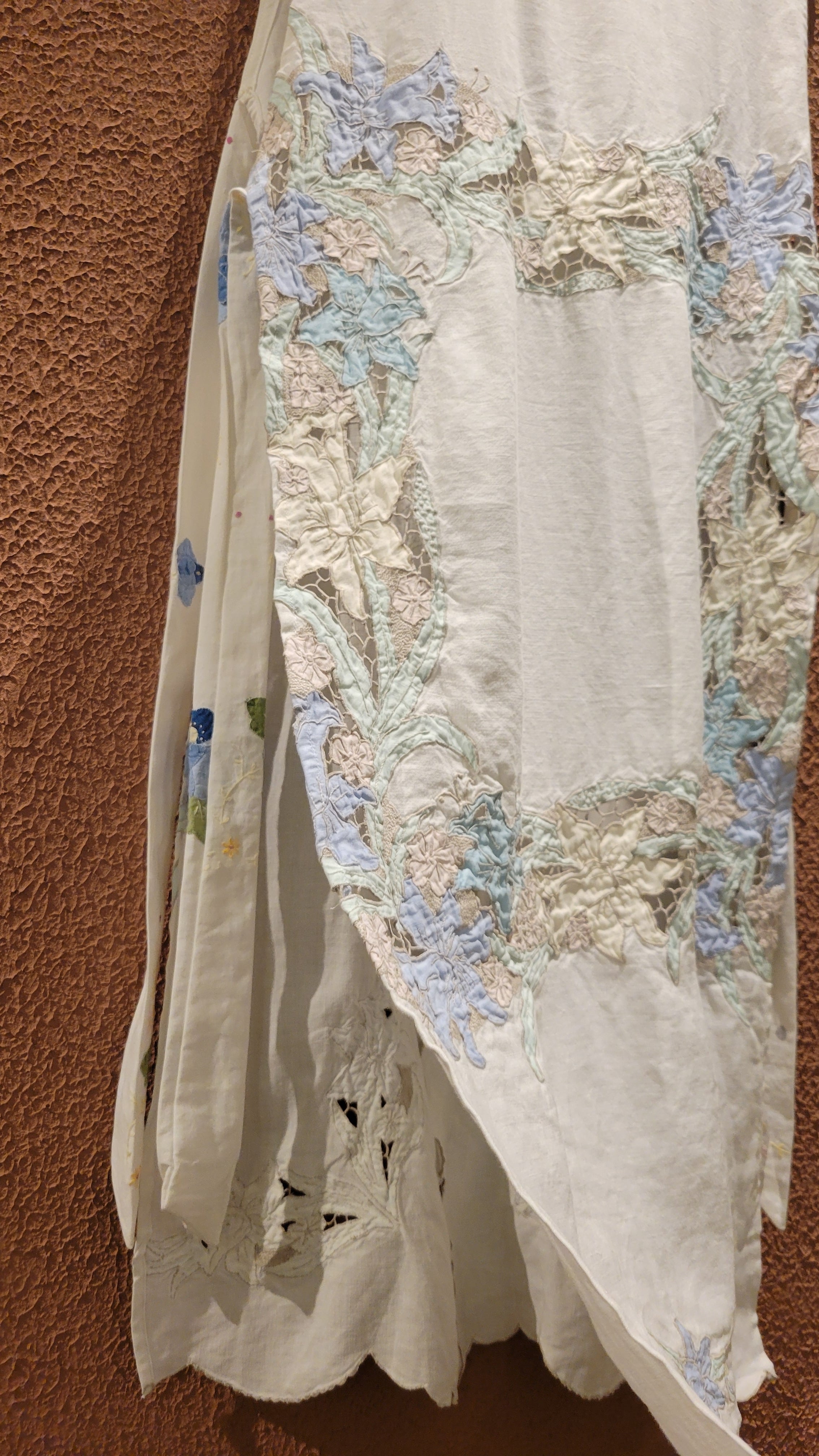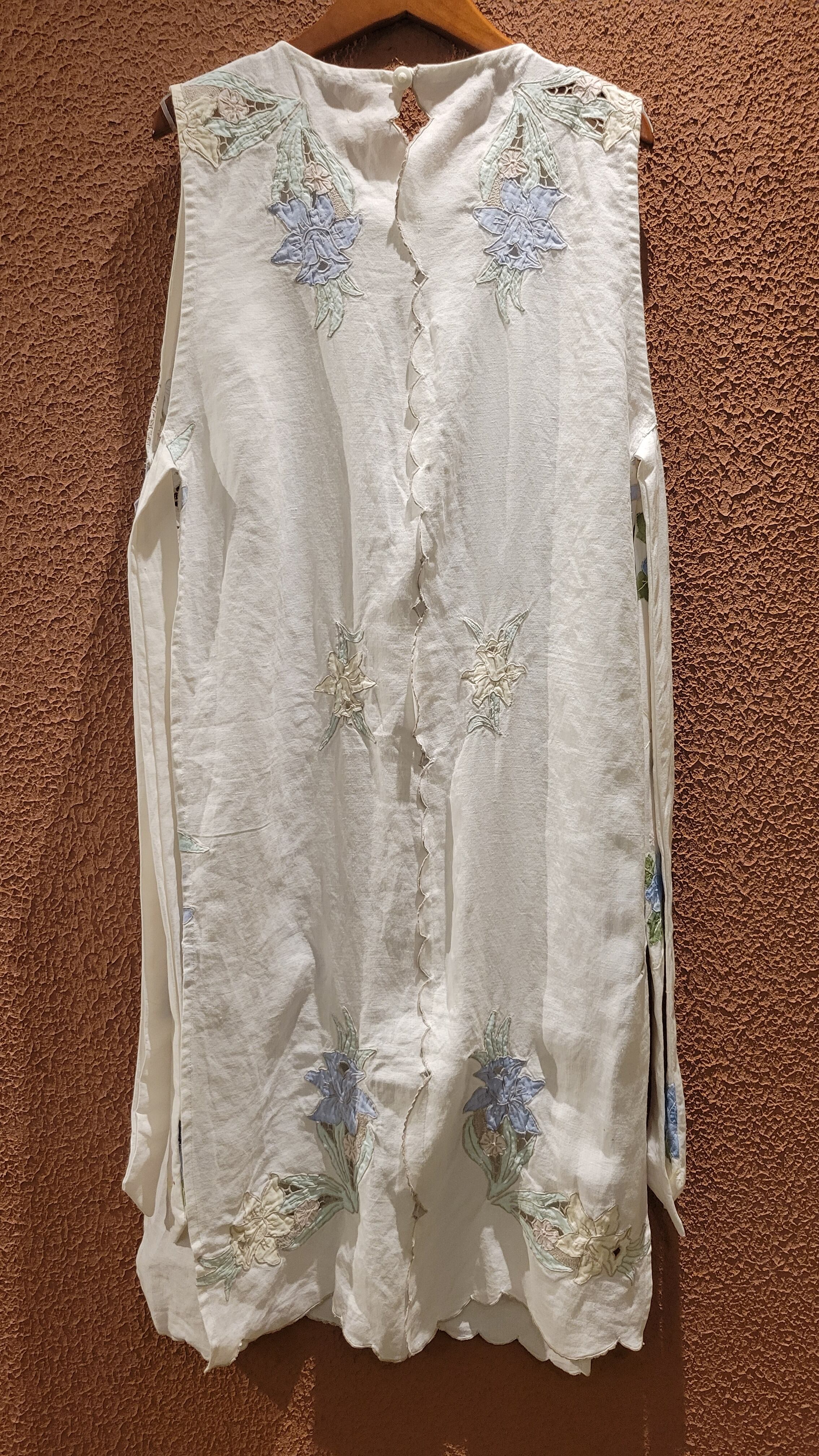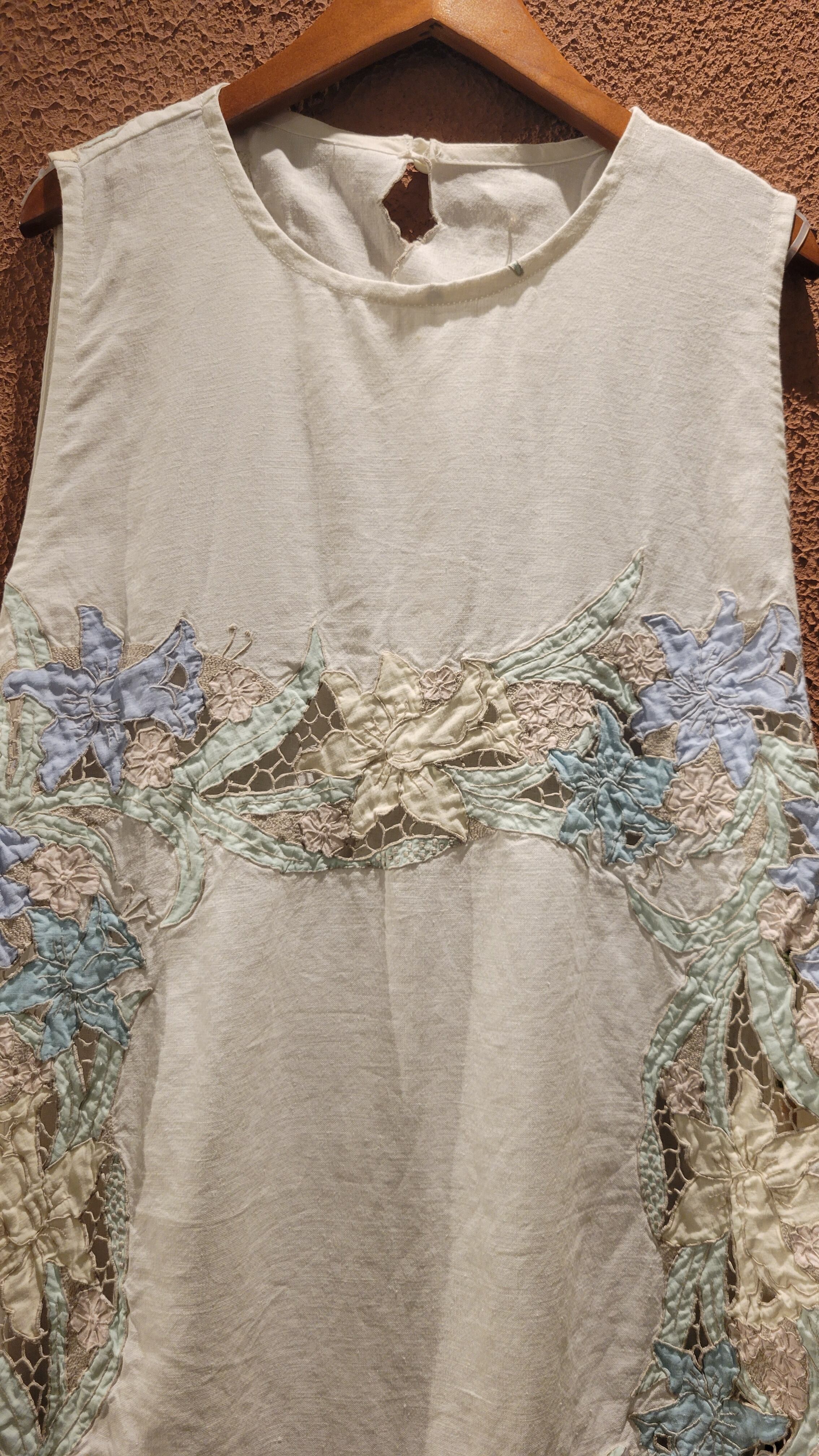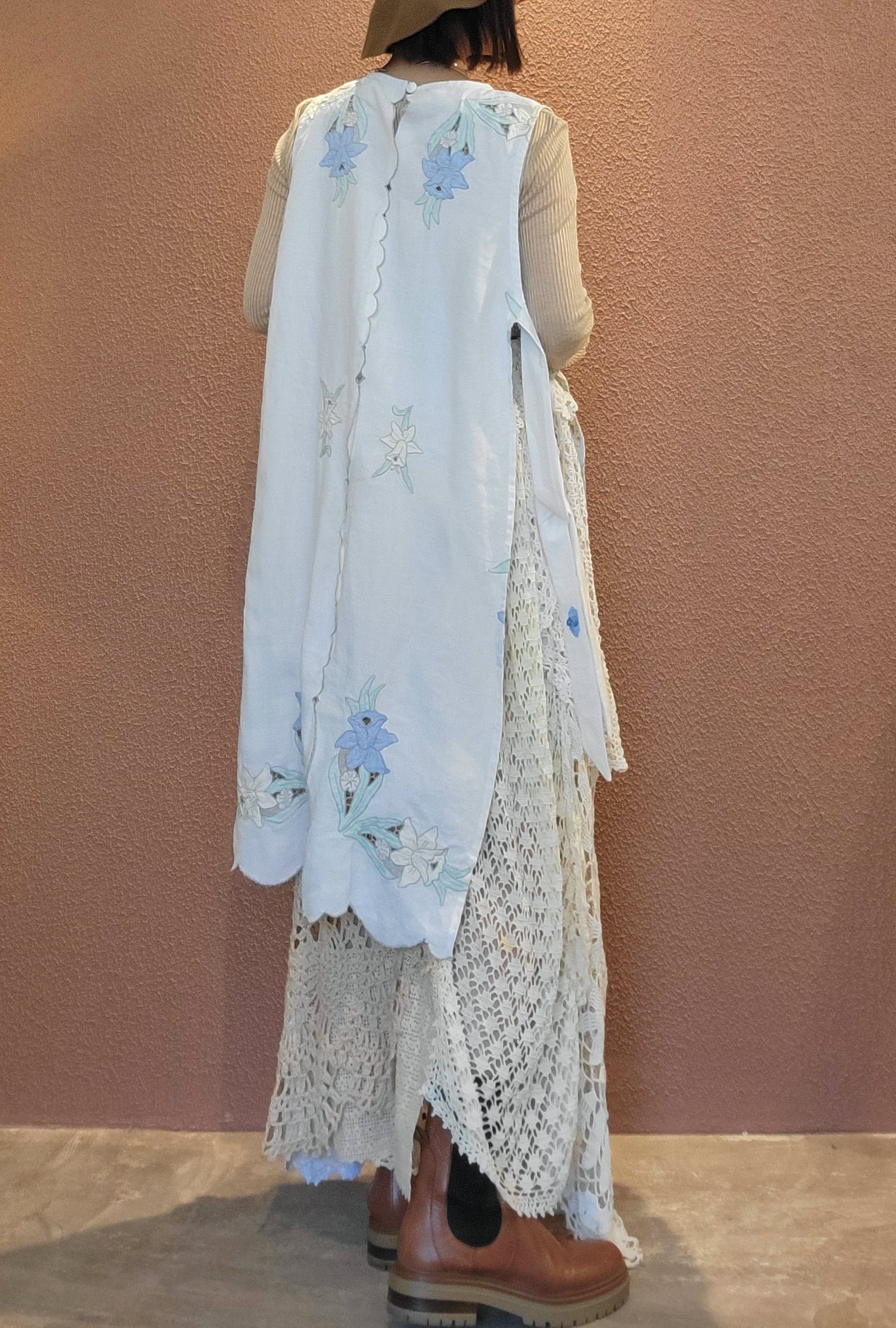 ヴィンテージのカットワークれ生地を使用したリメイクワンピース。素材はコットンのようです。サイドはフルオープンで共布のリボンが付いています。すとんと落ちるシンプルな縦長ボックスシルエットですっきり見えます。美しいレースが魅力の1枚。