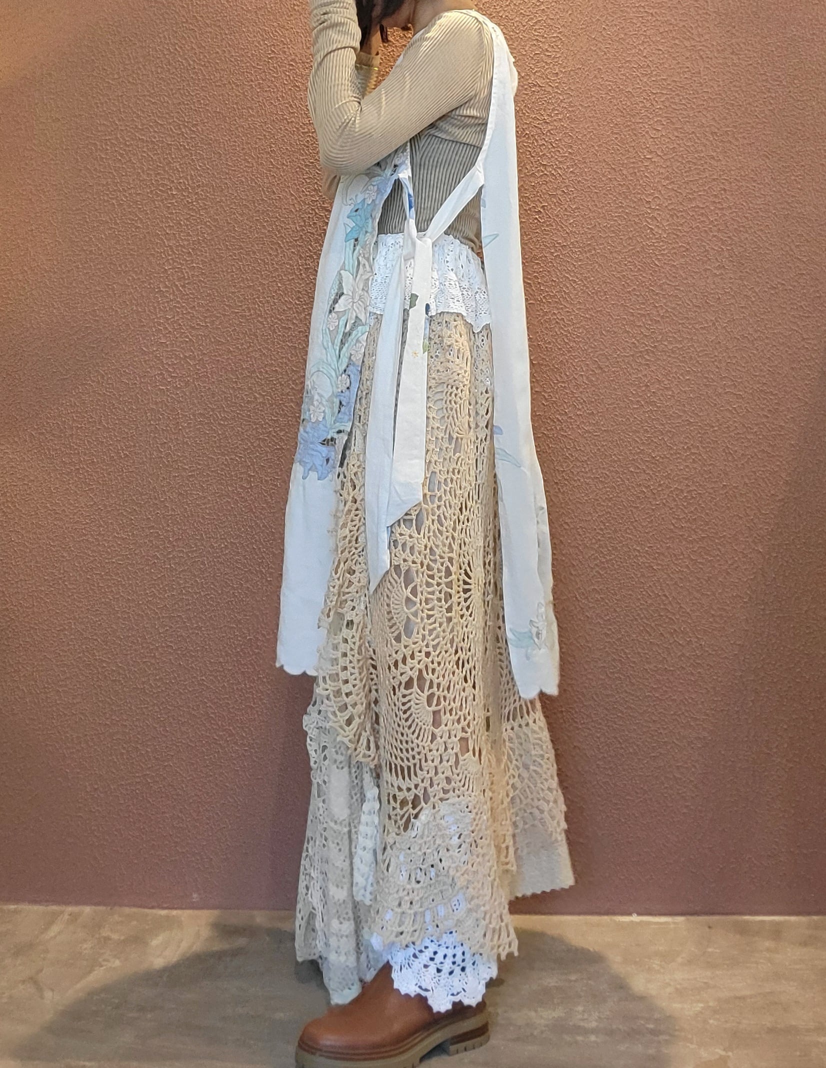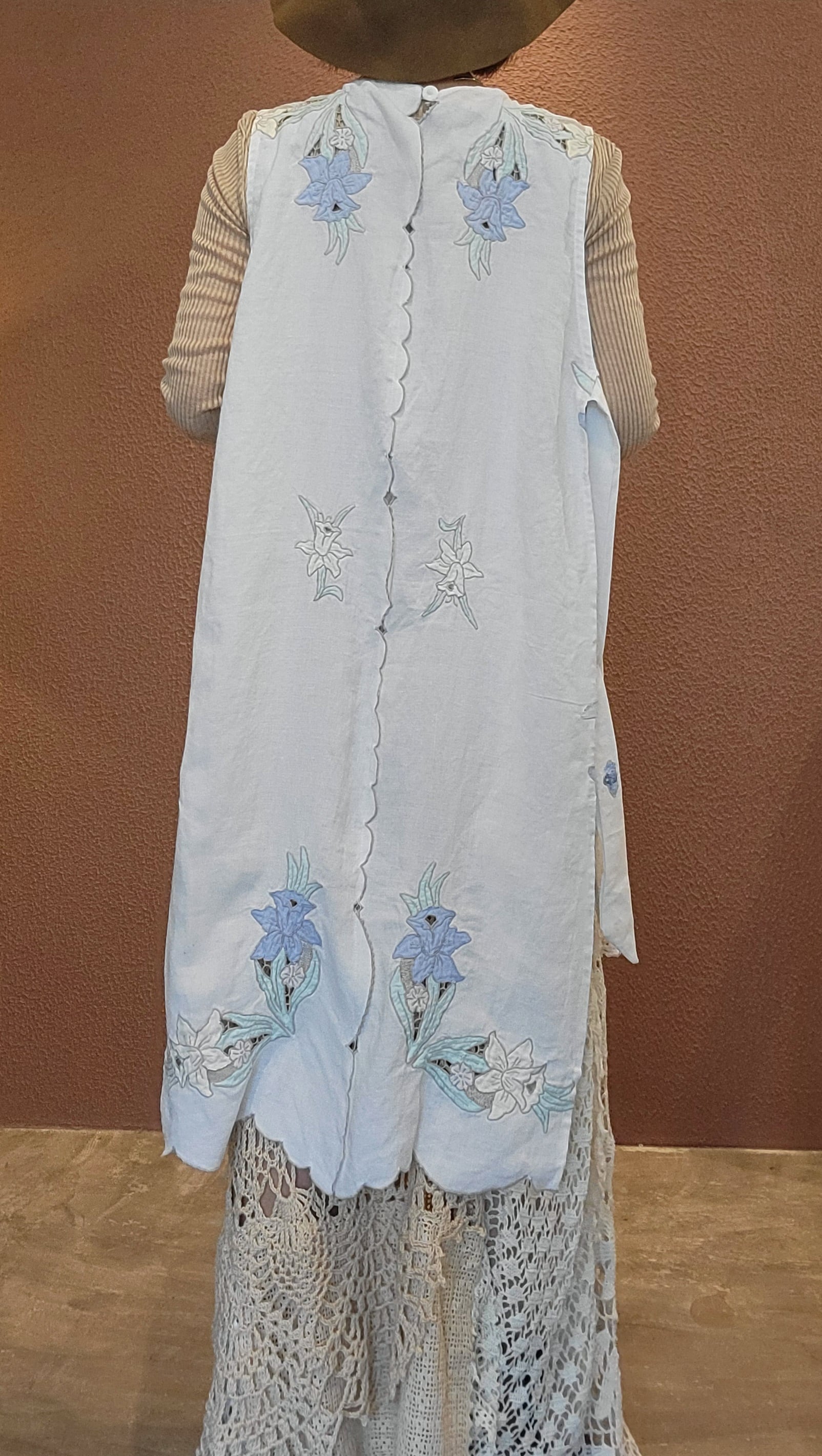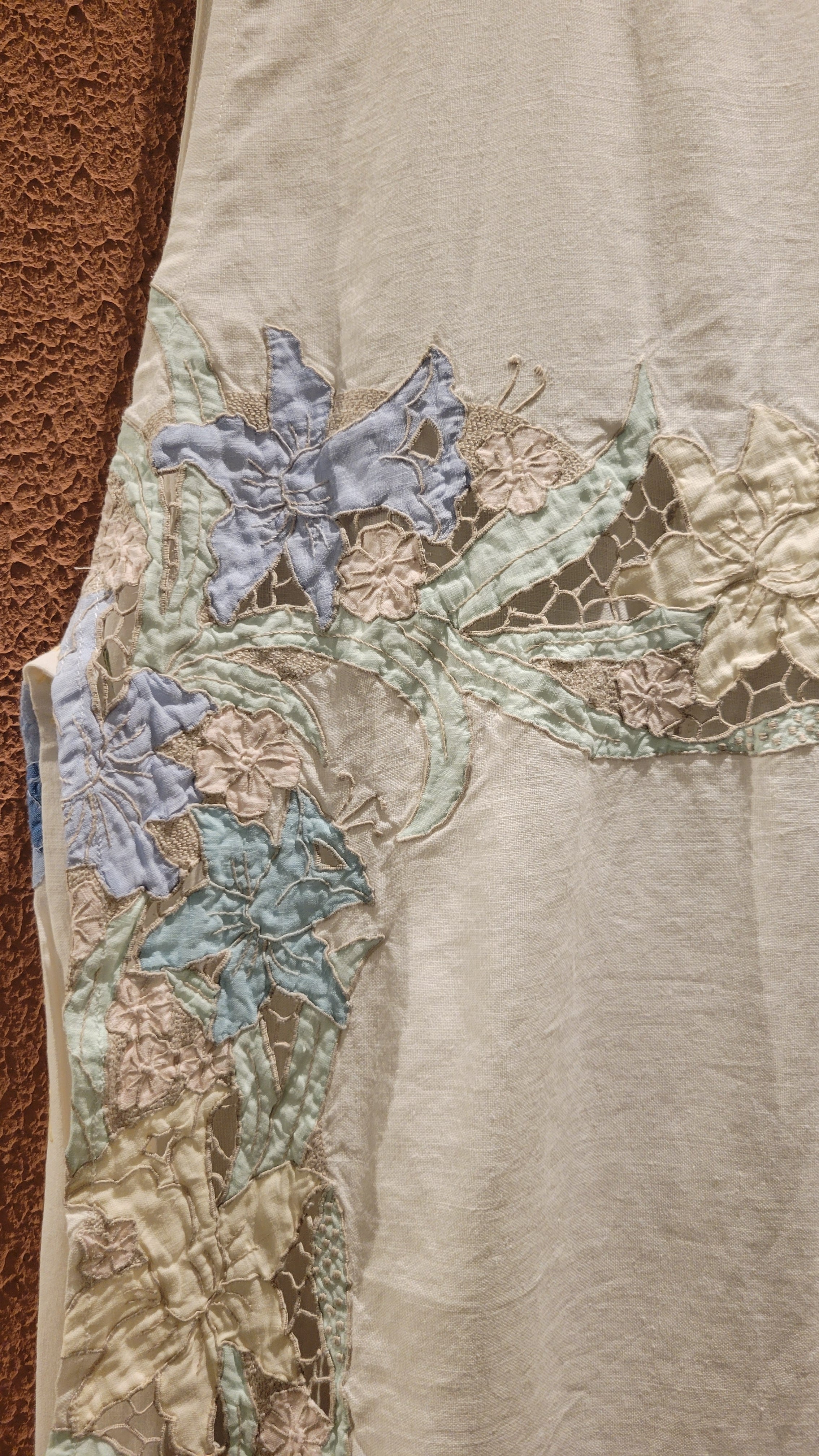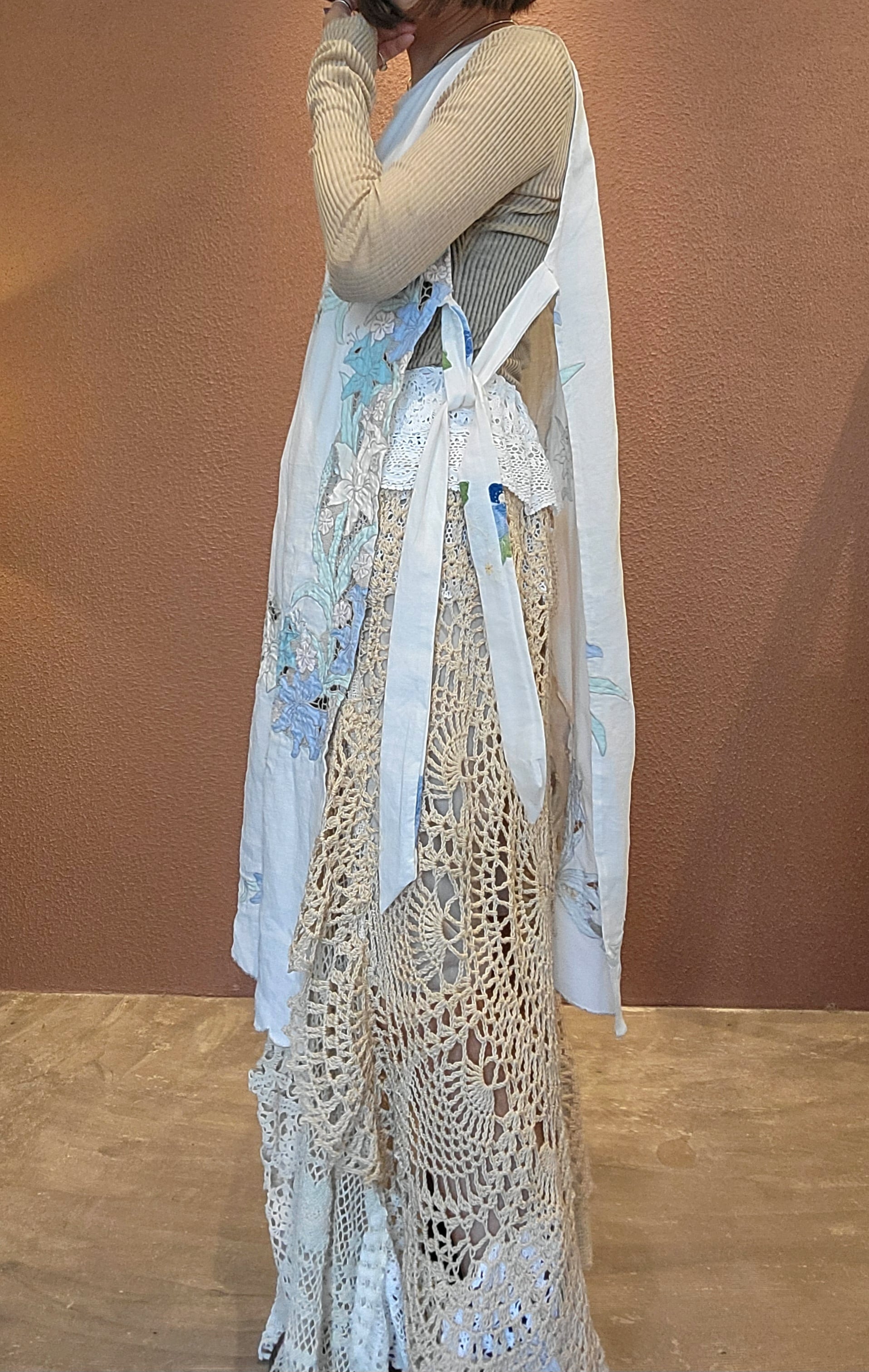 ヴィンテージのカットワークれ生地を使用したリメイクワンピース。素材はコットンのようです。サイドはフルオープンで共布のリボンが付いています。すとんと落ちるシンプルな縦長ボックスシルエットですっきり見えます。美しいレースが魅力の1枚。
