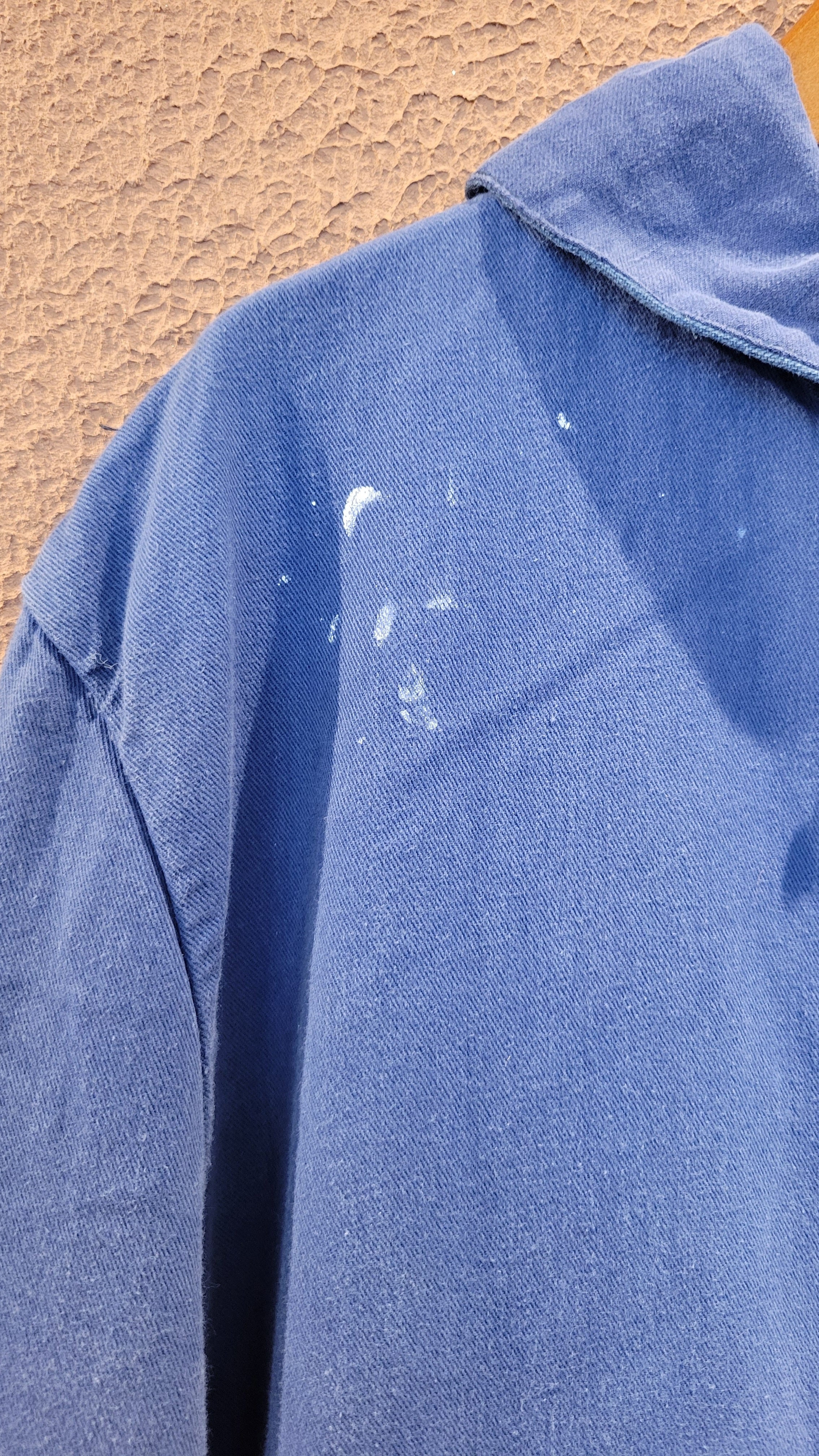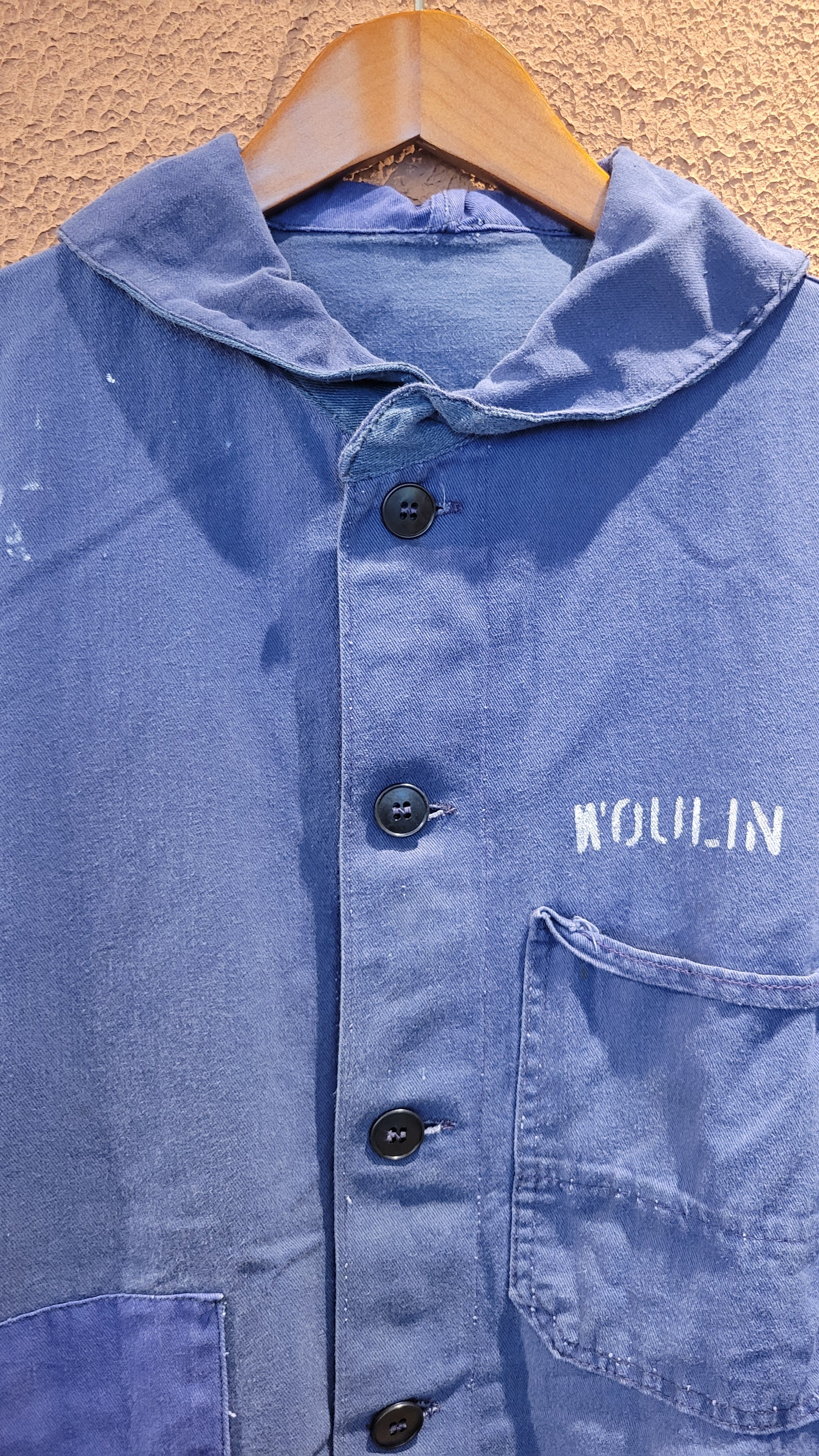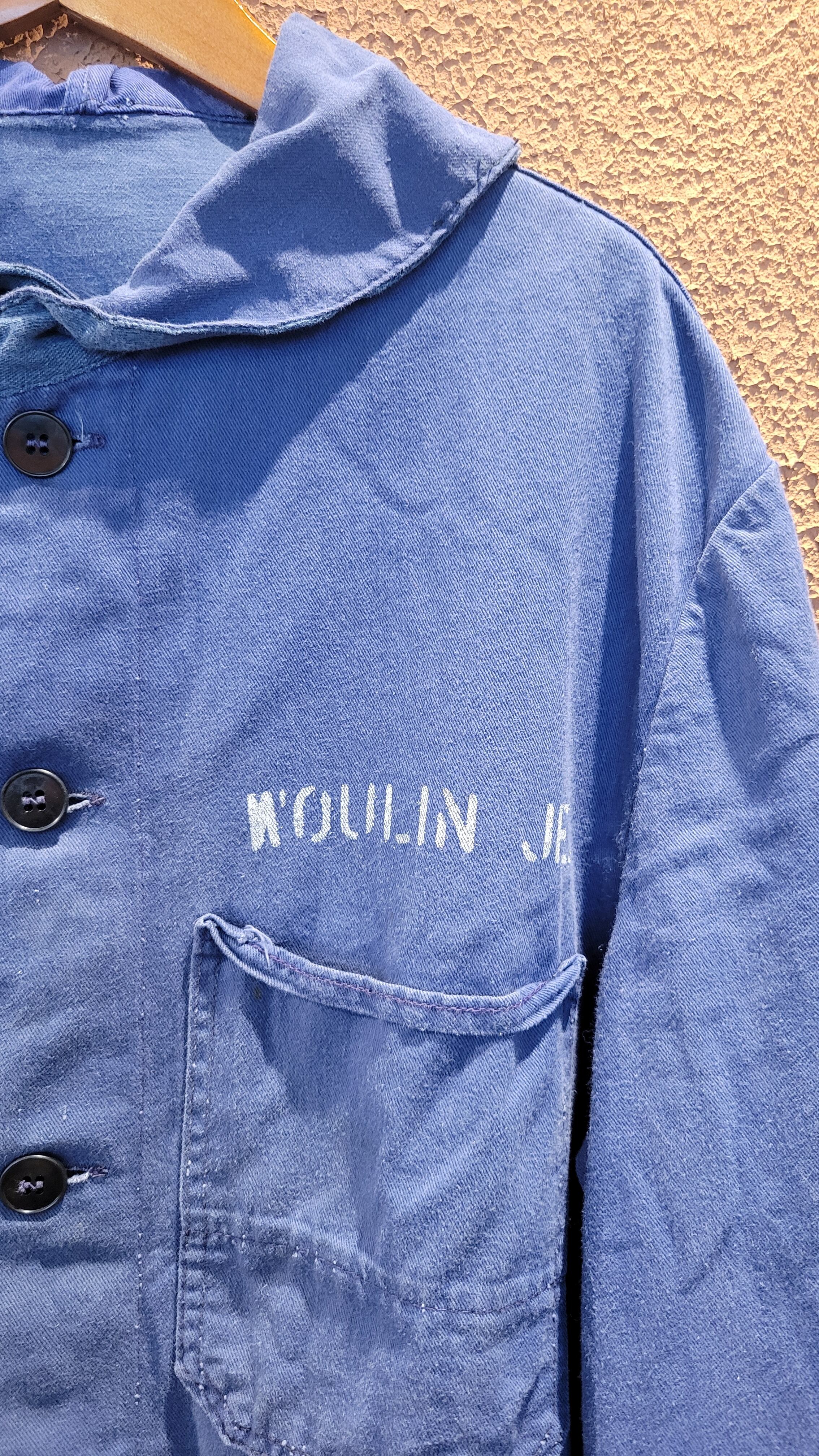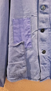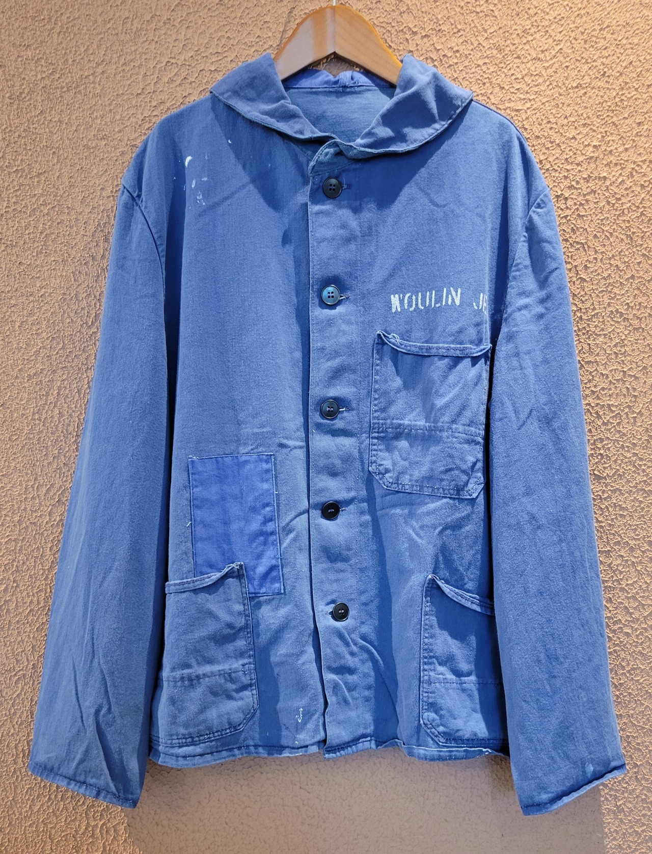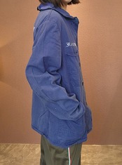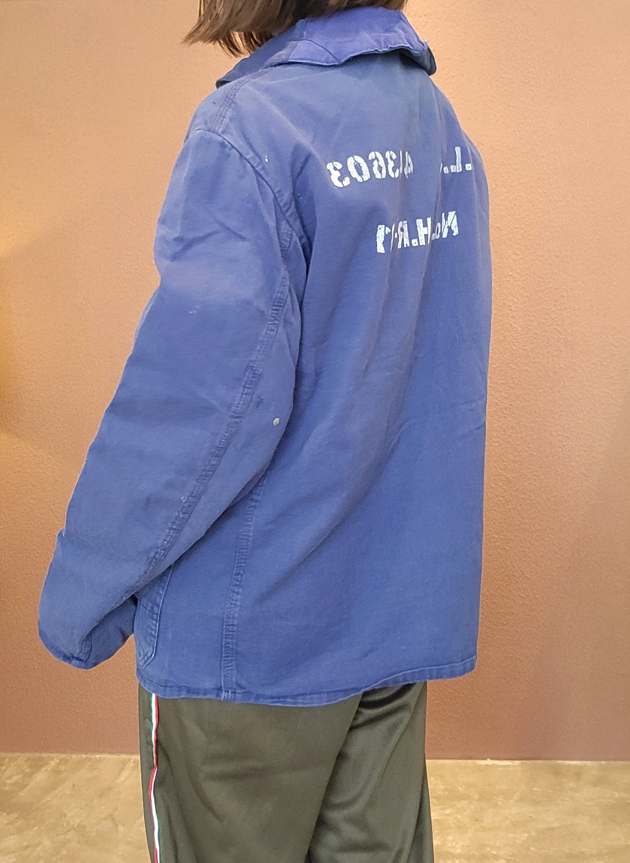 used ユーロワークジャケットの襟を丸襟に、後付けでステンシルを施したプチリメイクジャケット。素材はコットンでシーズン長く着られます。古着のくったり感とフェード具合が良い雰囲気。さっと羽織ってこなれ感の出るアイテムです。カジュアルはもちろん、フェミニンなワンピースやマキシスカートに外しで合わせるのも素敵です。*実際の色は着用画像に近いです。