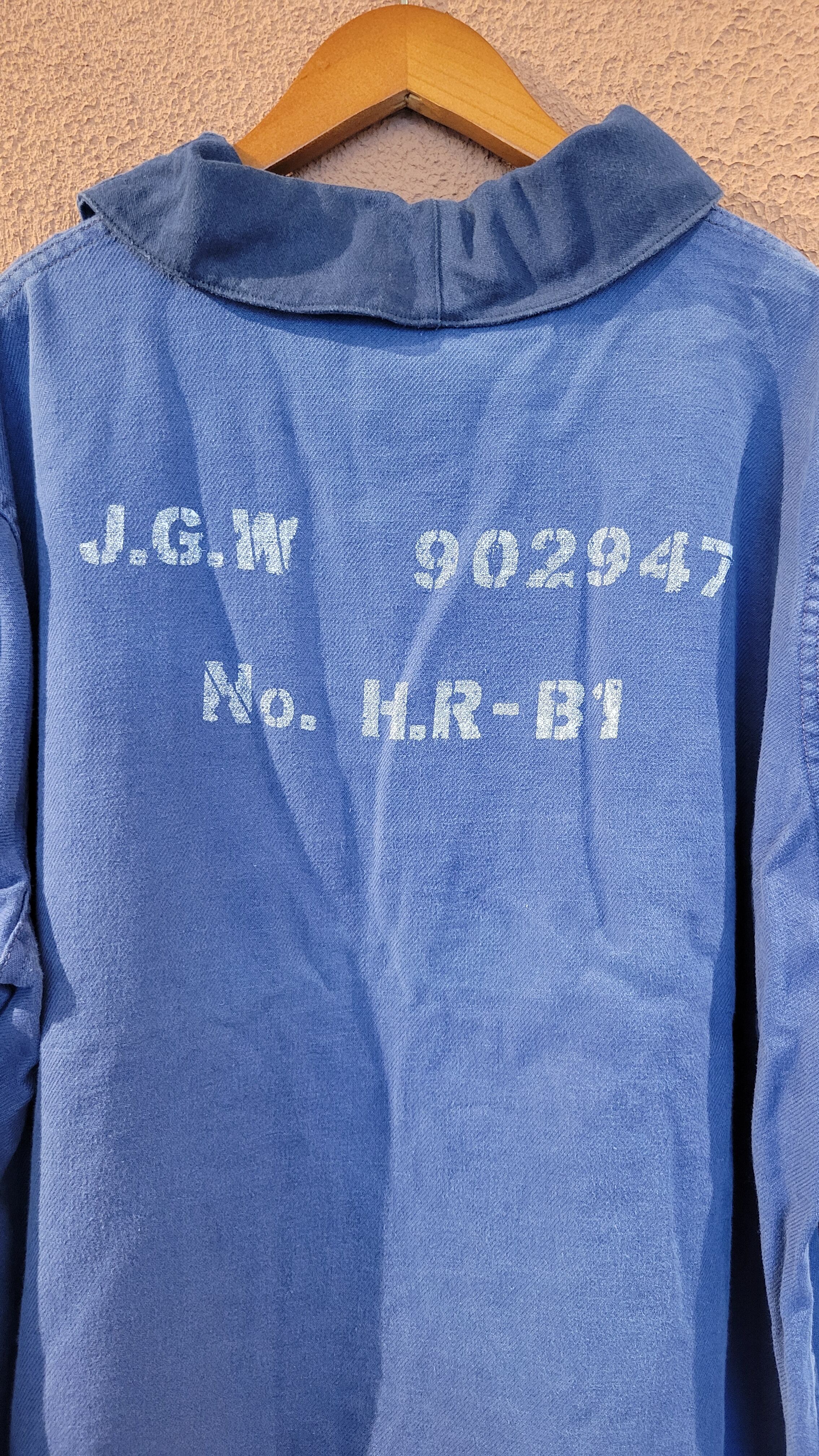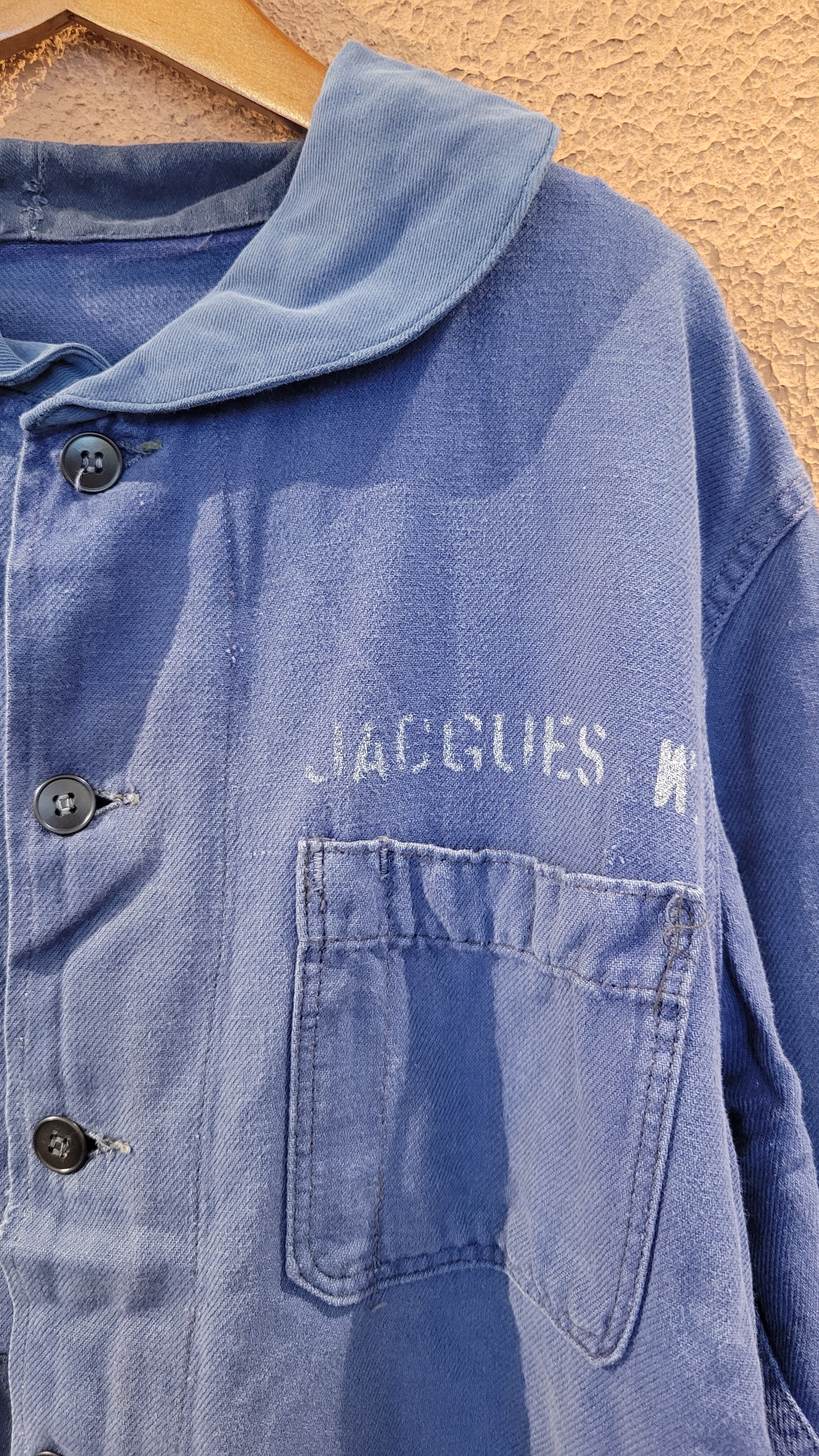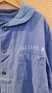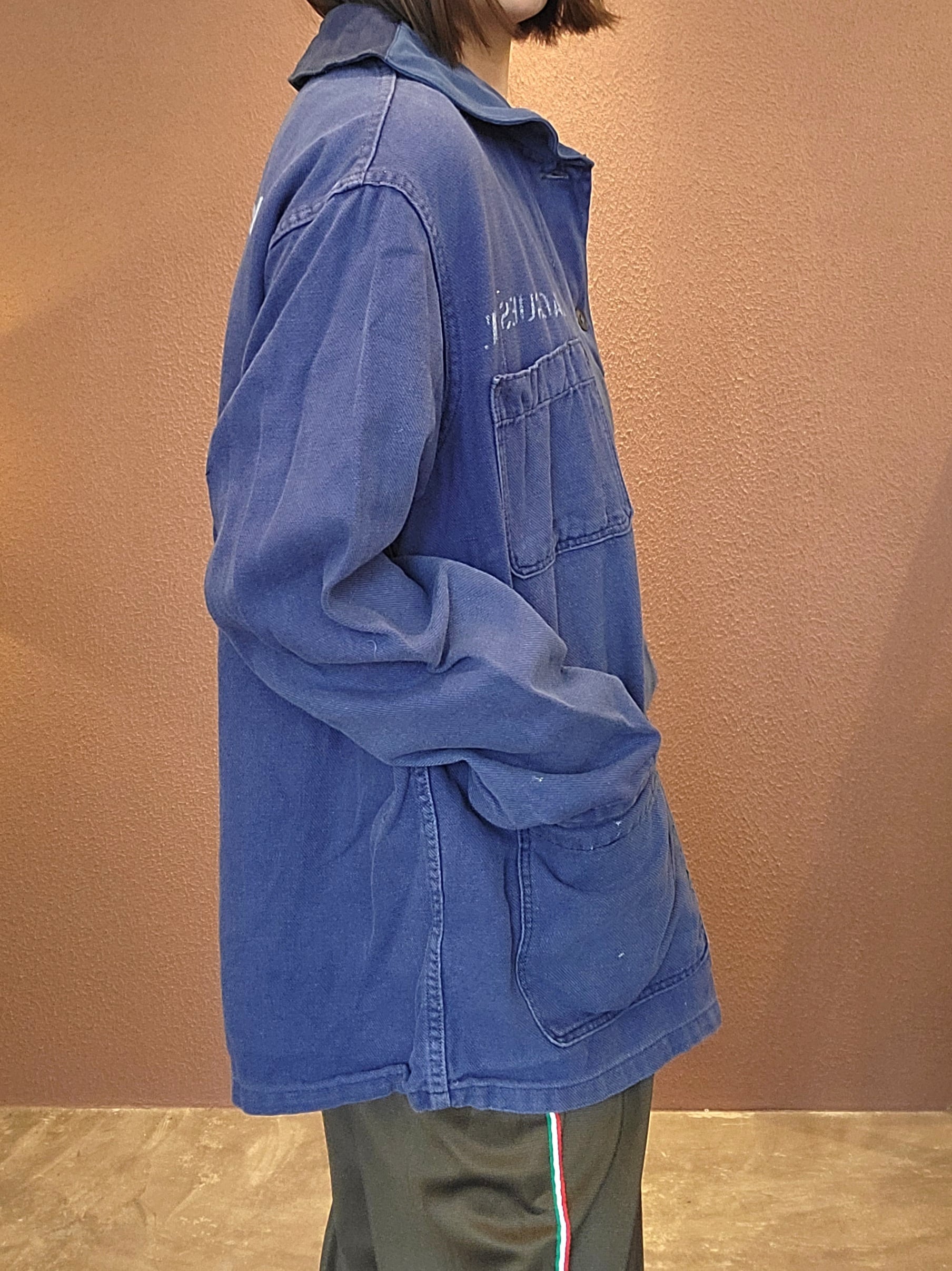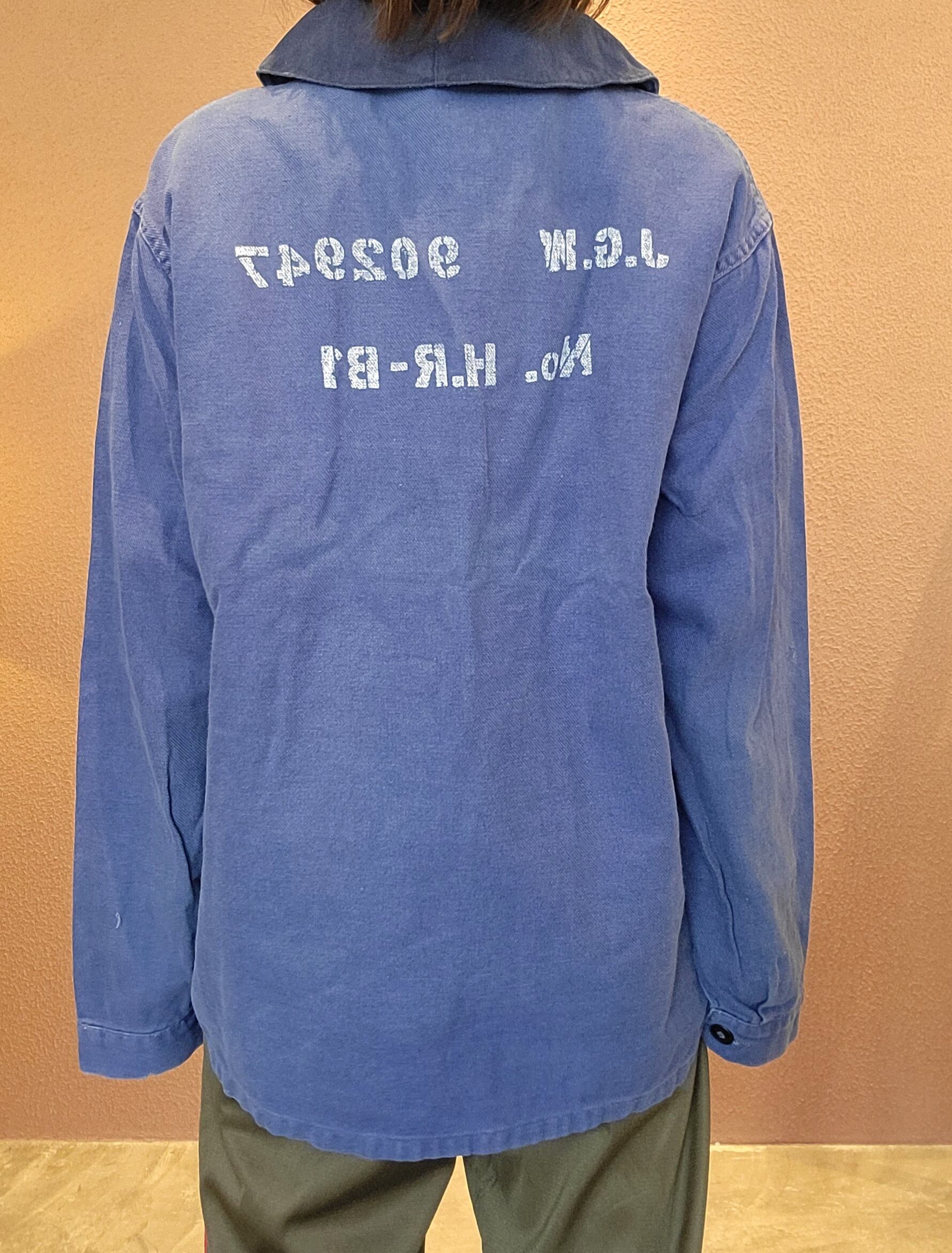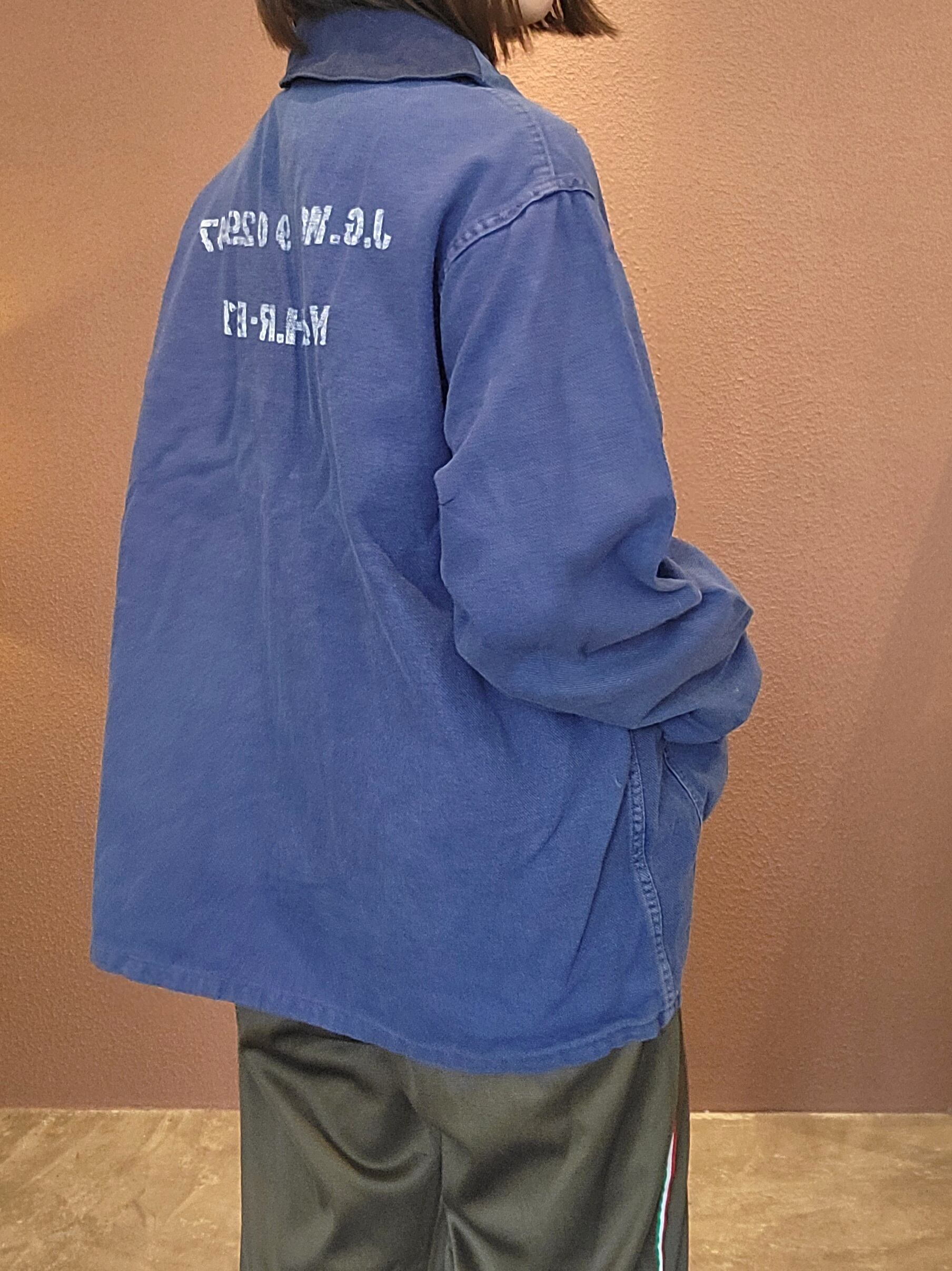 used ユーロワークジャケットの襟を丸襟に、後付けでステンシルを施したプチリメイクジャケット。素材はコットンでシーズン長く着られます。古着のくったり感とフェード具合が良い雰囲気。さっと羽織ってこなれ感の出るアイテムです。カジュアルはもちろん、フェミニンなワンピースやマキシスカートに外しで合わせるのも素敵です。*実際の色は着用画像に近いです。