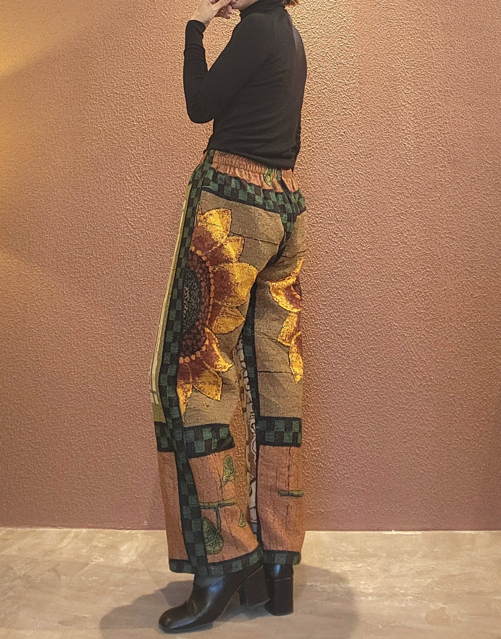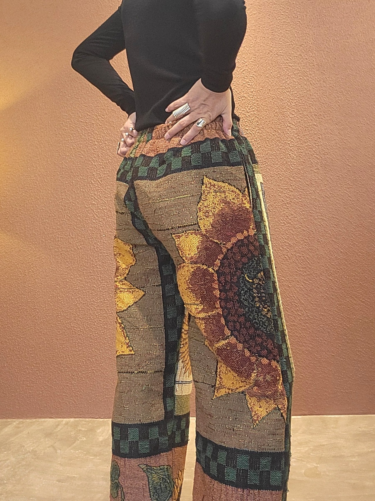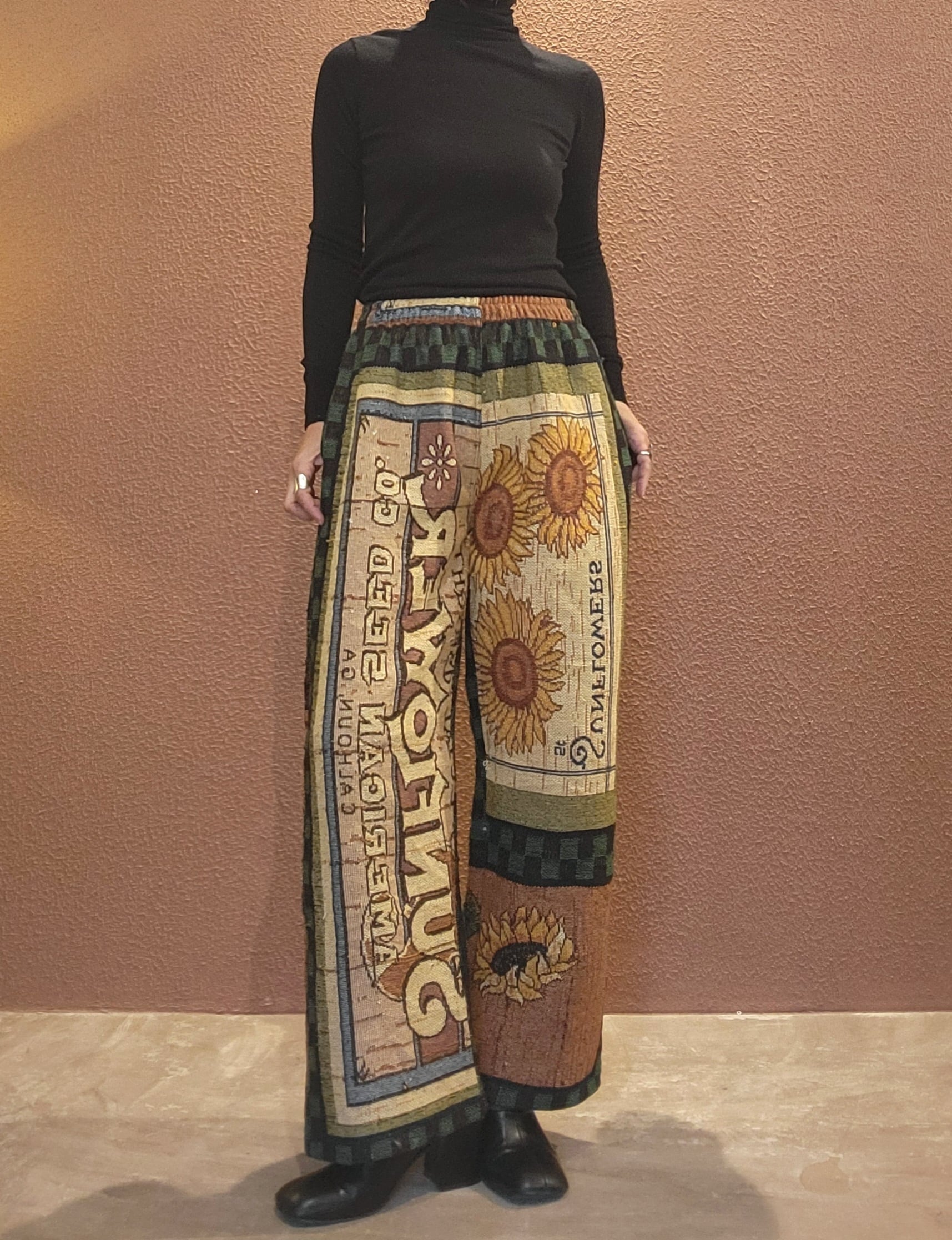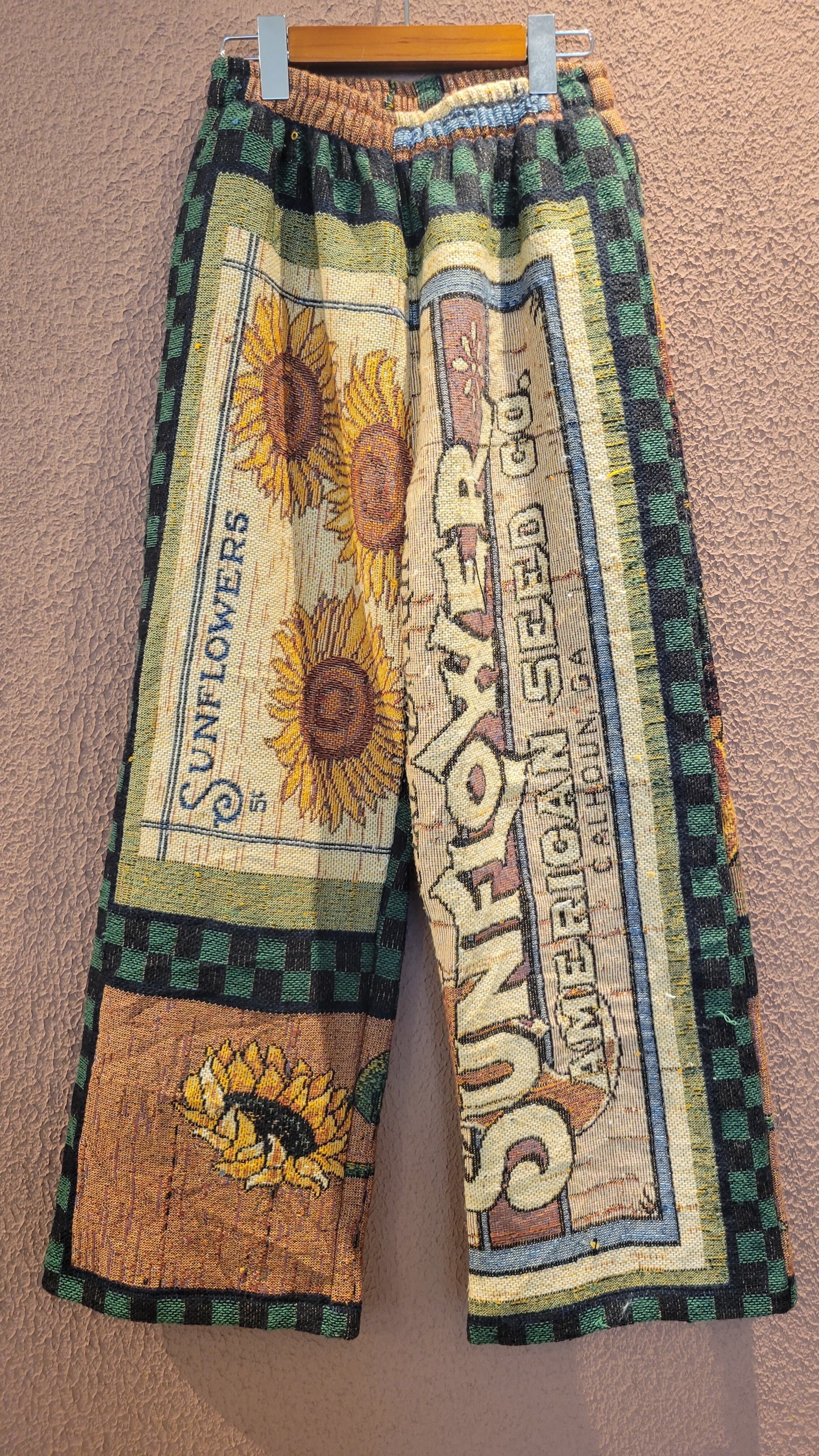 ヴィンテージのブランケットを使用したリメイクイージーパンツ。素材はコットンのようです。ウエストゴム、左右ポケット付き。ひまわりやチェッカーフラッグ等の柄にざっくりとした素材の風合いが大人のカジュアルにぴったりです。•糸つれが数カ所見られます。画像でご確認ください。