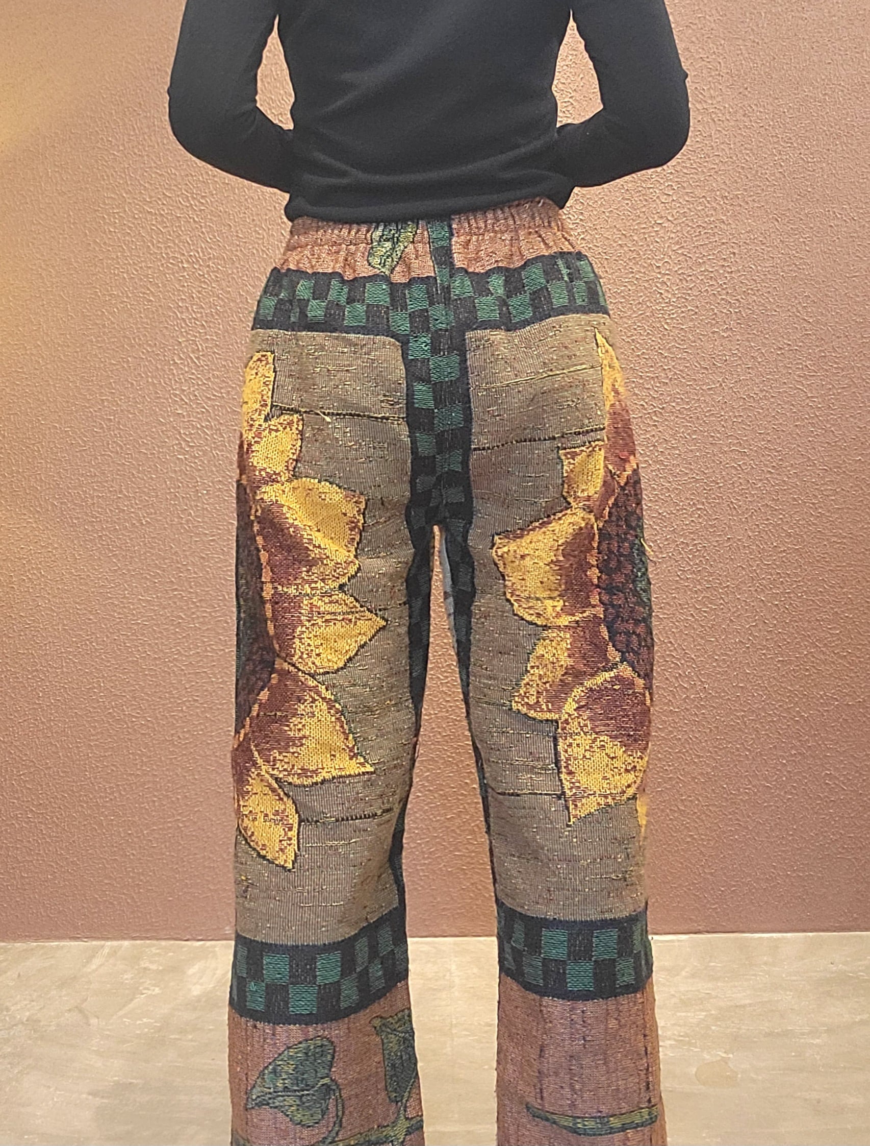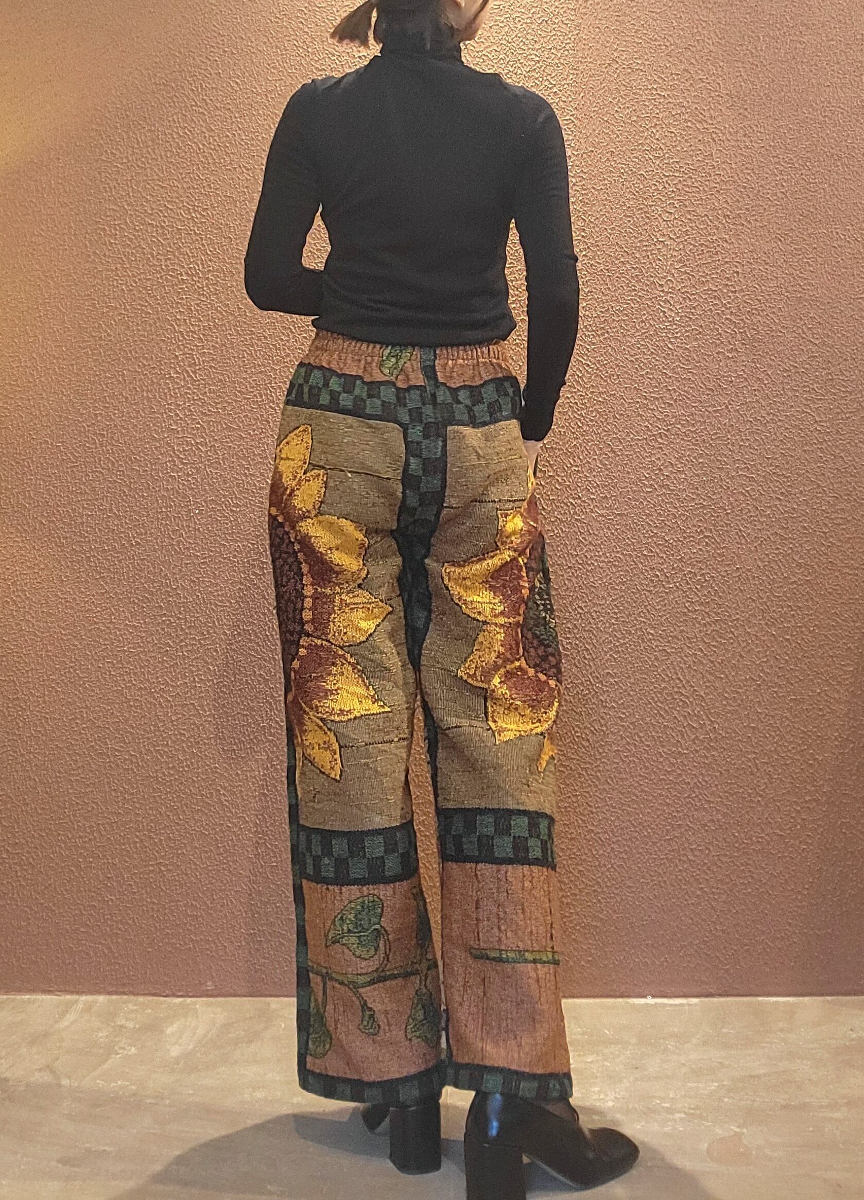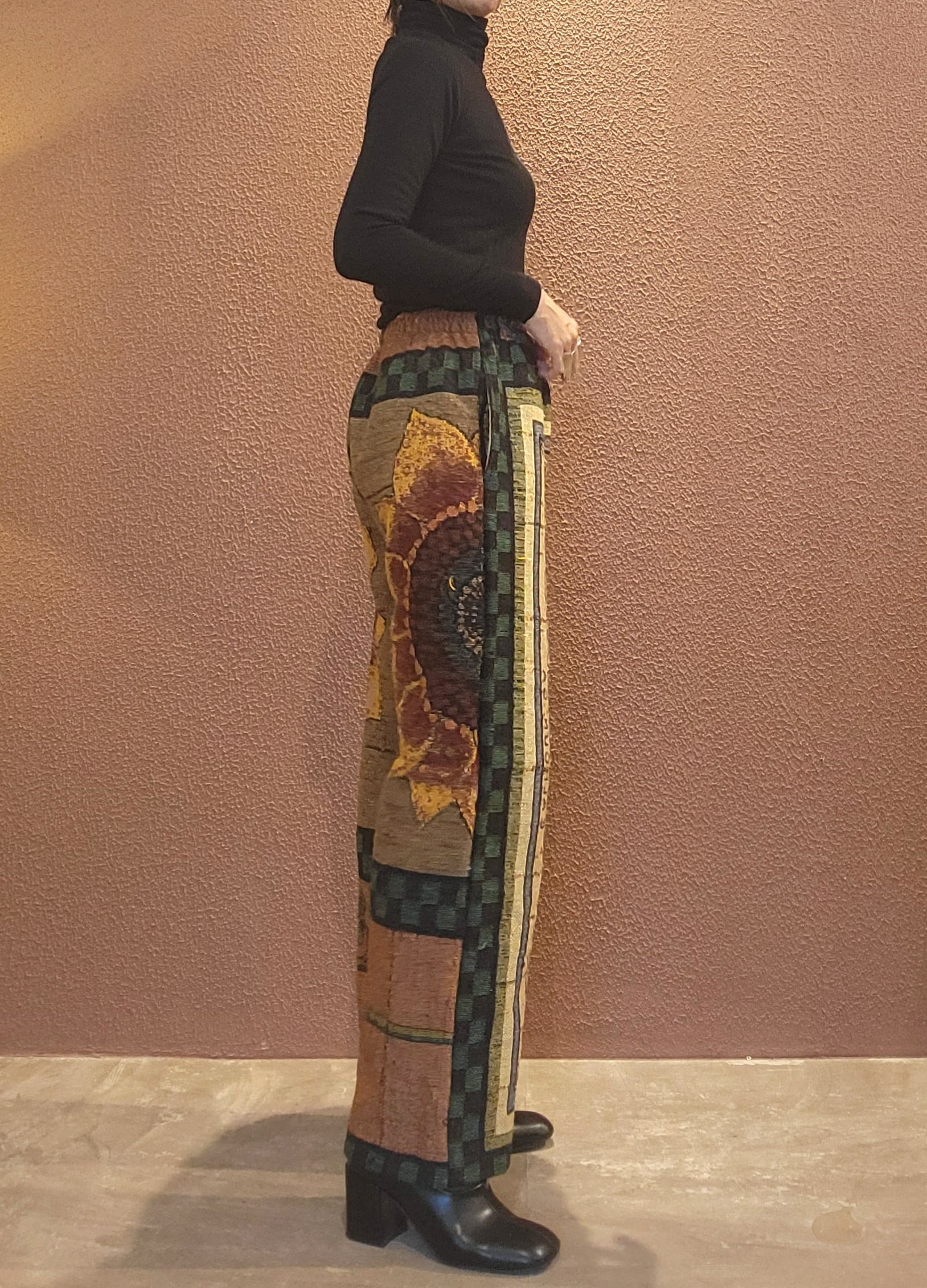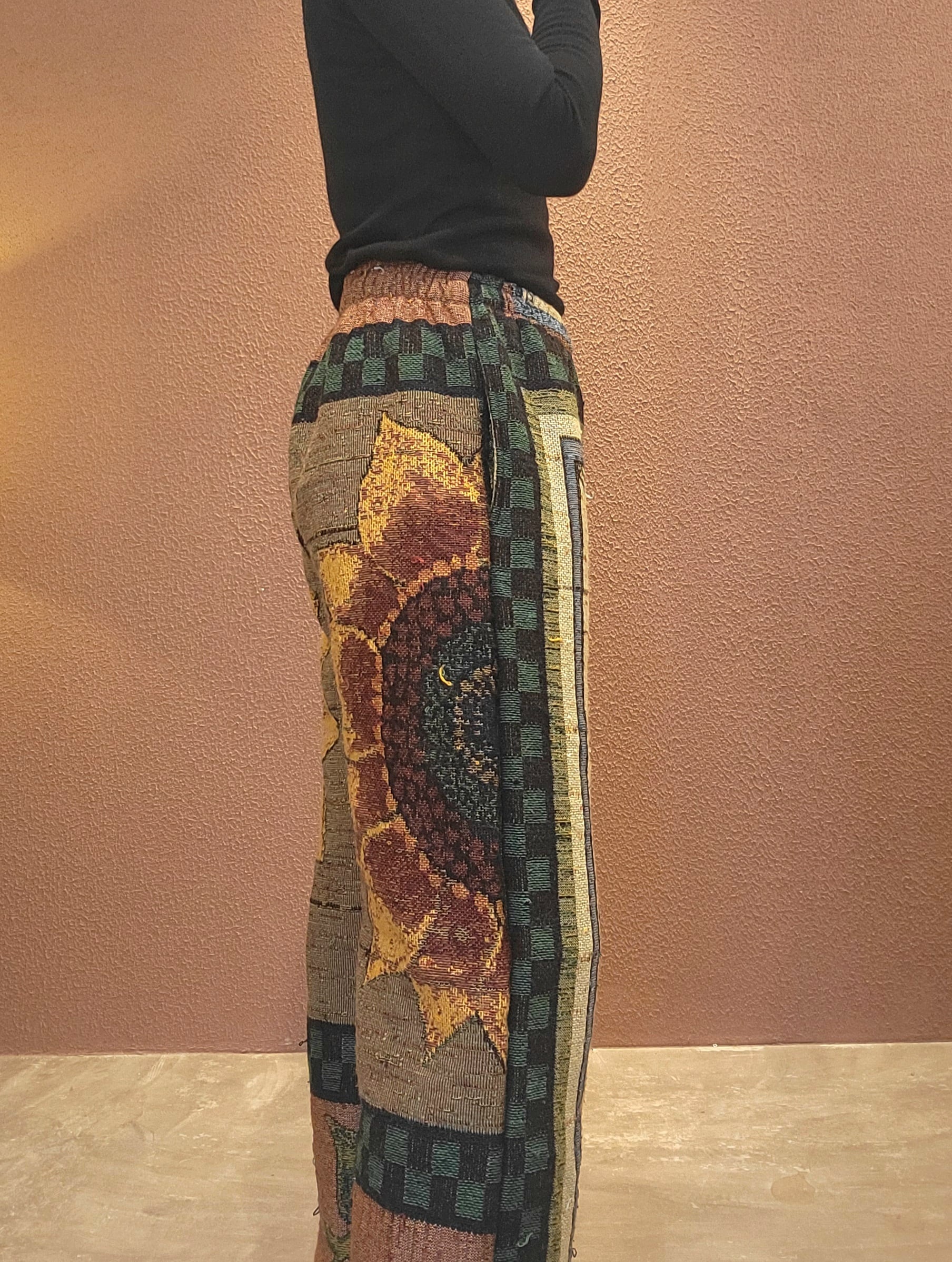 ヴィンテージのブランケットを使用したリメイクイージーパンツ。素材はコットンのようです。ウエストゴム、左右ポケット付き。ひまわりやチェッカーフラッグ等の柄にざっくりとした素材の風合いが大人のカジュアルにぴったりです。•糸つれが数カ所見られます。画像でご確認ください。