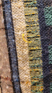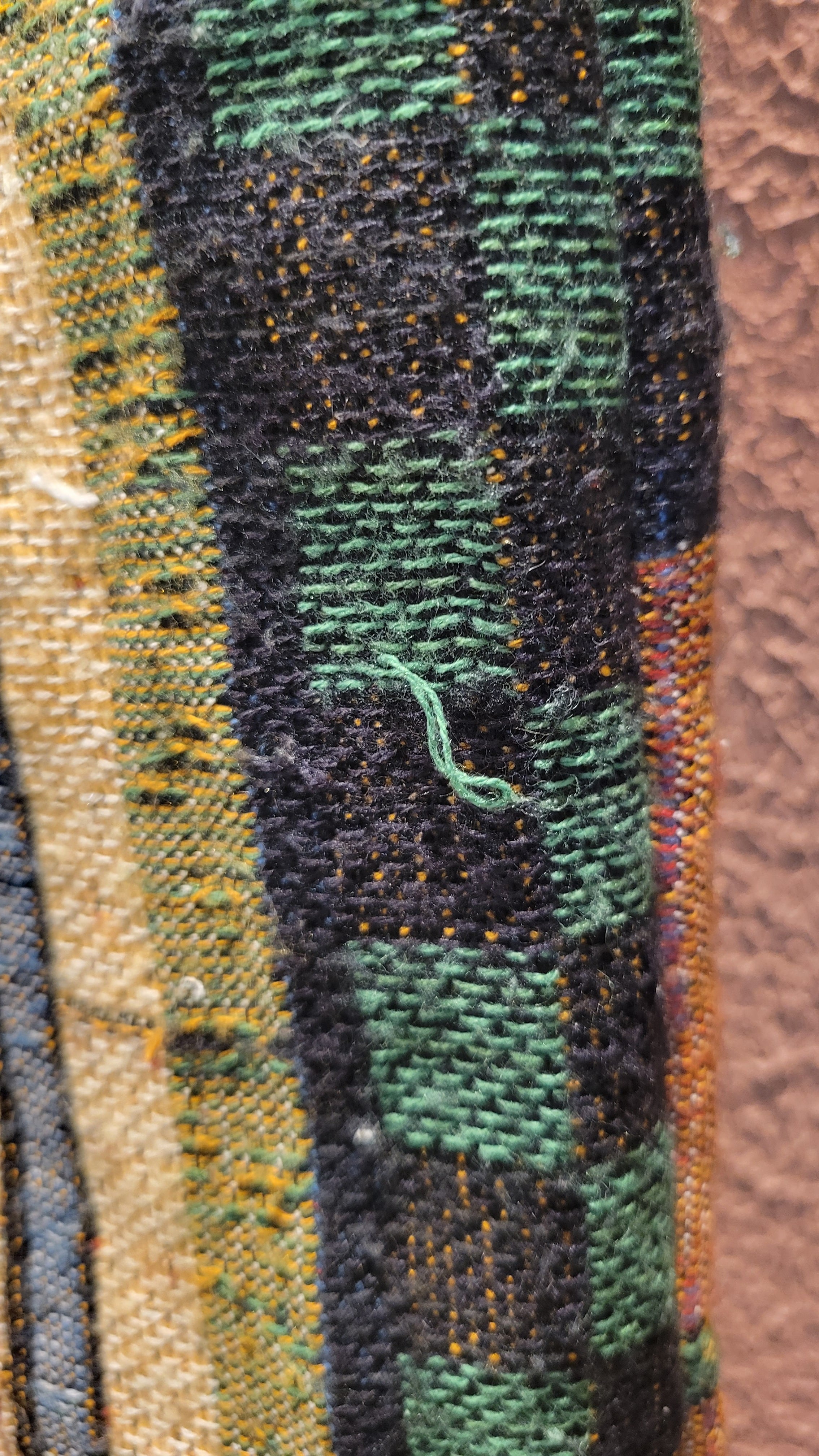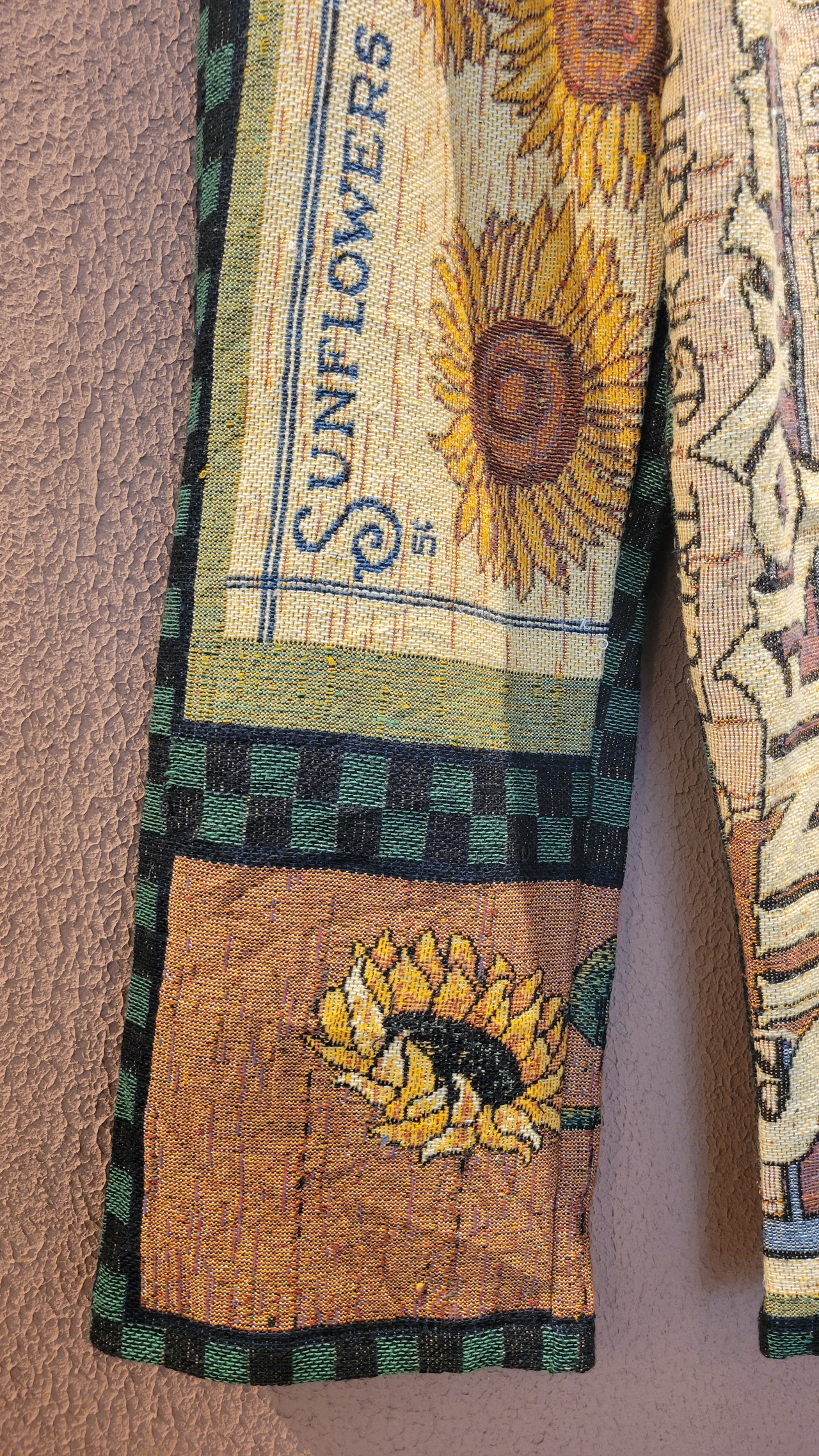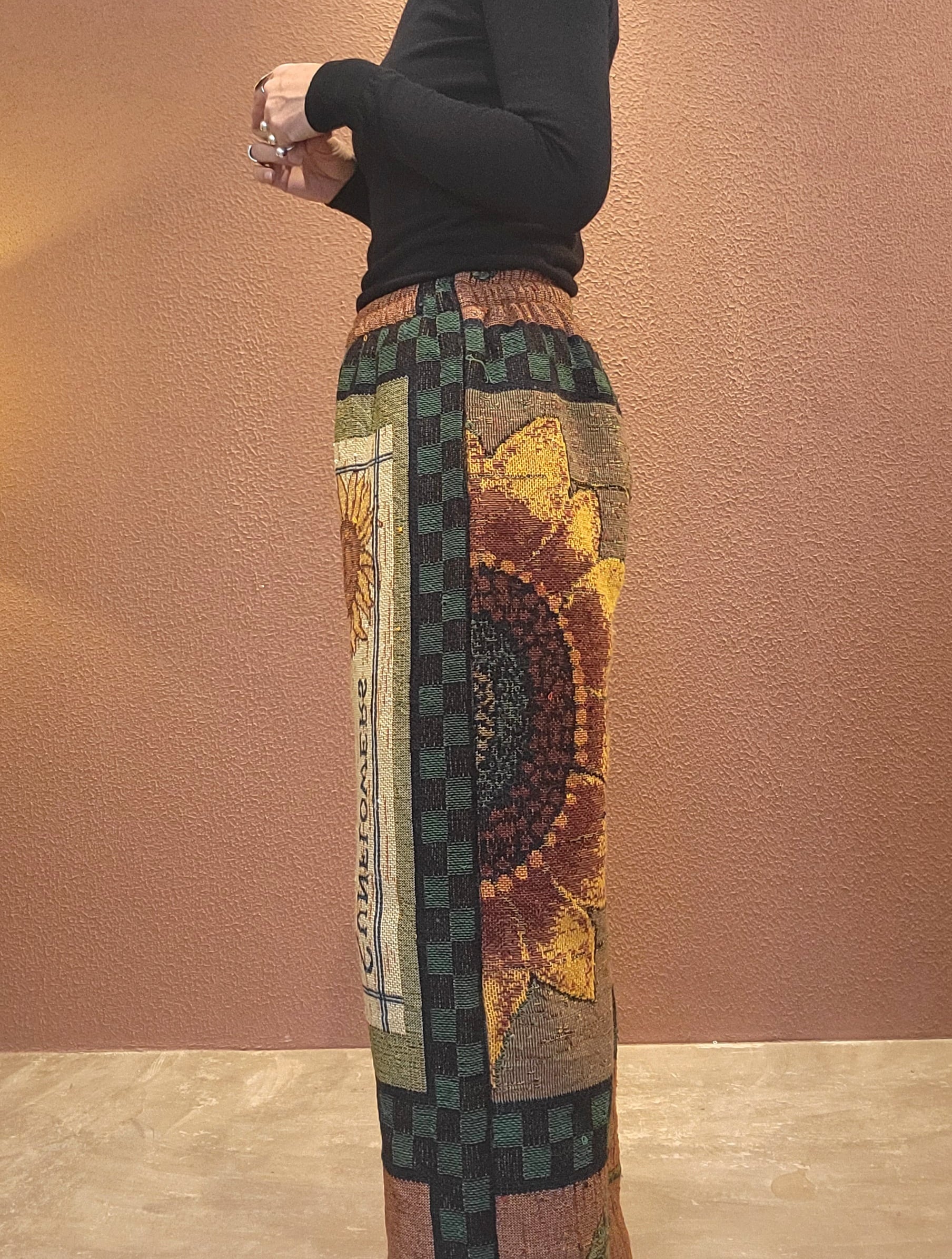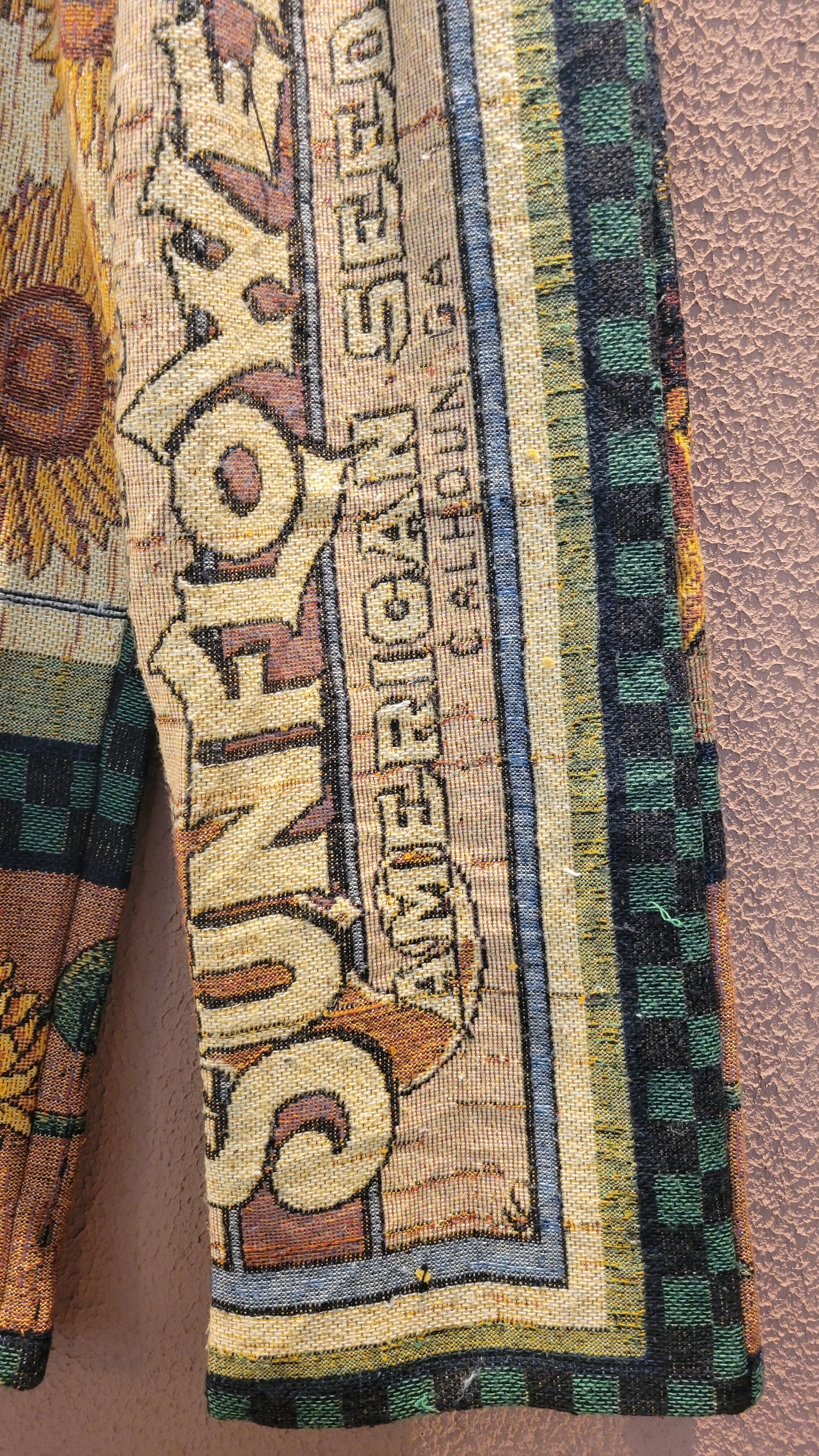 ヴィンテージのブランケットを使用したリメイクイージーパンツ。素材はコットンのようです。ウエストゴム、左右ポケット付き。ひまわりやチェッカーフラッグ等の柄にざっくりとした素材の風合いが大人のカジュアルにぴったりです。•糸つれが数カ所見られます。画像でご確認ください。