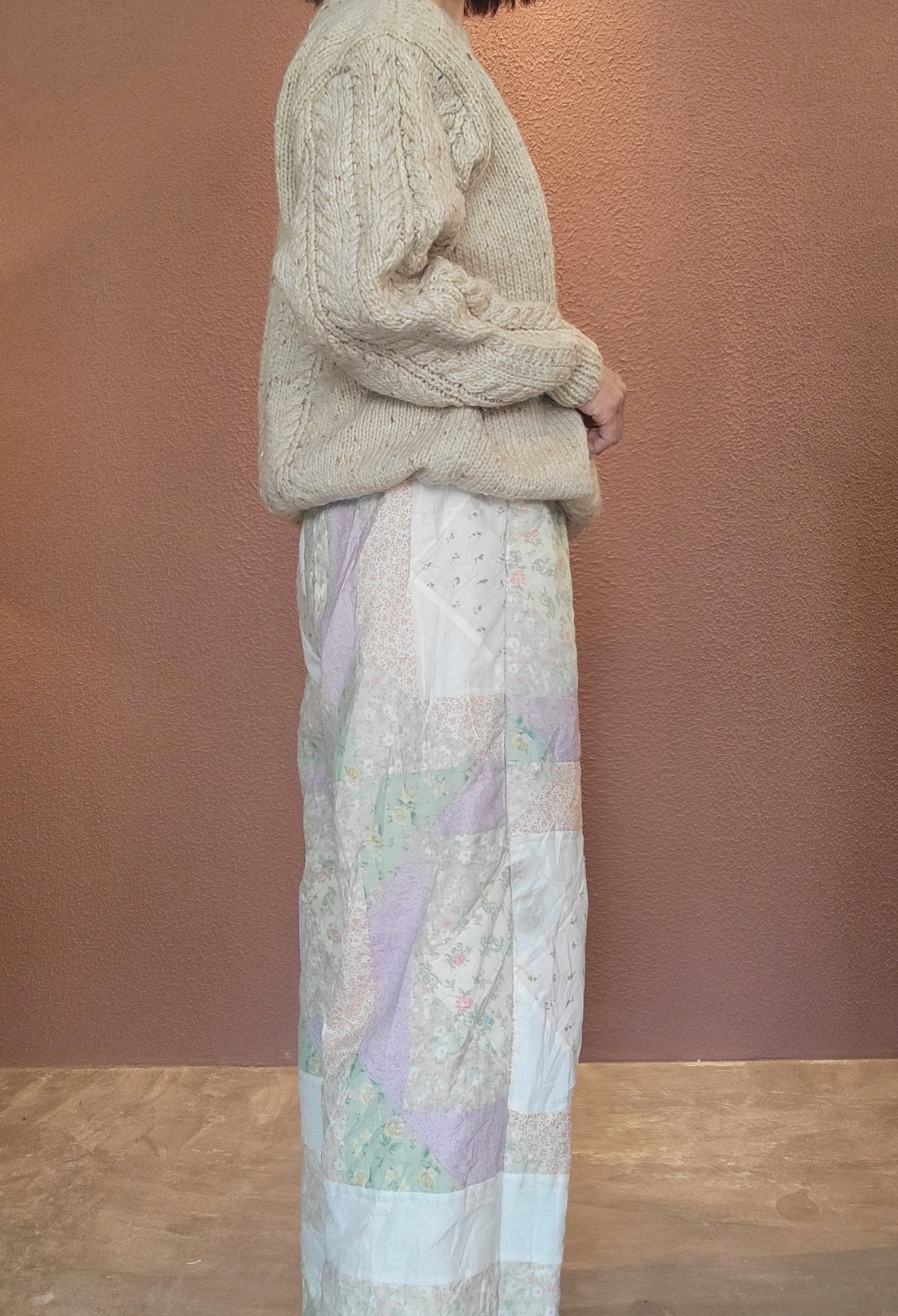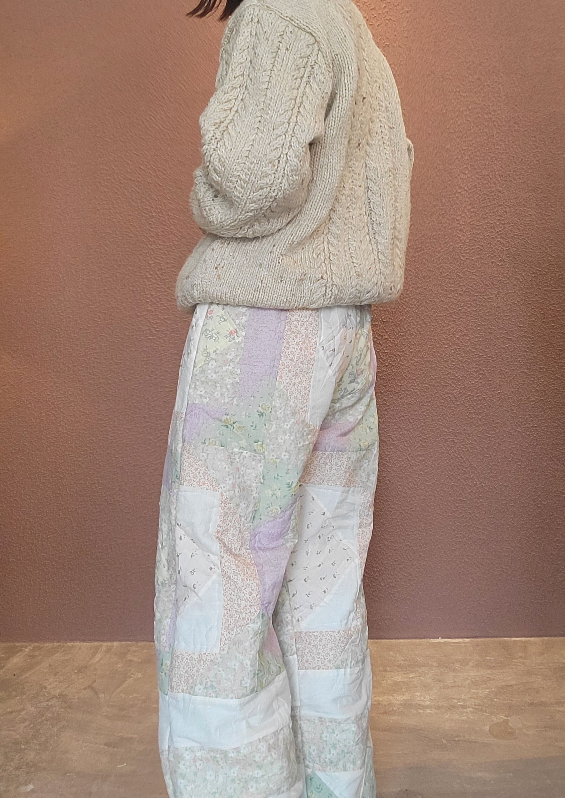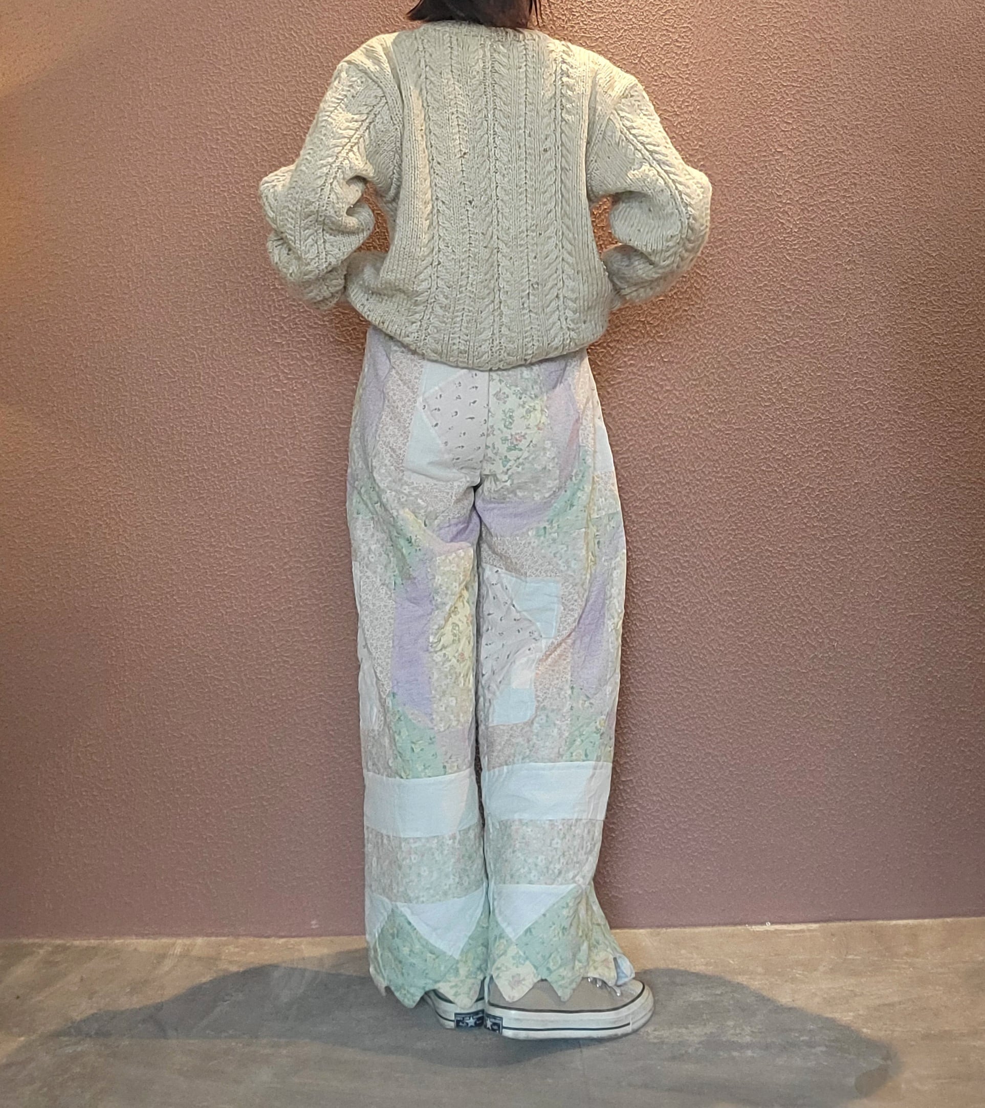 ヴィンテージのパッチワークキルト生地を使用したリメイクイージーパンツ。素材は2枚合わせの中綿入りコットン、ウエストゴム仕様、ポケット無しです。着脱しやすく軽量で温かい、普段使いにぴったりの1本です。