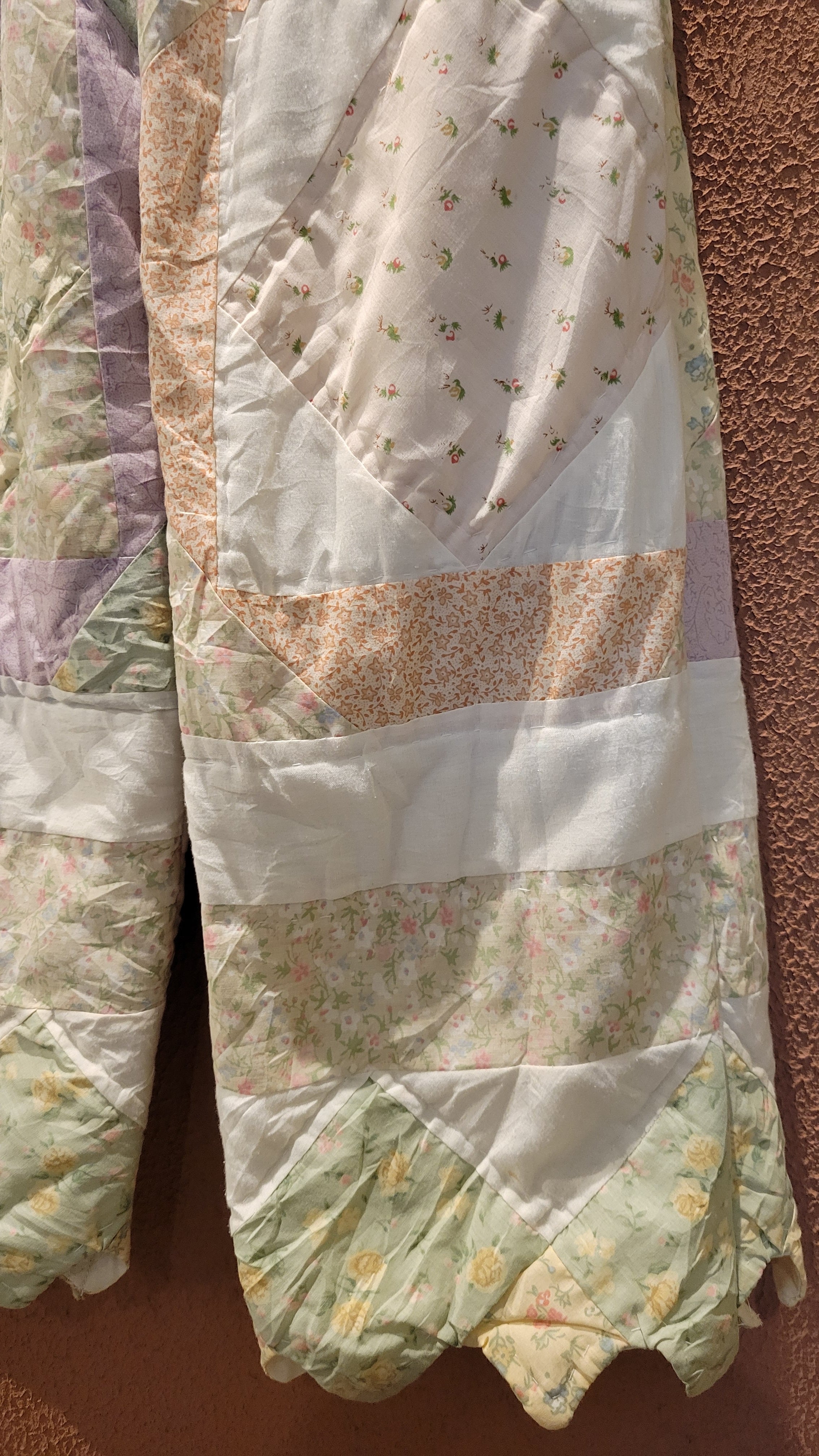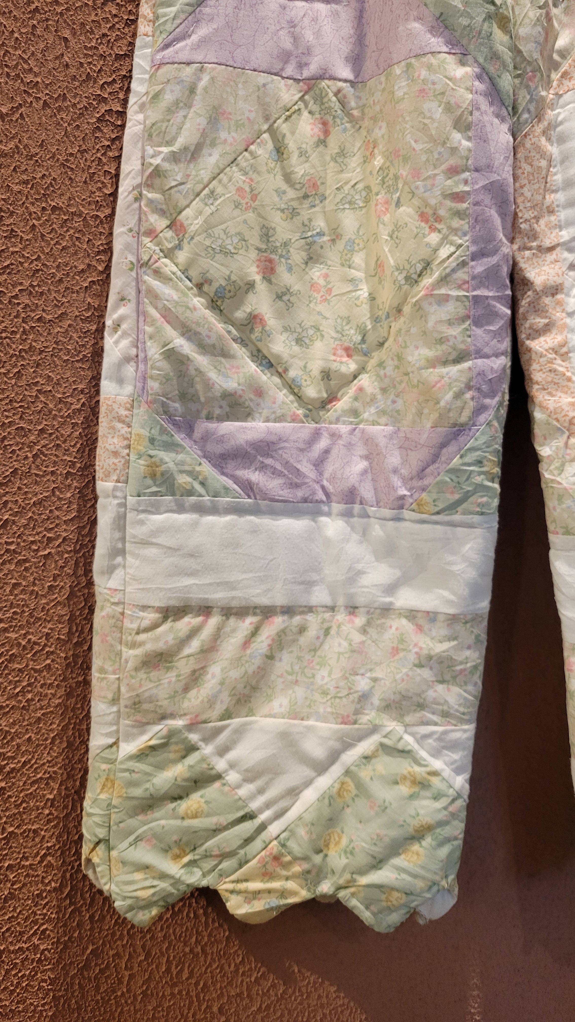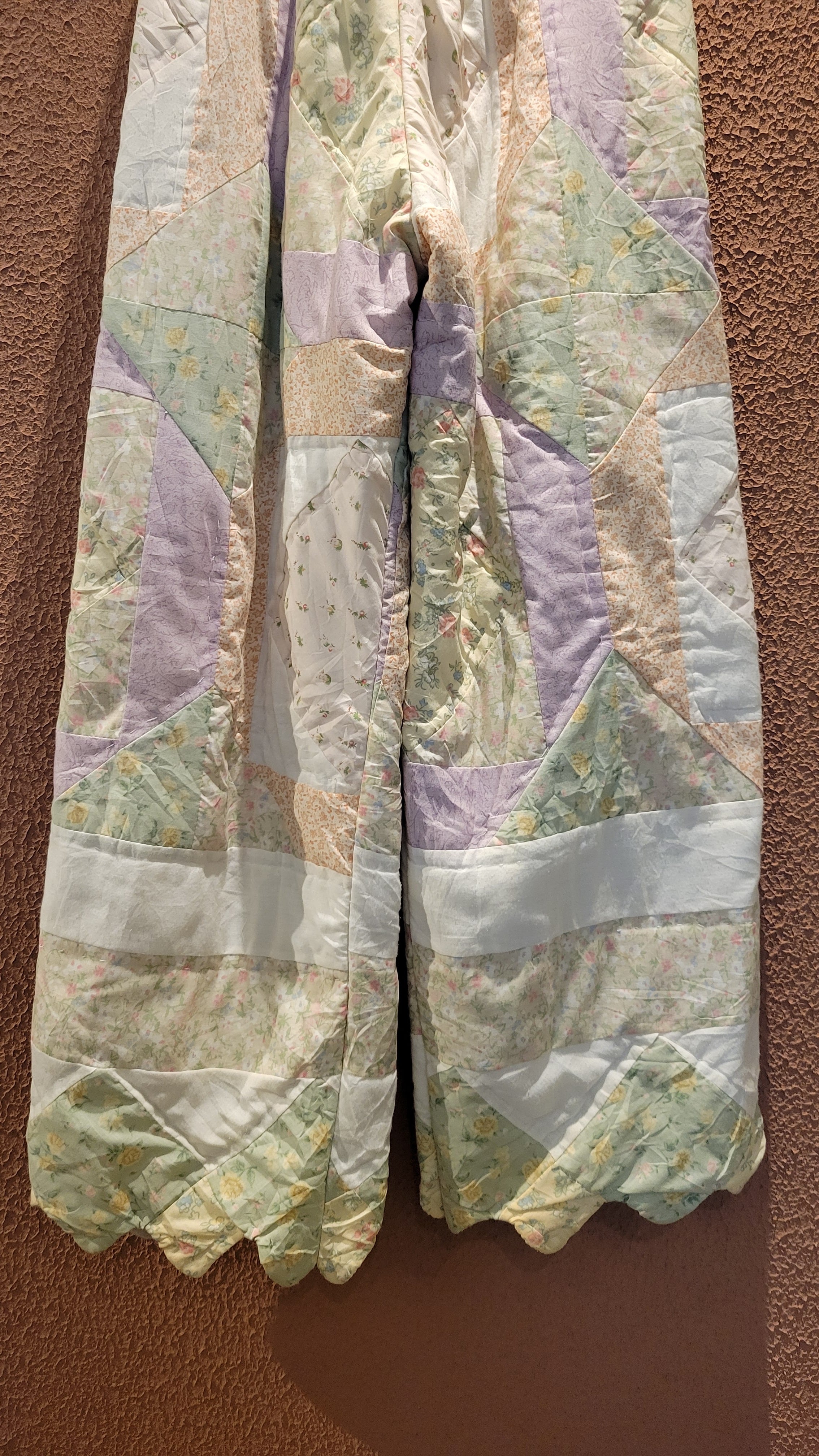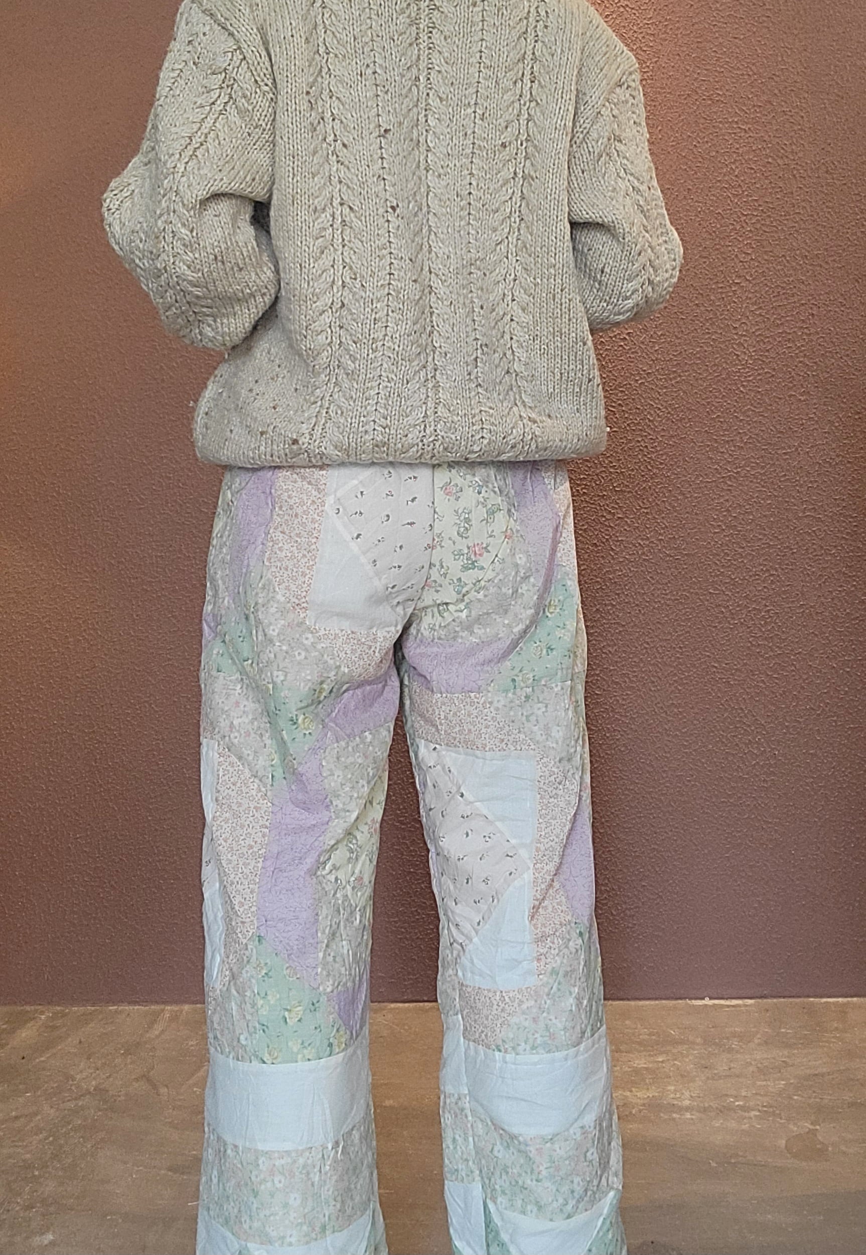 ヴィンテージのパッチワークキルト生地を使用したリメイクイージーパンツ。素材は2枚合わせの中綿入りコットン、ウエストゴム仕様、ポケット無しです。着脱しやすく軽量で温かい、普段使いにぴったりの1本です。