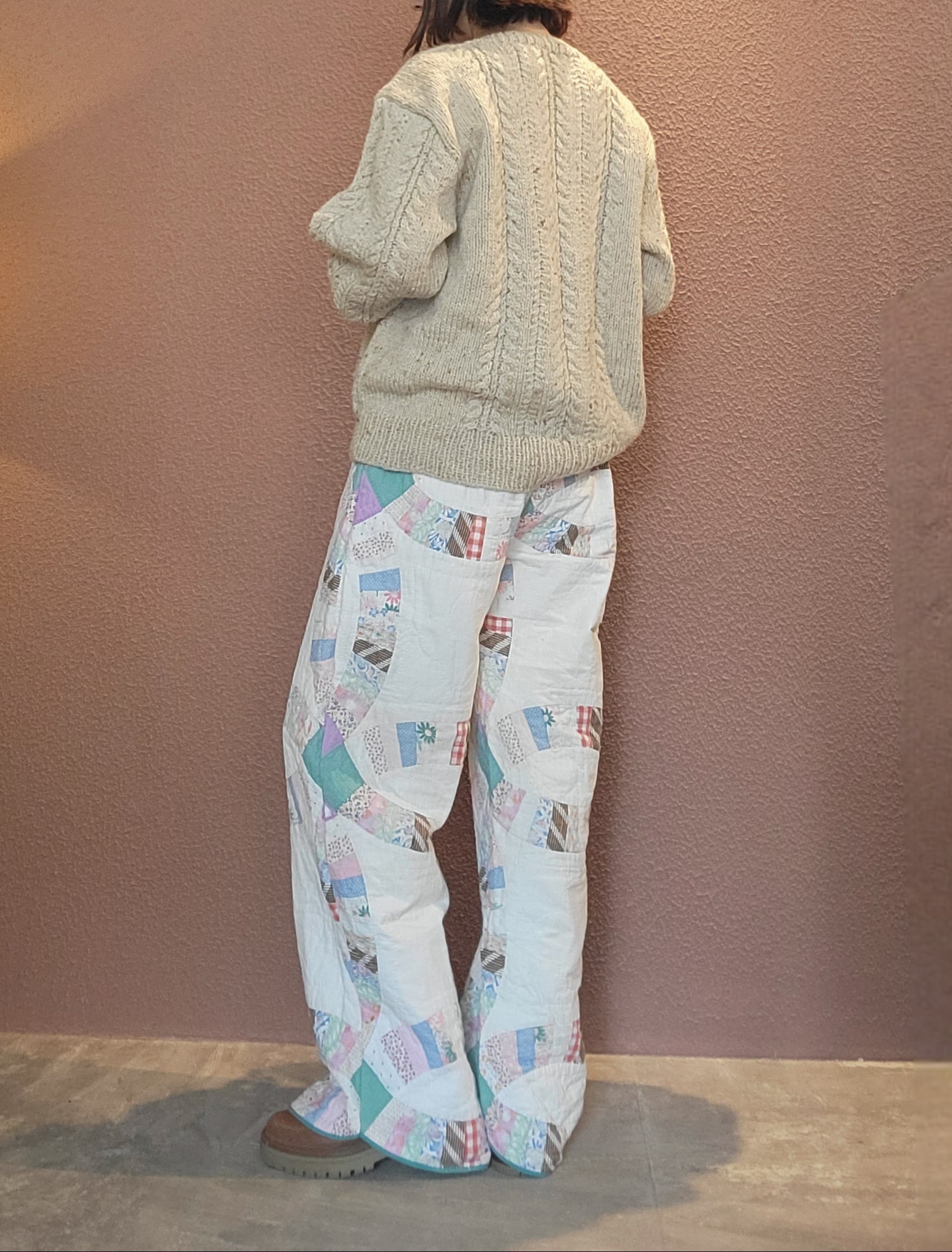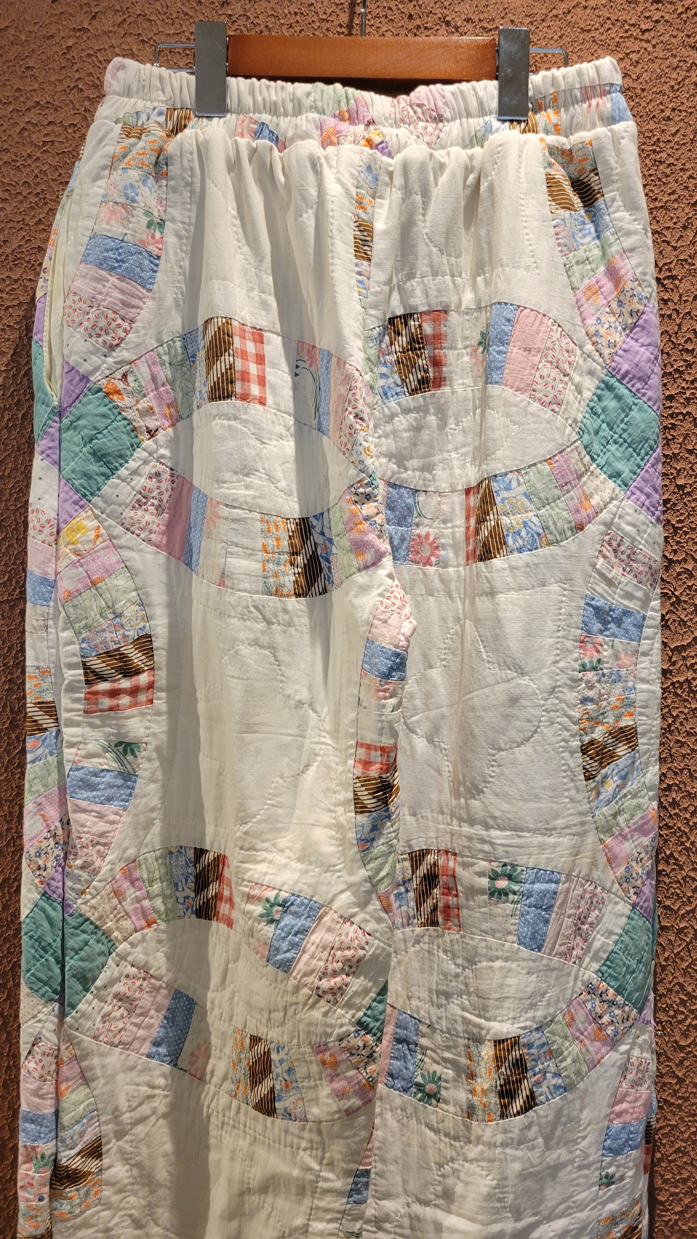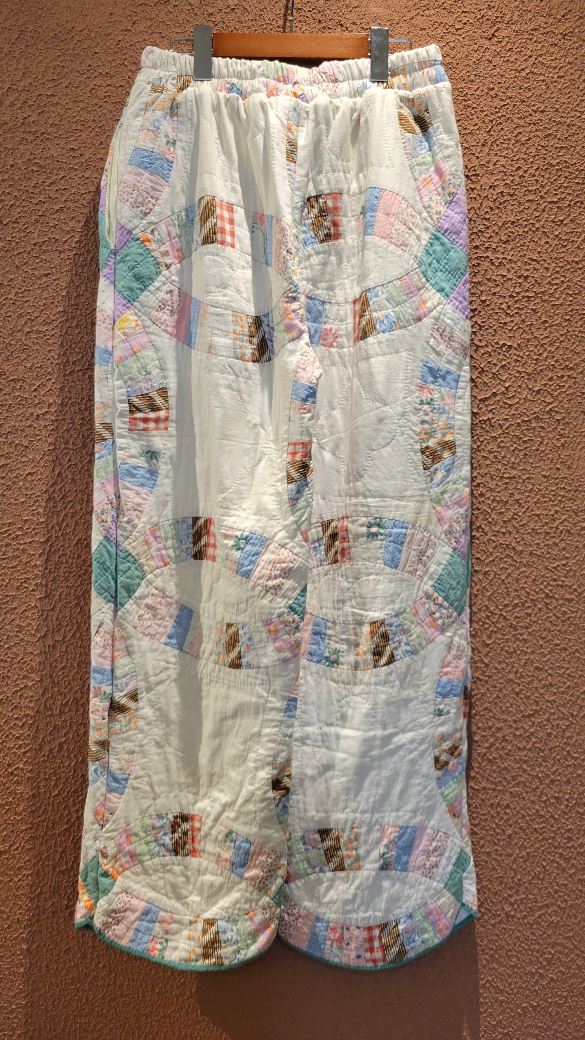 ヴィンテージのパッチワークキルト生地を使用したリメイクイージーパンツ。素材は2枚合わせのコットン(中綿無し)、ウエストゴム仕様、ポケット無しです。着脱しやすく軽量で温かい、普段使いにぴったりの1本です。
