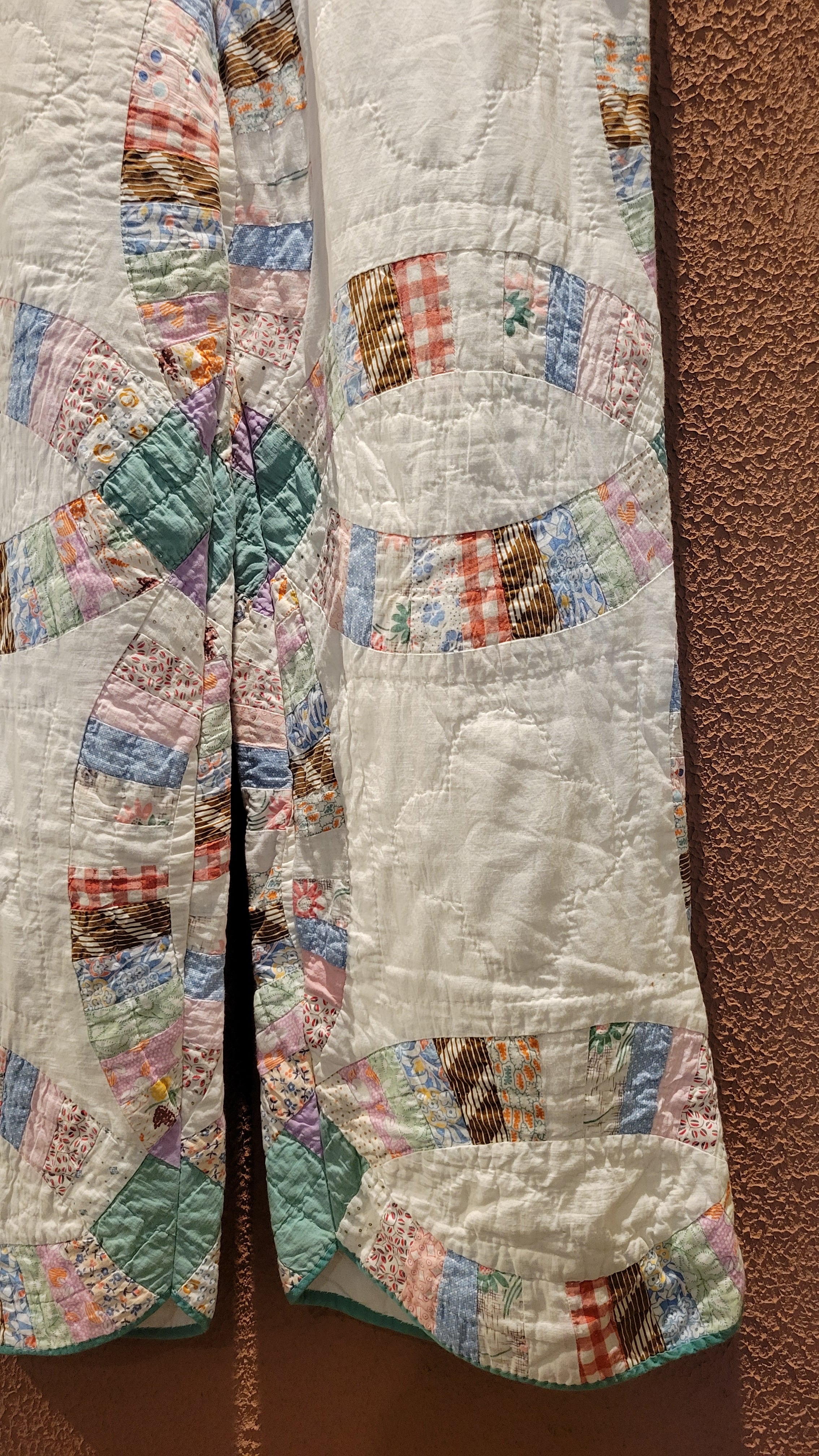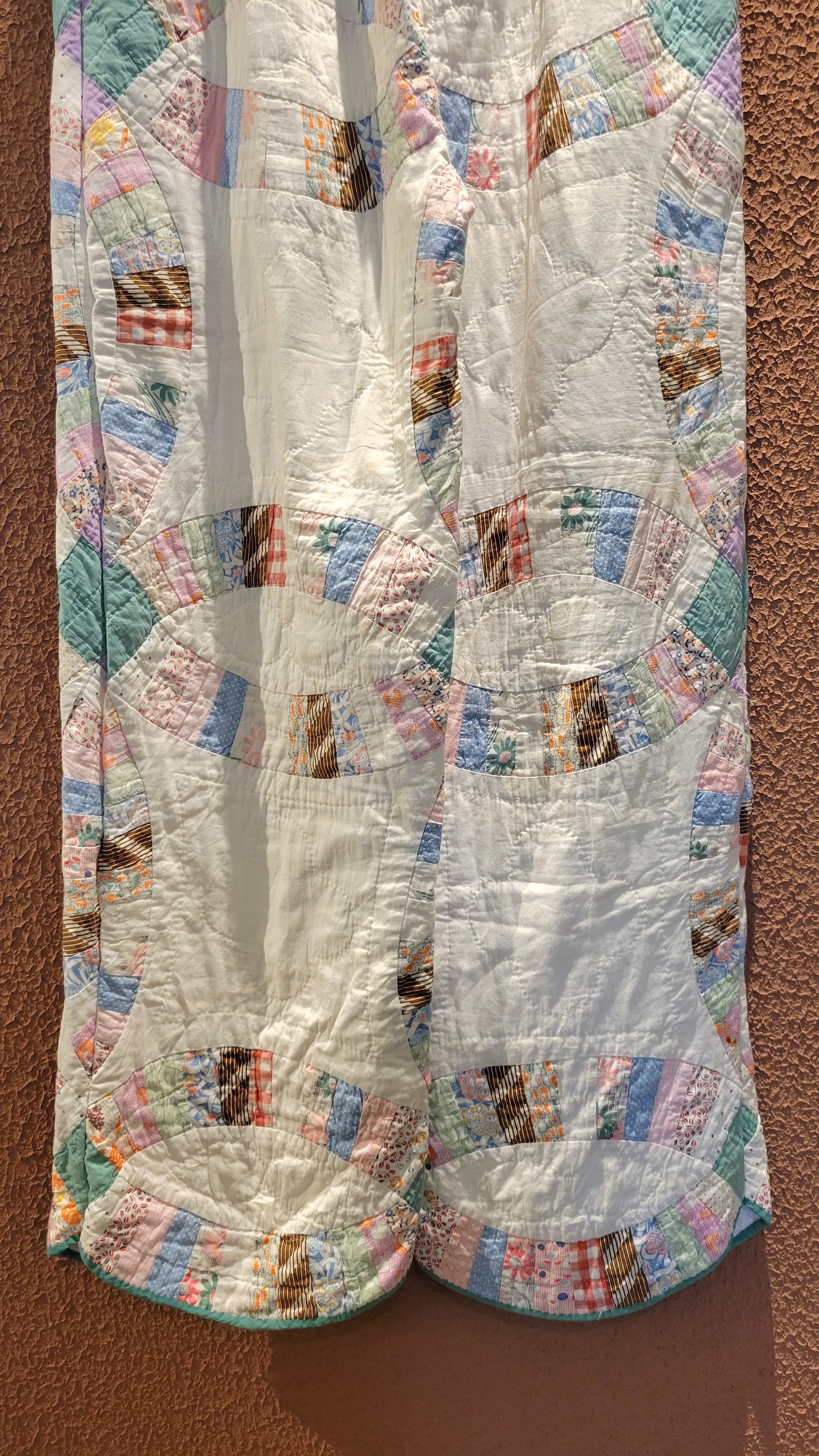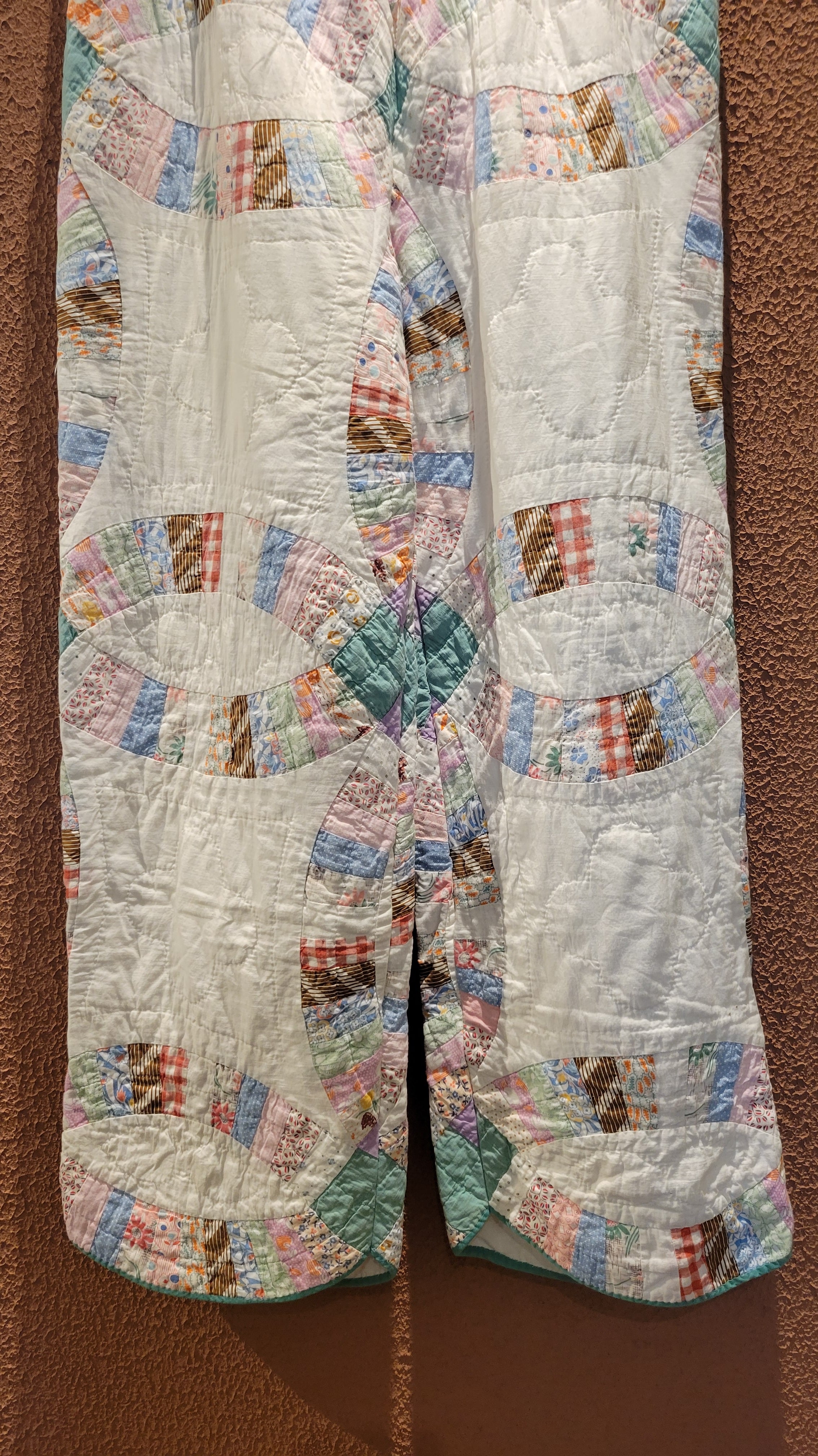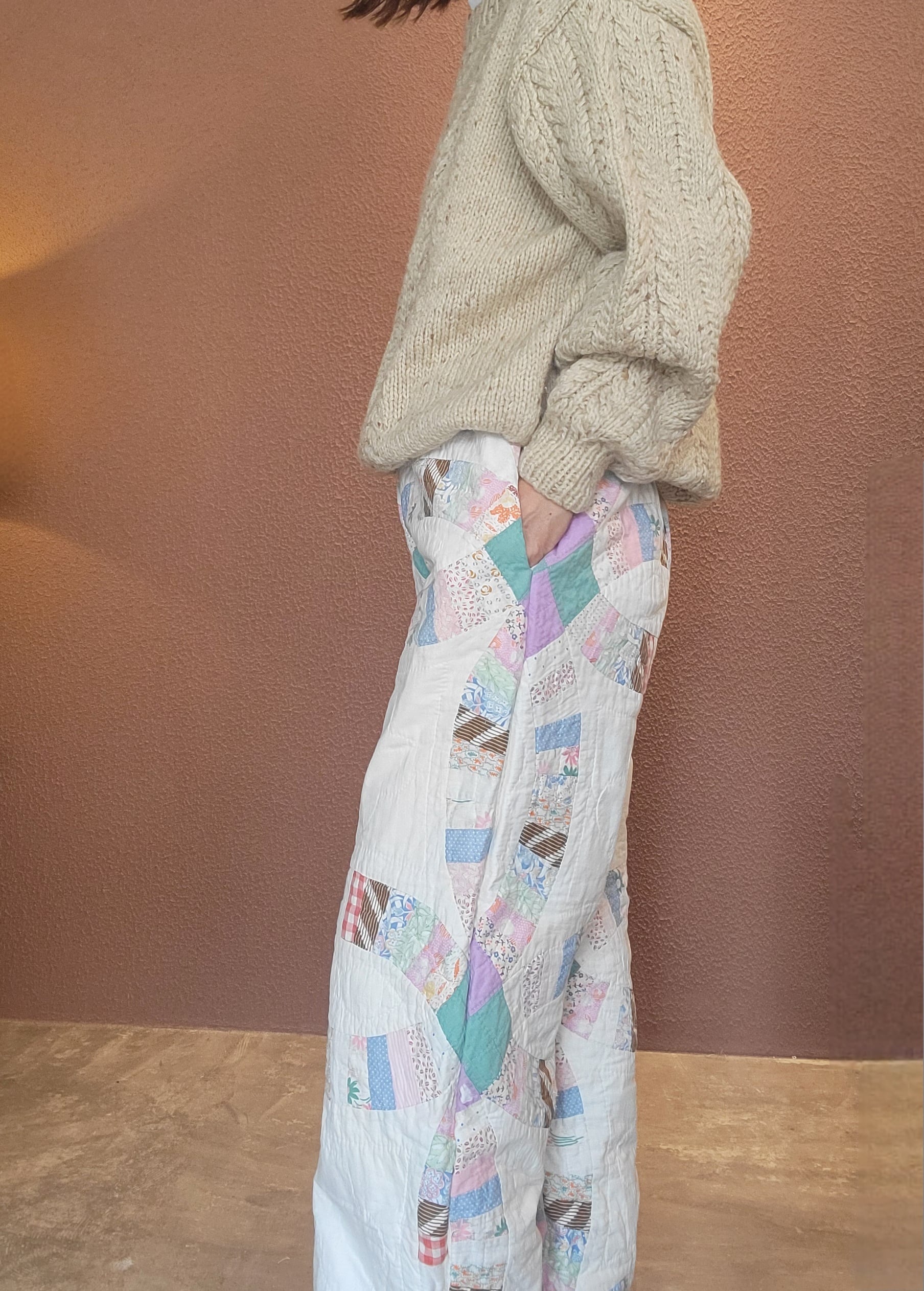 ヴィンテージのパッチワークキルト生地を使用したリメイクイージーパンツ。素材は2枚合わせのコットン(中綿無し)、ウエストゴム仕様、ポケット無しです。着脱しやすく軽量で温かい、普段使いにぴったりの1本です。