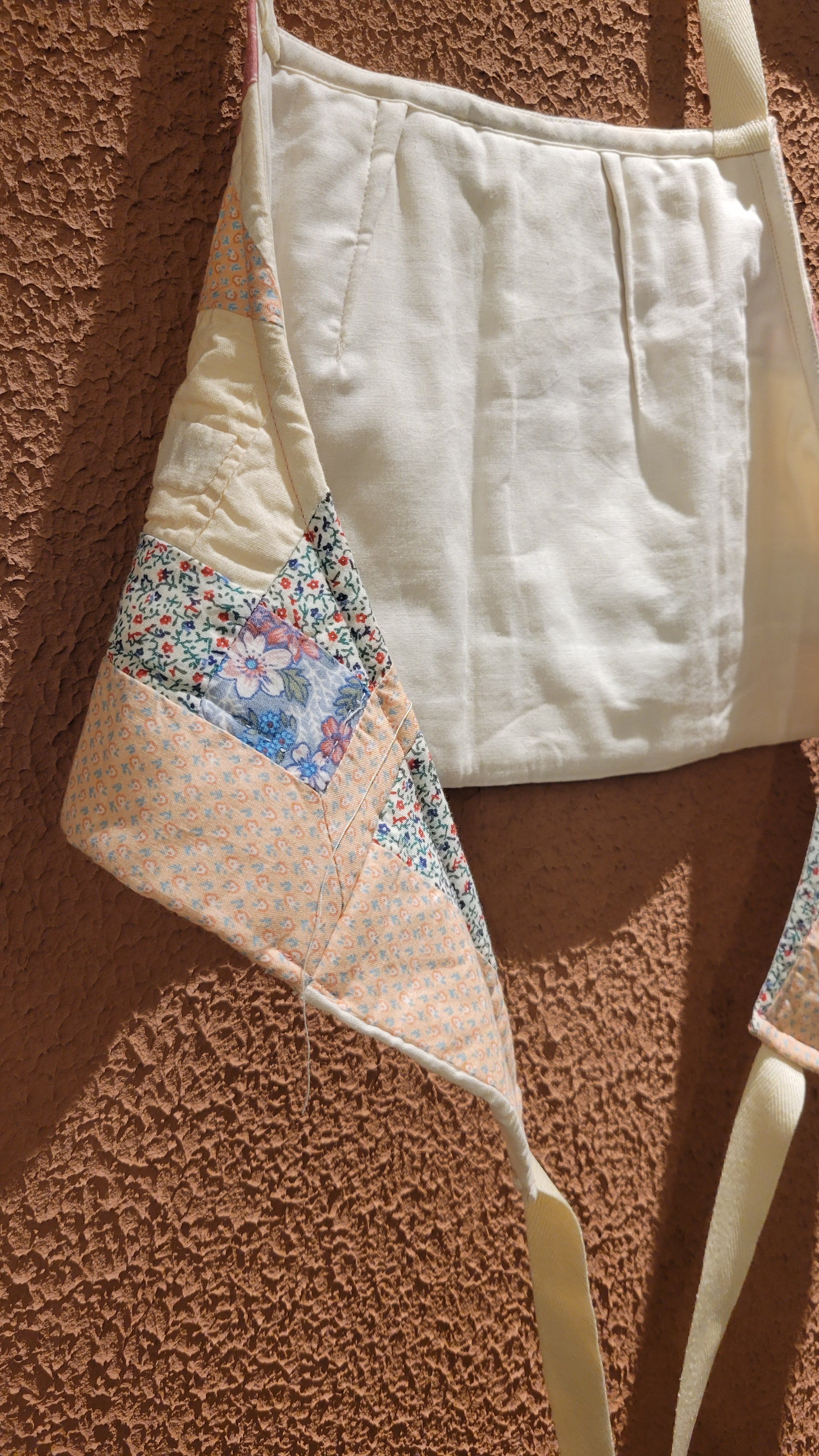 ヴィンテージのパッチワークキルトを使用したリメイクビスチェです。ショート丈のエプロンのようなデザインで色々なトップスに合わせて通年で着用できます。首後ろにスナップボタンが3つ付いています。サイズフリーです。