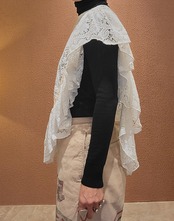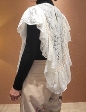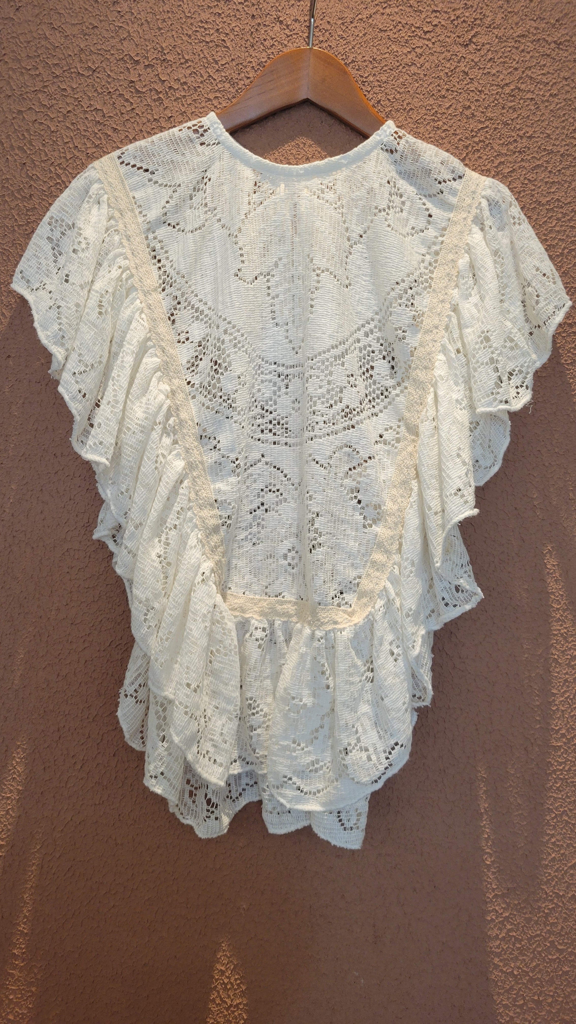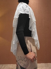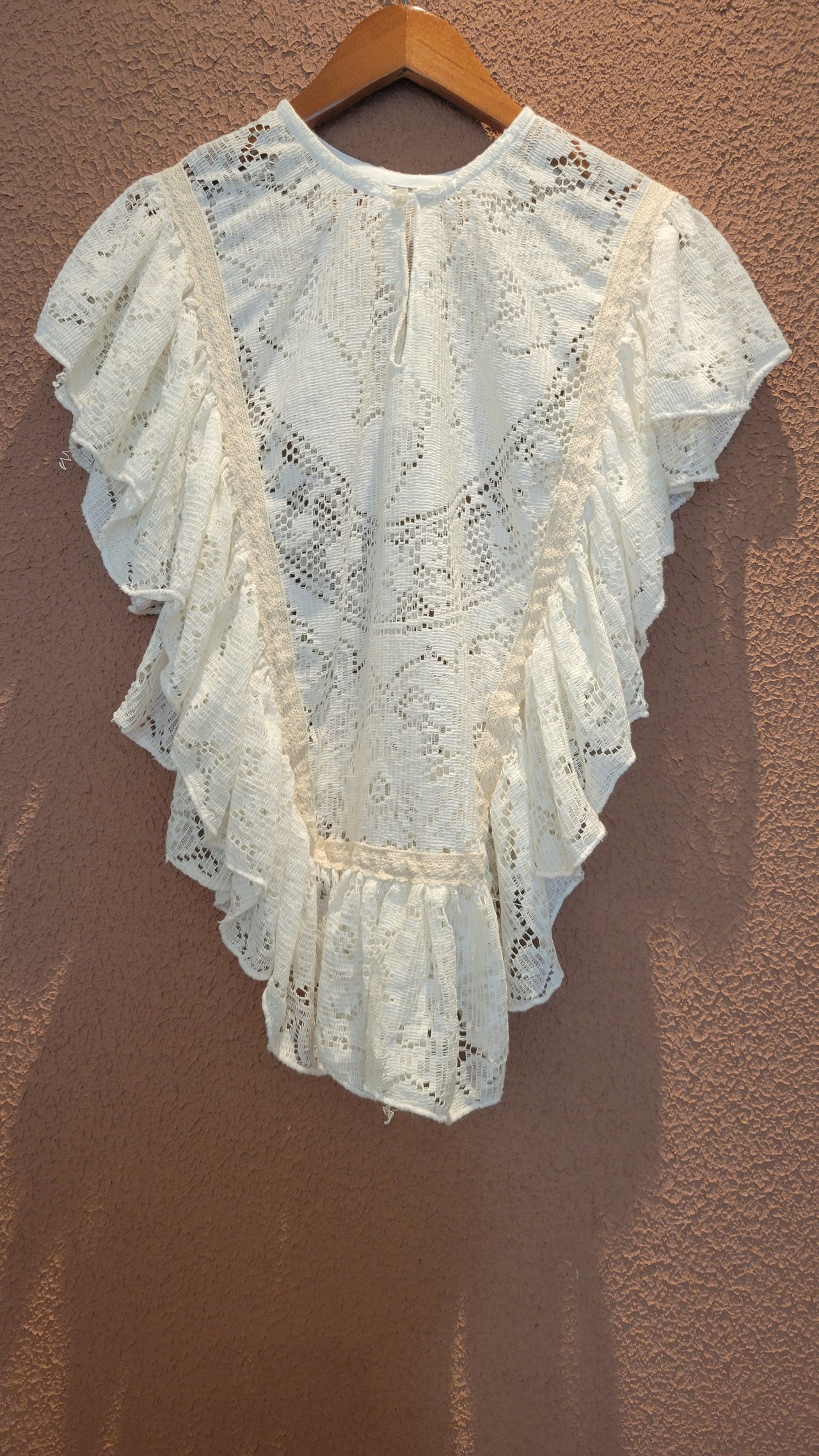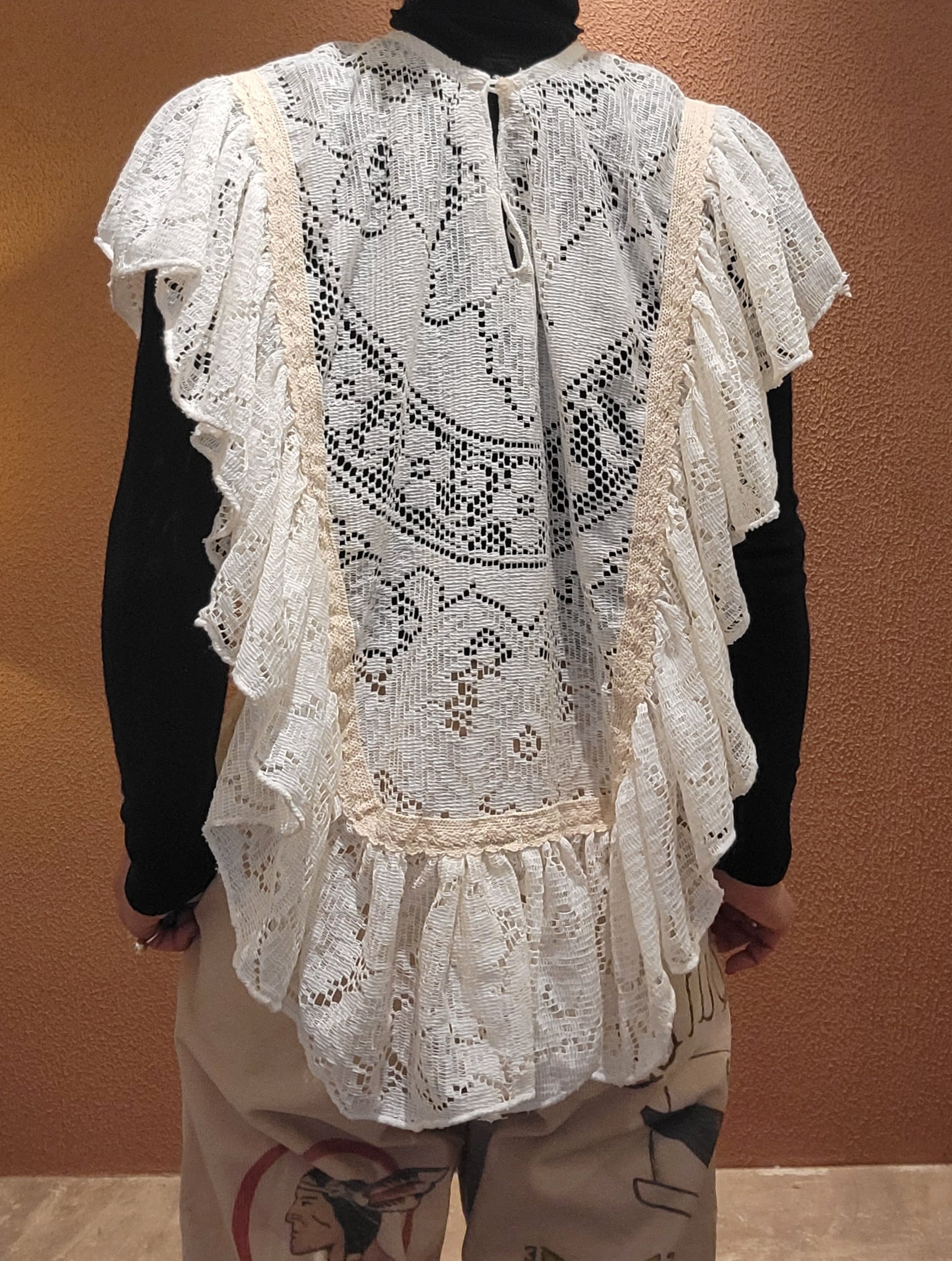 ヴィンテージレースを使用したリメイクトップス。素材はコットンのようです。首後ろに小さなボタンが1つ付いています。両サイドはオープンでポンチョのような仕様。サイズフリーです。Tシャツ、ニット、ワンピース、色々なアイテムに合わせて着用できます。