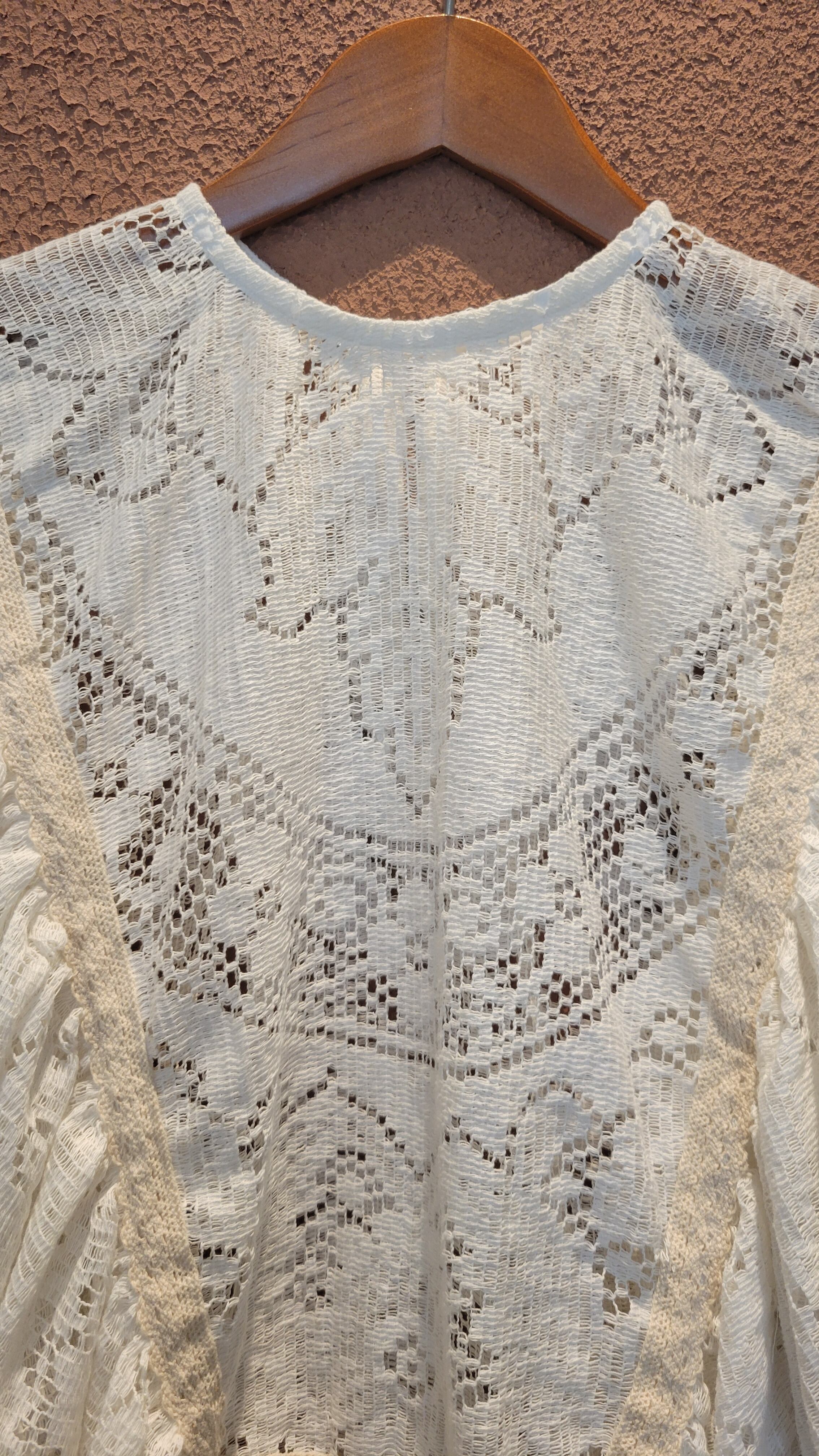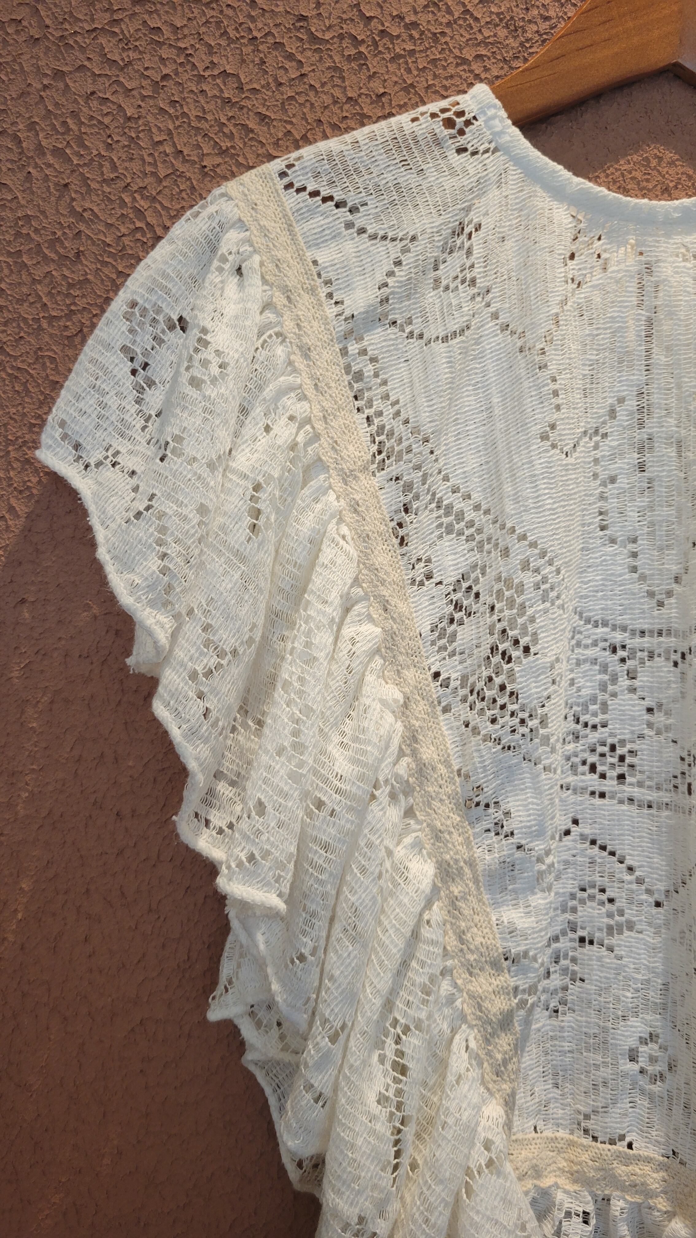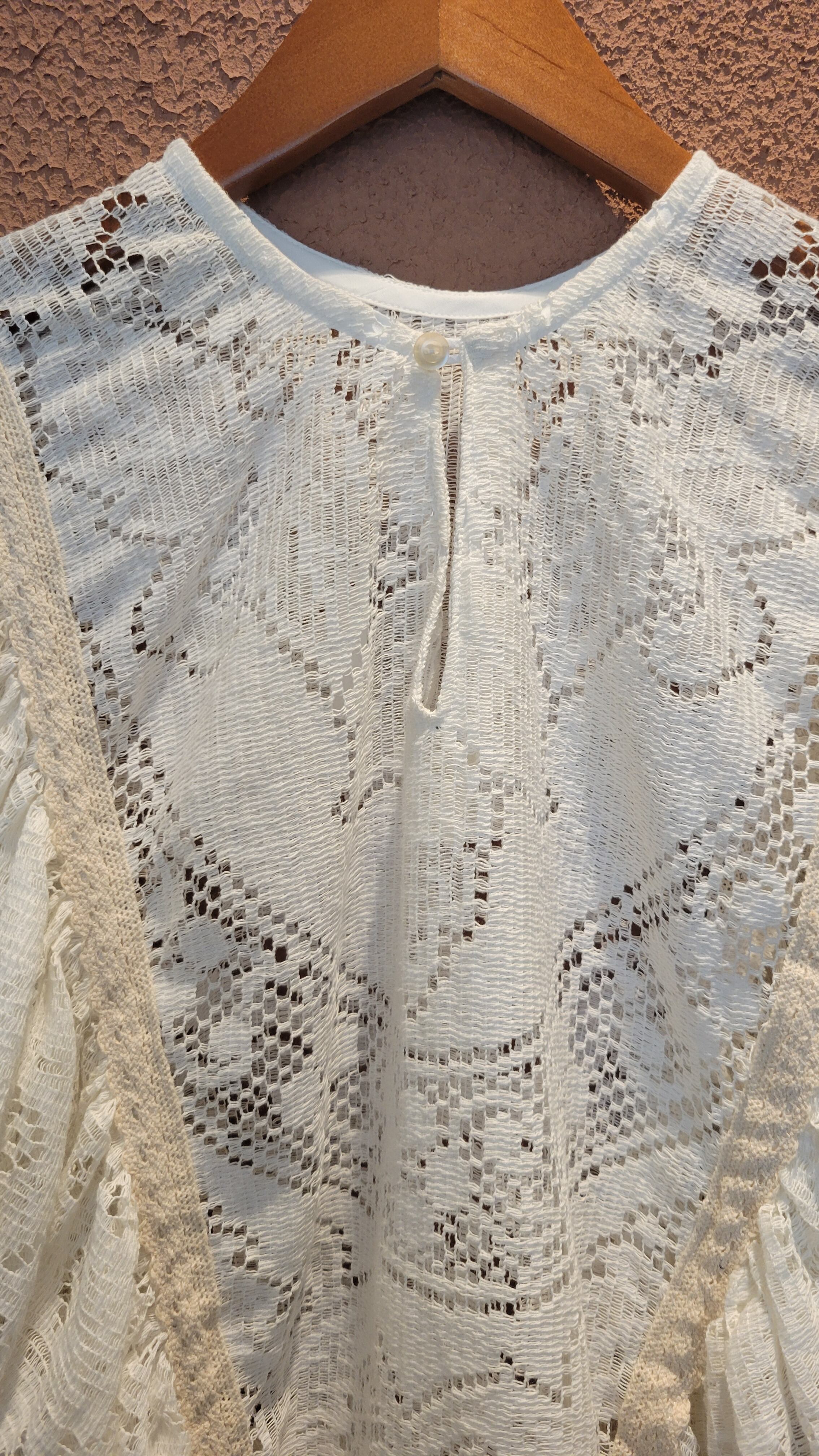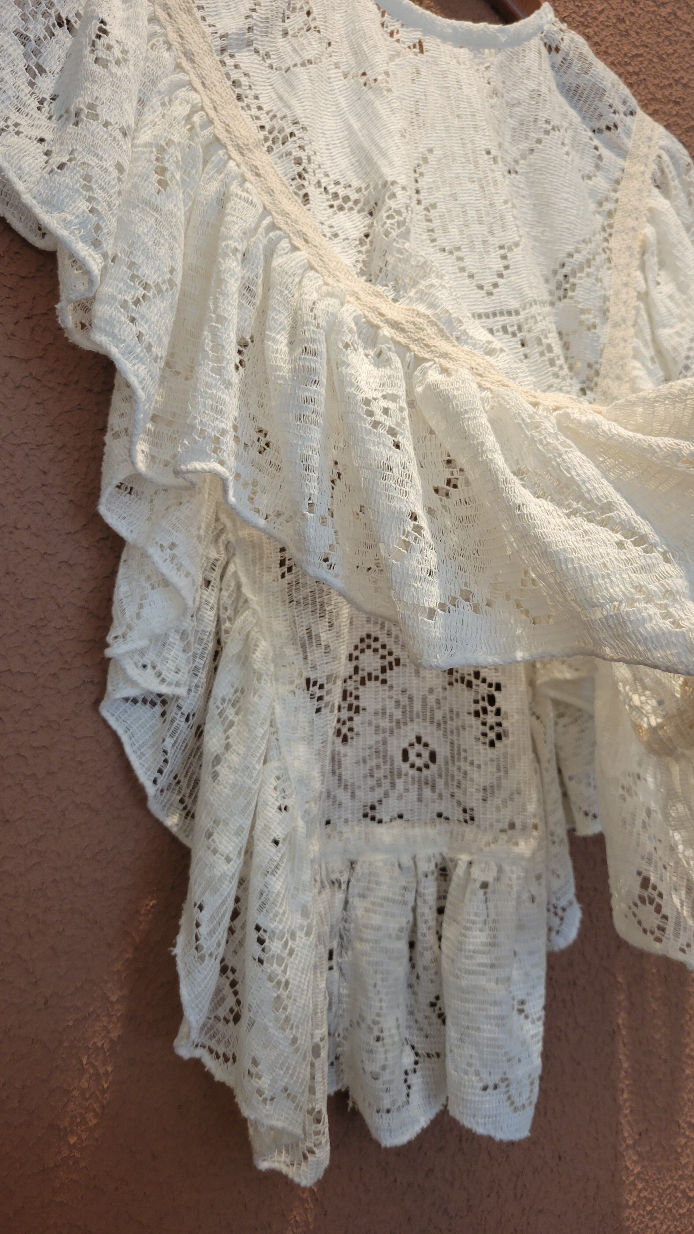ヴィンテージレースを使用したリメイクトップス。素材はコットンのようです。首後ろに小さなボタンが1つ付いています。両サイドはオープンでポンチョのような仕様。サイズフリーです。Tシャツ、ニット、ワンピース、色々なアイテムに合わせて着用できます。