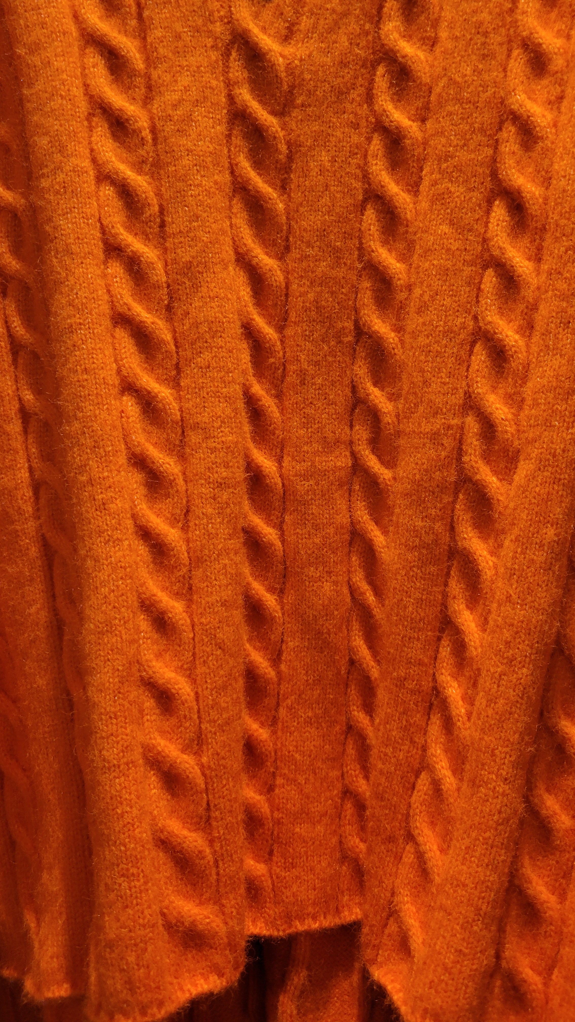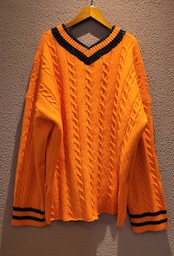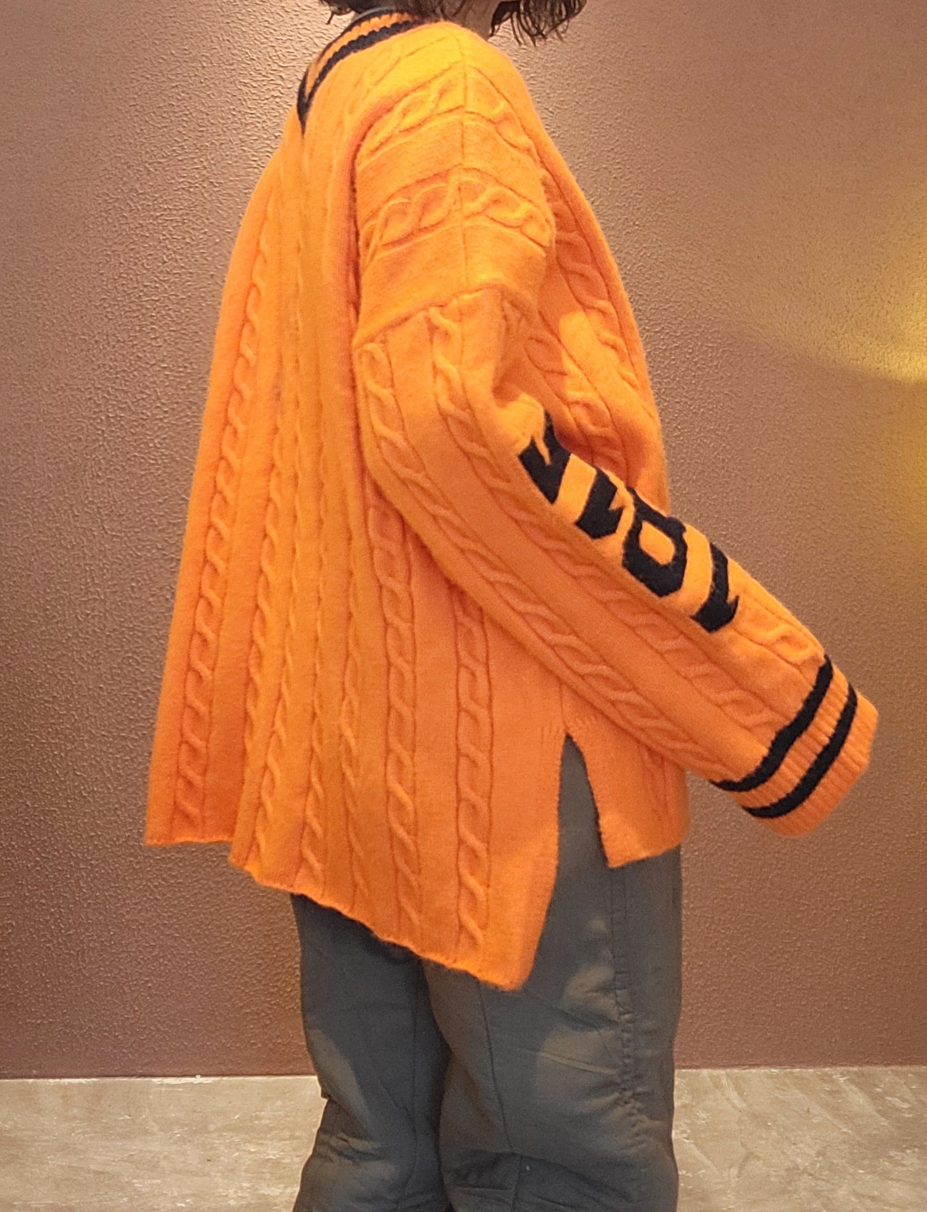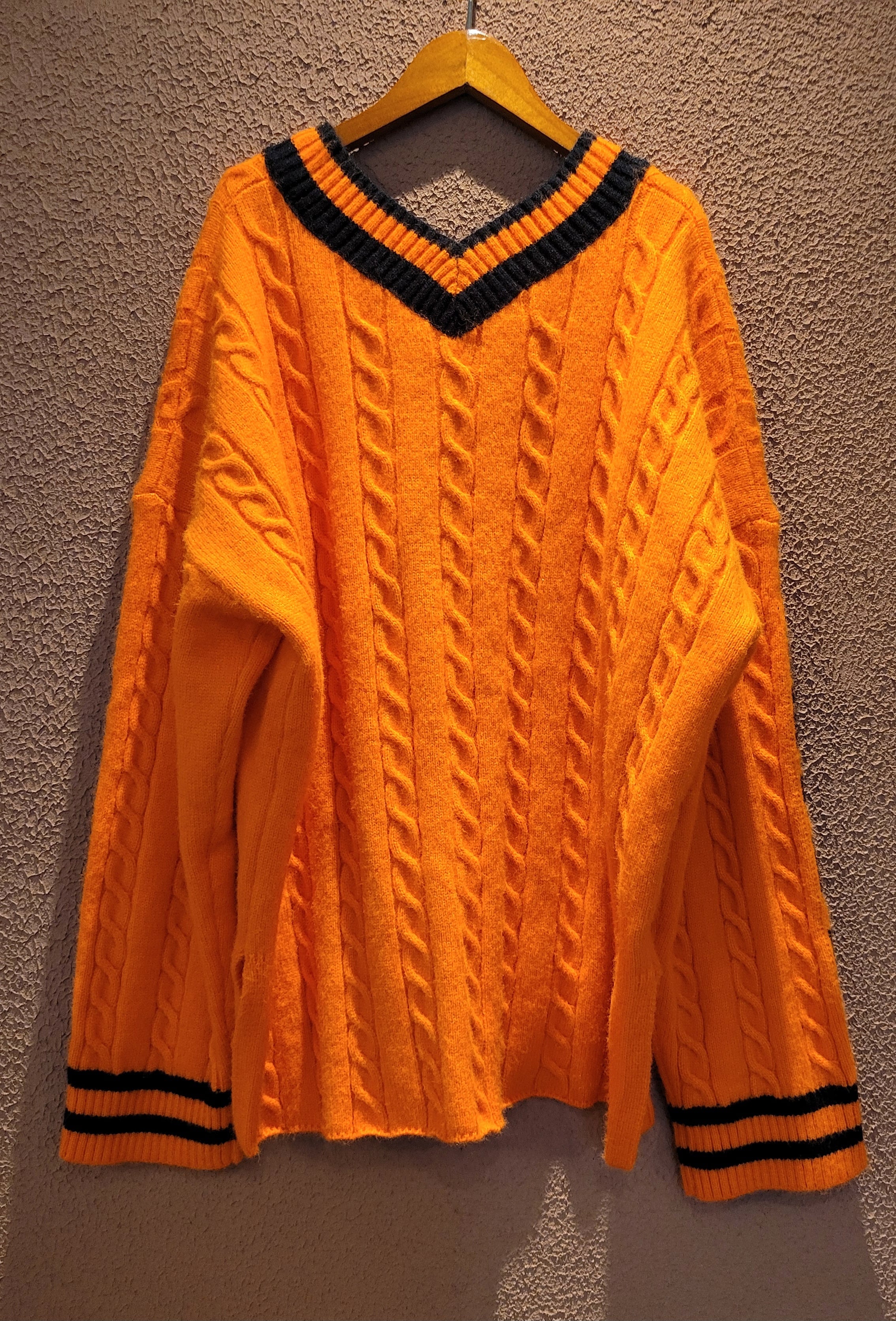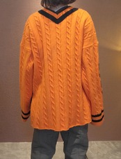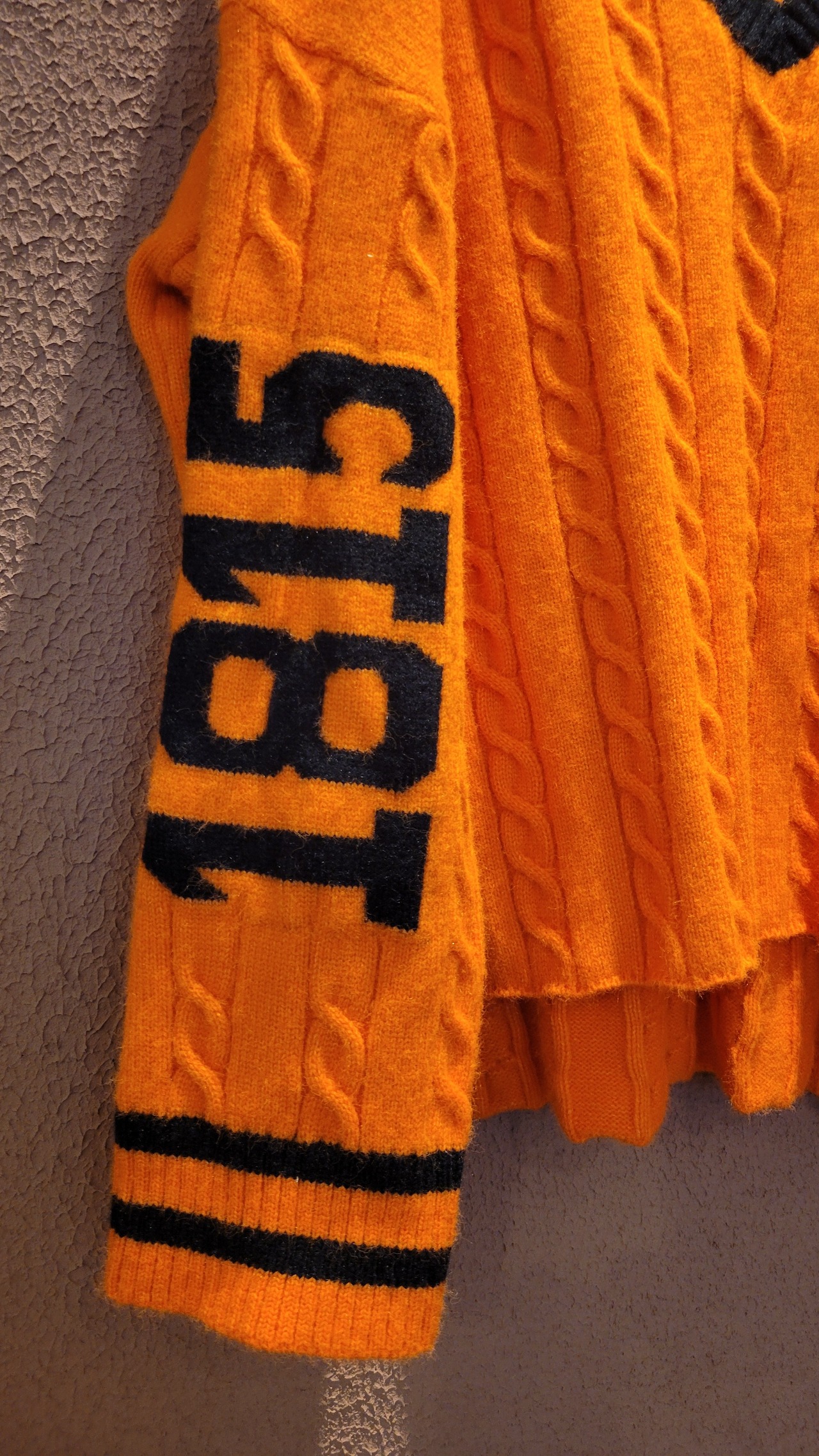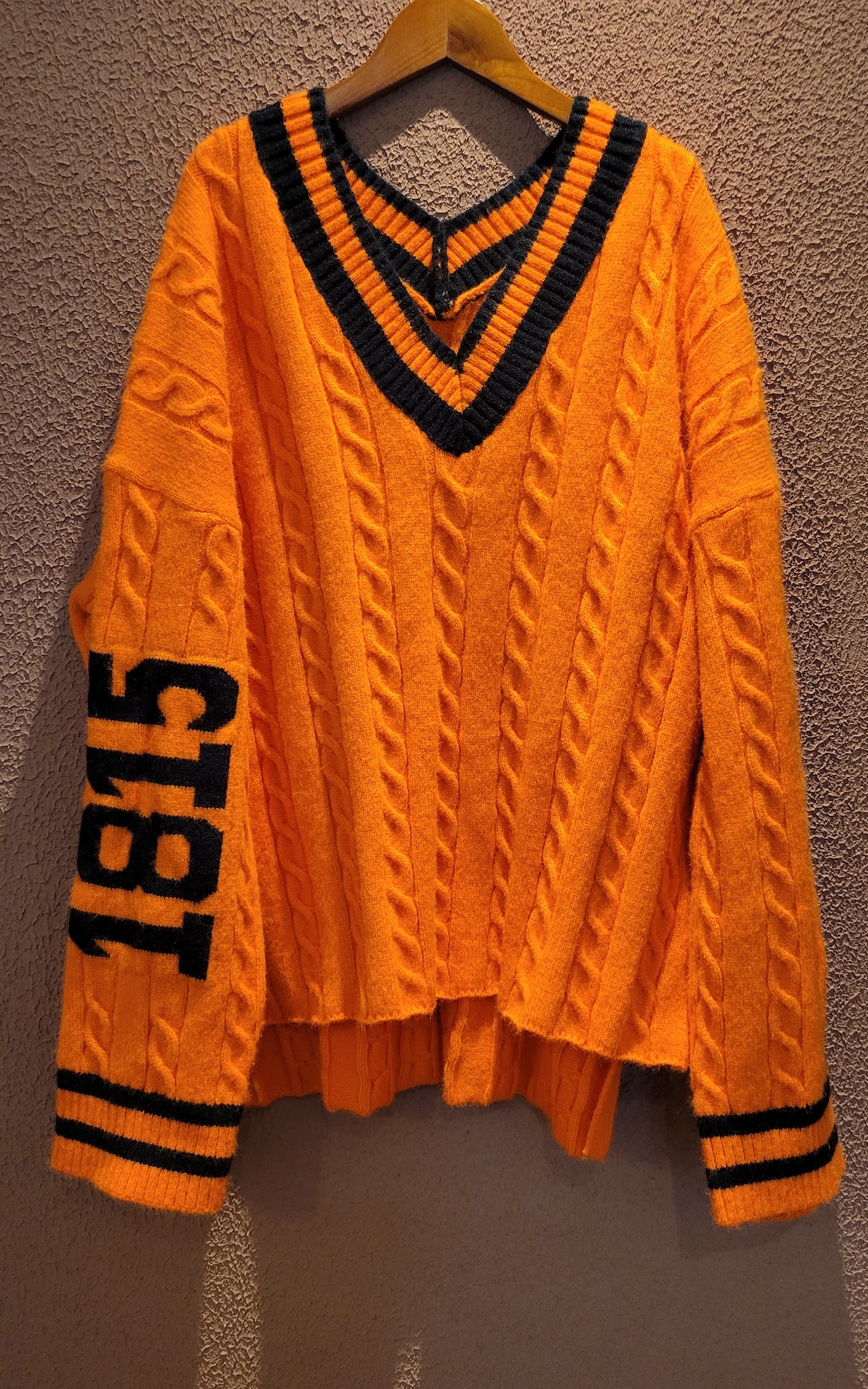 used ニットセーター。素材表記はありませんがふんわり肌触りの柔らかなニットです。明るいオレンジカラーをブラックのラインと"1815"の数字がきりっと引き締めます。ゆったりオーバーサイズとVネックの抜け感でこなれた雰囲気のニットです。