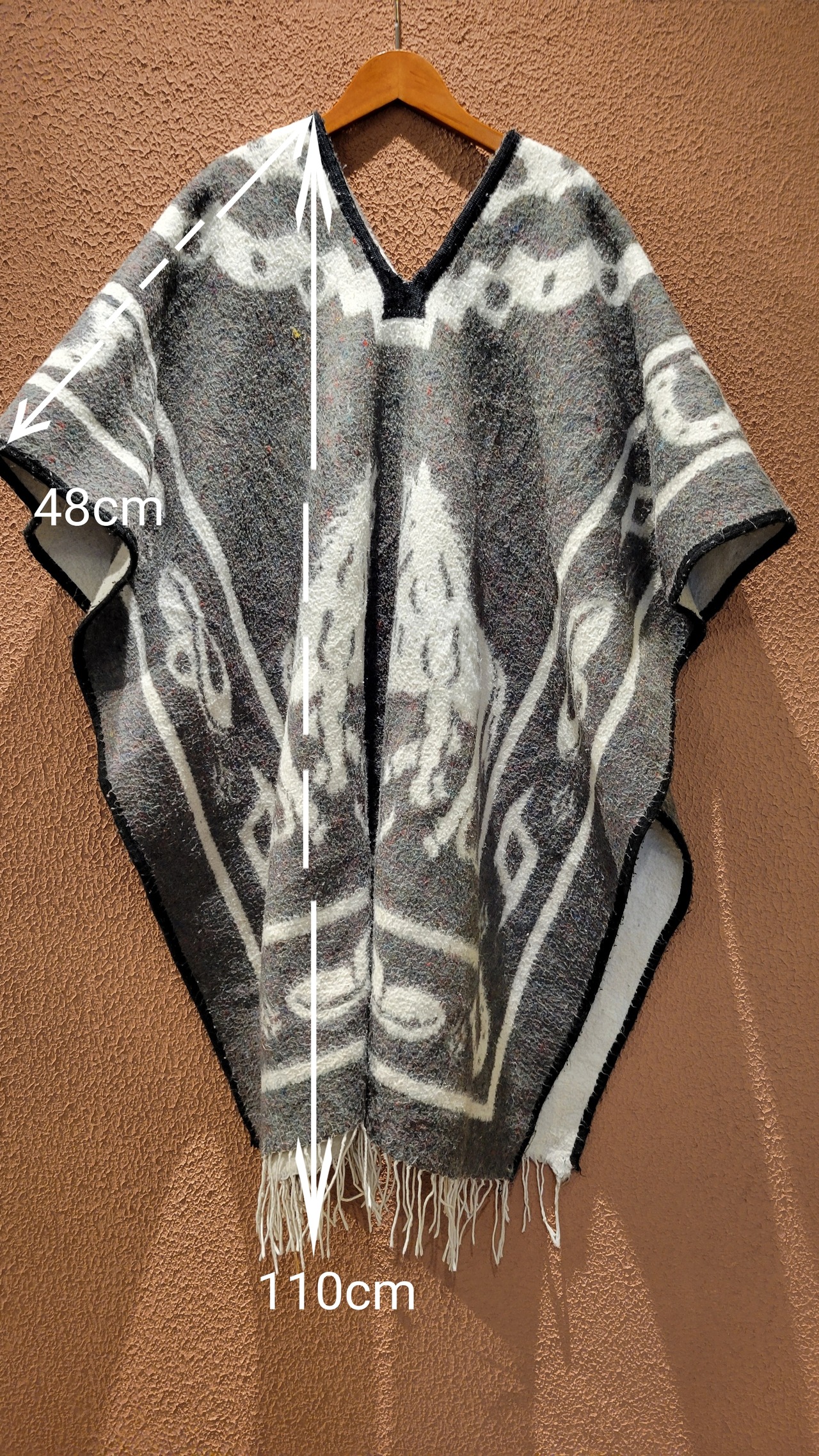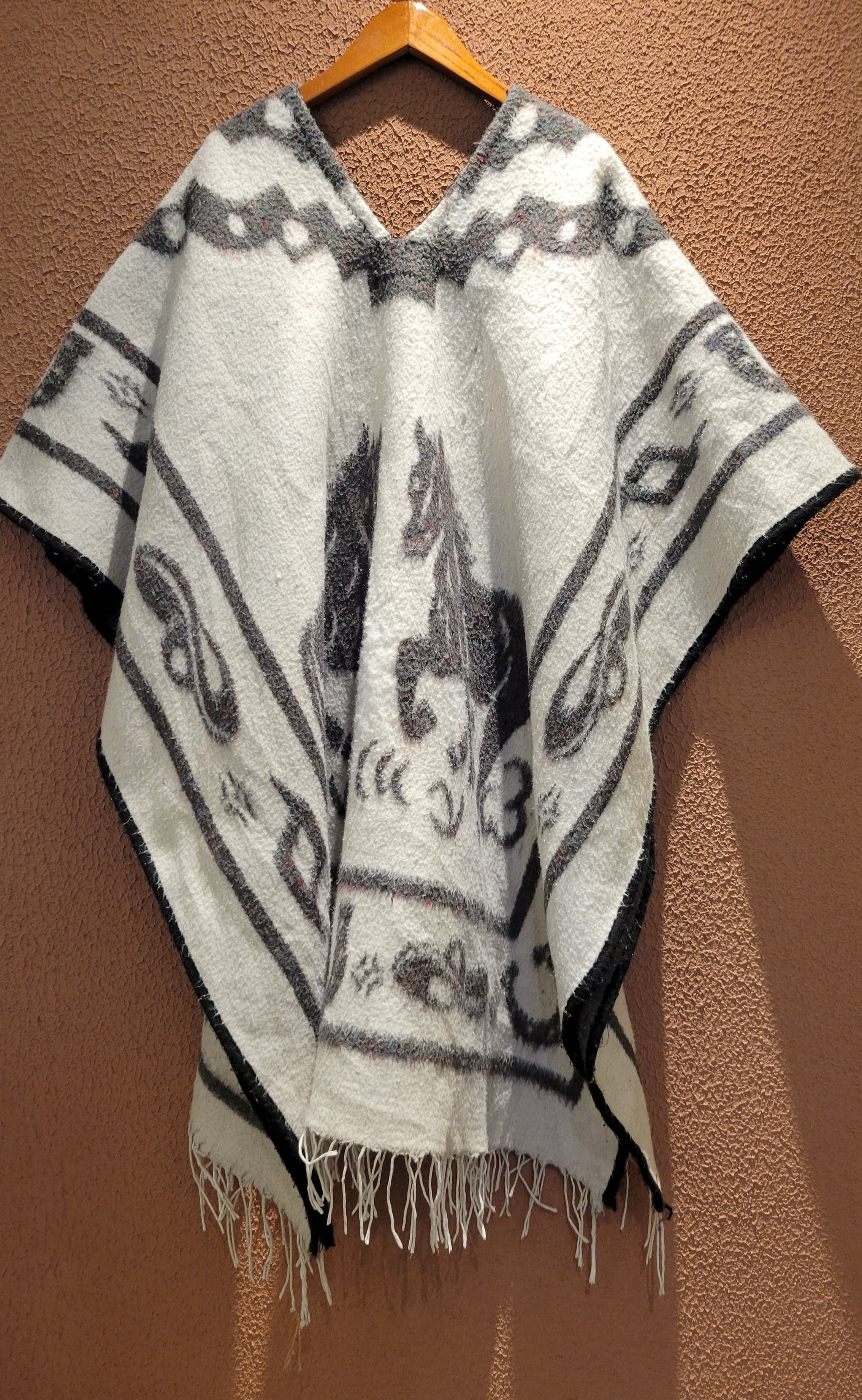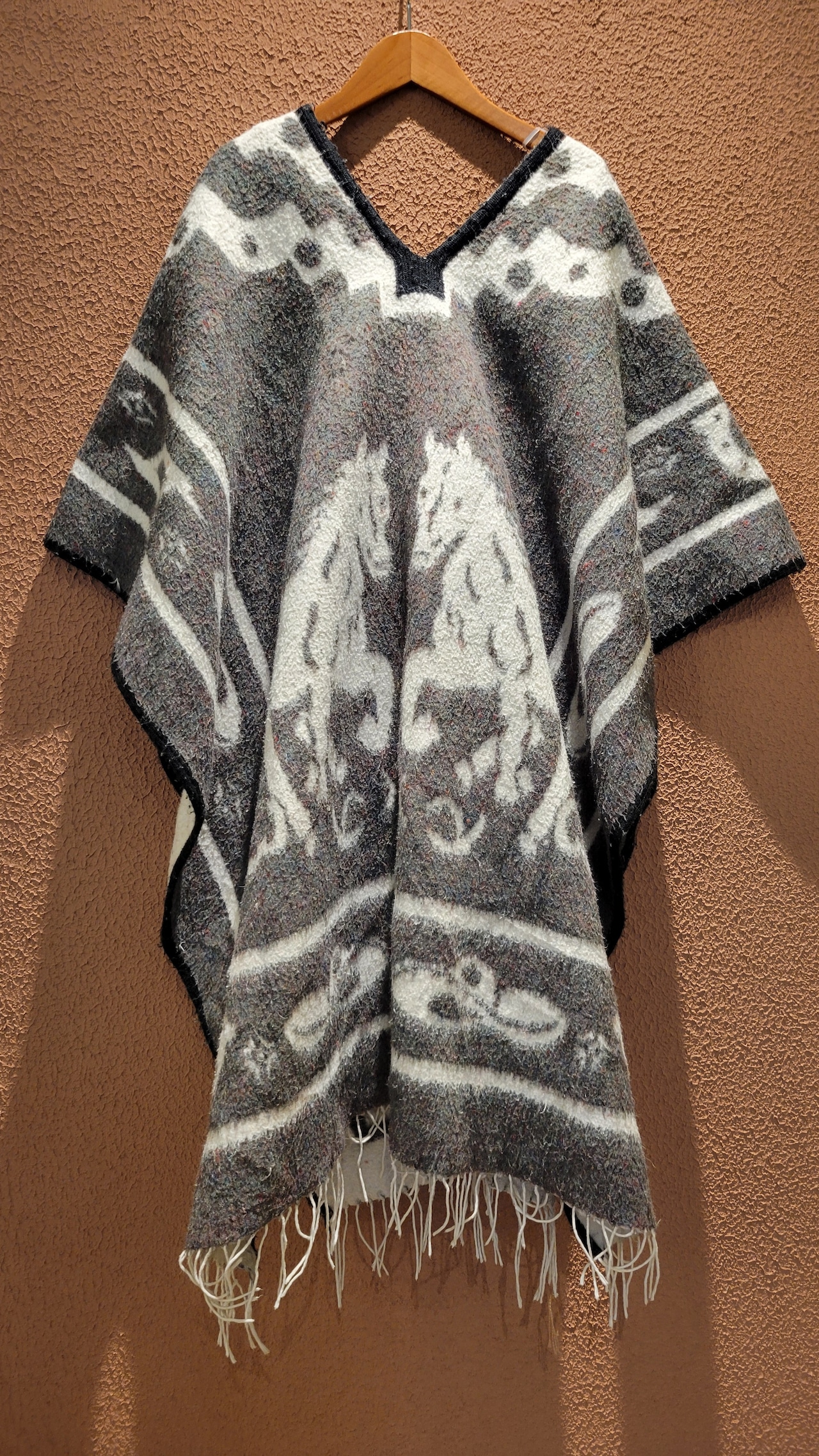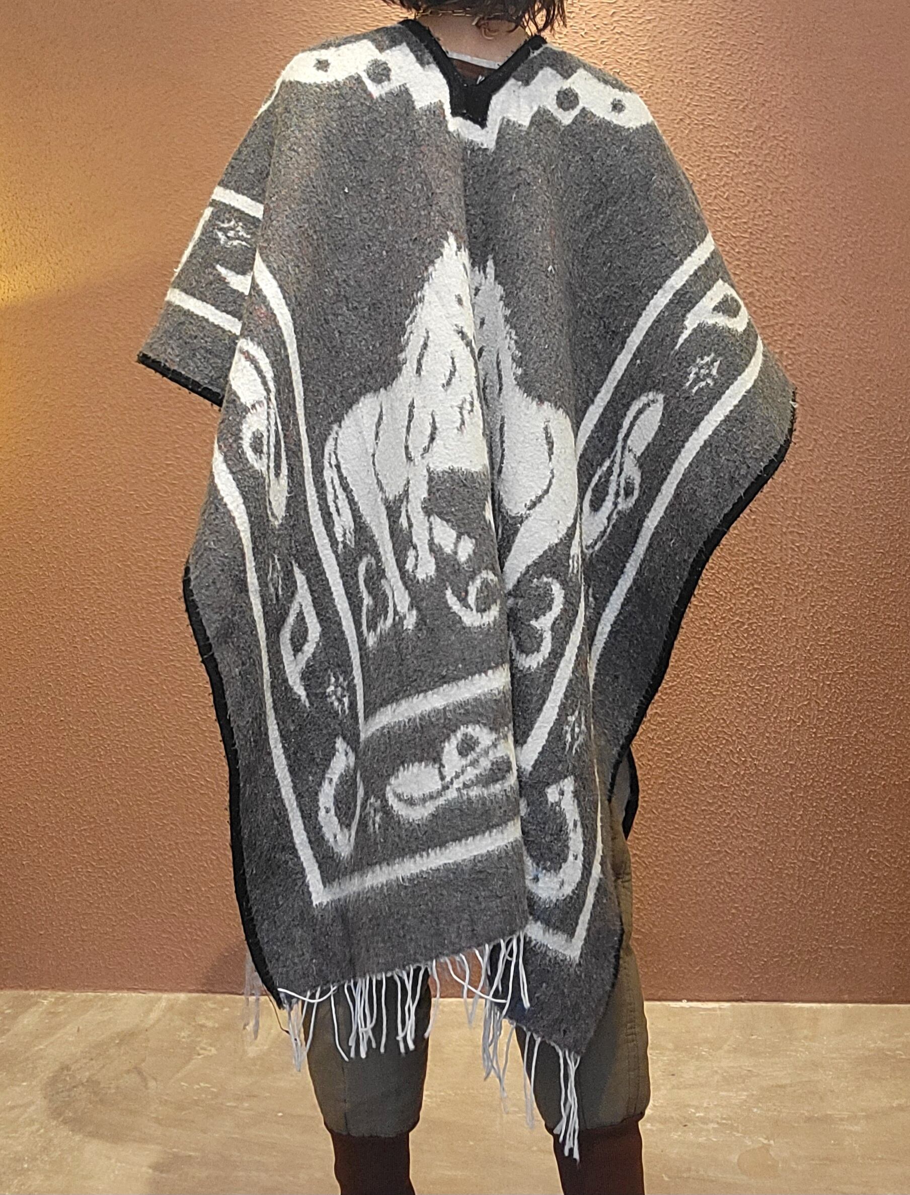 ヴィンテージのウールポンチョ。リバーシブル、サイズフリーです。生地量があるためやや重量がありますが着用時にストレスを感じるほどではありません。毛布をまるごと1枚纏うかのような感覚です。サイドオープンのポンチョなのでドルマンスリーブのトップスや厚手のニット等にもぴったりのアウターです。