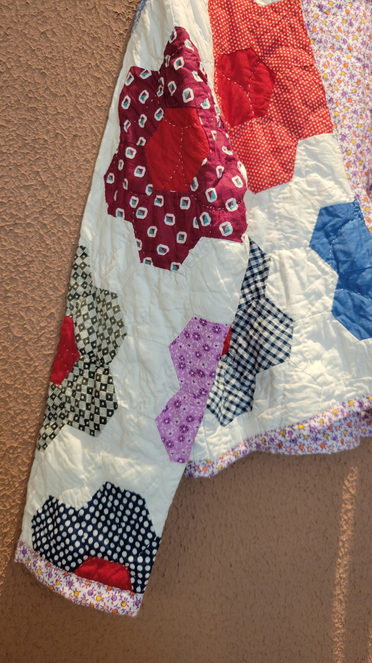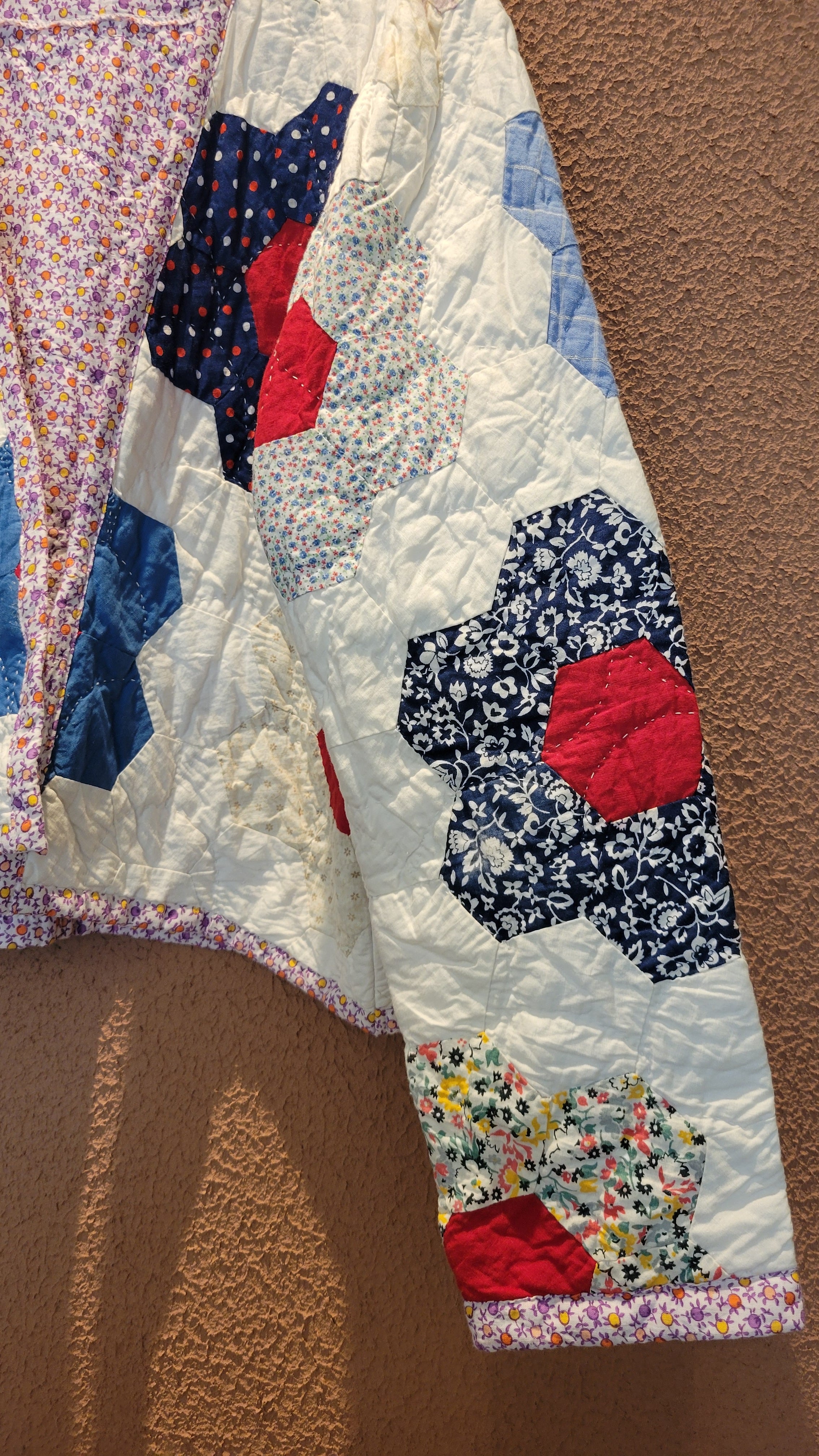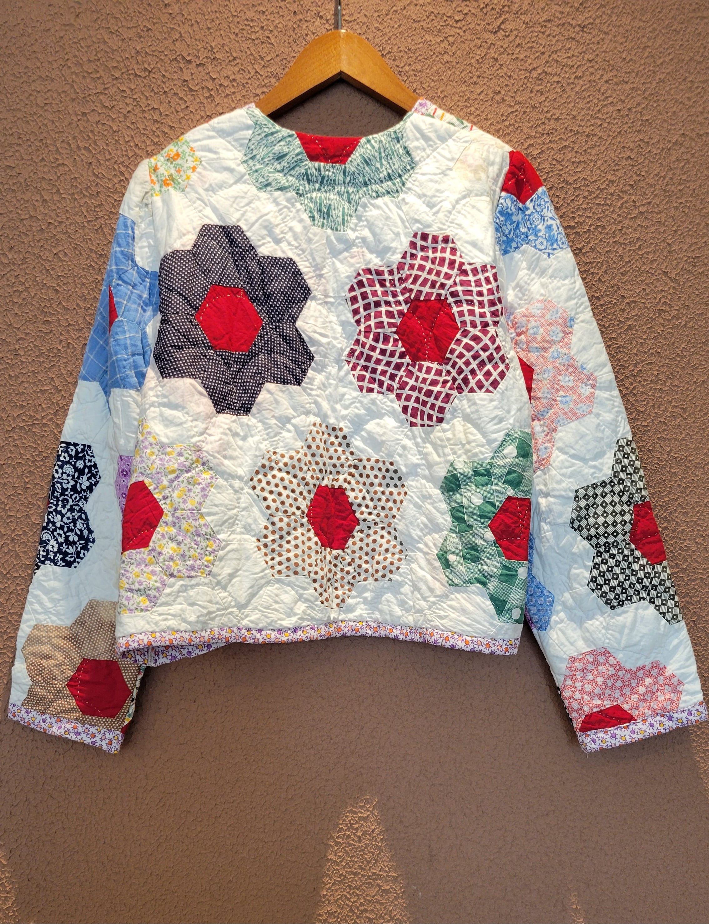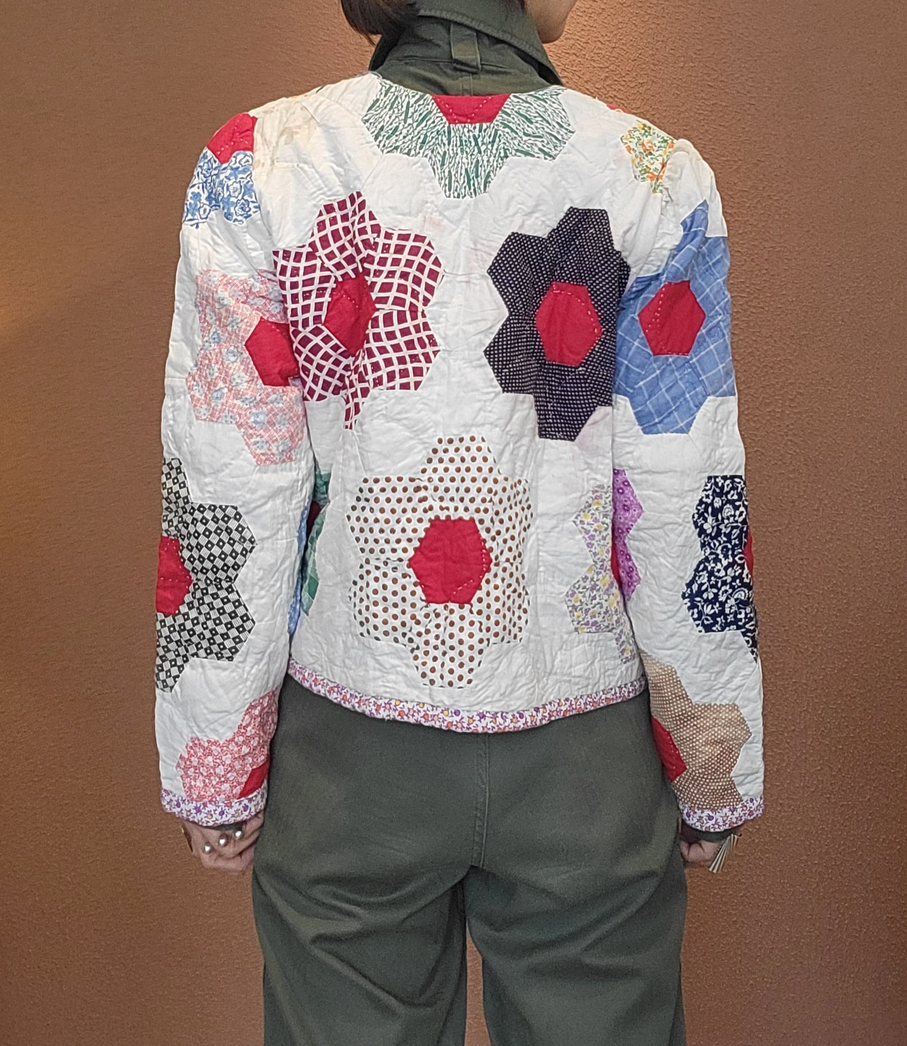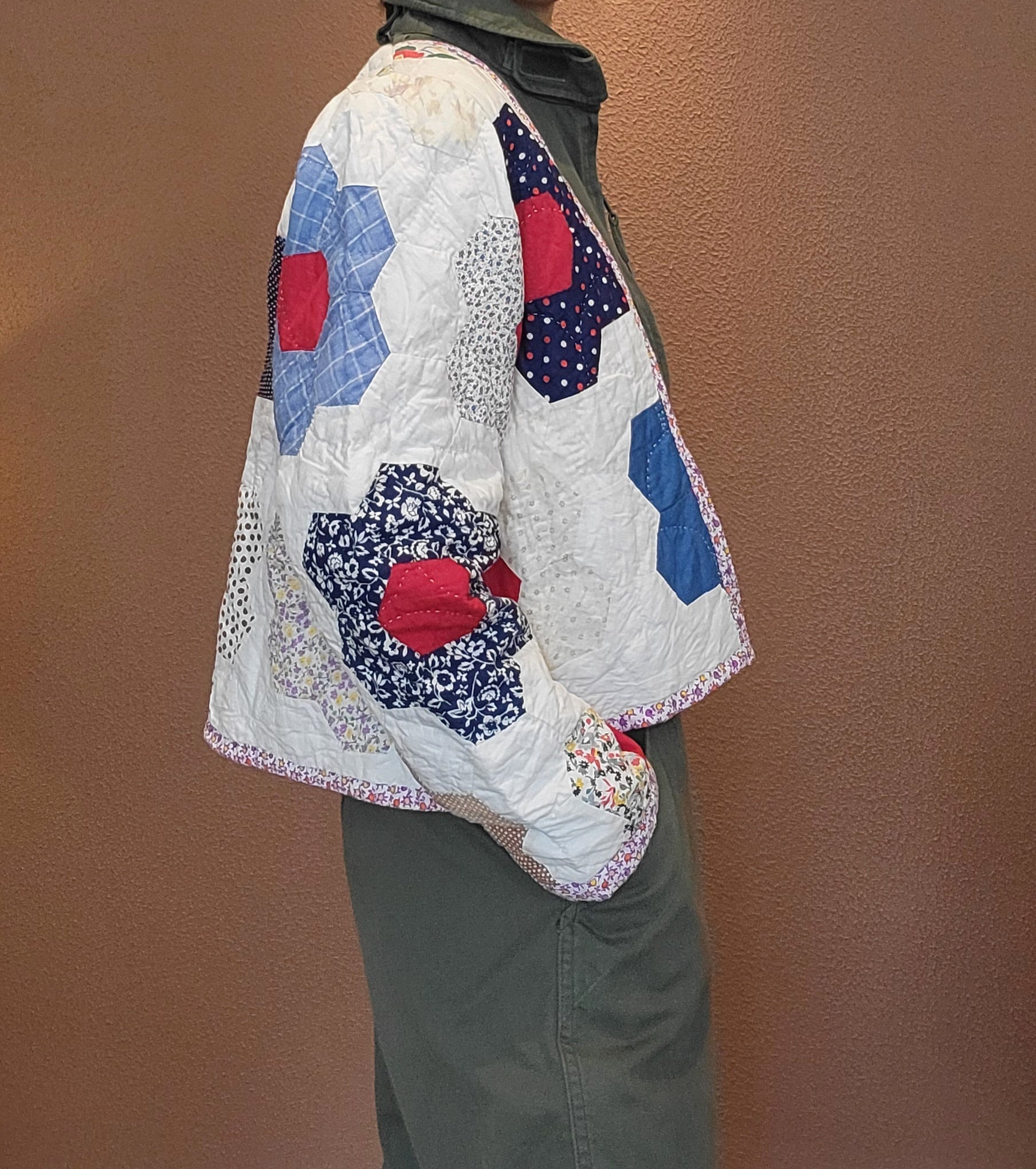 ヴィンテージのパッチワークキルト生地を使用したリメイクジャケット。素材は2枚合わせのコットンです。厚地ではないため着膨れせずすっきりコンパクトなシルエット。春先まで長く着ていただけます。ヘキサゴンモチーフを構成する布片ひとつひとつのプリントが可愛いのもヴィンテージならではです。
