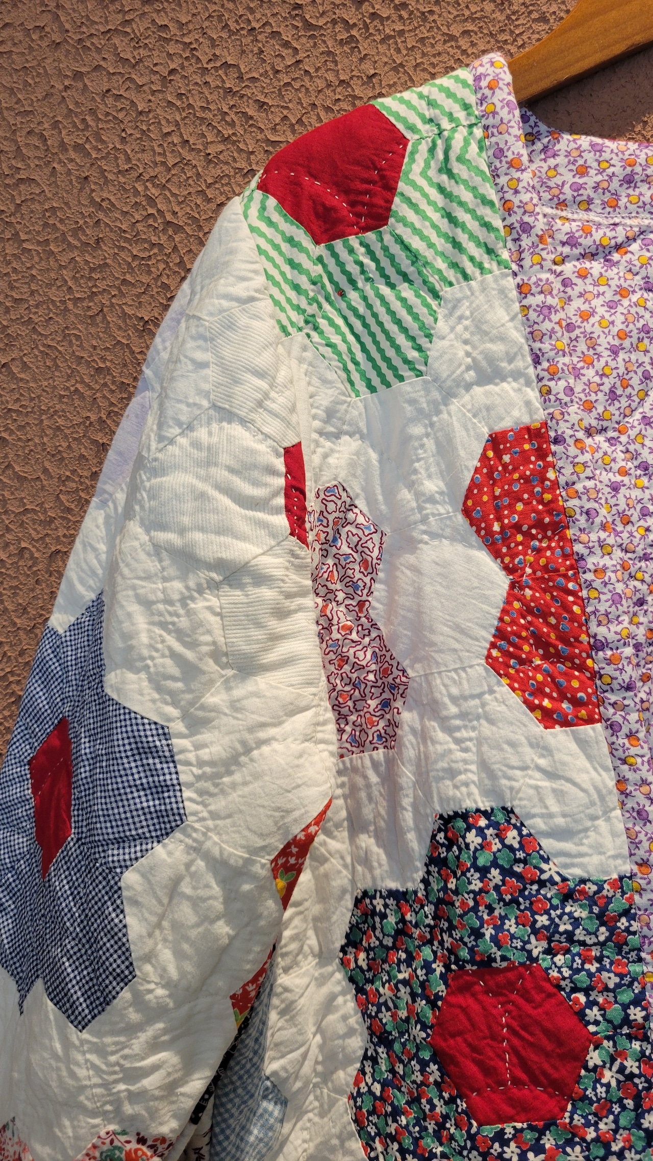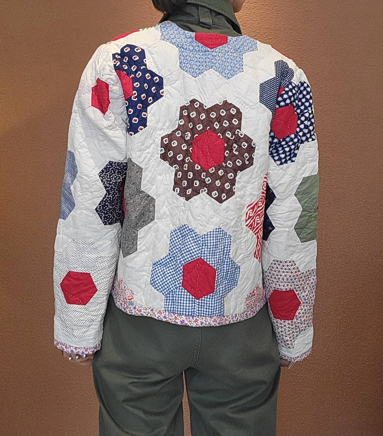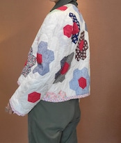 ヴィンテージのパッチワークキルト生地を使用したリメイクジャケット。素材は2枚合わせのコットンです。厚地ではないため着膨れせずすっきりコンパクトなシルエット。春先まで長く着ていただけます。ヘキサゴンモチーフを構成する布片ひとつひとつのプリントが可愛いのもヴィンテージならではです。