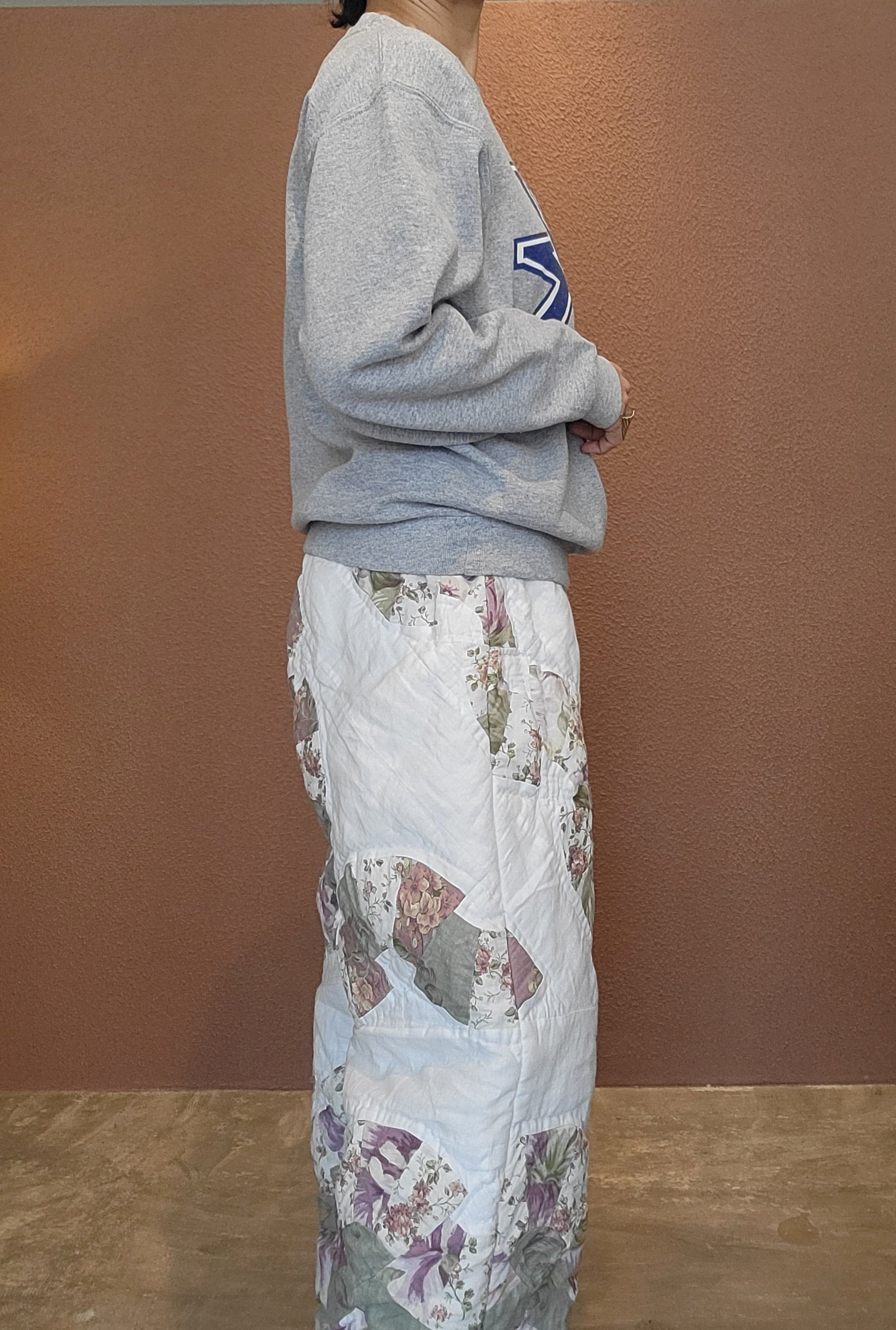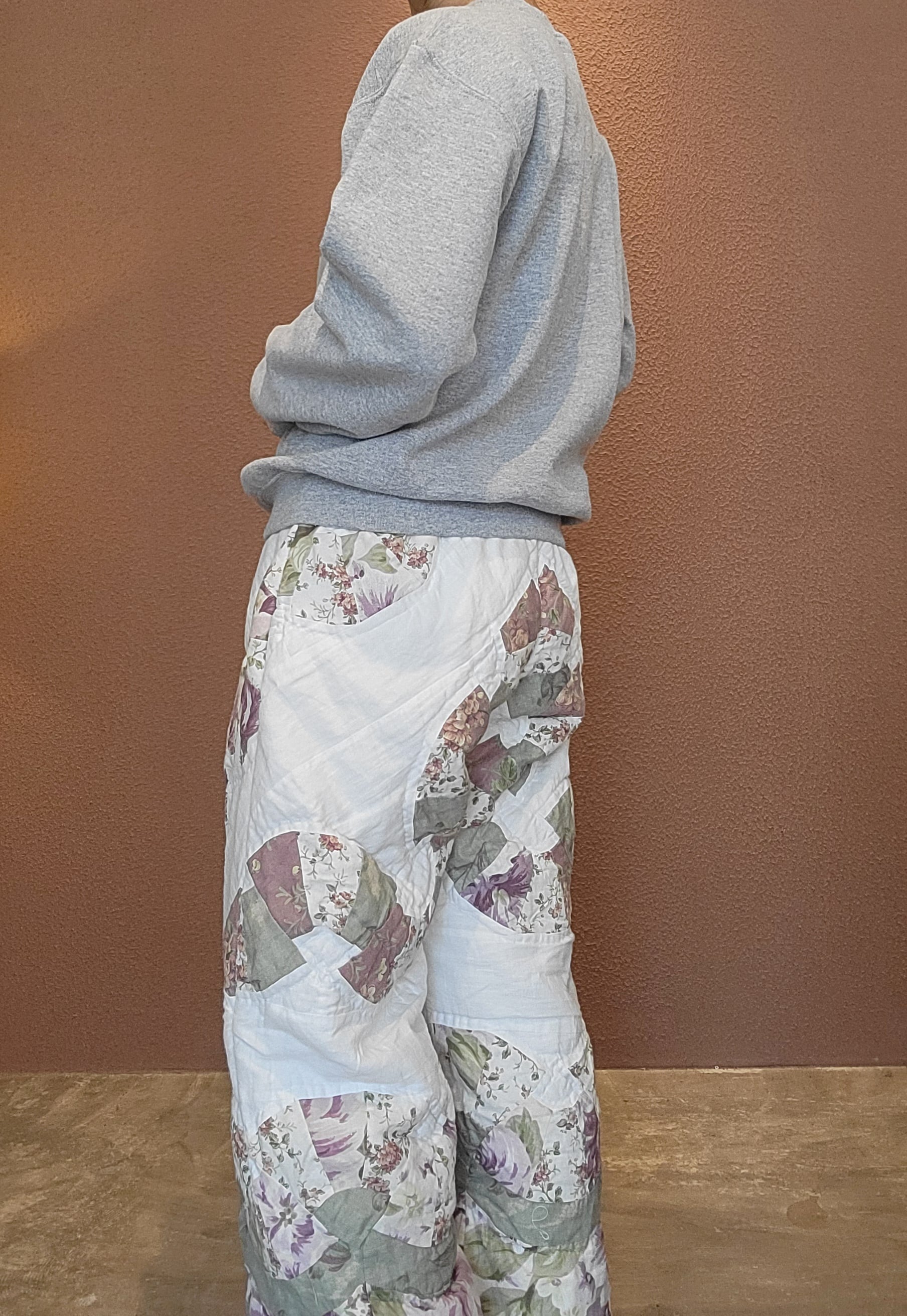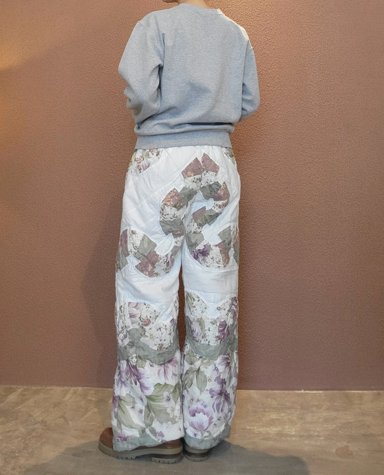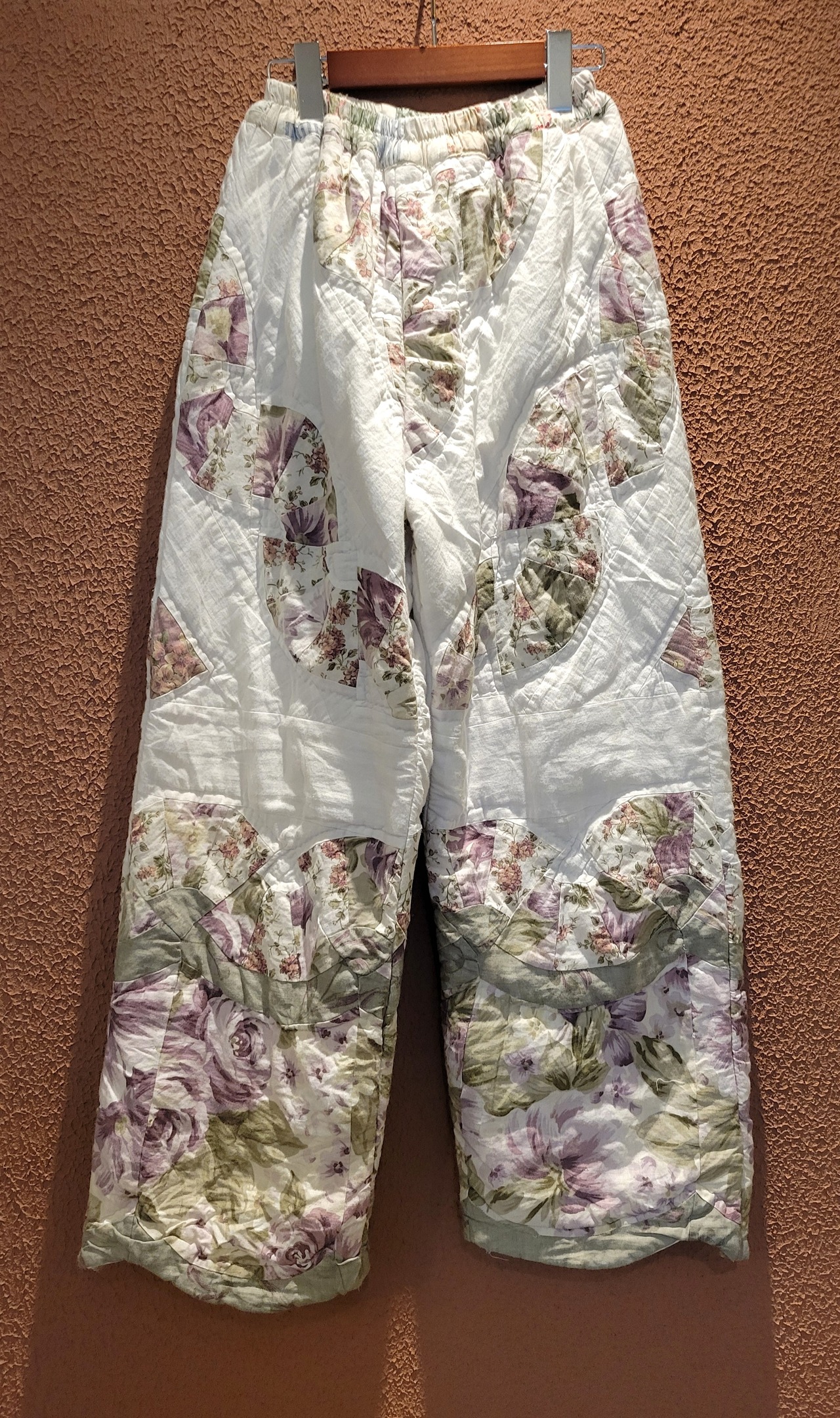 ヴィンテージのパッチワークキルト生地を使用したリメイクイージーパンツ。素材は2枚合わせの中綿入りコットンで軽量です。ウエストゴム仕様、ポケット無し。シックなカラーが大人っぽい1本です。