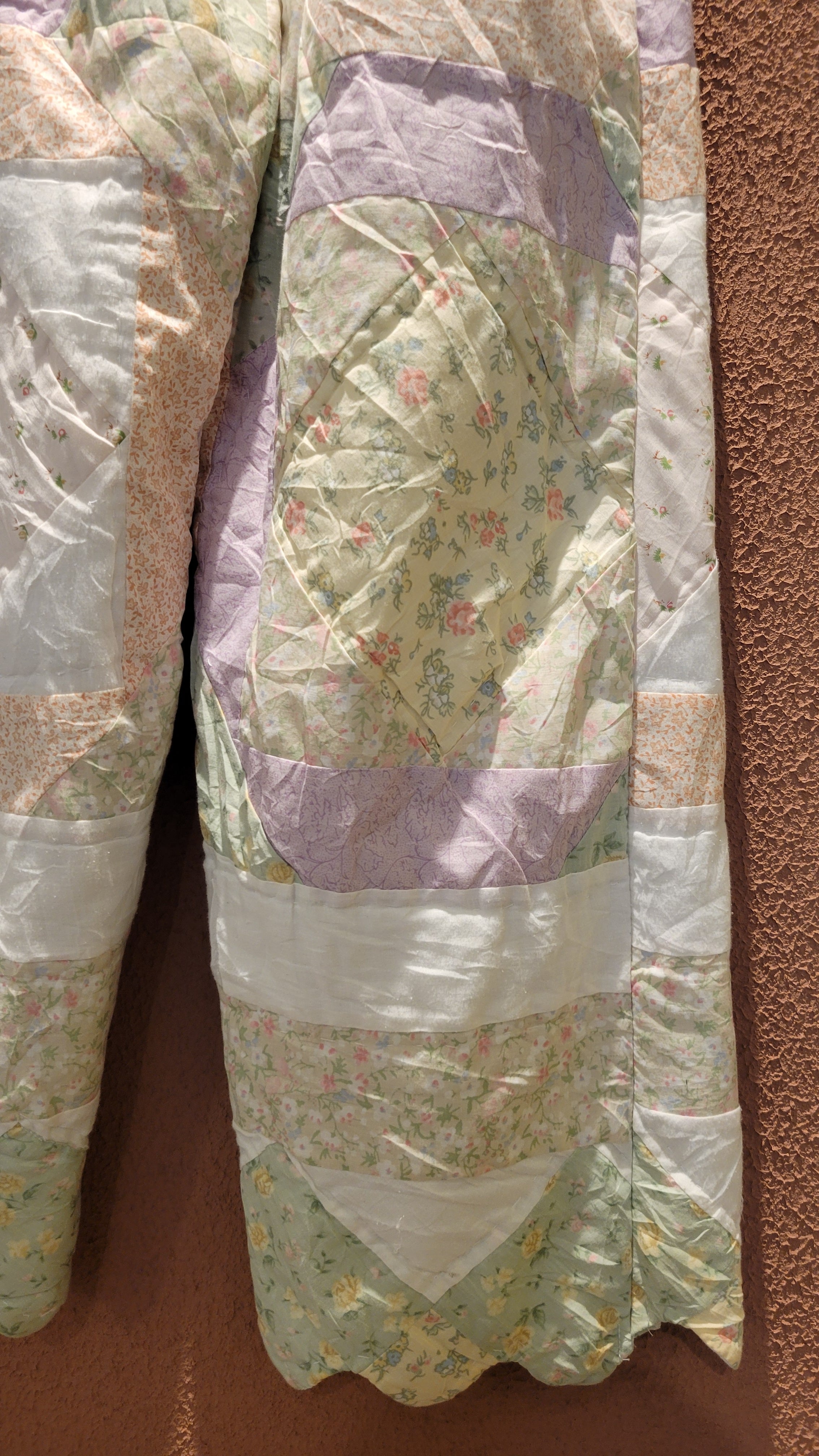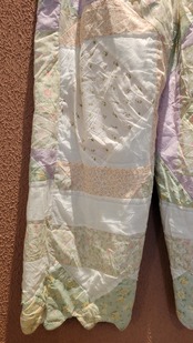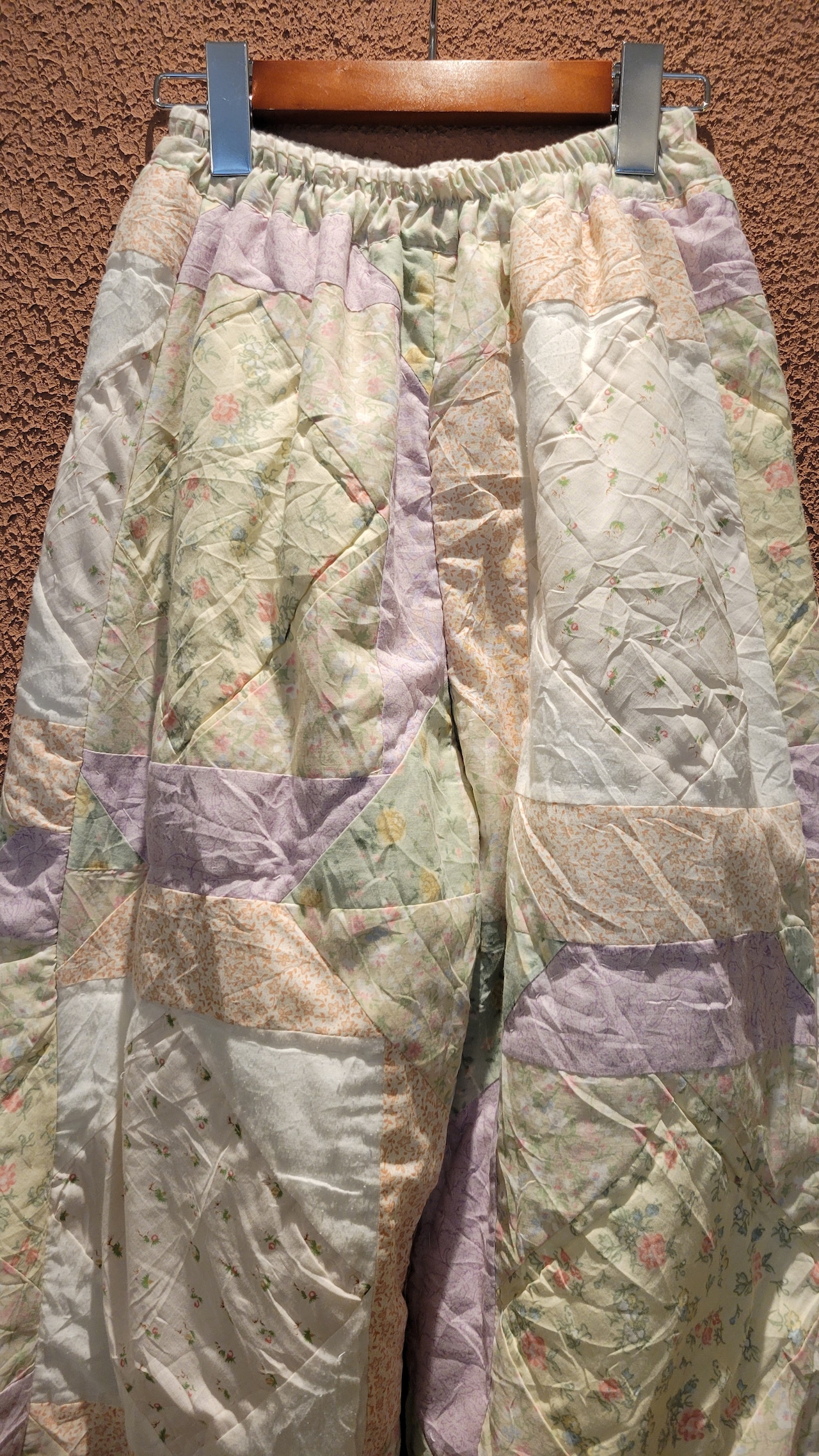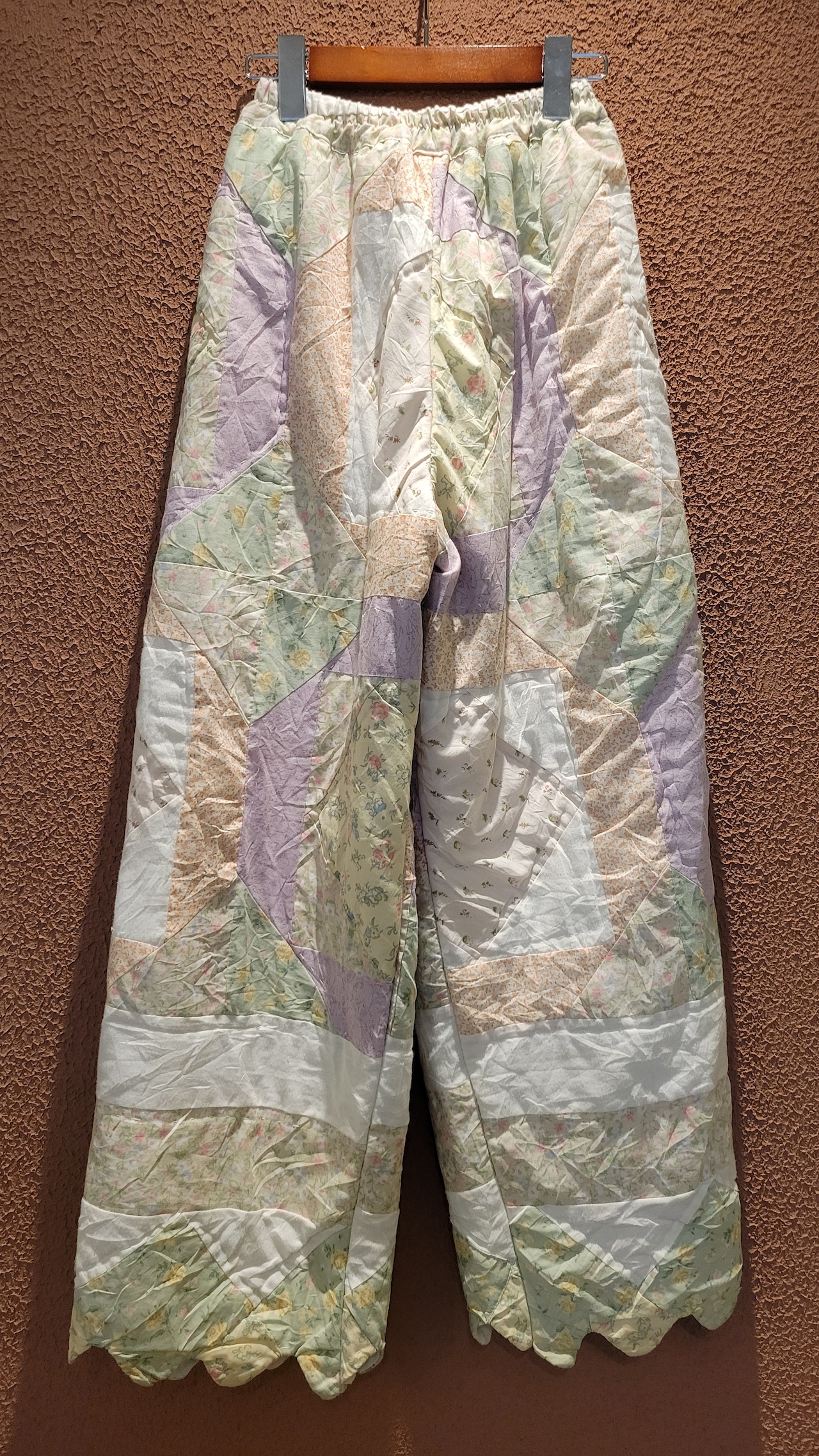ヴィンテージのパッチワークキルト生地を使用したリメイクイージーパンツ。素材は2枚合わせの中綿入りコットン、ウエストゴム仕様、ポケット無しです。着脱しやすく軽量で温かい、普段使いにぴったりの1本です。