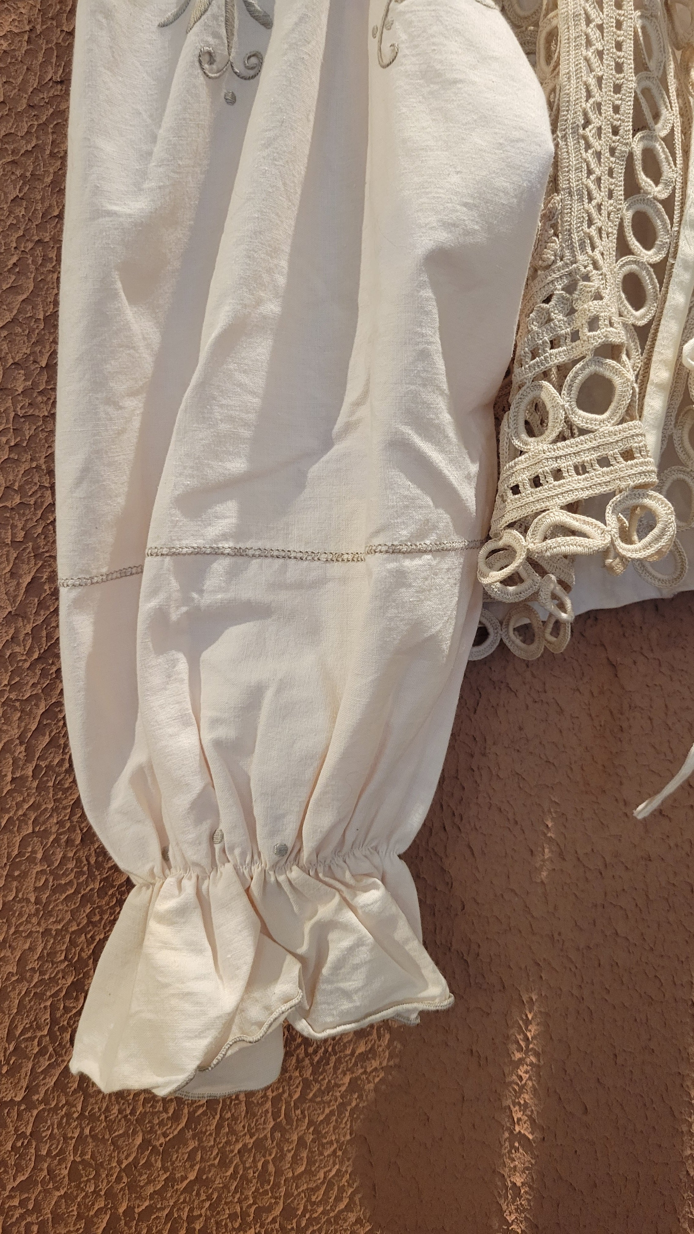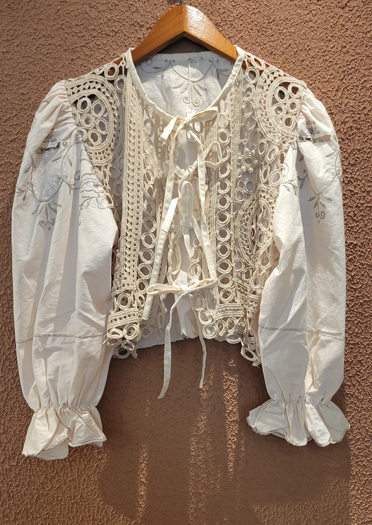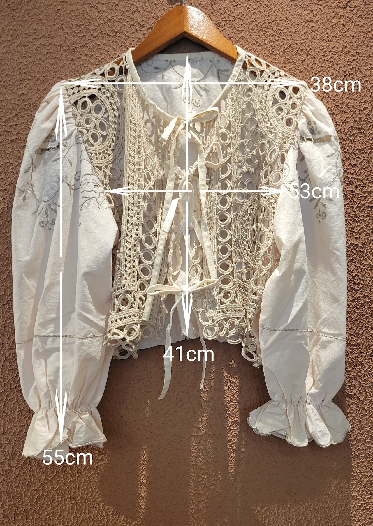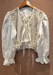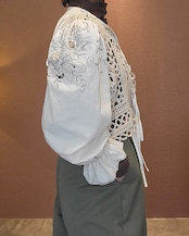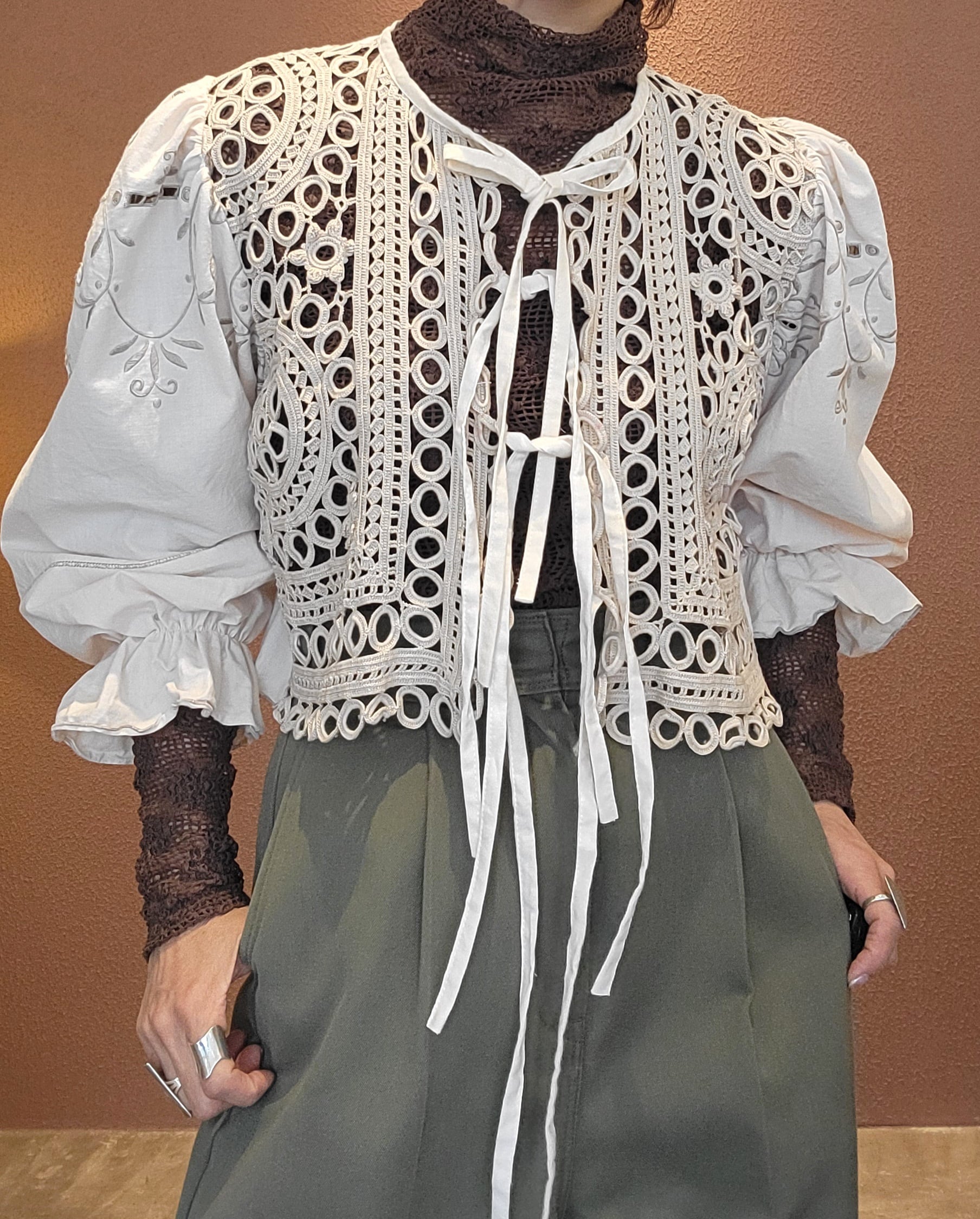 ヴィンテージレースを使用したリメイクトップス。素材不明ですがコットンのようです。フロントリボン、袖口ゴム仕様。コンパクトなシルエットでボリュームのあるボトムやハイウエストボトムとの相性ぴったりです。