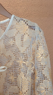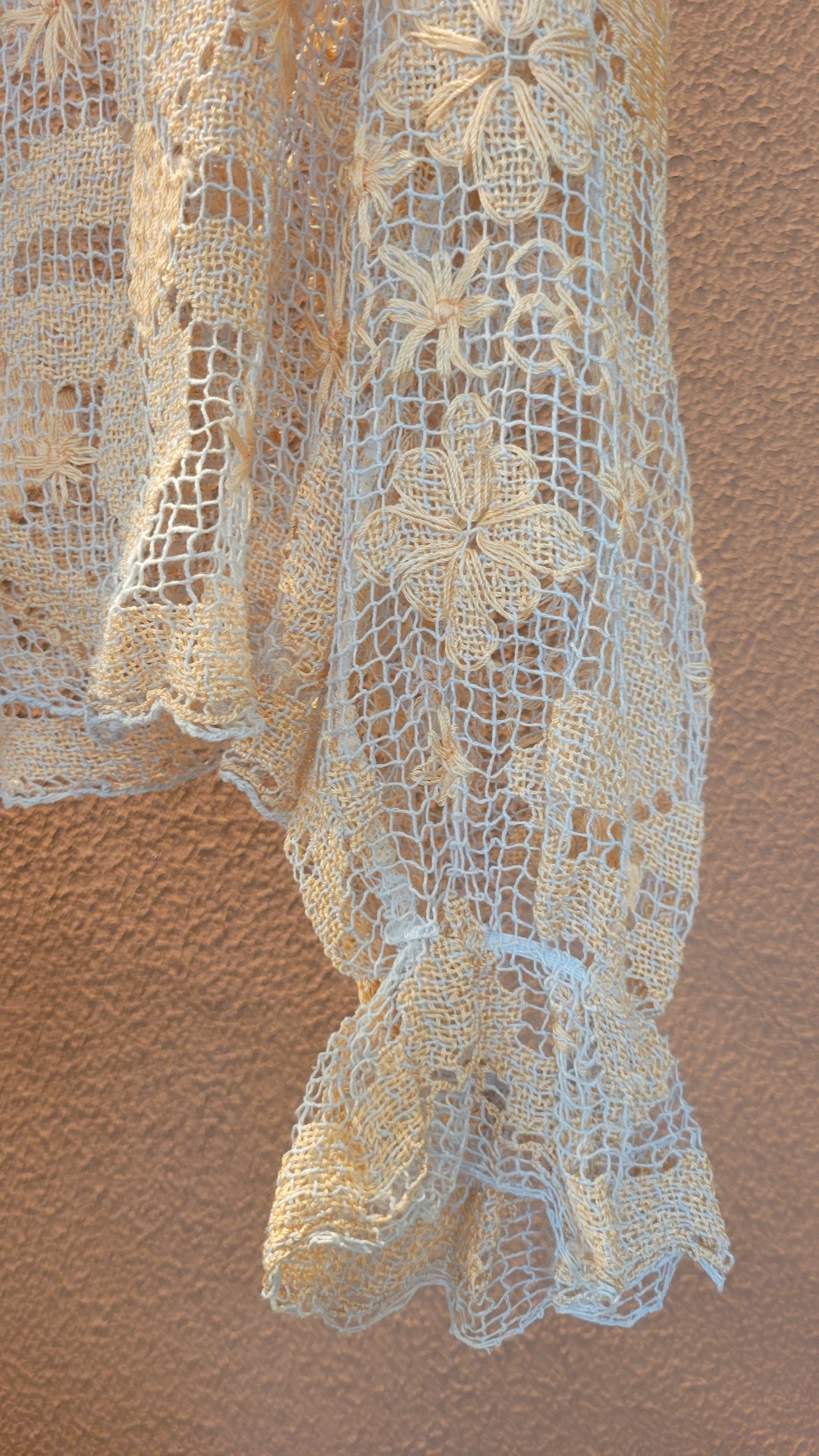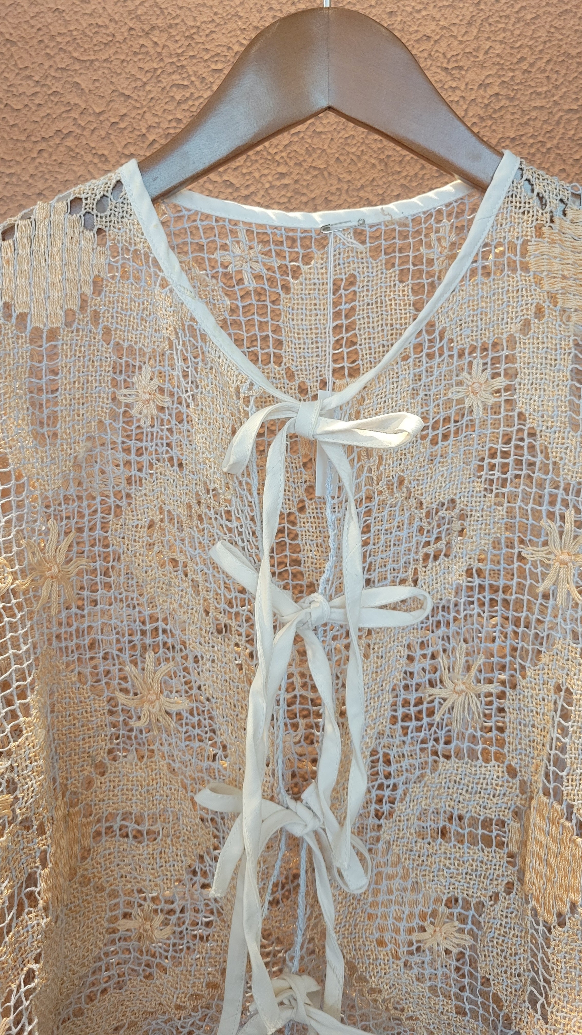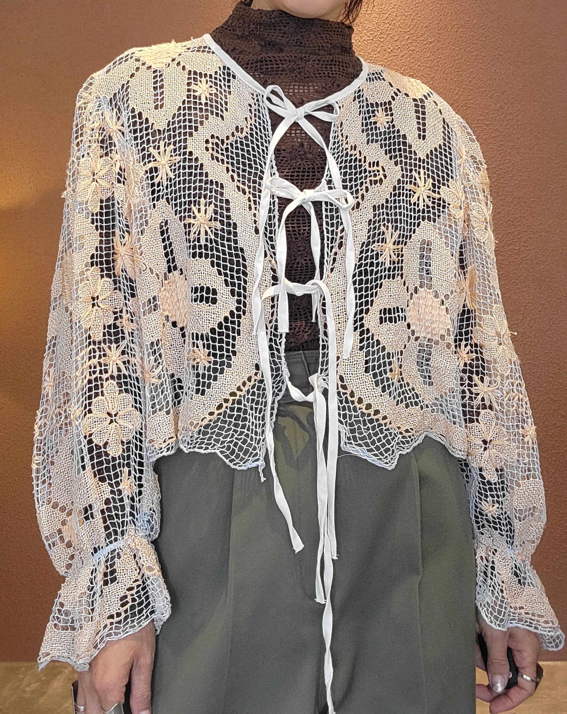 ヴィンテージのカラーレースを使用したリメイクトップス。素材不明ですがコットンのようです。フロントリボン、袖口ゴム仕様。コンパクトなシルエットでボリュームのあるボトムやハイウエストボトムとの相性ぴったりです。