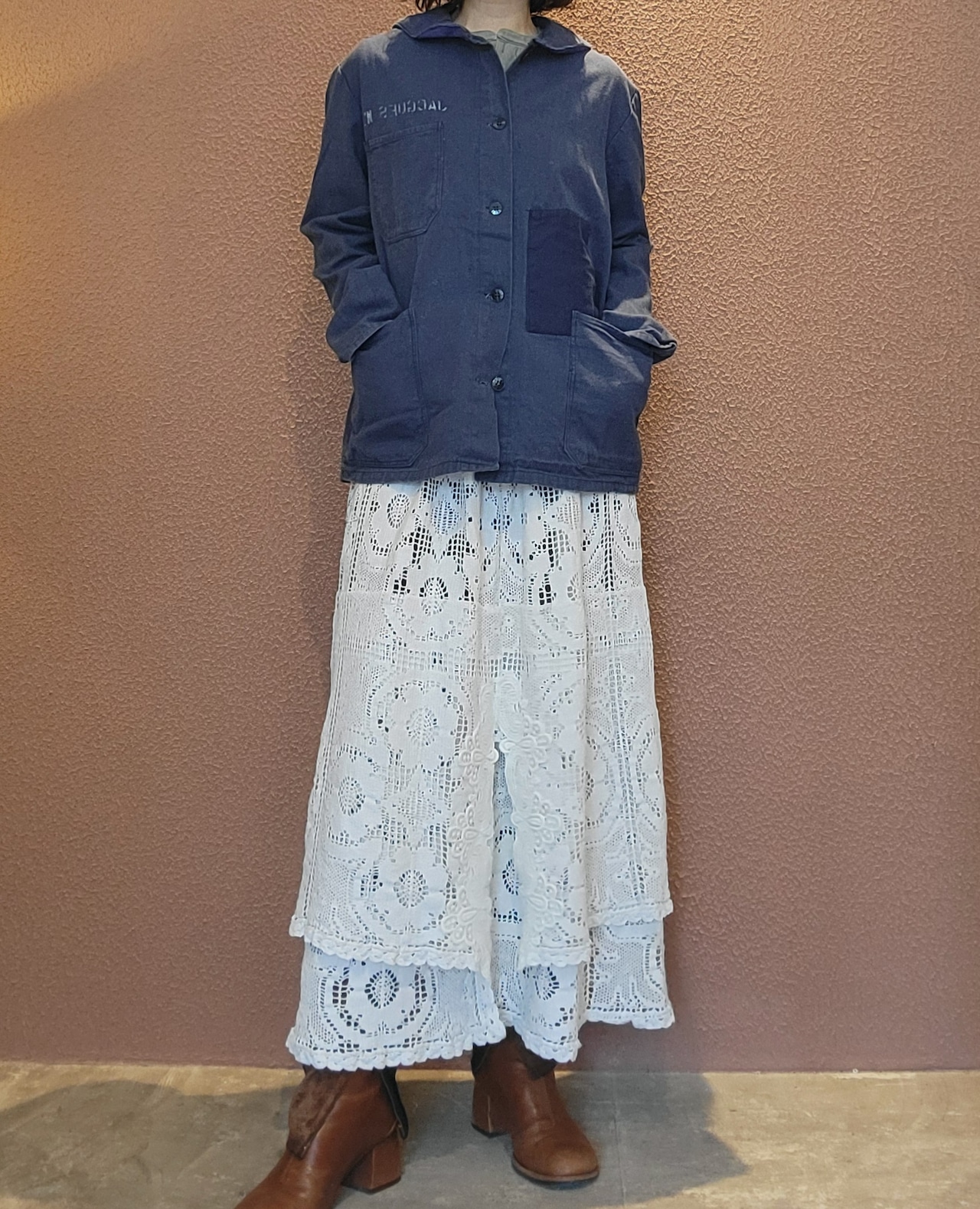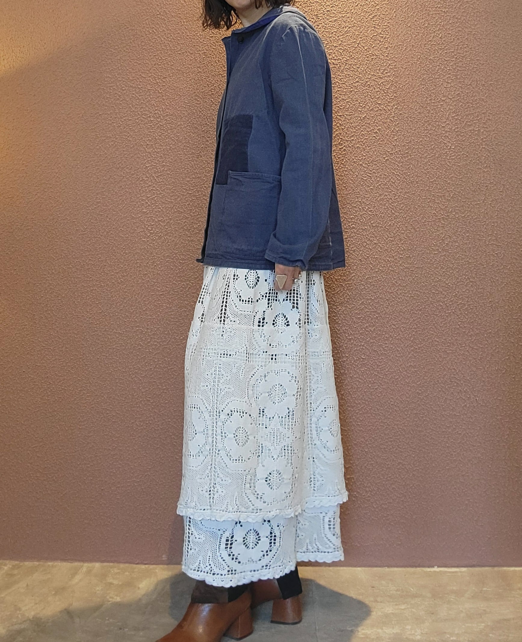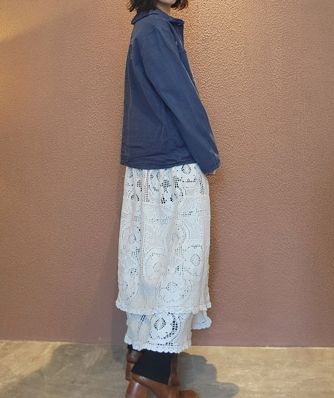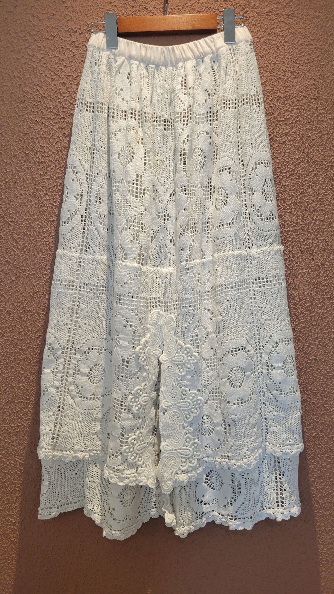 ヴィンテージレースを使用したリメイクスカート。素材はコットンのようです。ウエストゴム、フロント中央にスリット入りです。スカートを2枚重ねたようなレイヤードデザインになっています。デニムやブーツとの相性も良く、カジュアルにもきれいめにもスタイリングできます。