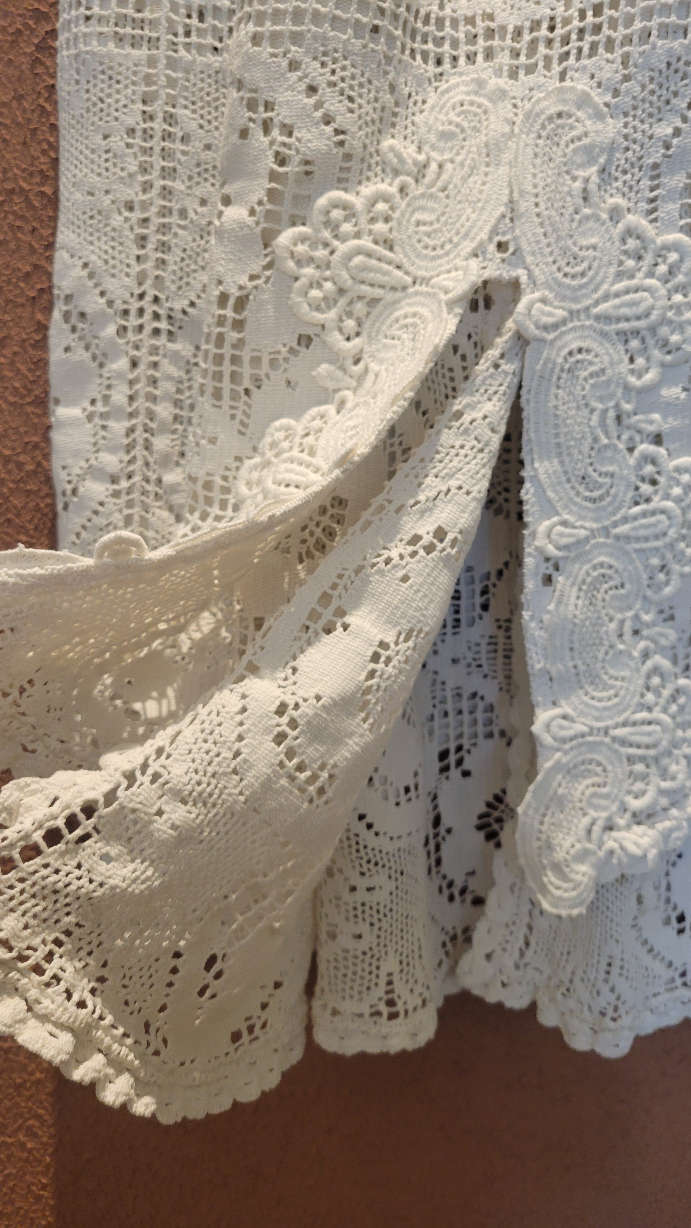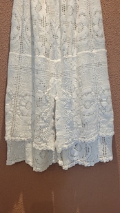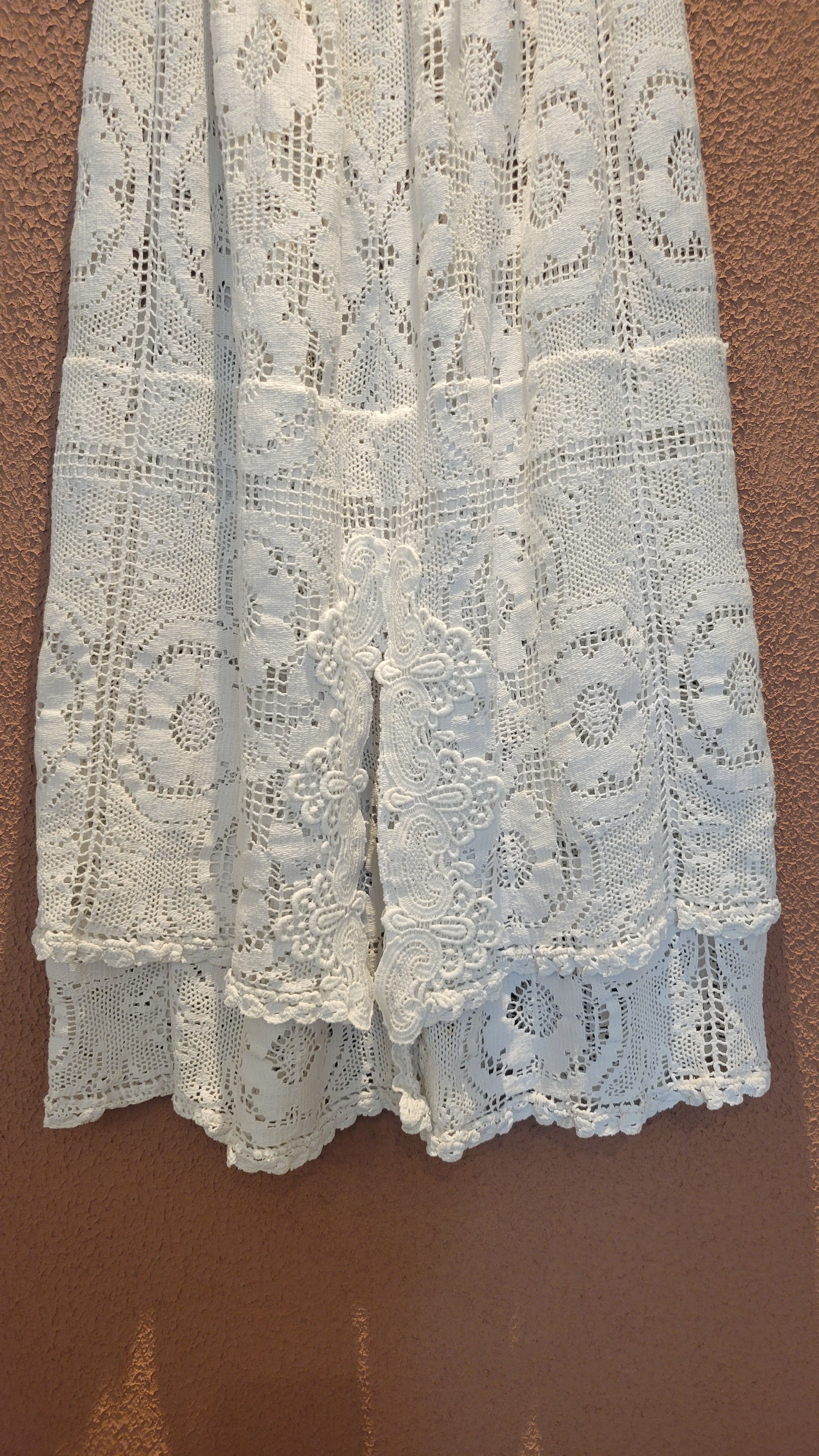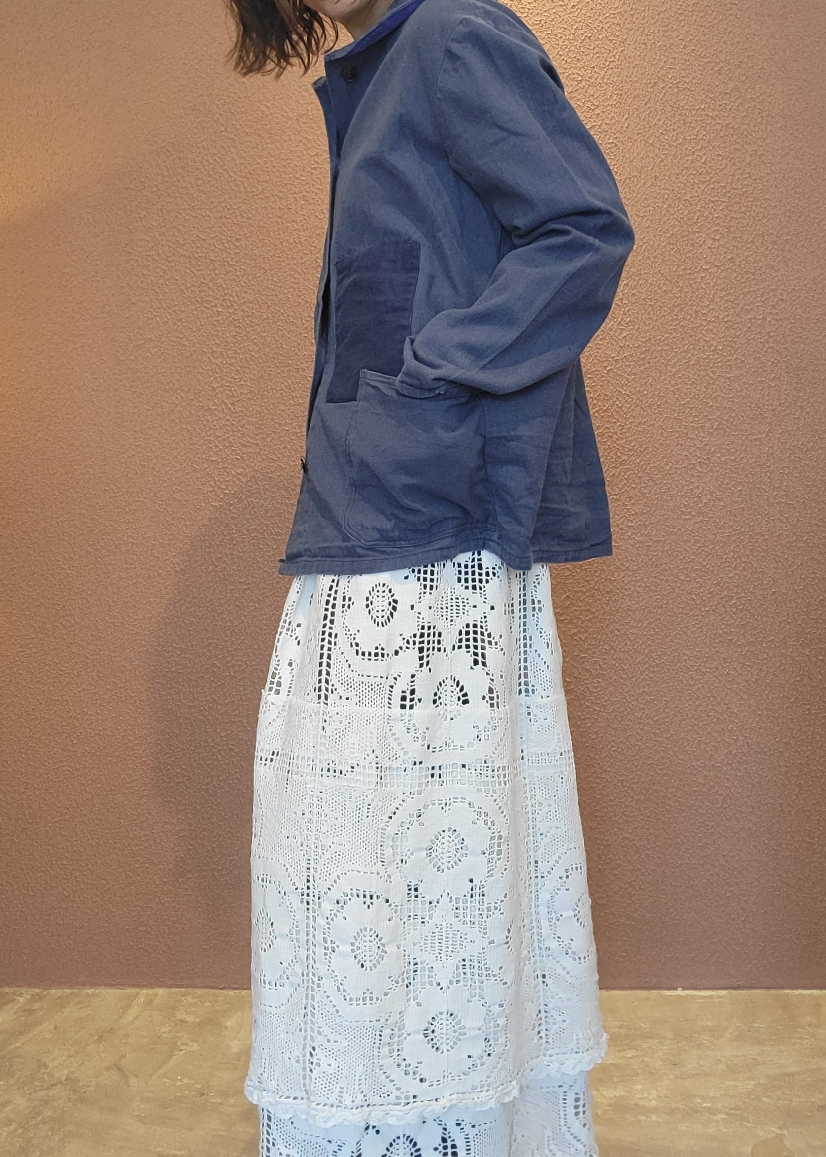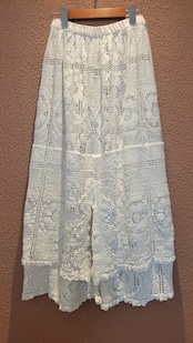 ヴィンテージレースを使用したリメイクスカート。素材はコットンのようです。ウエストゴム、フロント中央にスリット入りです。スカートを2枚重ねたようなレイヤードデザインになっています。デニムやブーツとの相性も良く、カジュアルにもきれいめにもスタイリングできます。