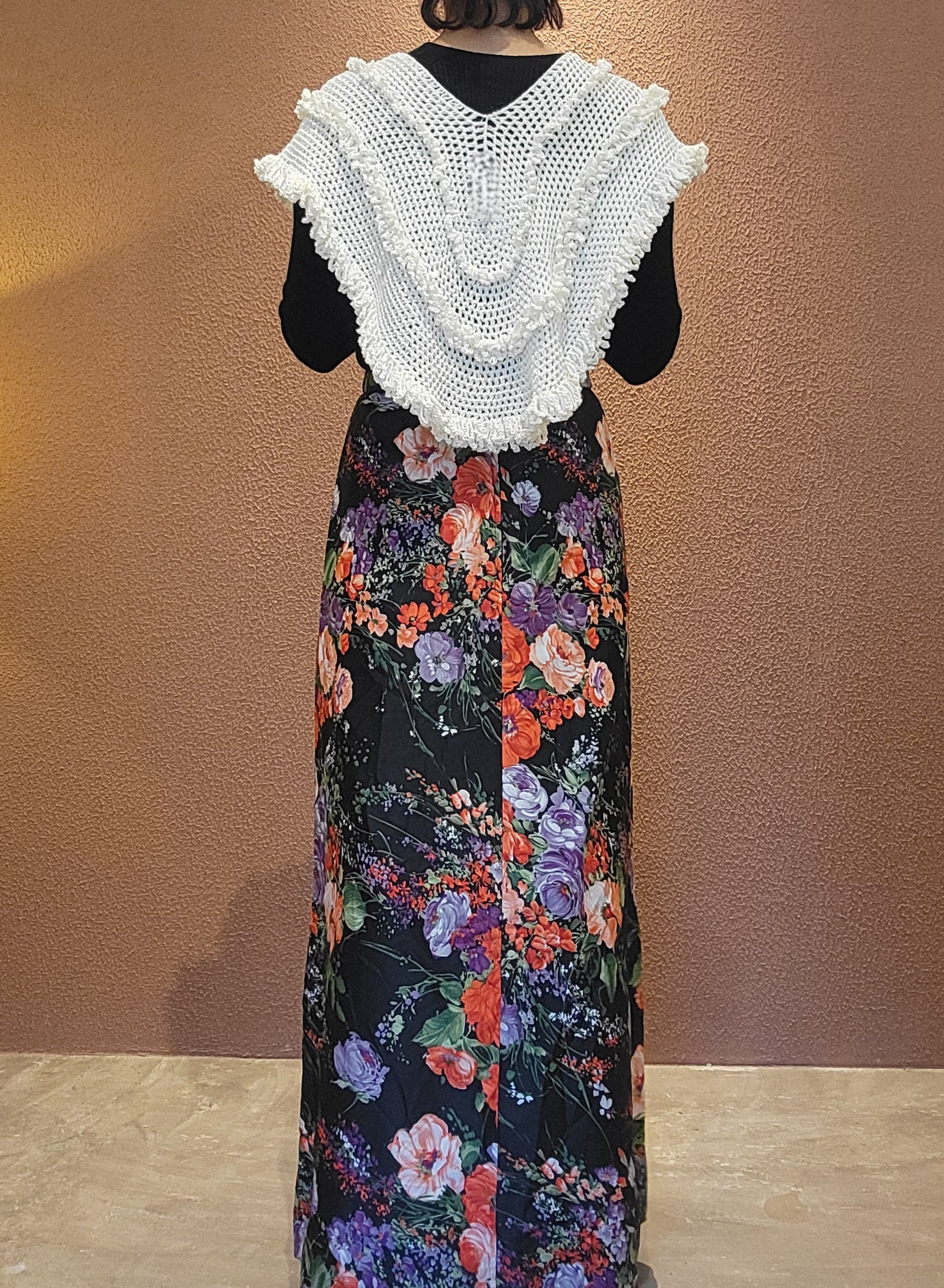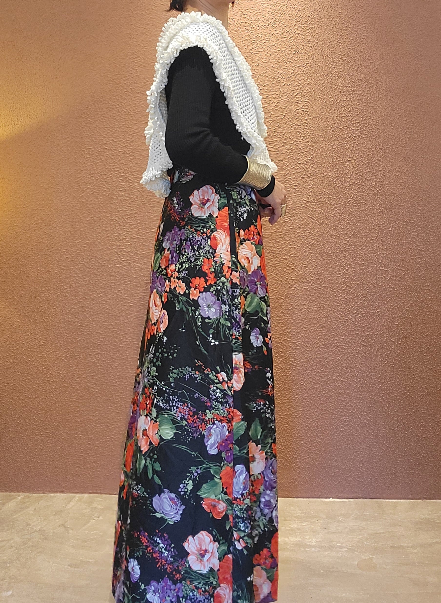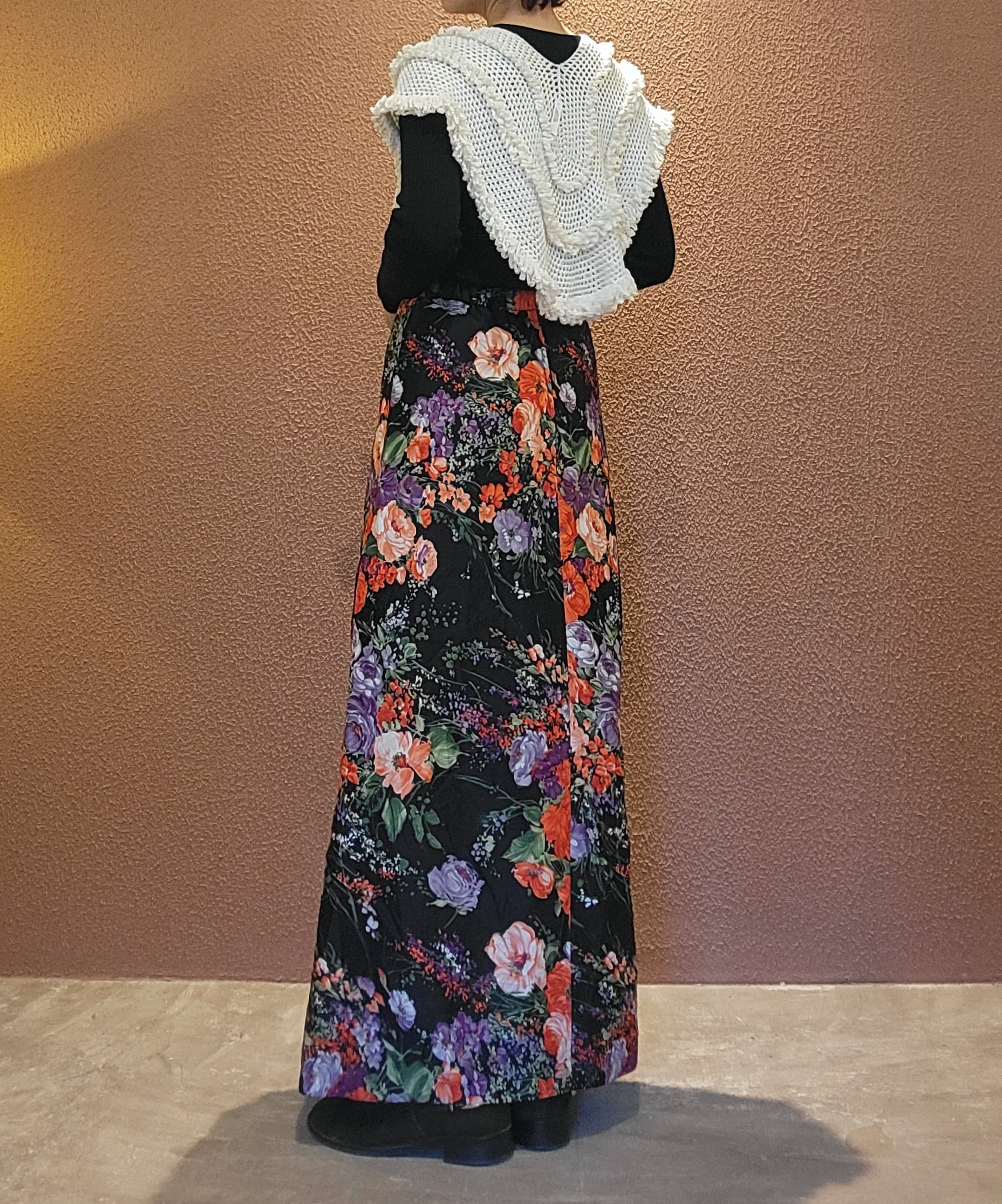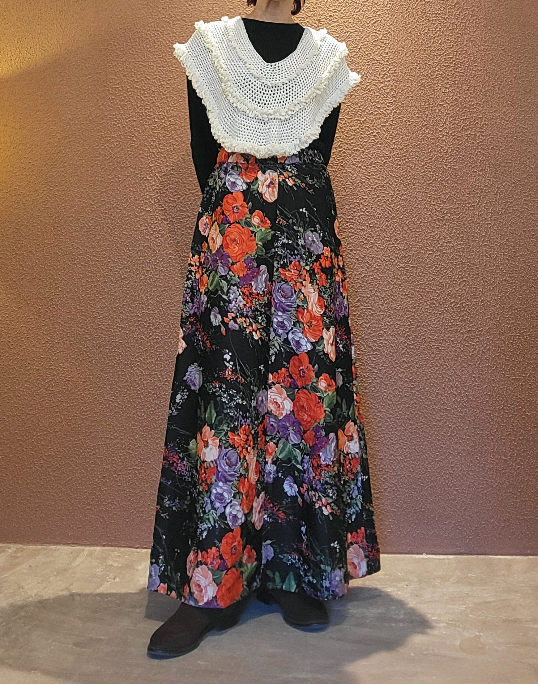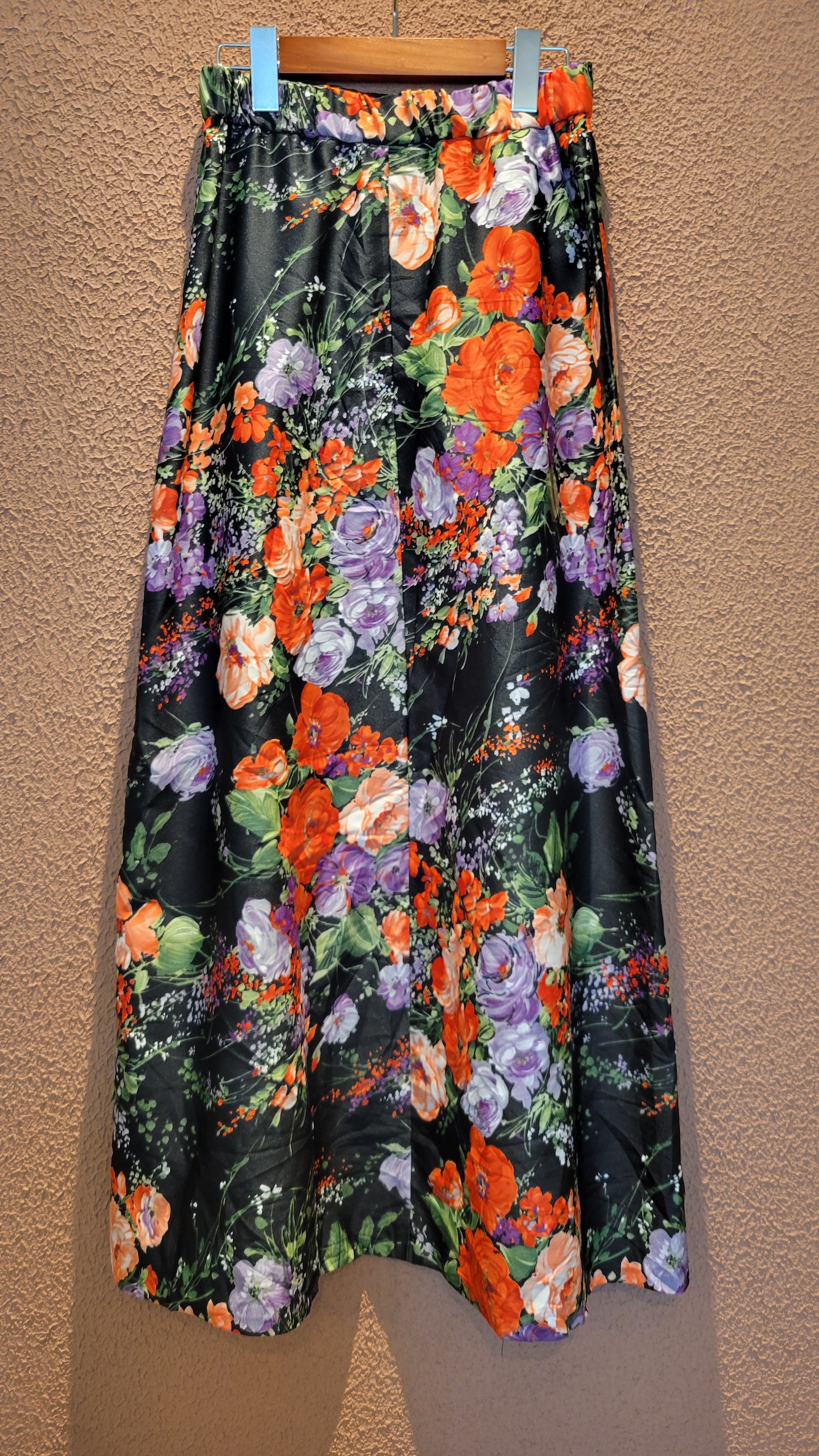 70sフレアマキシスカート。ウエストゴム、後ろにホックとジッパー付きです。素材はポリエステルのようです。透け感はありません。広がりすぎないフレアシルエットで大人っぽく着られます。スウェット+スニーカーでカジュアルなスタイリングもおすすめです。