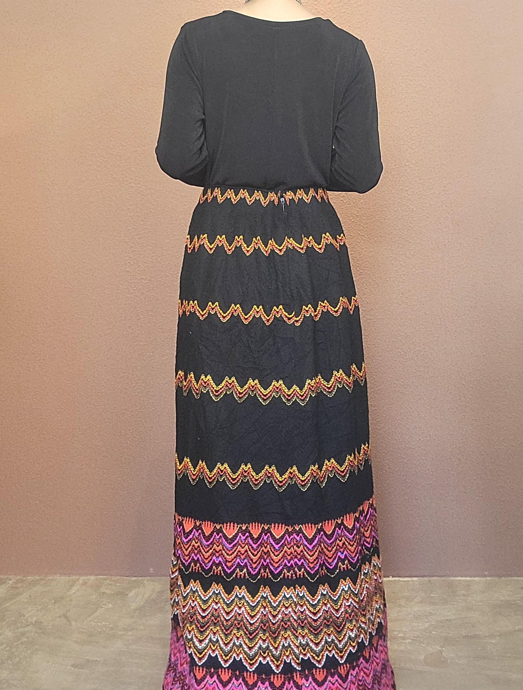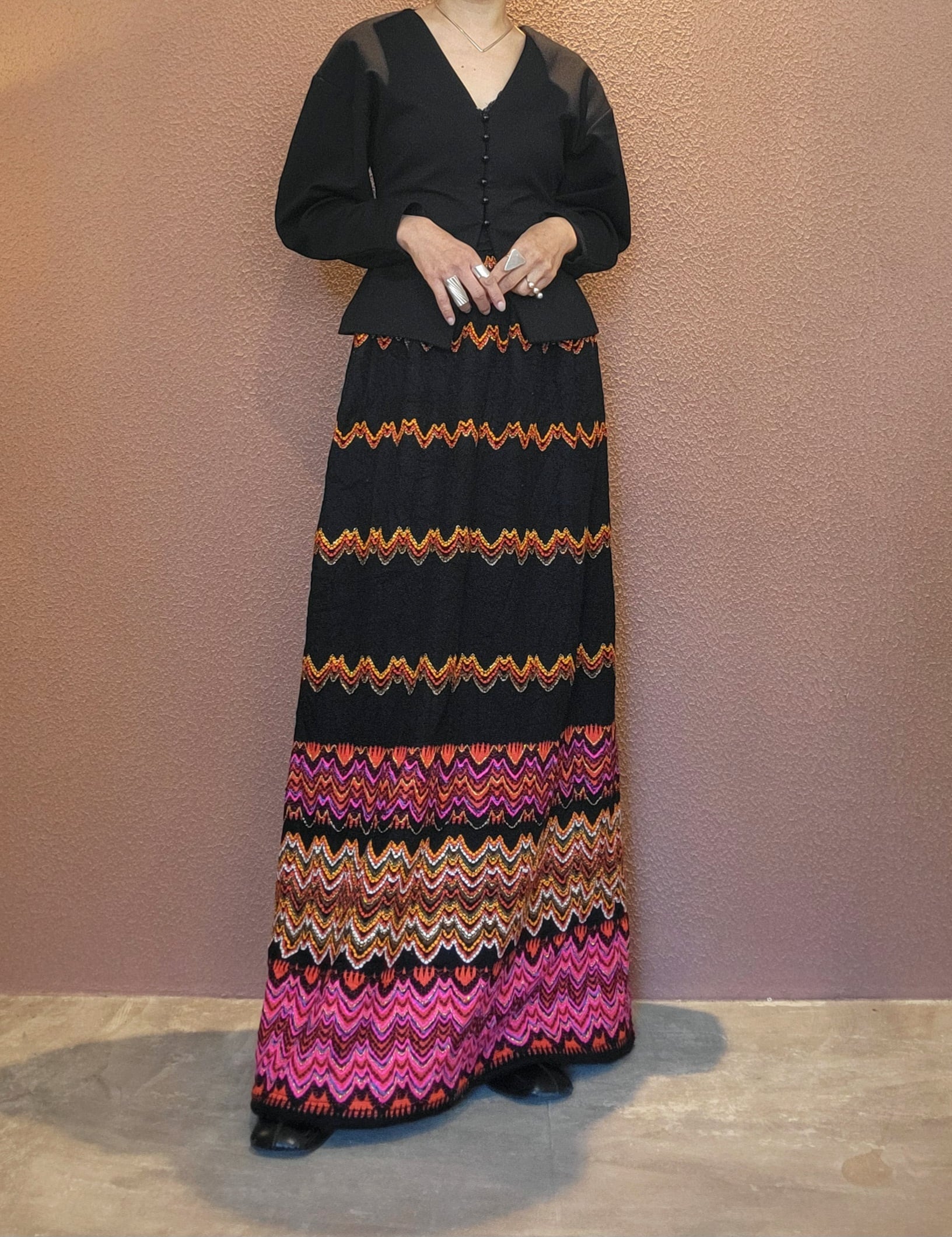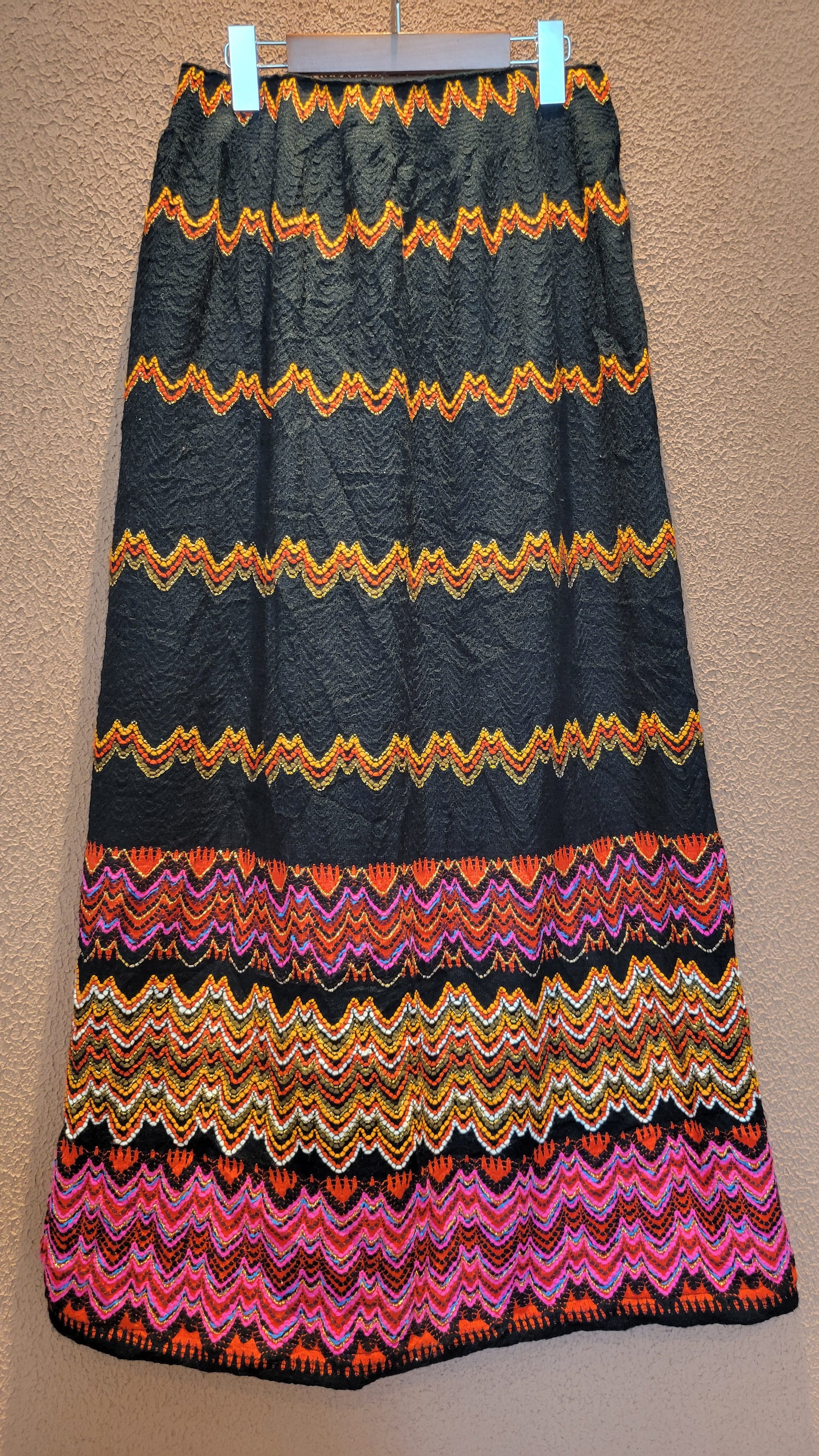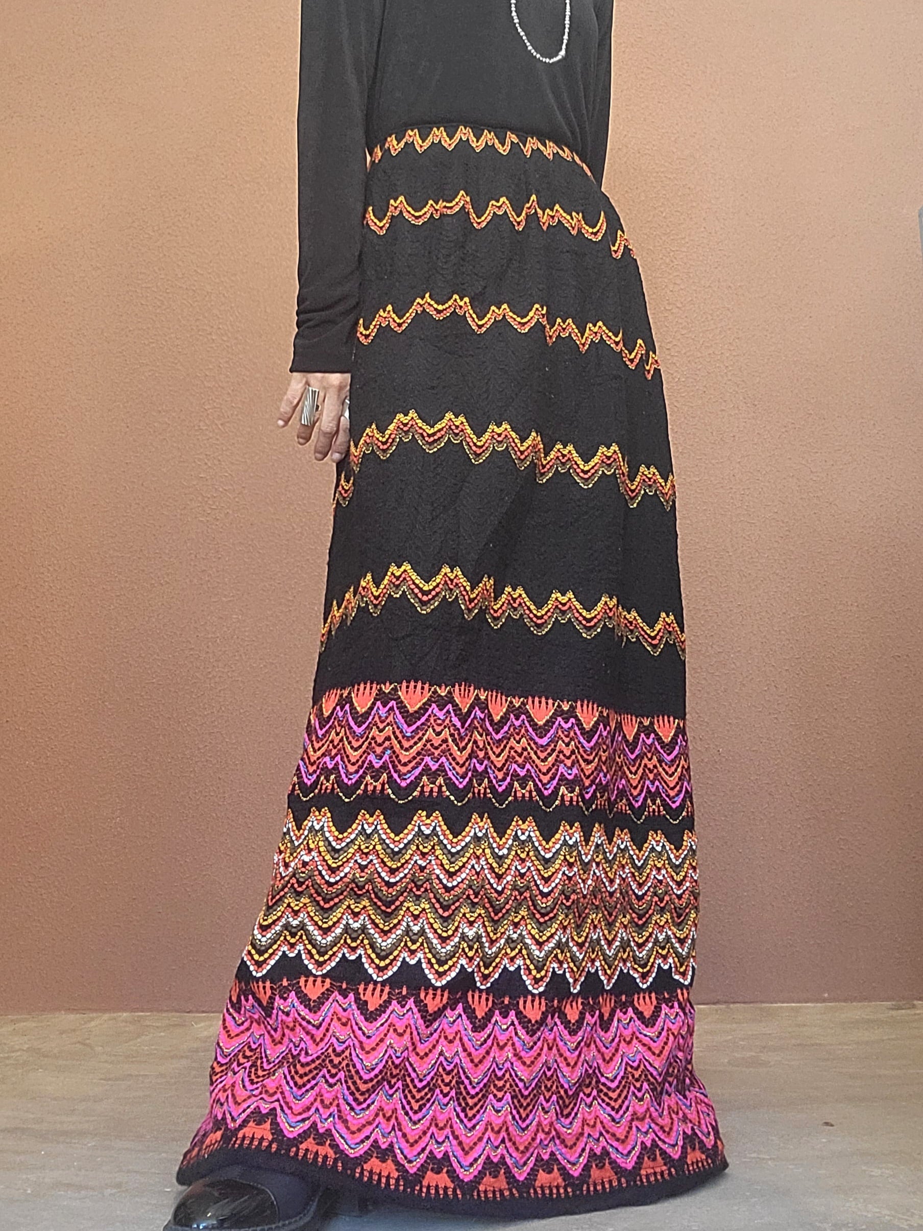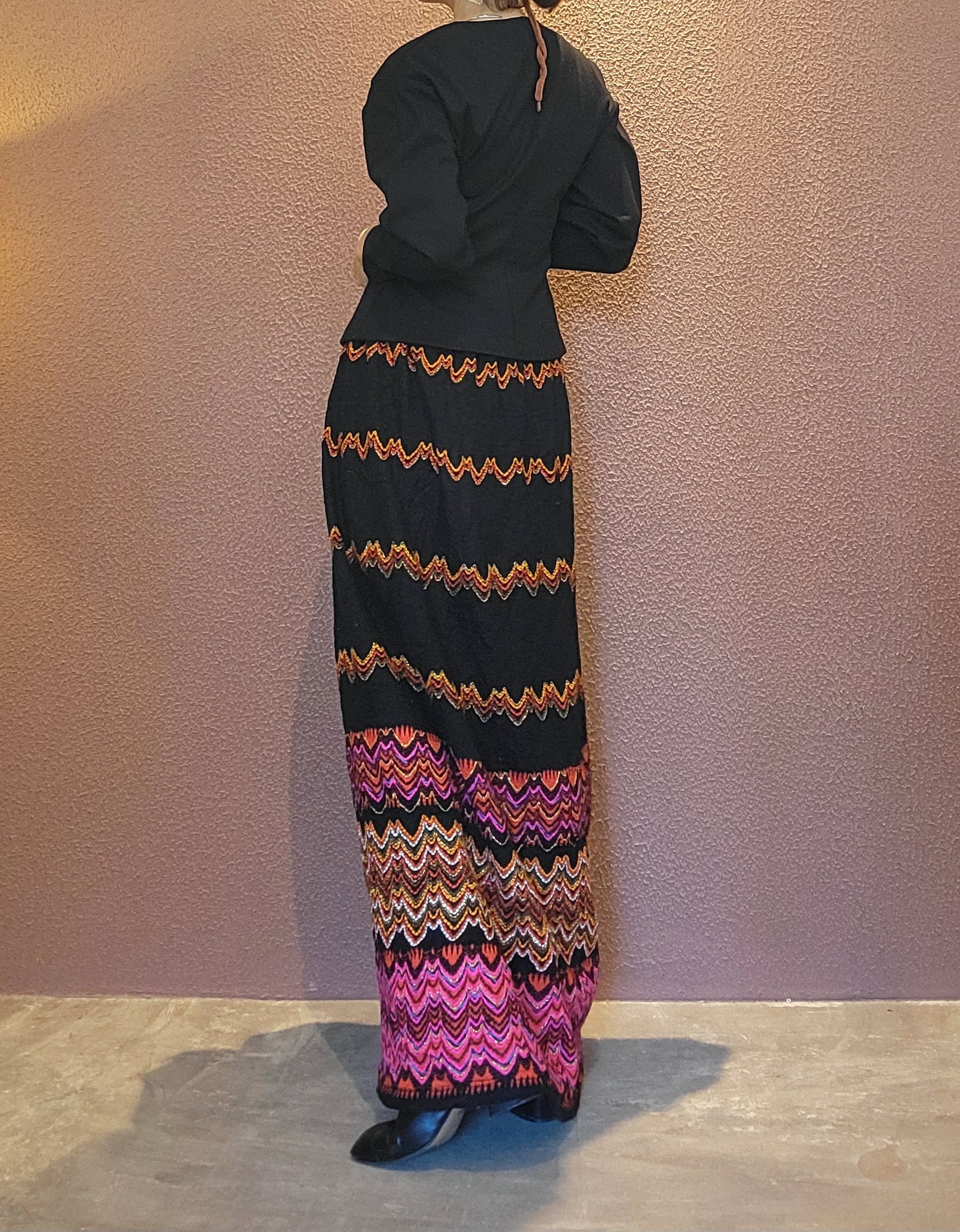 70sマキシスカート。素材不明ですがウールのような秋冬用の素材です。裏地付き。ウエストゴム、左サイドにホックトジッパーが付いています。すっきりしたAラインシルエットで縦ラインが際立ちスタイルアップ効果があります。
