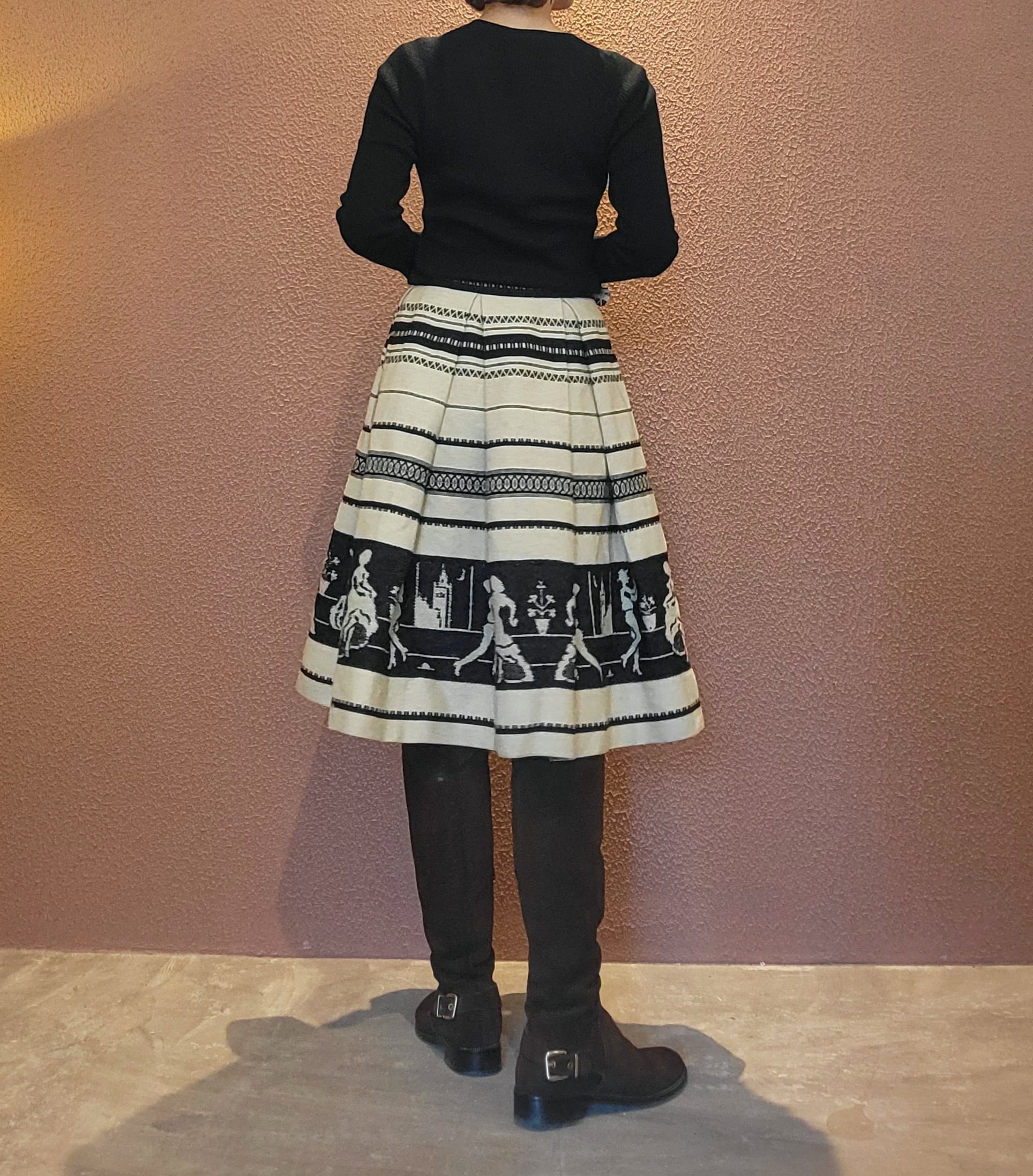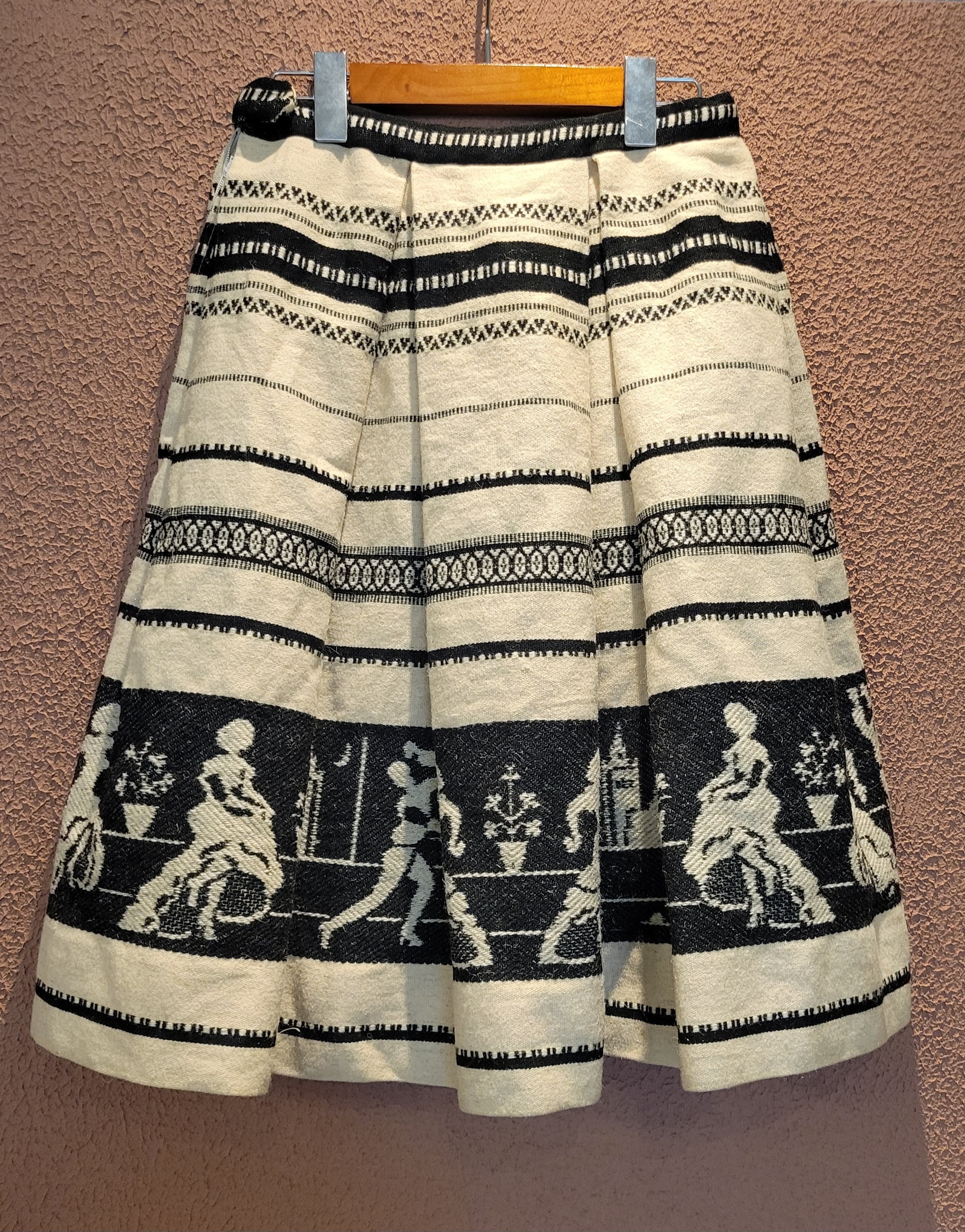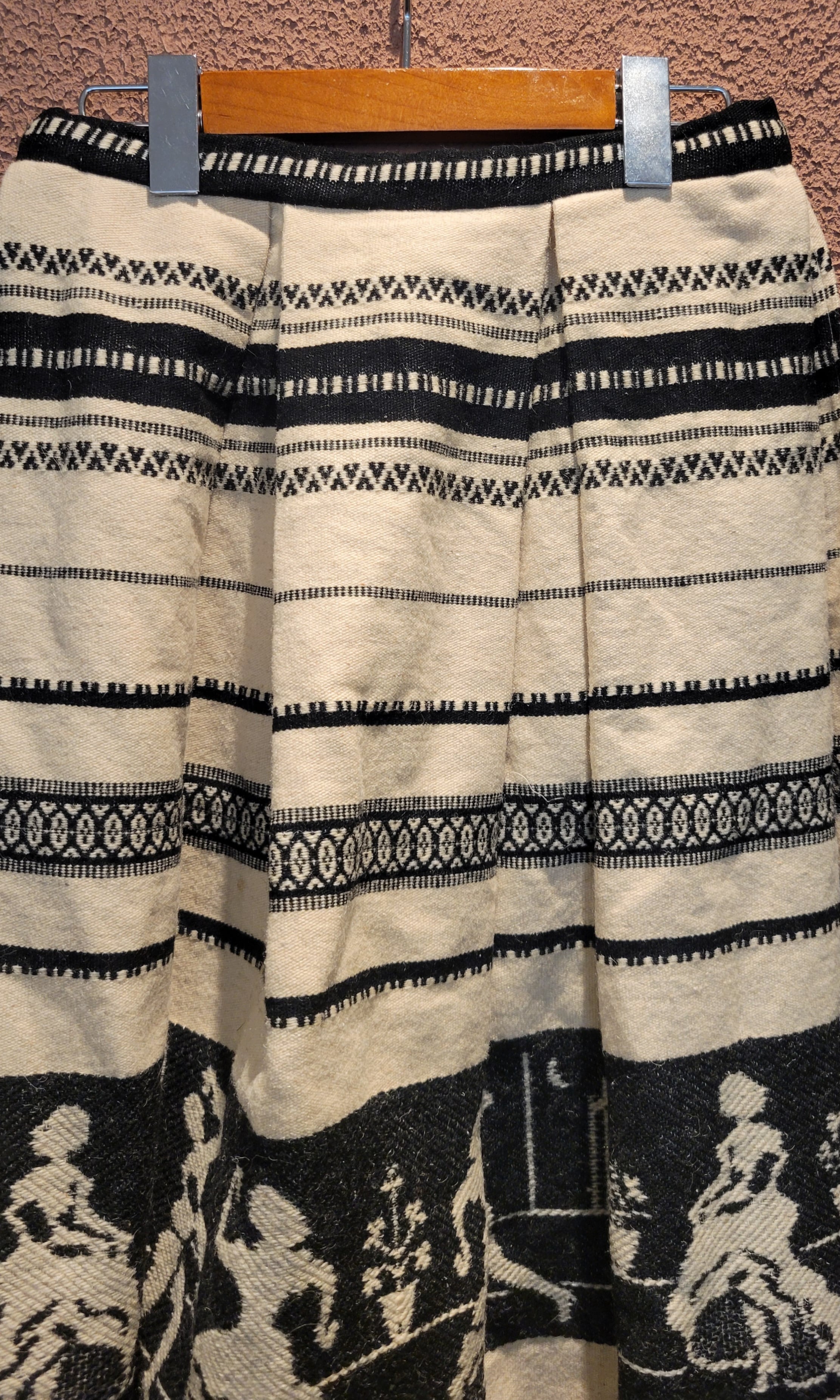 ヴィンテージのボックスプリーツスカート。素材不明ですがウールのようです。厚手の生地のため着用時にプリーツがやや広がります。裾に入った影絵のような柄が素敵です。古いテキスタイルならではの味わいのある1着です。