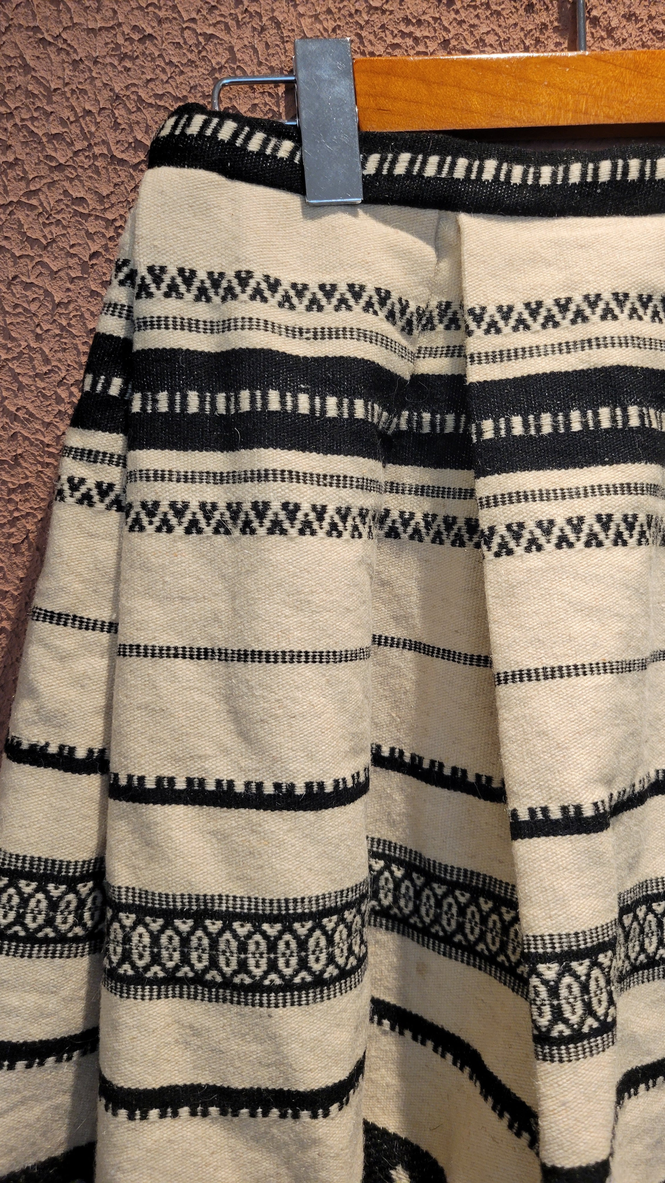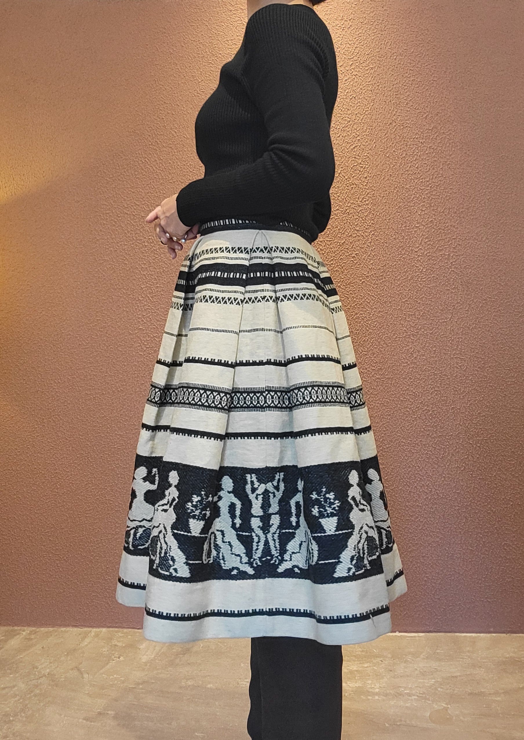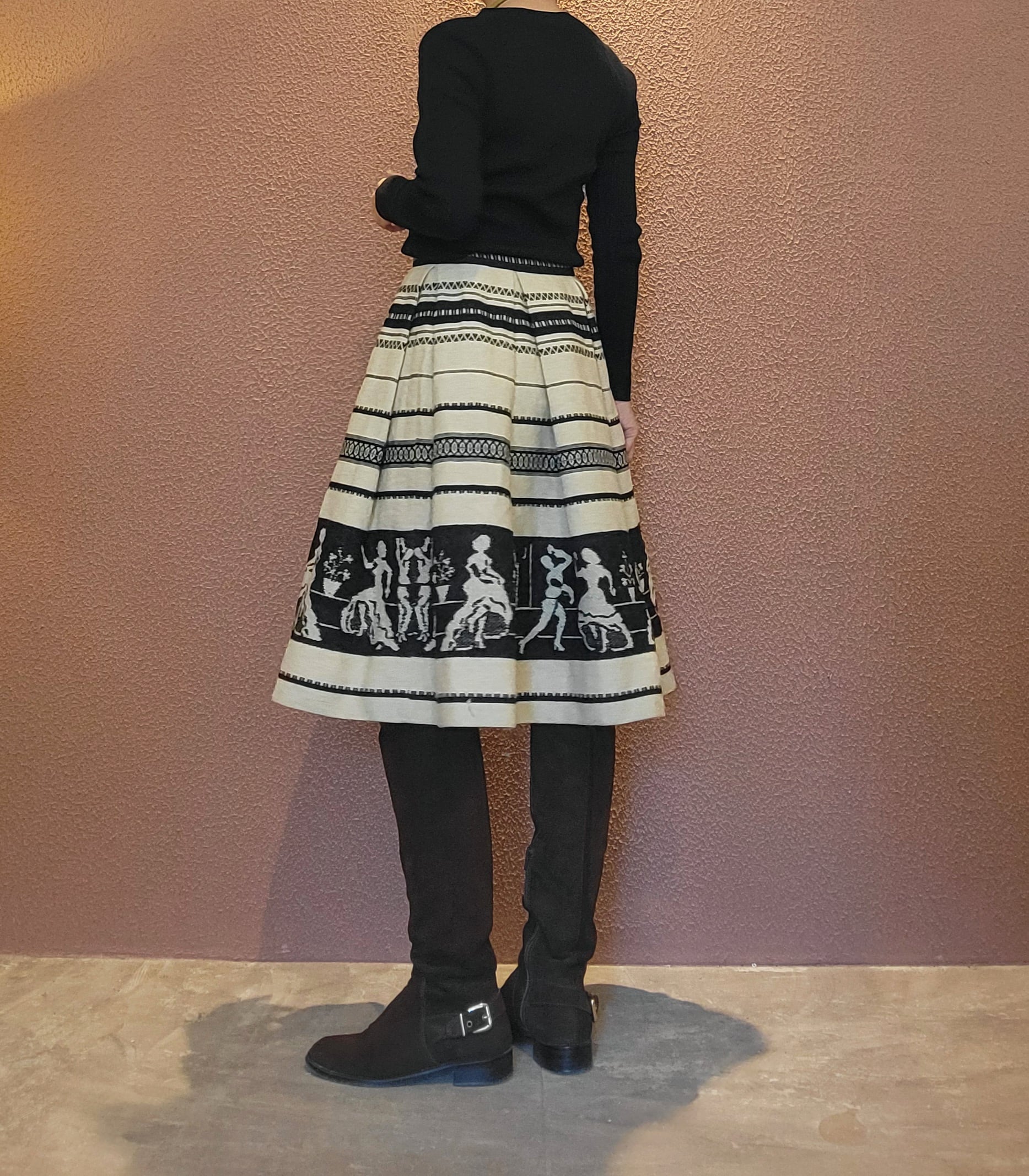 ヴィンテージのボックスプリーツスカート。素材不明ですがウールのようです。厚手の生地のため着用時にプリーツがやや広がります。裾に入った影絵のような柄が素敵です。古いテキスタイルならではの味わいのある1着です。
