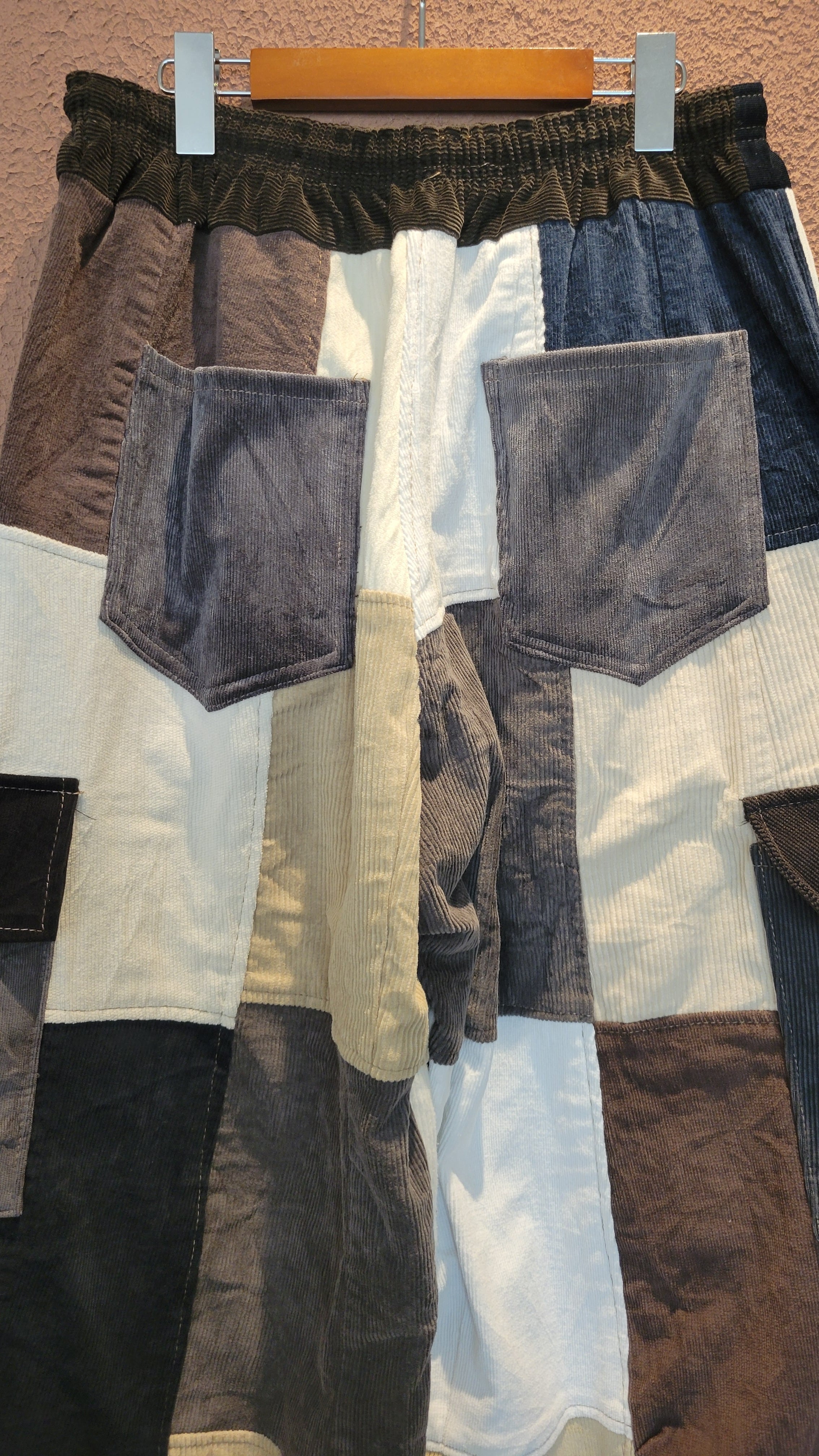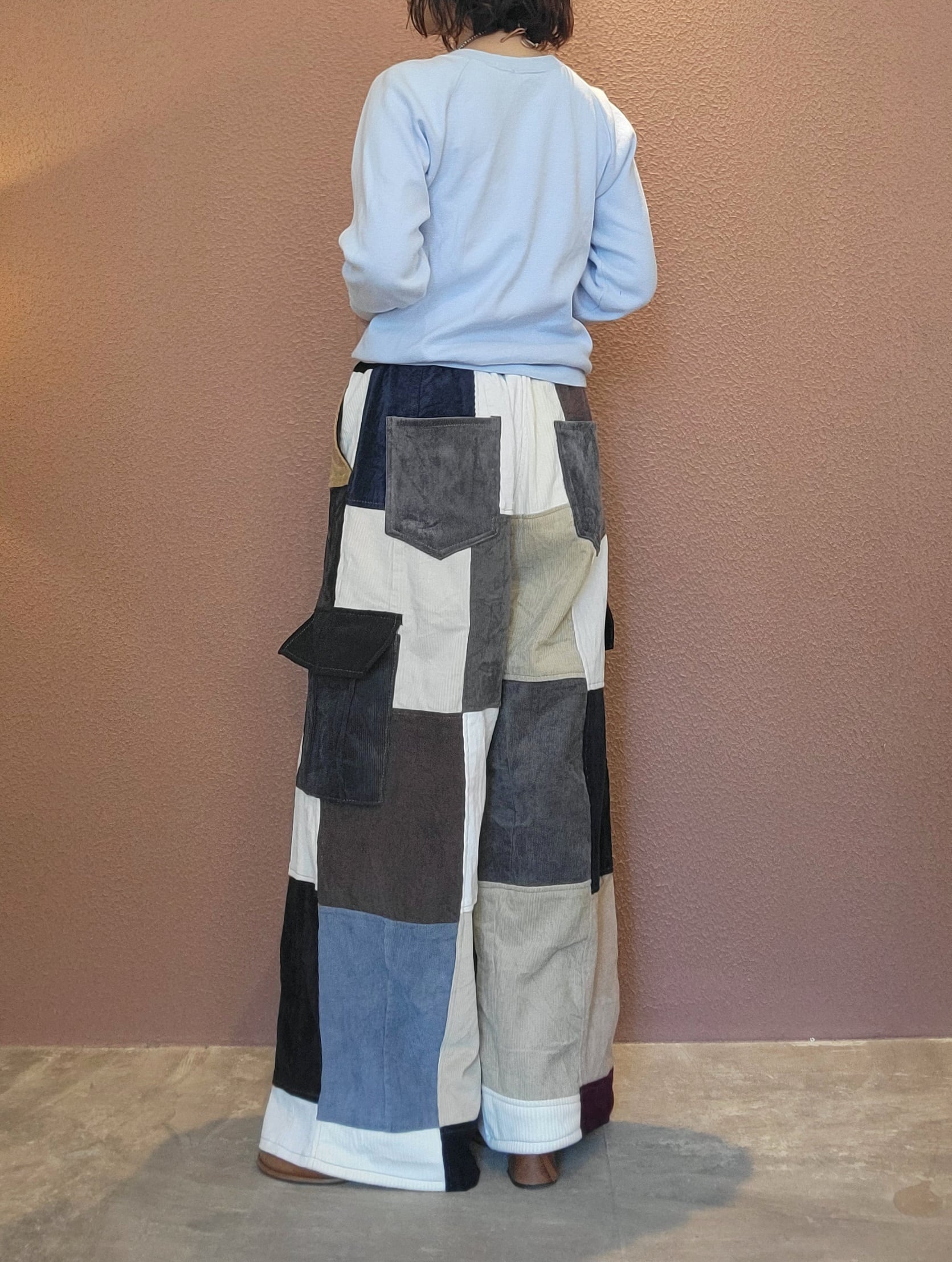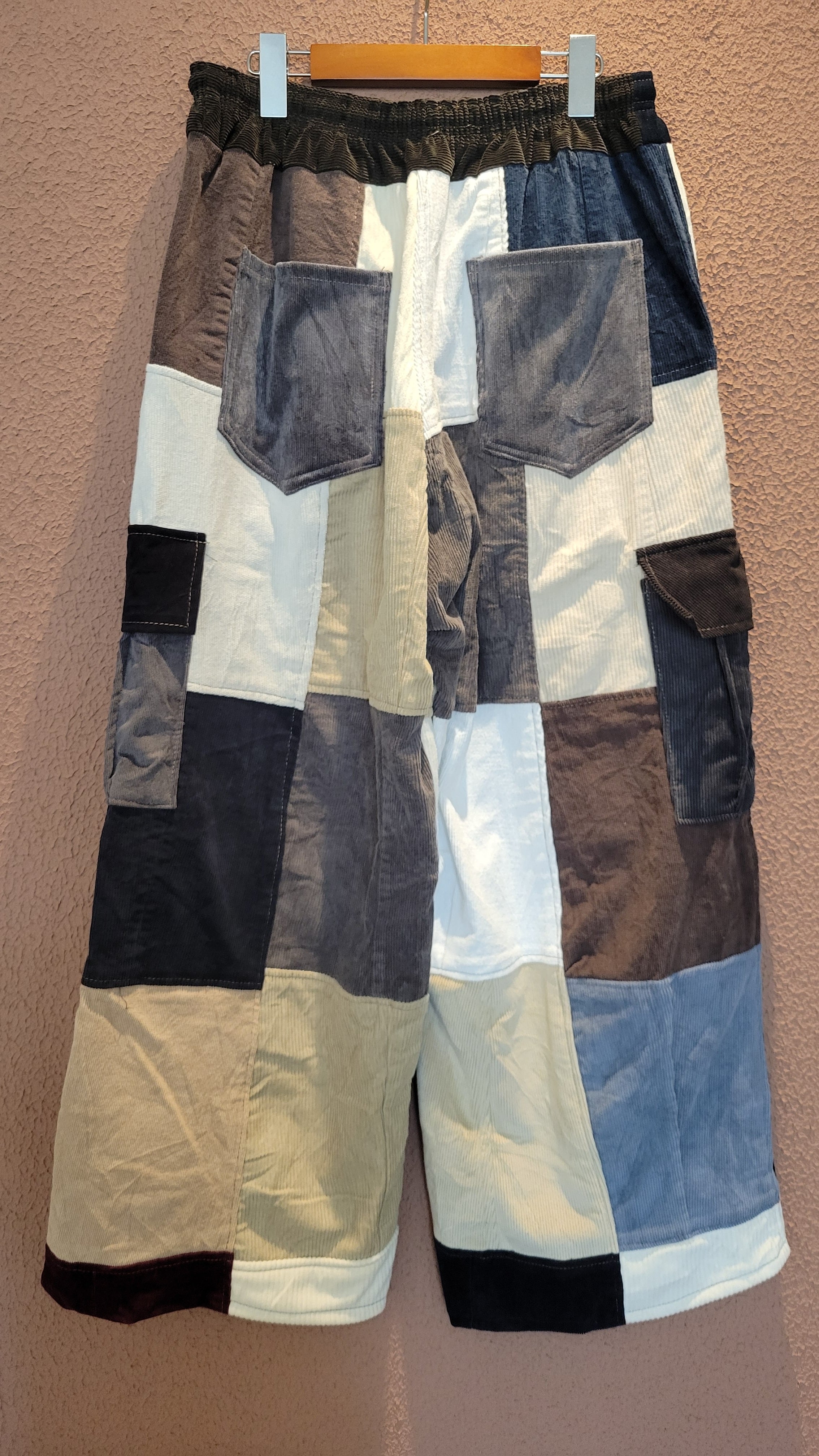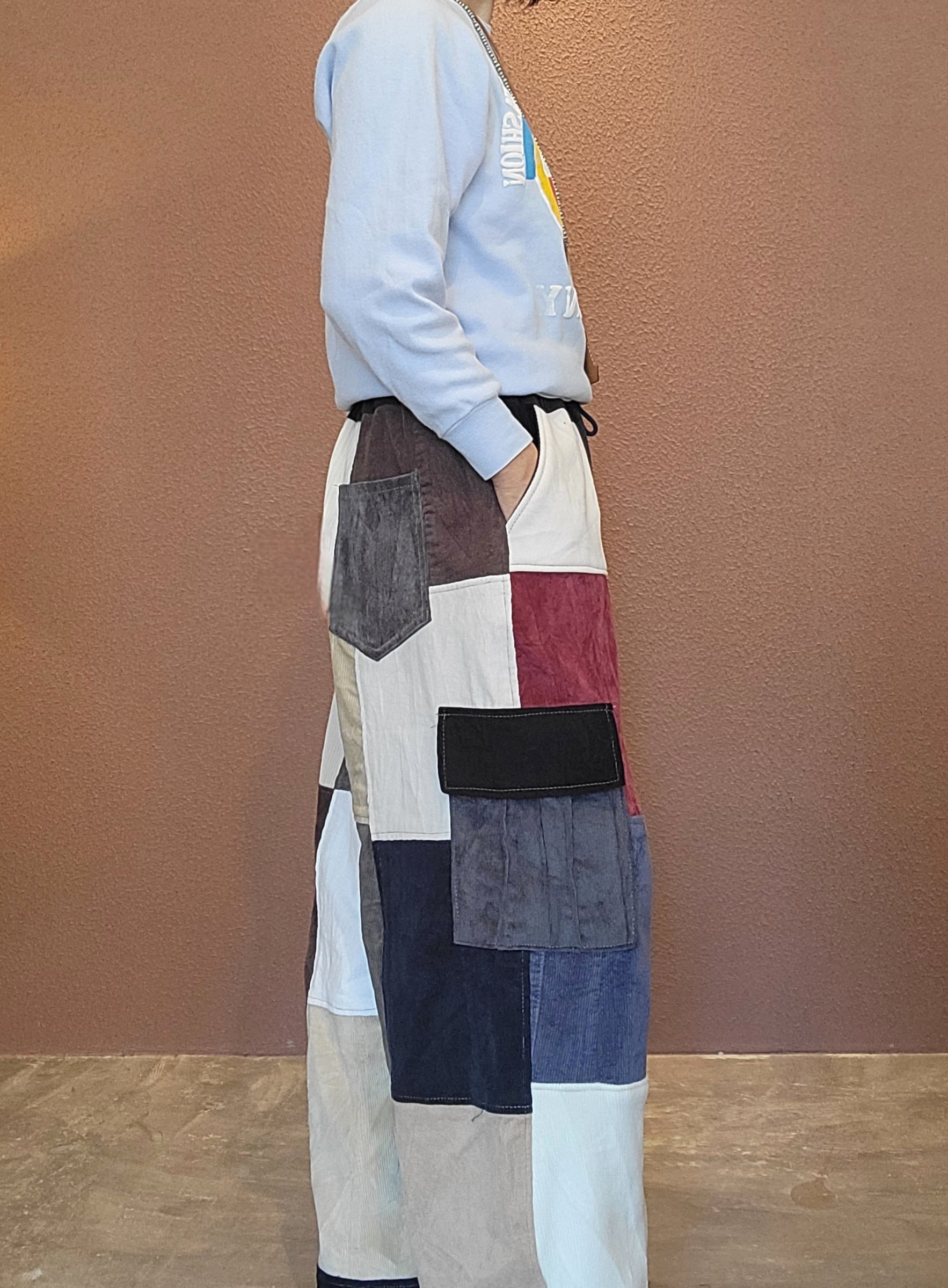 コーデュロイのリメイクパッチワークパンツ。コーデュロイやベロア素材の布片をいくつも繋ぎ合わせたリメイクパンツです。ウエストはゴムとドローコードによりサイズの調整が可能です。大きめサイズの極太シルエットで男性はもちろん、女性がウエストをぎゅっと絞りオーバーサイズでの着用も可能です。テクスチャの異なる素材の組み合わせが唯一無二の1本となっています。