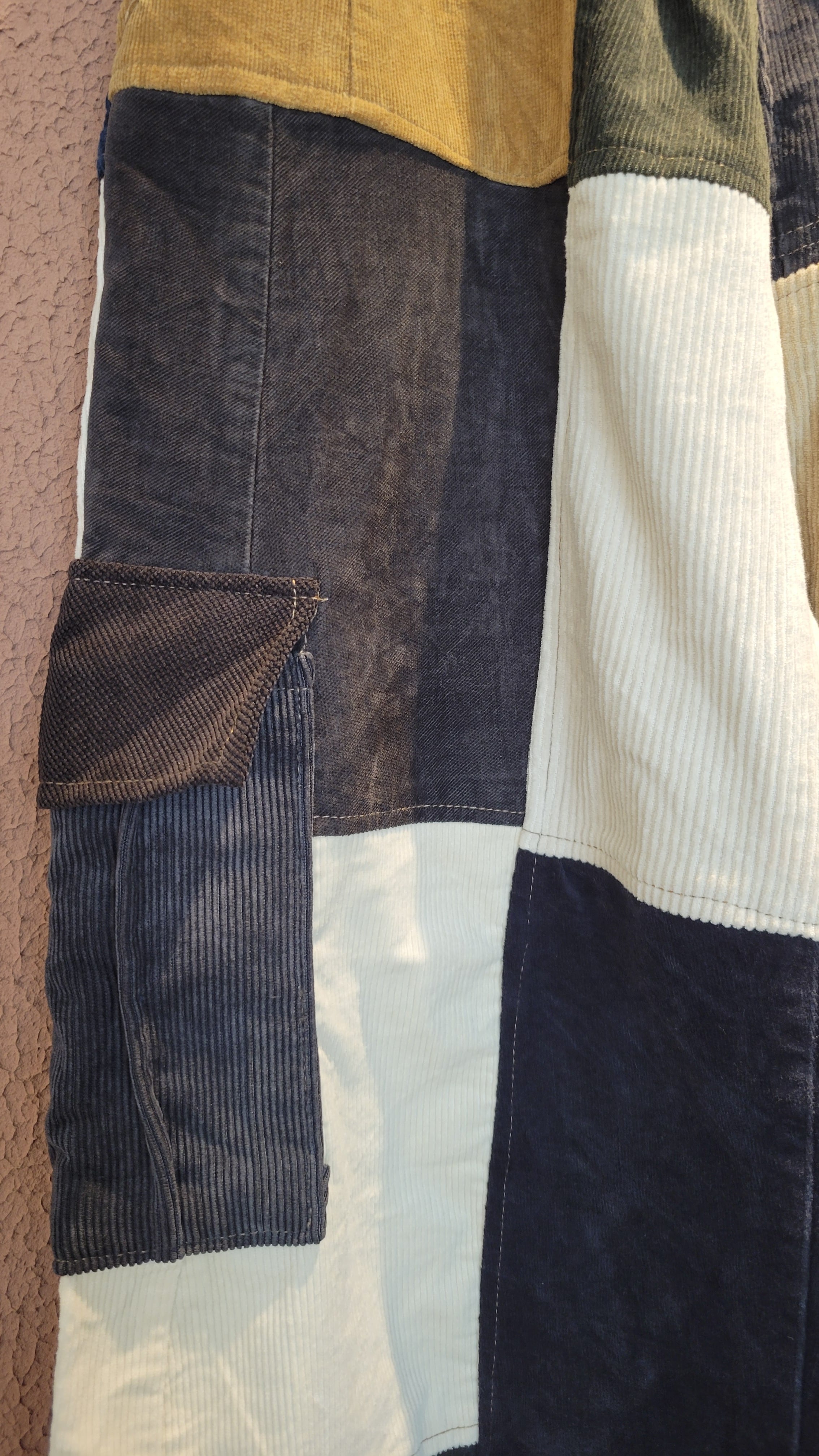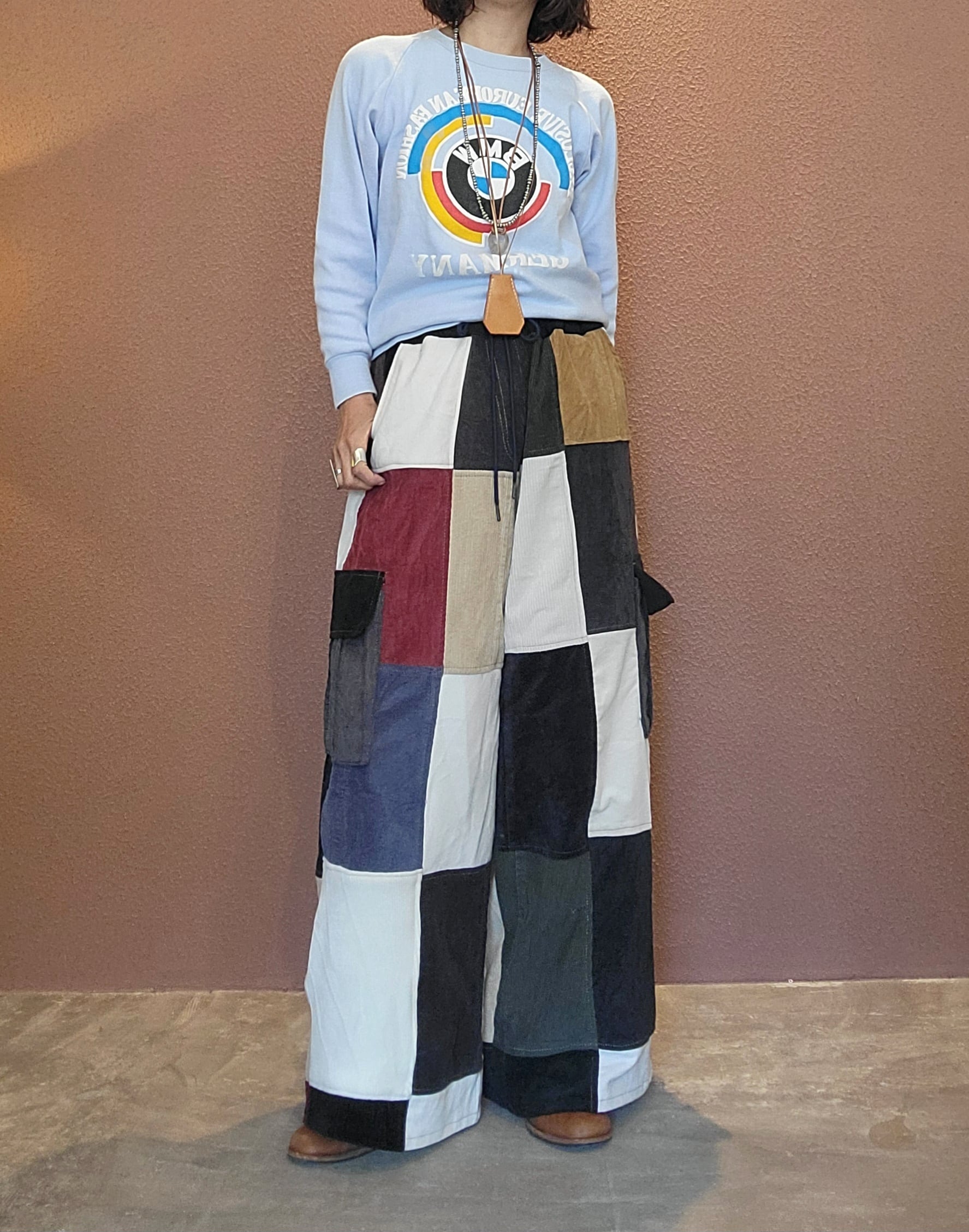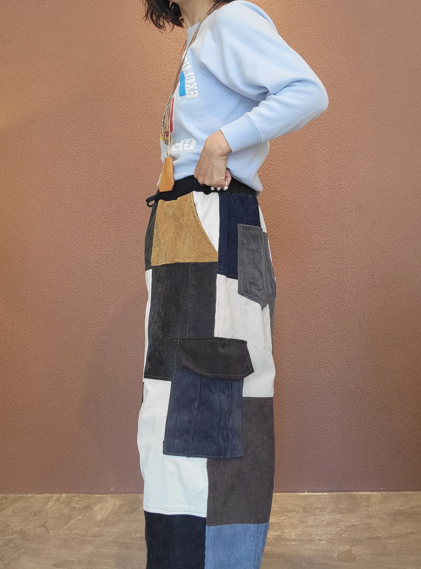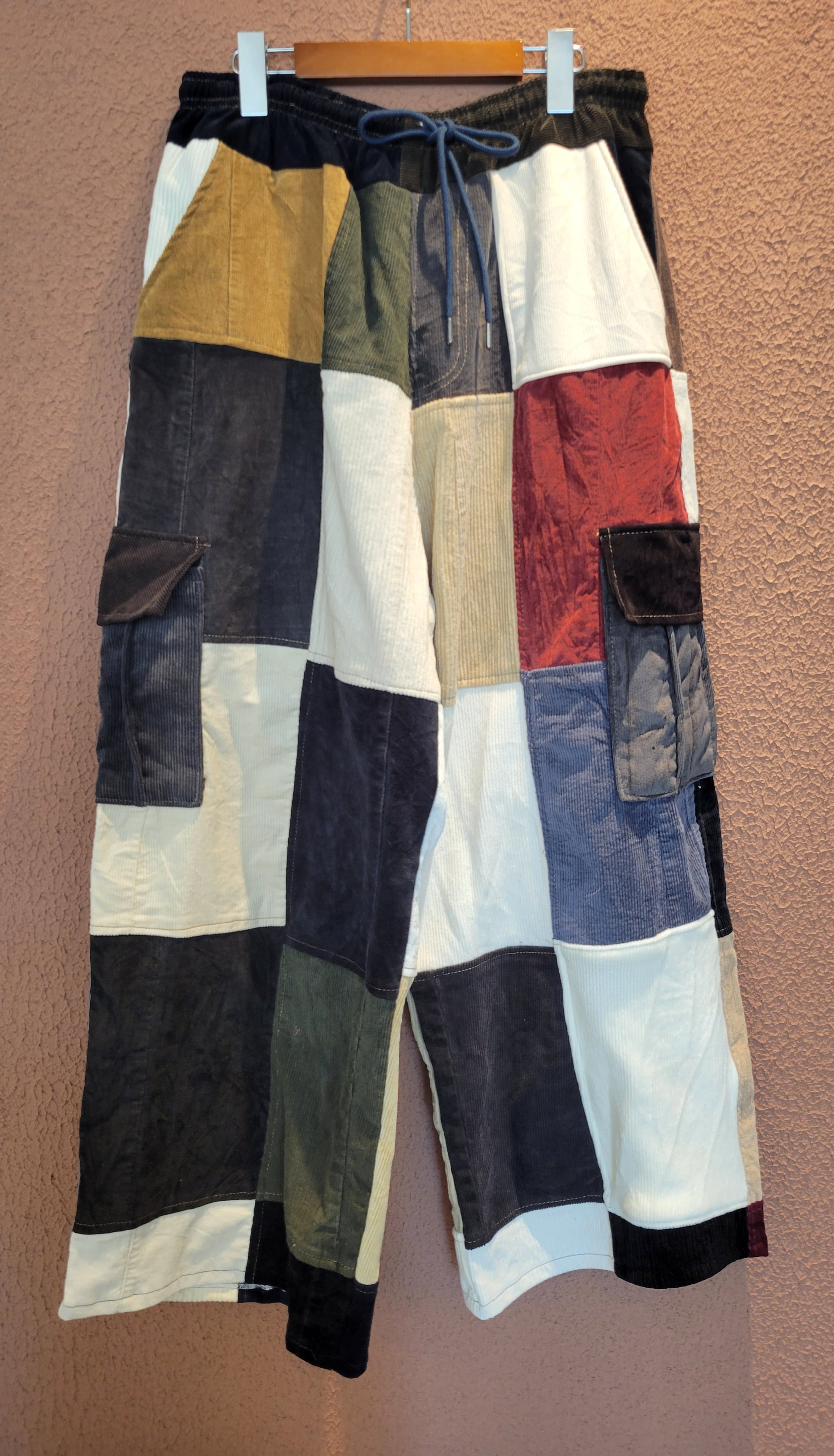 コーデュロイのリメイクパッチワークパンツ。コーデュロイやベロア素材の布片をいくつも繋ぎ合わせたリメイクパンツです。ウエストはゴムとドローコードによりサイズの調整が可能です。大きめサイズの極太シルエットで男性はもちろん、女性がウエストをぎゅっと絞りオーバーサイズでの着用も可能です。テクスチャの異なる素材の組み合わせが唯一無二の1本となっています。