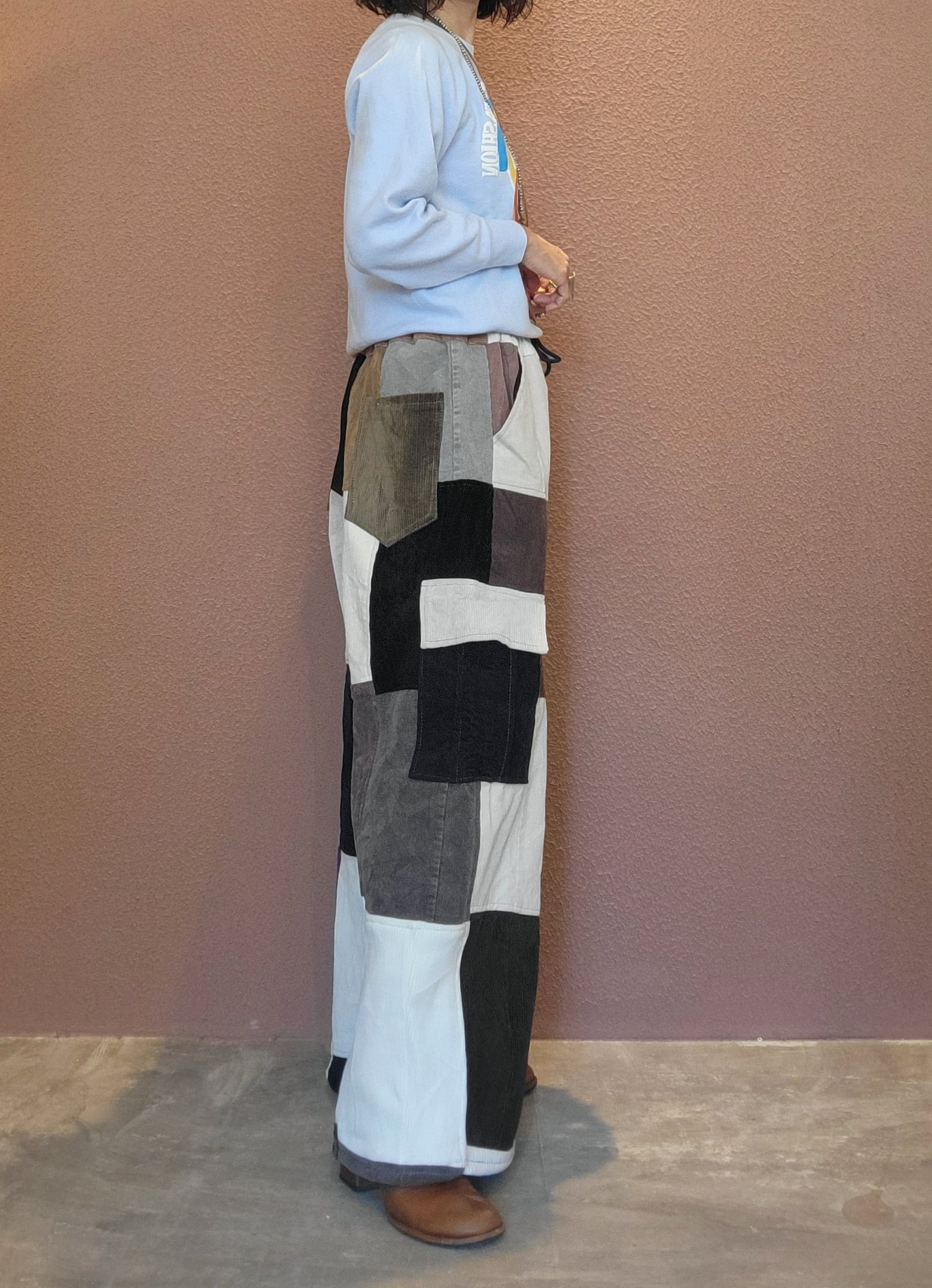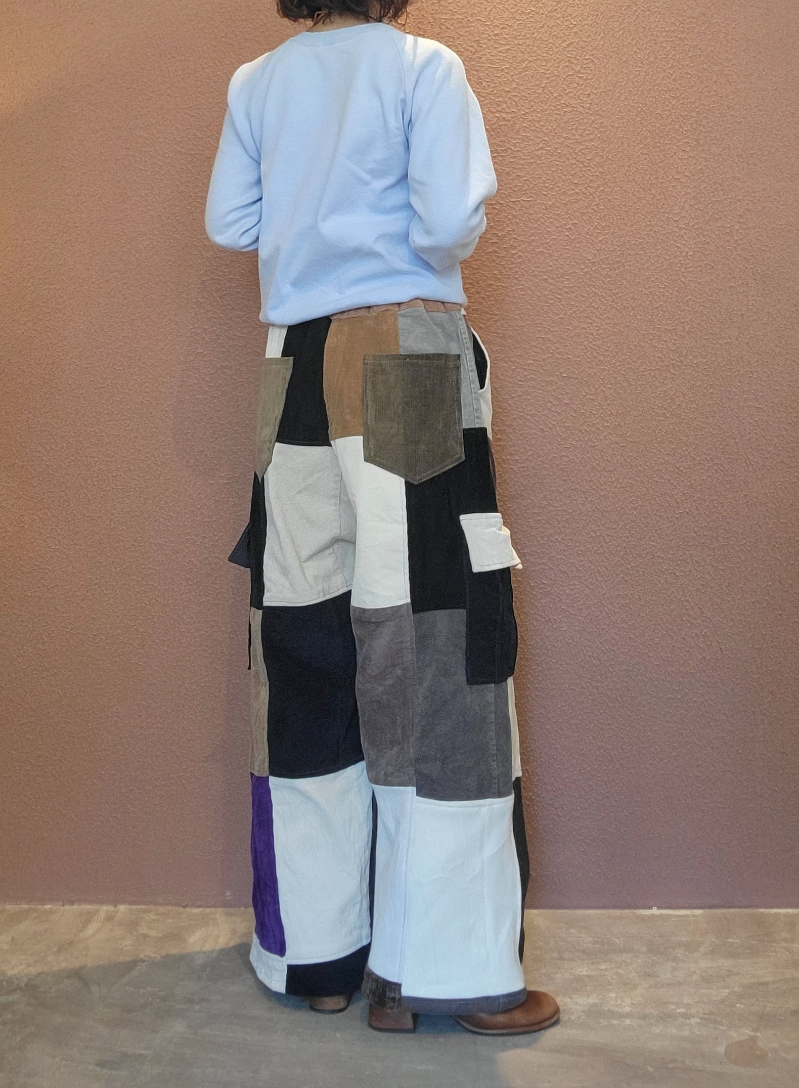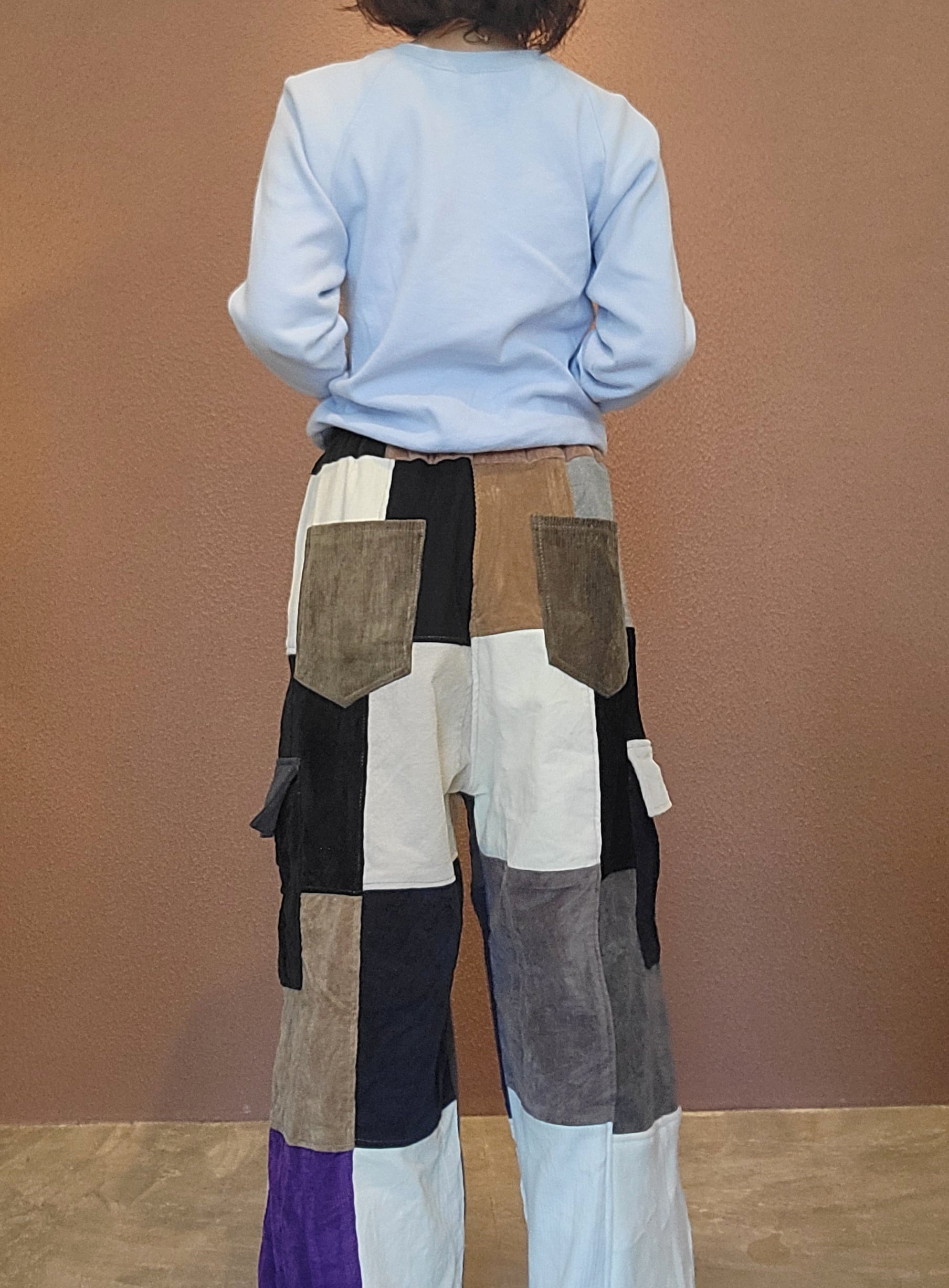 コーデュロイのリメイクパッチワークパンツ。コーデュロイやベロア素材の布片をいくつも繋ぎ合わせたリメイクパンツです。ウエストはゴムとドローコードによりサイズの調整が可能です。大きめサイズの極太シルエットで男性はもちろん、女性がウエストをぎゅっと絞りオーバーサイズでの着用も可能です。テクスチャの異なる素材の組み合わせが唯一無二の1本となっています。