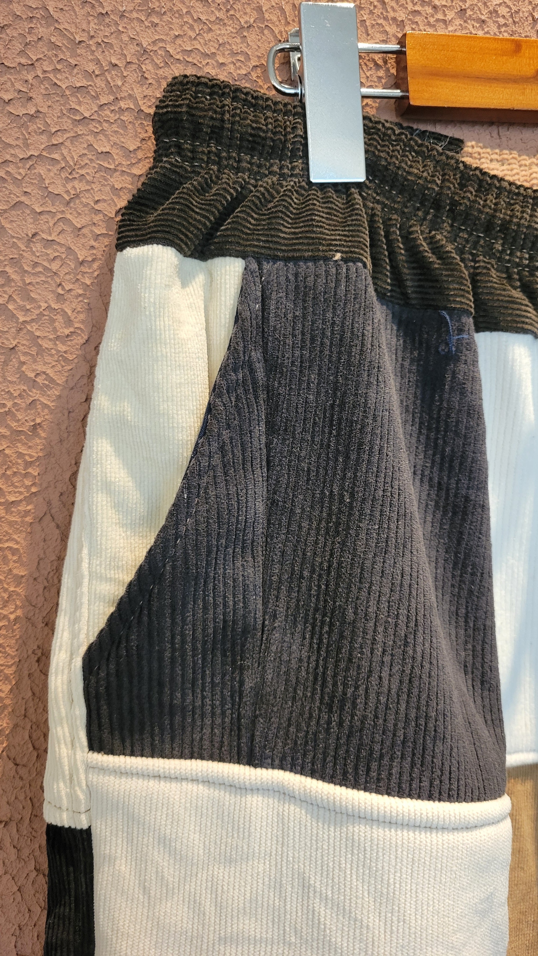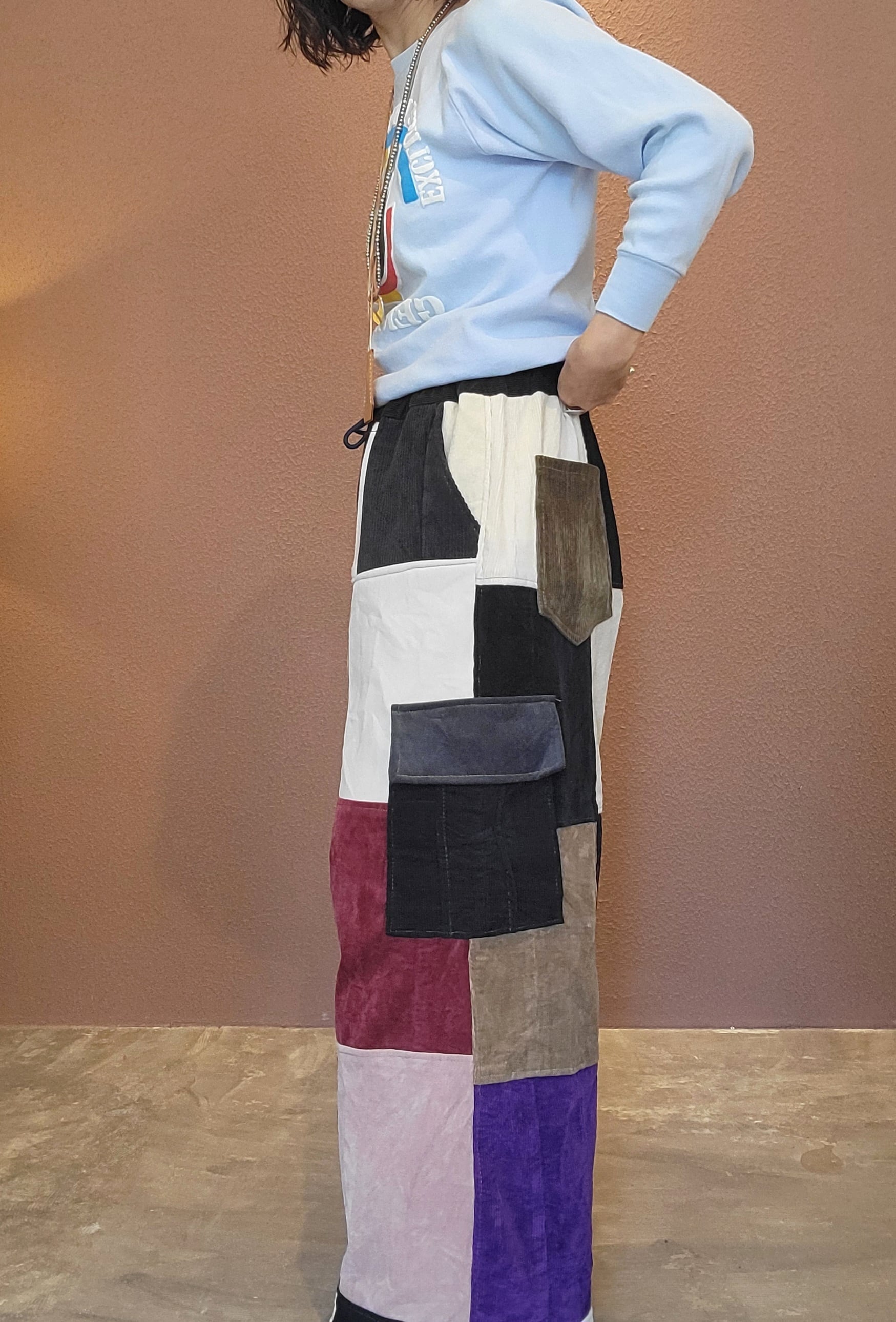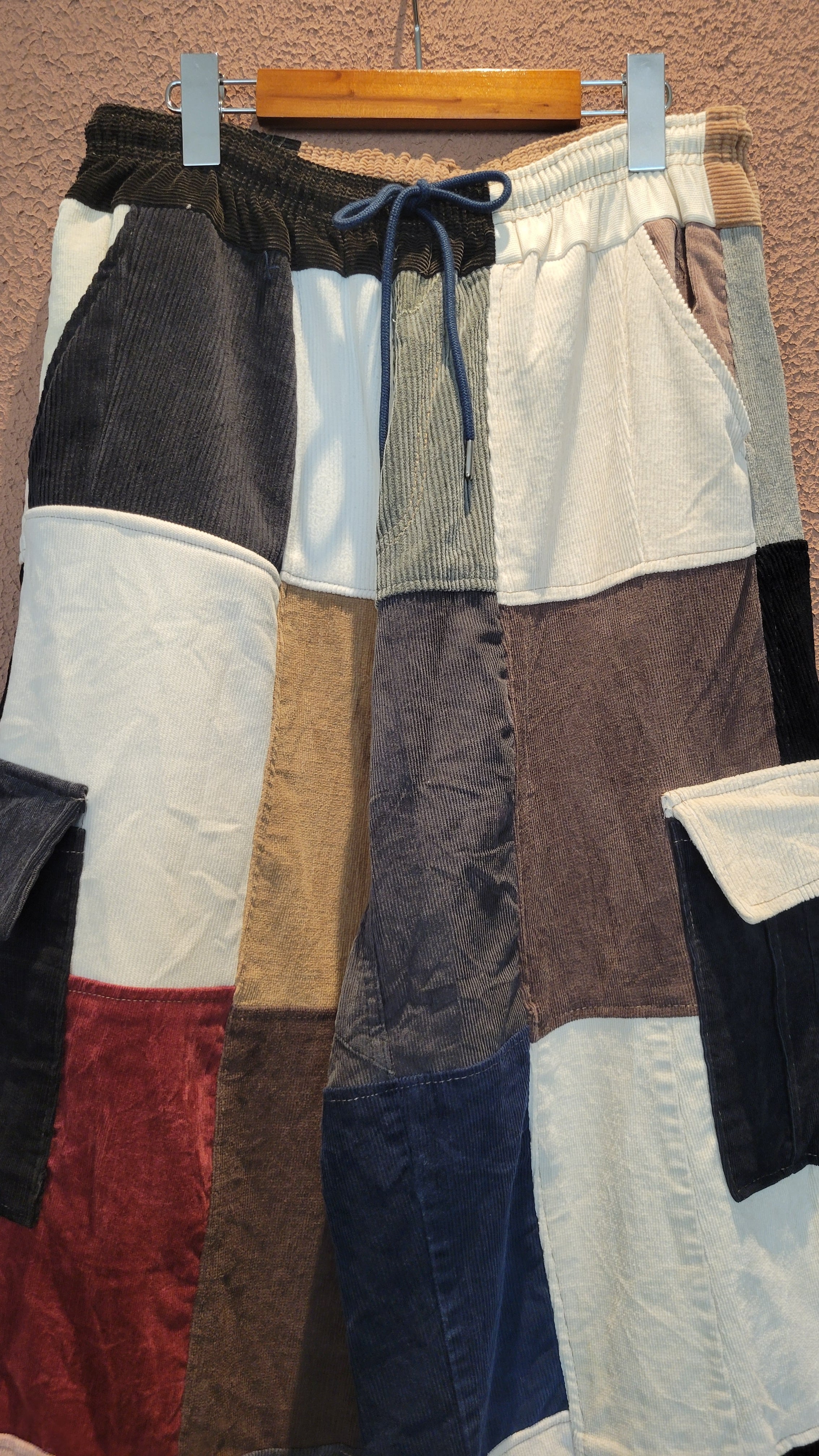 コーデュロイのリメイクパッチワークパンツ。コーデュロイやベロア素材の布片をいくつも繋ぎ合わせたリメイクパンツです。ウエストはゴムとドローコードによりサイズの調整が可能です。大きめサイズの極太シルエットで男性はもちろん、女性がウエストをぎゅっと絞りオーバーサイズでの着用も可能です。テクスチャの異なる素材の組み合わせが唯一無二の1本となっています。