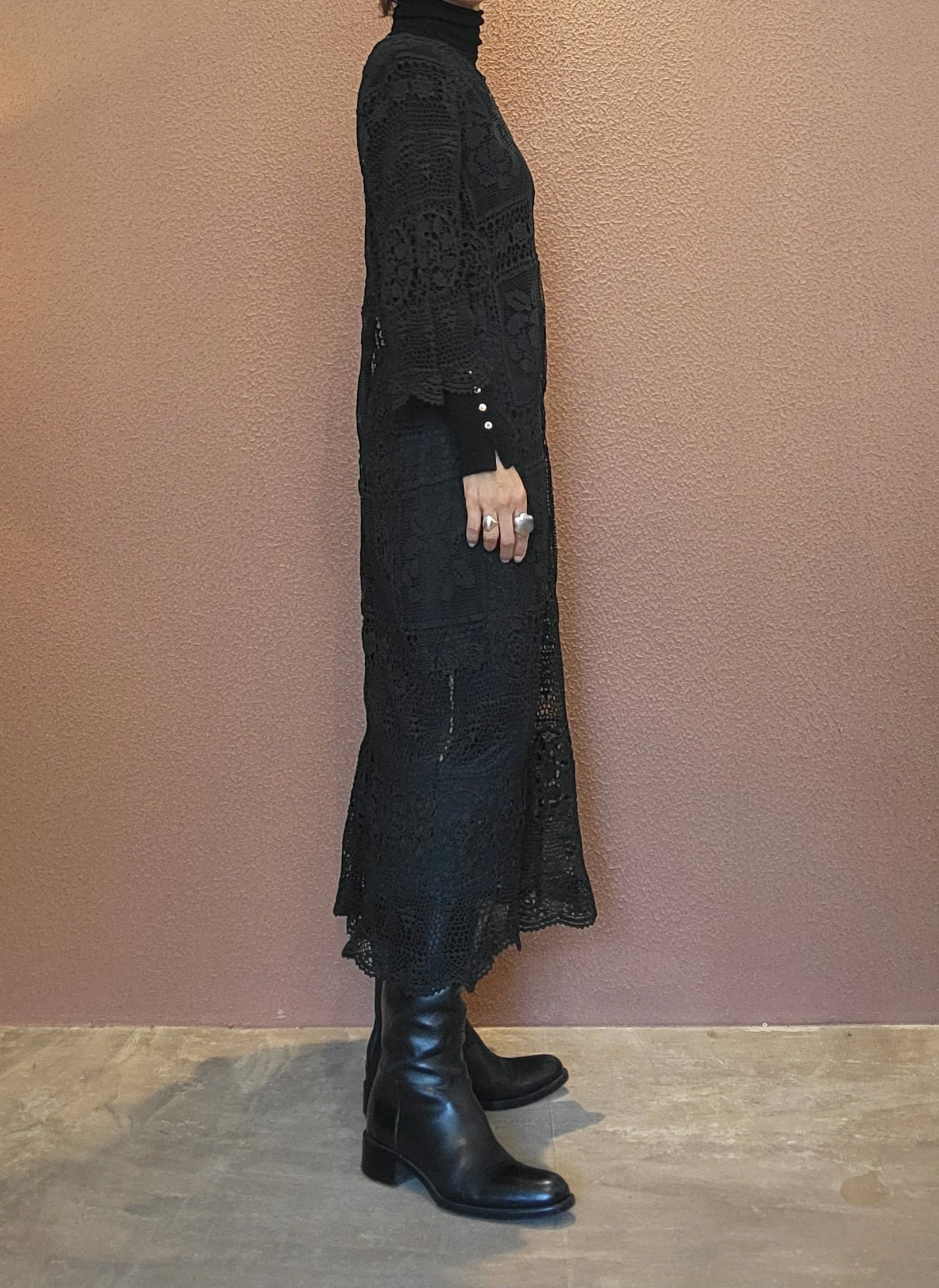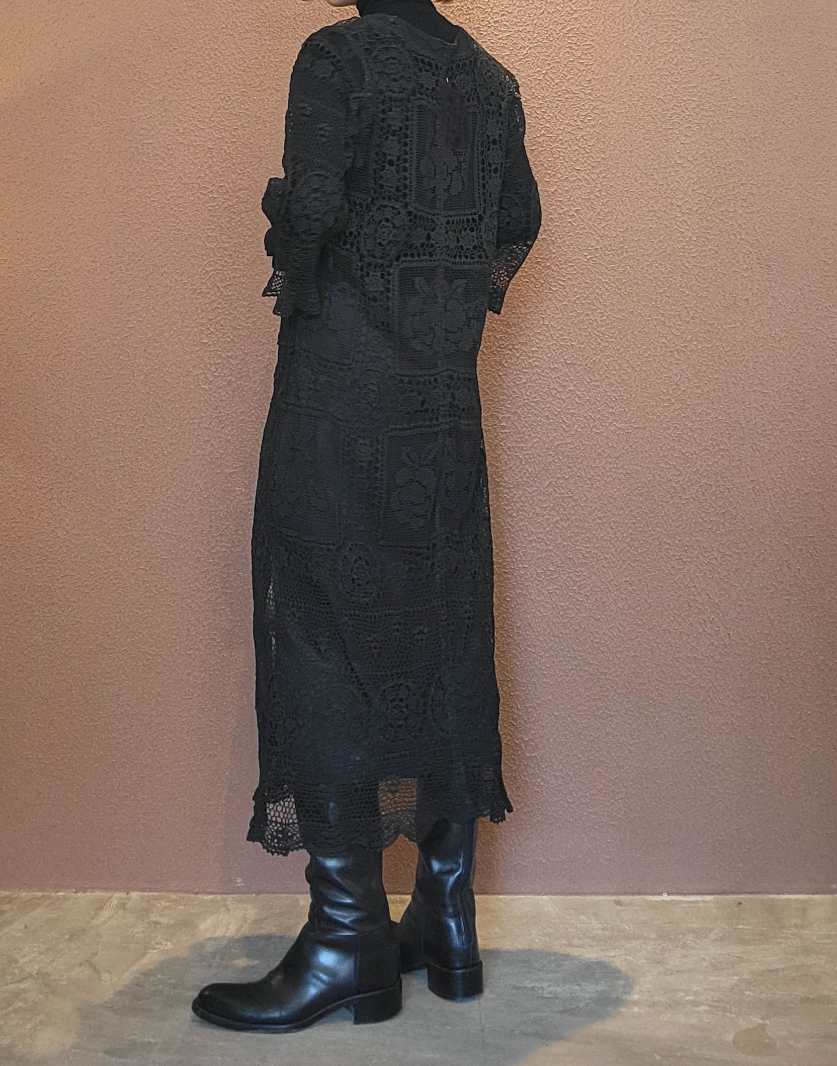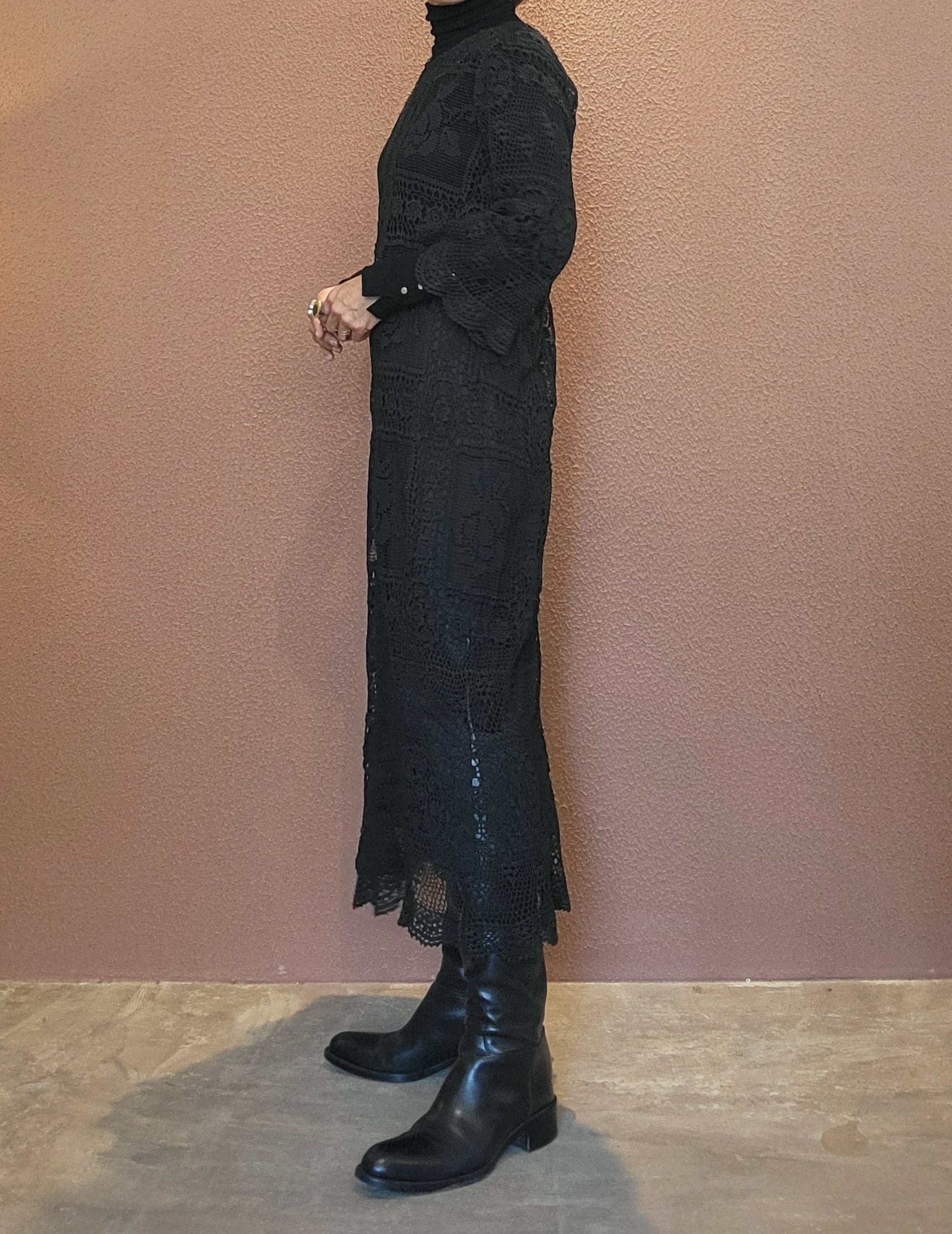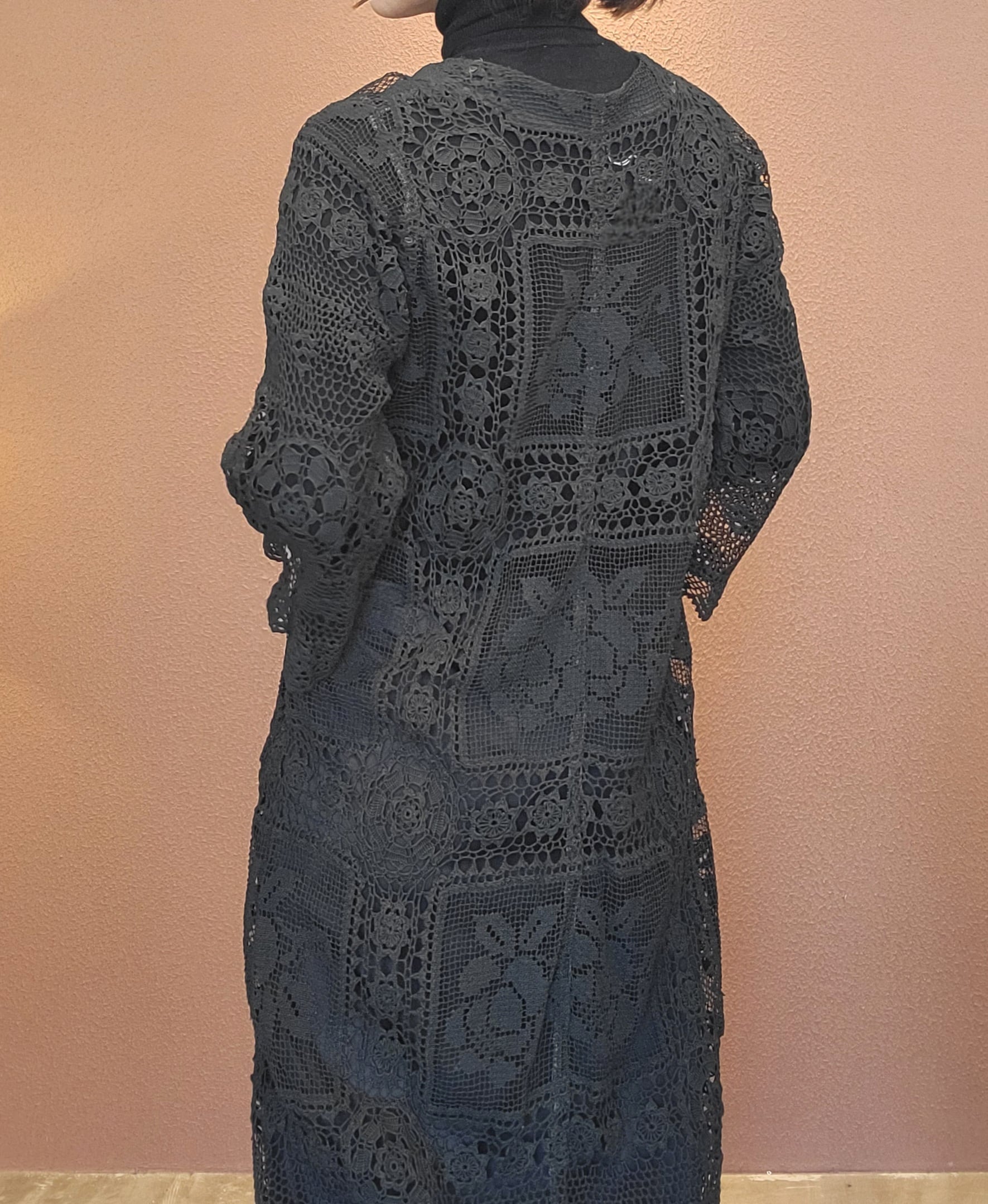 ヴィンテージのホワイトレースをブラックに後染めしたリメイクワンピース。染めは無農薬、無科学肥料で栽培された琉球藍を使用し、藍染→柿渋染→鉄媒染という複数の行程を経て丁寧に染め上げています。ボタンやファスナーは付いておらず頭から被るようにして着用するプルオーバータイプ。すとんと落ちるシルエットが縦ラインを際立たせすっきり見せてくれます。