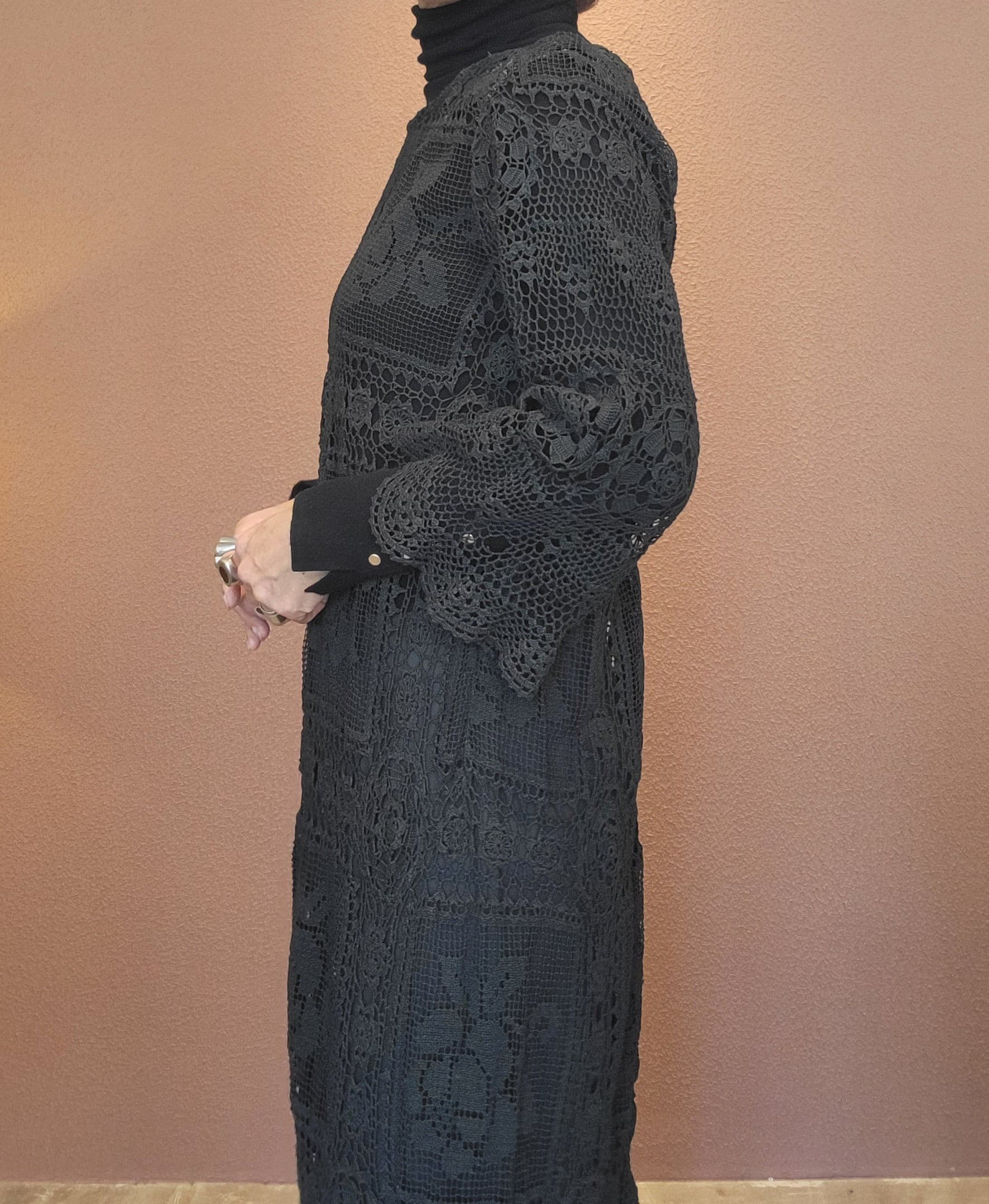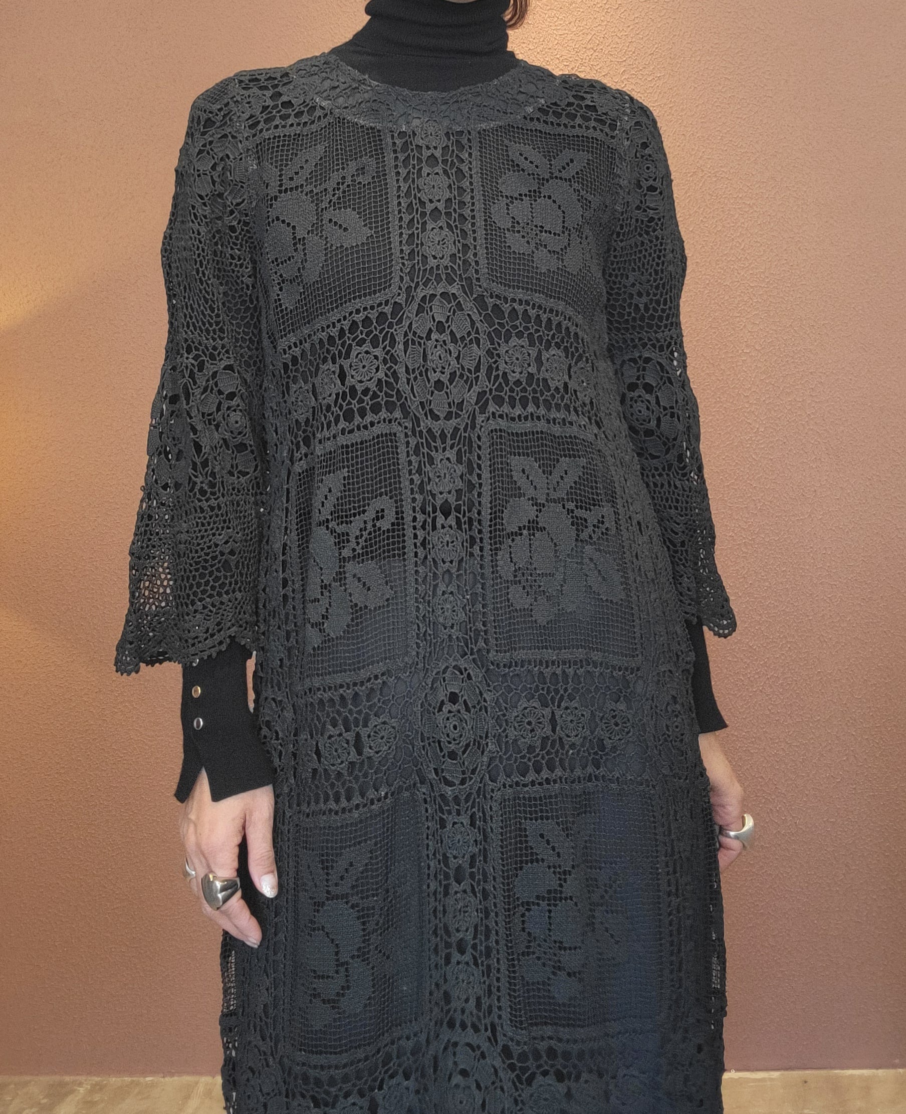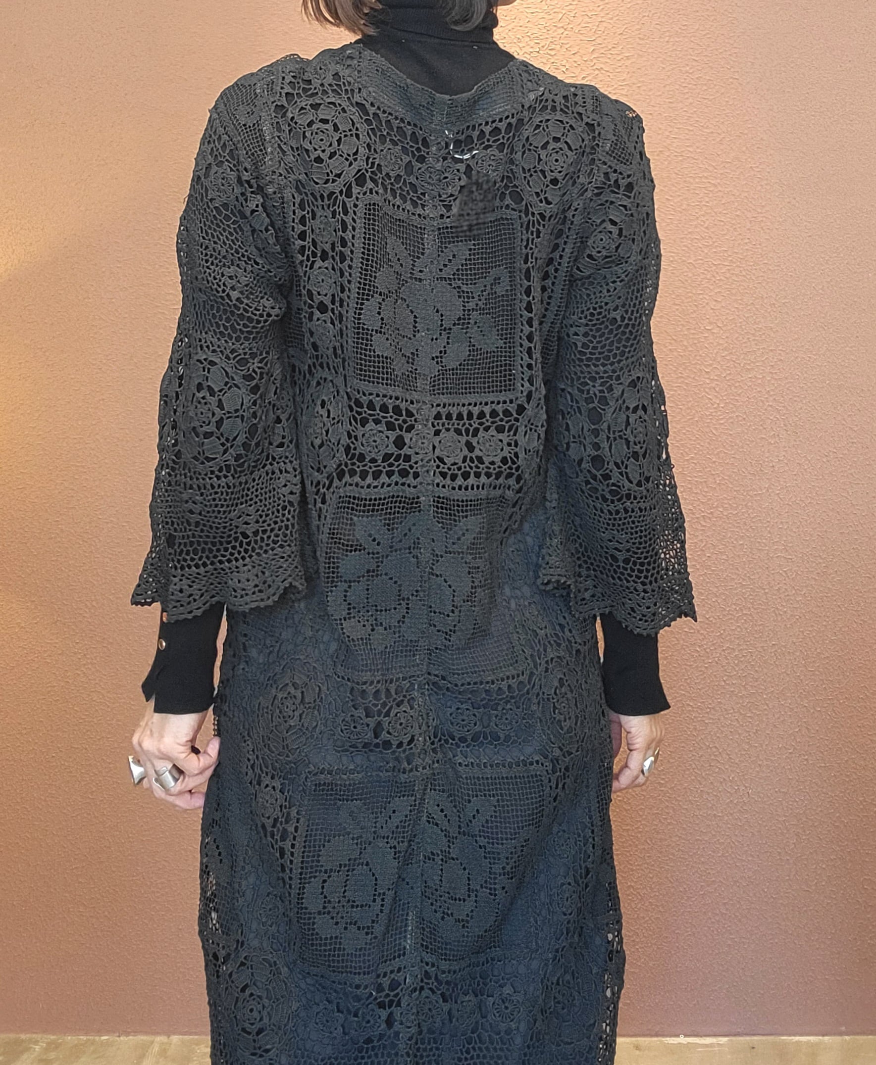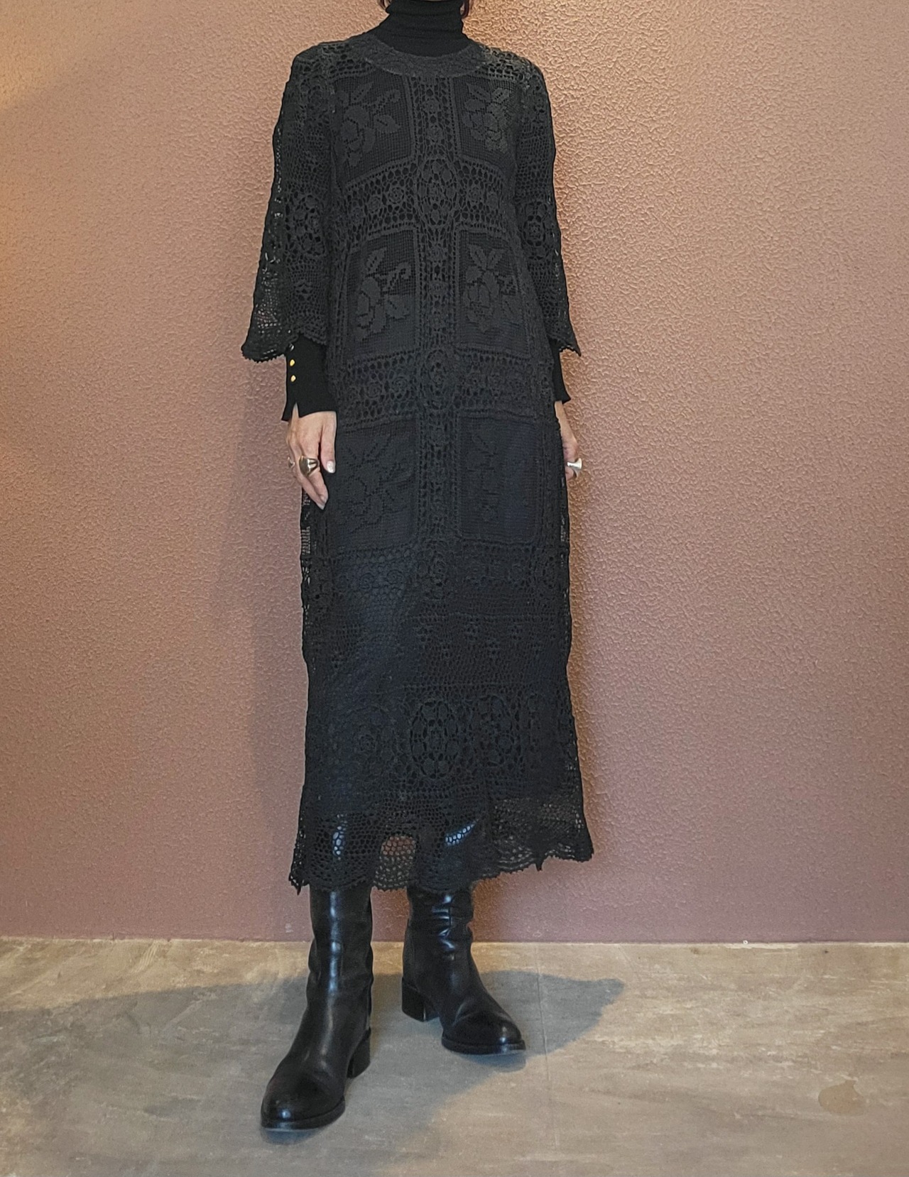 ヴィンテージのホワイトレースをブラックに後染めしたリメイクワンピース。染めは無農薬、無科学肥料で栽培された琉球藍を使用し、藍染→柿渋染→鉄媒染という複数の行程を経て丁寧に染め上げています。ボタンやファスナーは付いておらず頭から被るようにして着用するプルオーバータイプ。すとんと落ちるシルエットが縦ラインを際立たせすっきり見せてくれます。