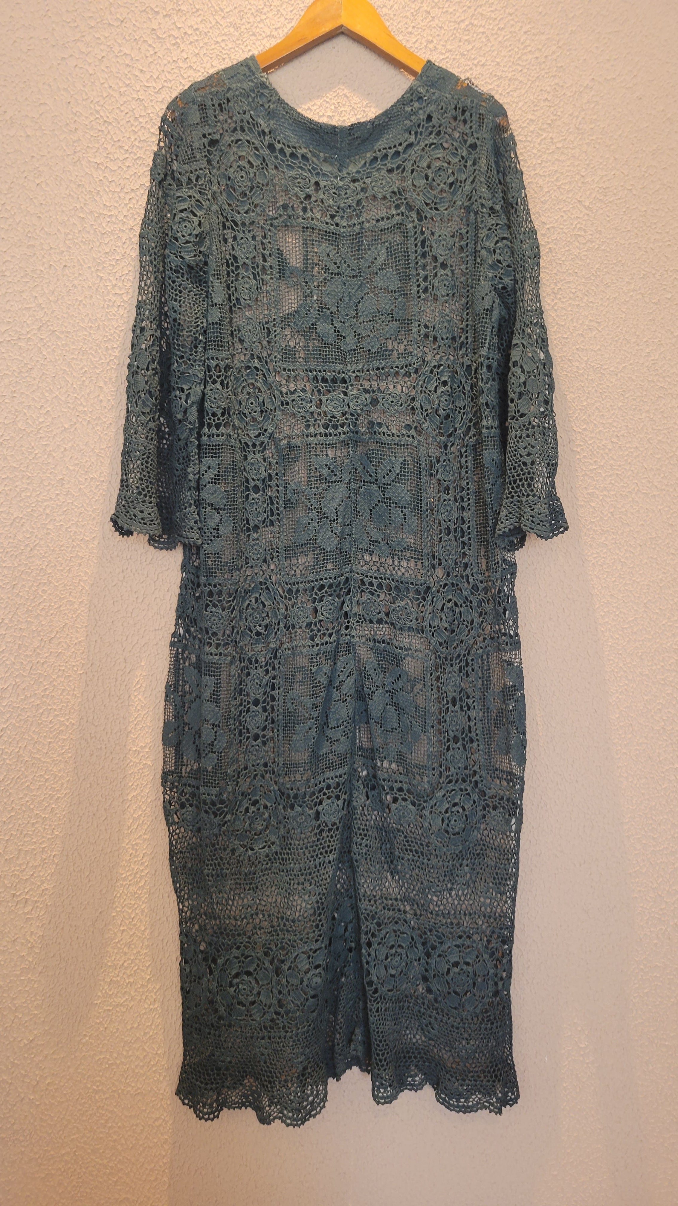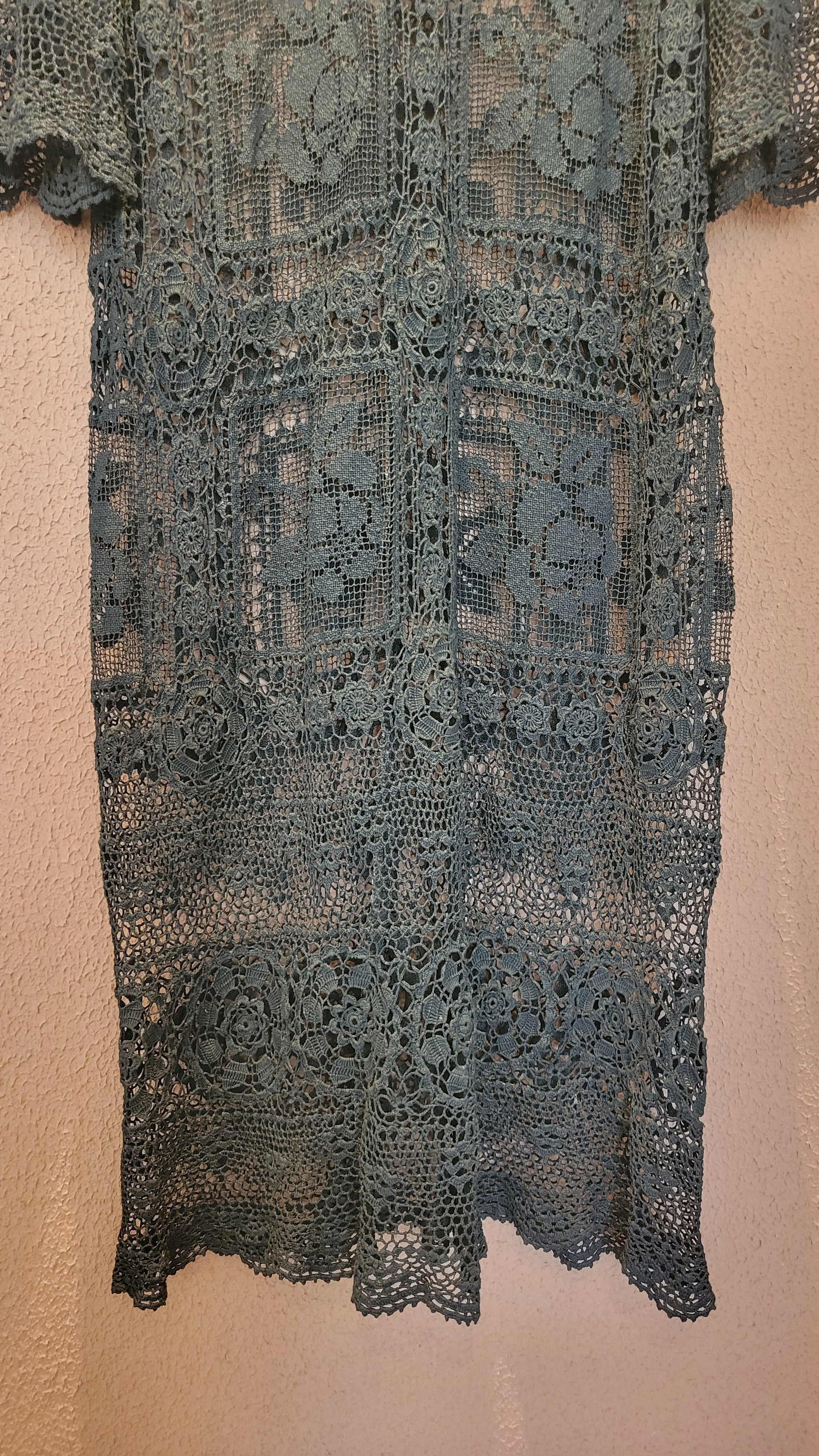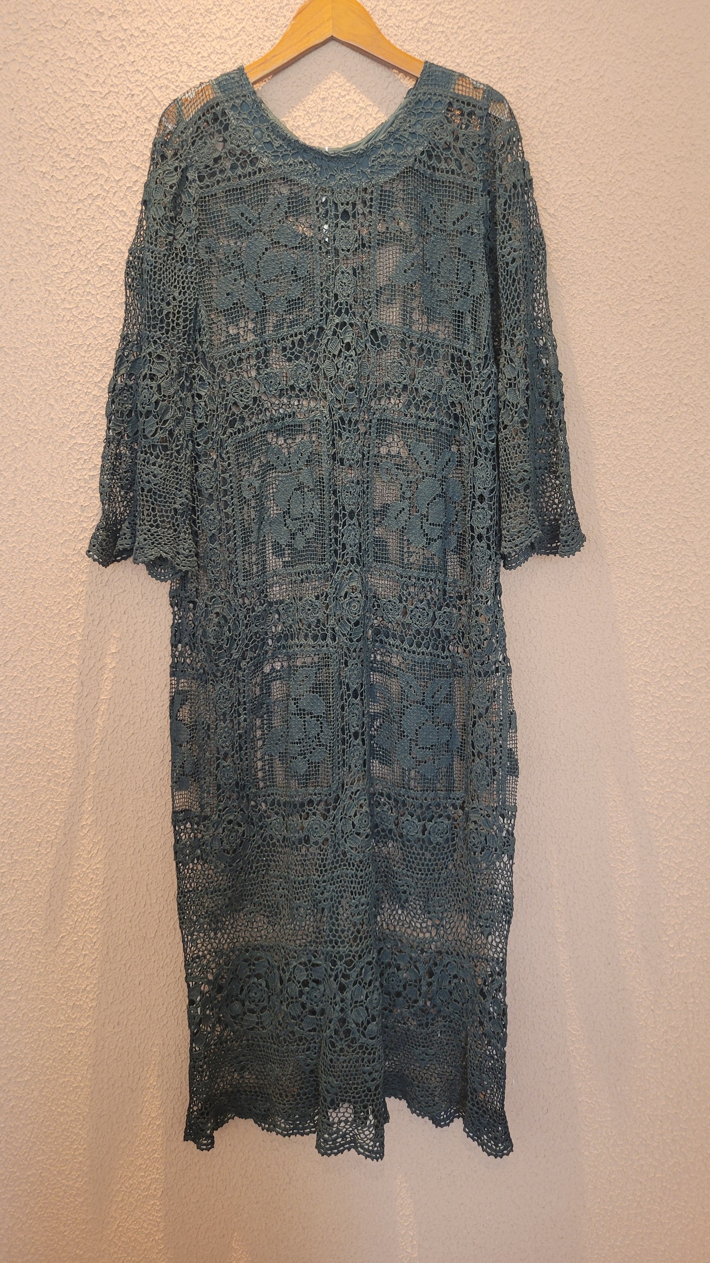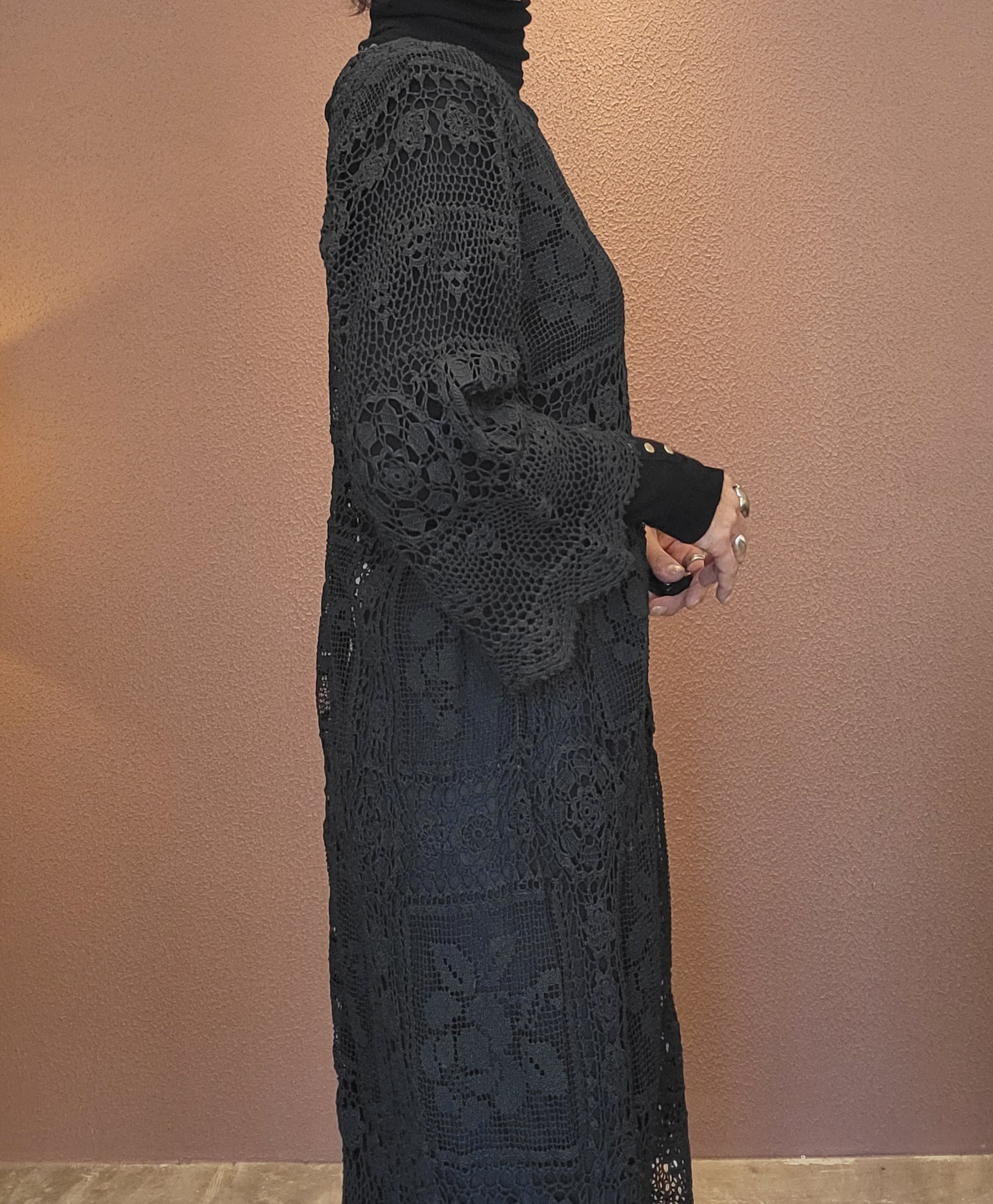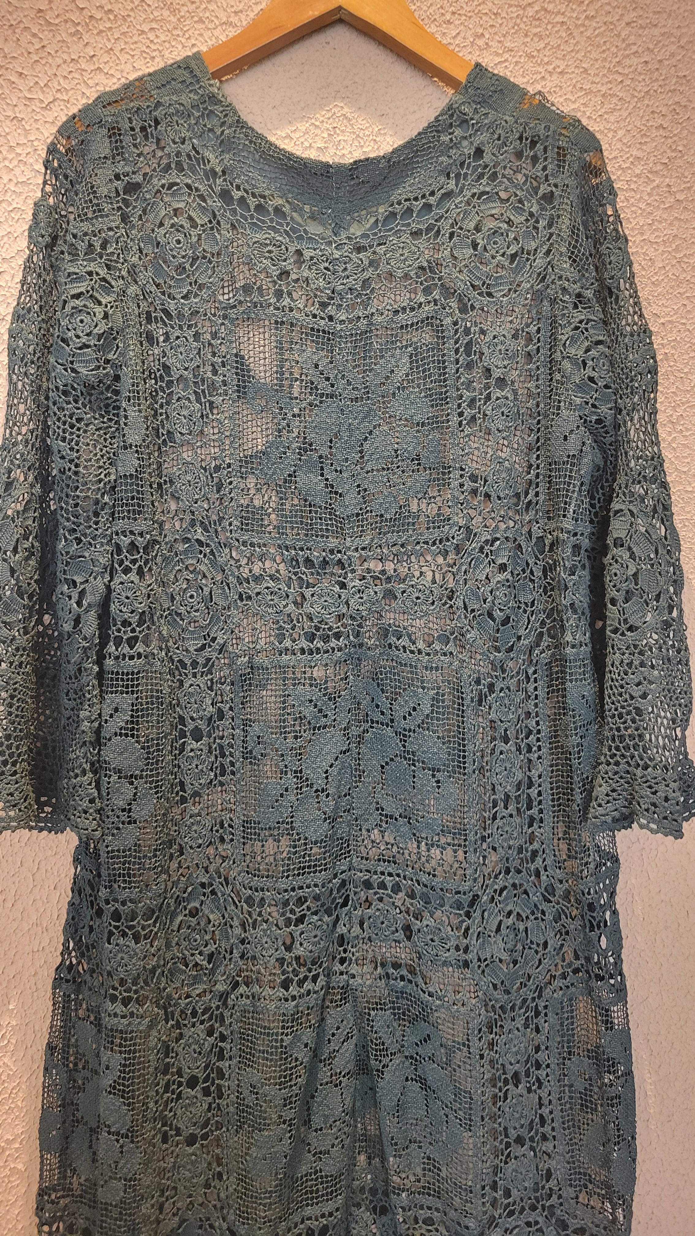 ヴィンテージのホワイトレースをブラックに後染めしたリメイクワンピース。染めは無農薬、無科学肥料で栽培された琉球藍を使用し、藍染→柿渋染→鉄媒染という複数の行程を経て丁寧に染め上げています。ボタンやファスナーは付いておらず頭から被るようにして着用するプルオーバータイプ。すとんと落ちるシルエットが縦ラインを際立たせすっきり見せてくれます。