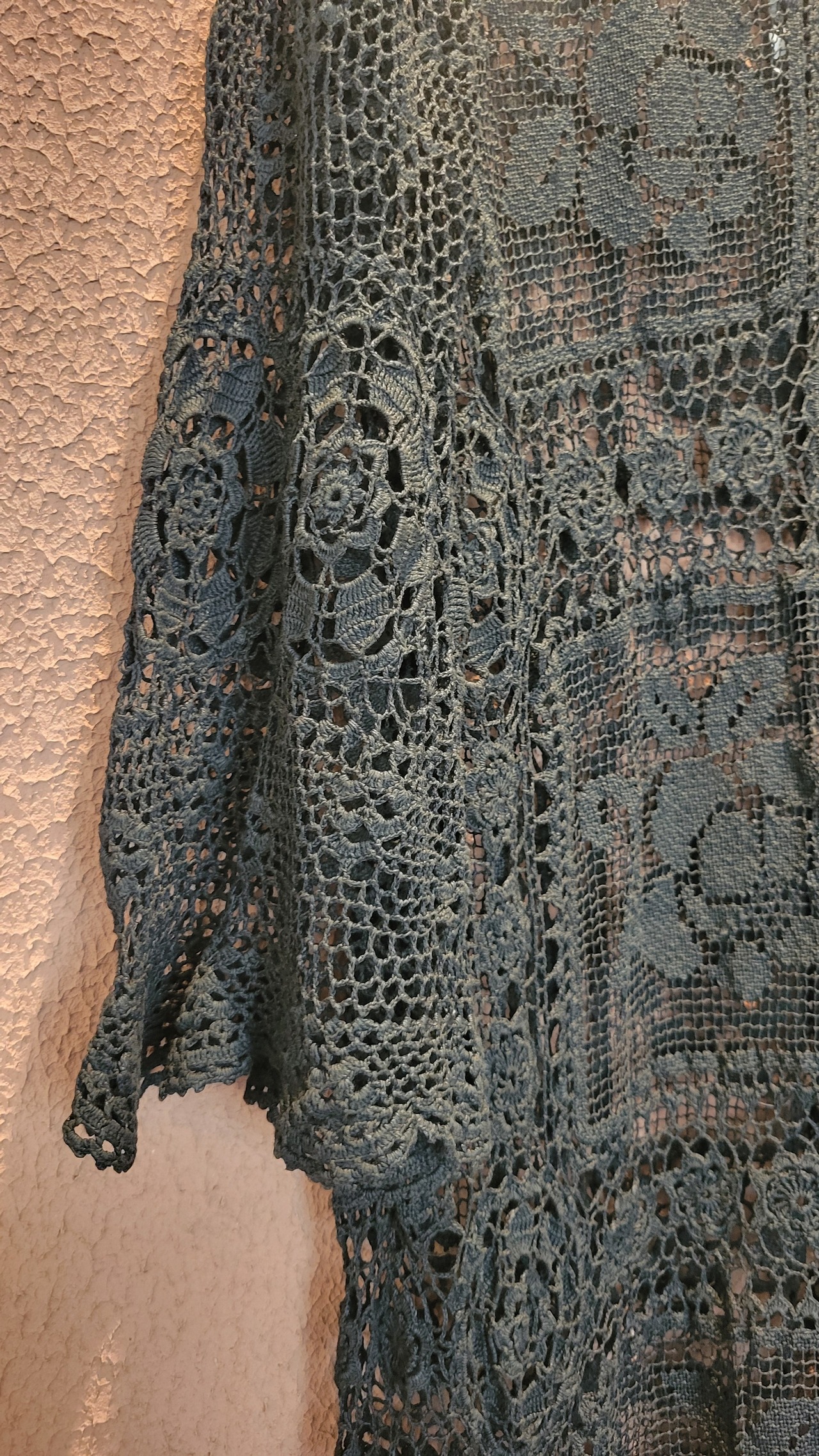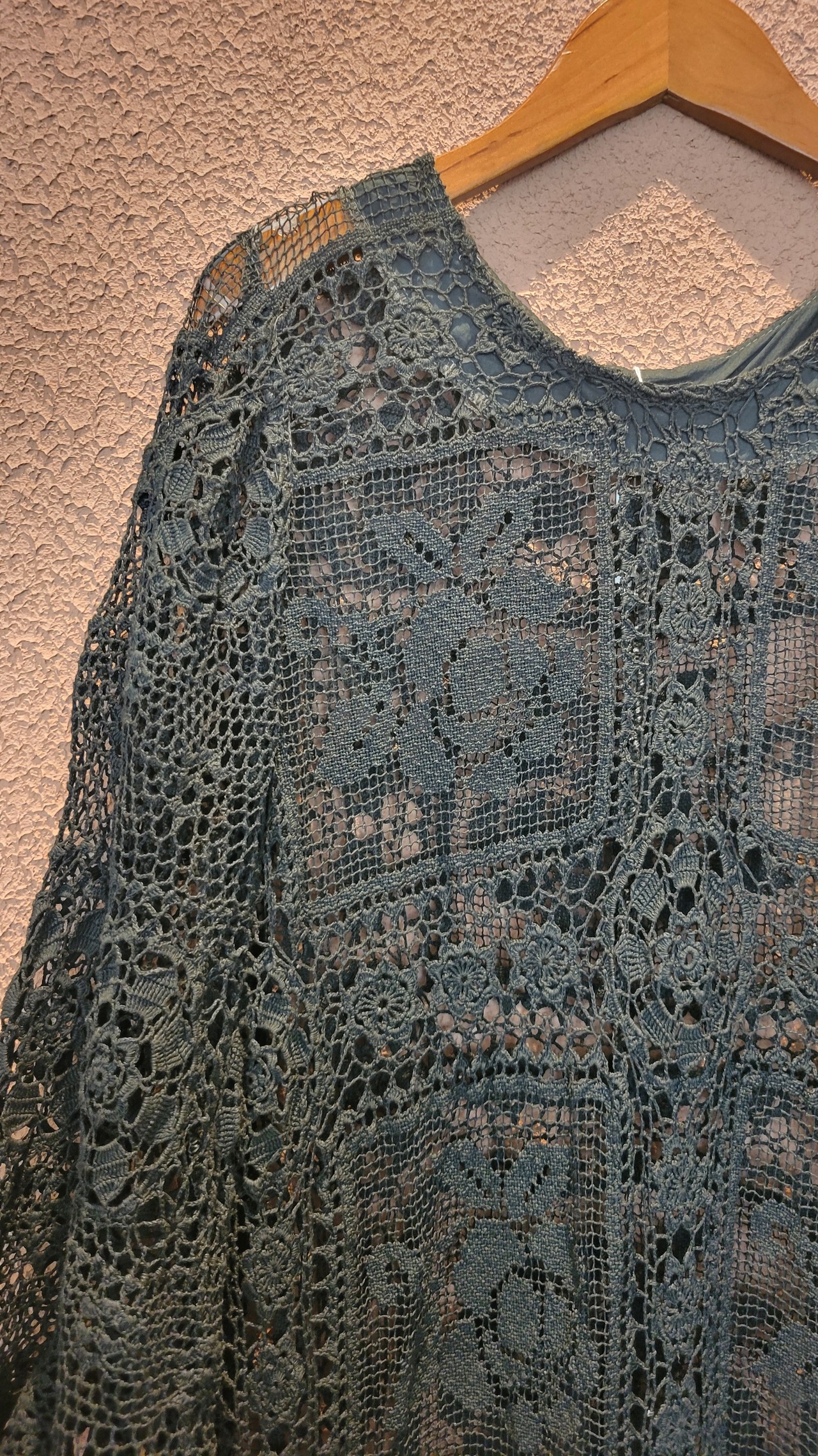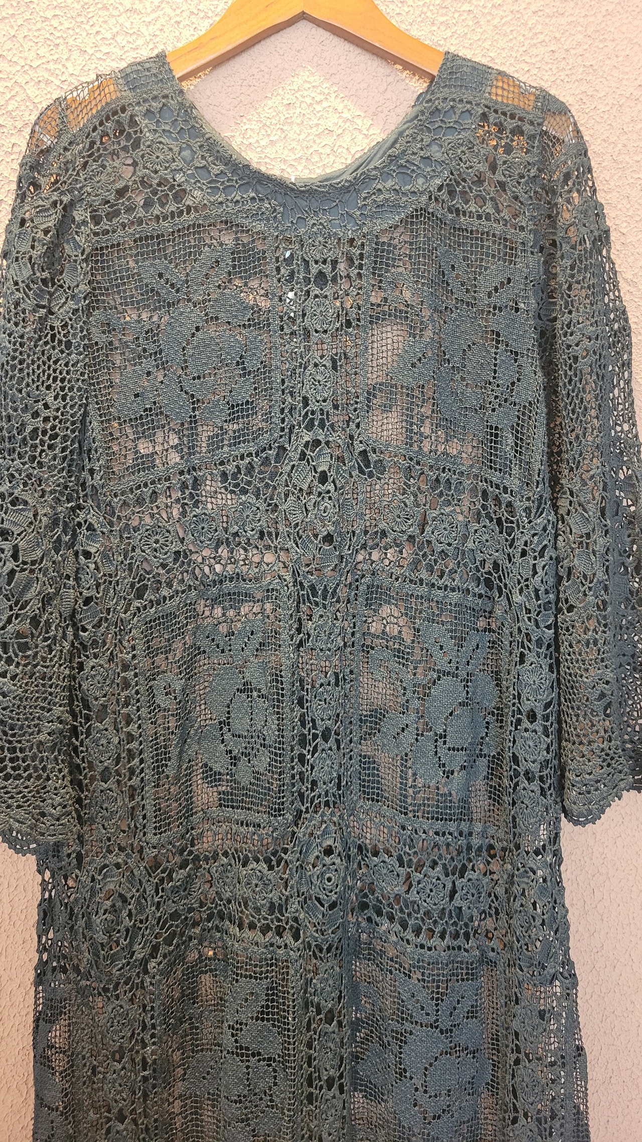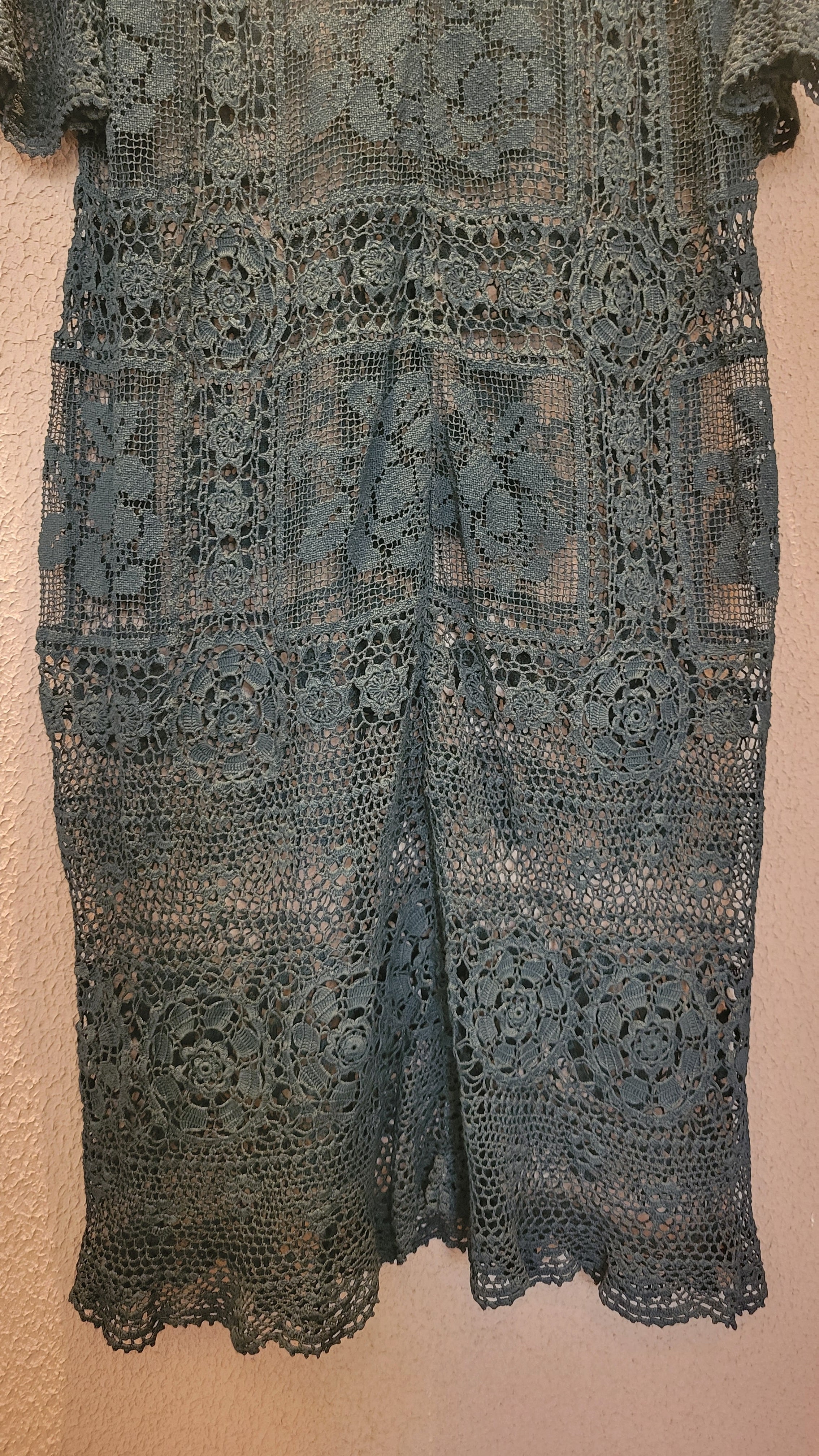 ヴィンテージのホワイトレースをブラックに後染めしたリメイクワンピース。染めは無農薬、無科学肥料で栽培された琉球藍を使用し、藍染→柿渋染→鉄媒染という複数の行程を経て丁寧に染め上げています。ボタンやファスナーは付いておらず頭から被るようにして着用するプルオーバータイプ。すとんと落ちるシルエットが縦ラインを際立たせすっきり見せてくれます。