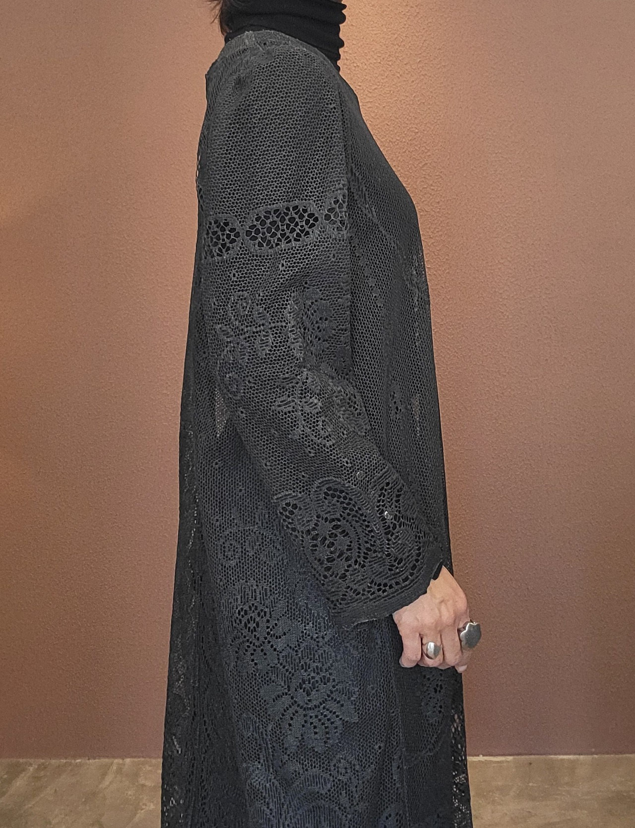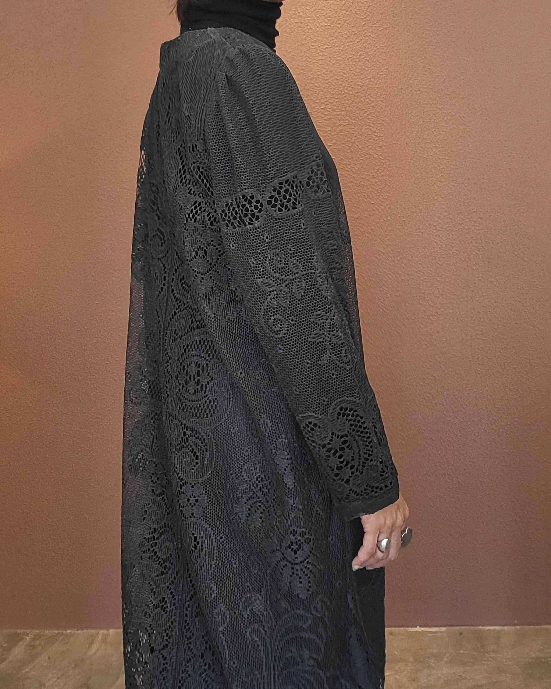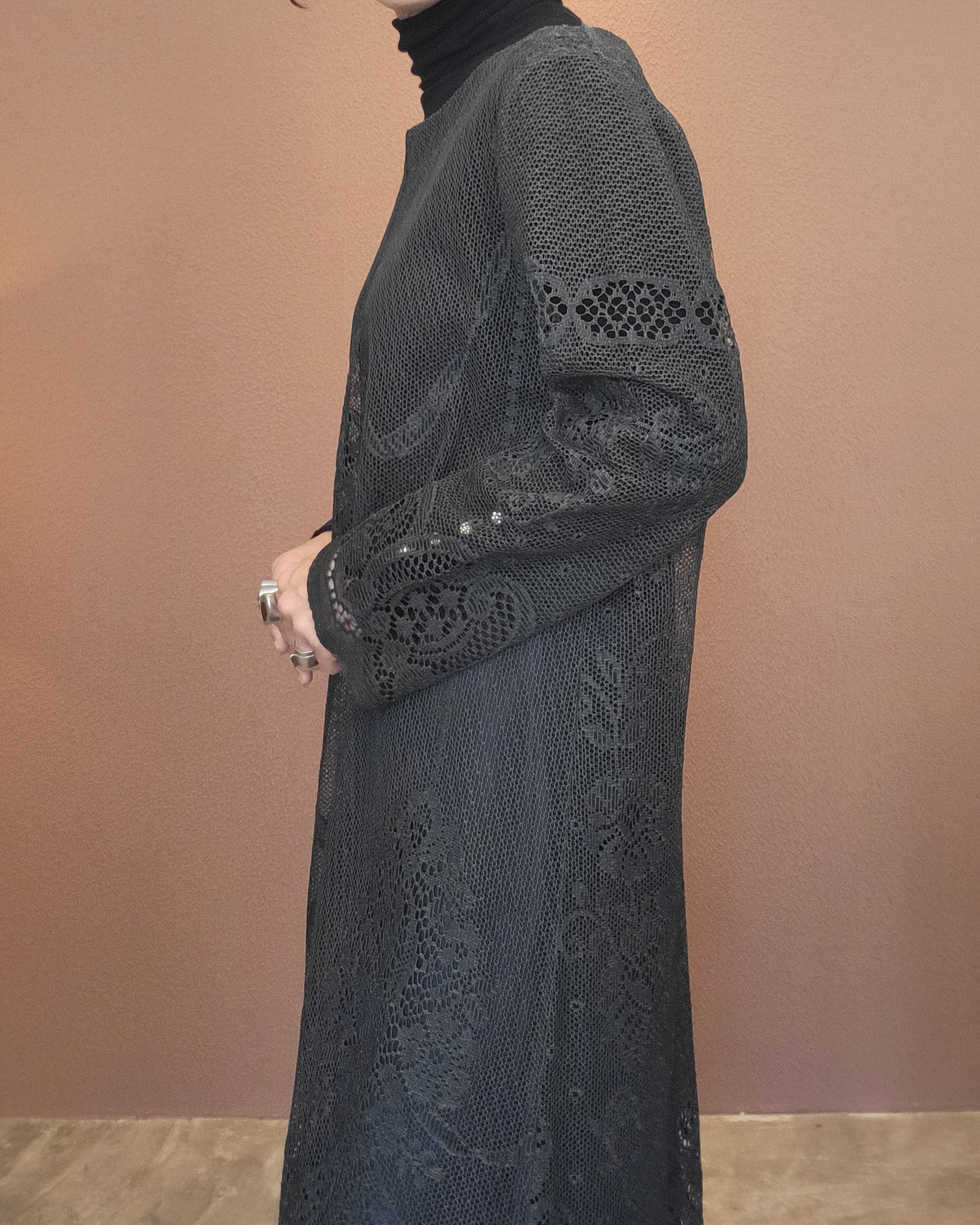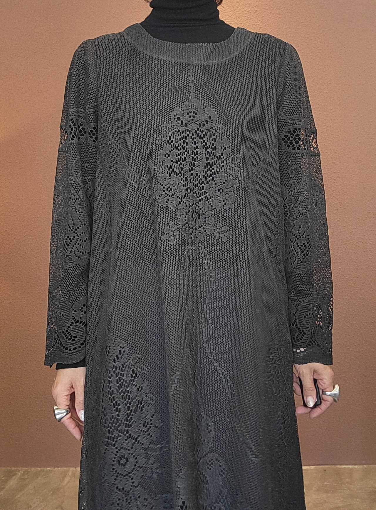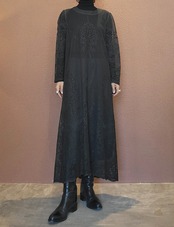 ヴィンテージのホワイトレースをブラックに後染めしたリメイクワンピース。染めは無農薬、無科学肥料で栽培された琉球藍を使用し、藍染→柿渋染→鉄媒染という複数の行程を経て丁寧に染め上げています。ボタンやファスナーは付いておらず頭から被るようにして着用するプルオーバータイプ。すとんと落ちるシルエットが縦ラインを際立たせすっきり見せてくれます。